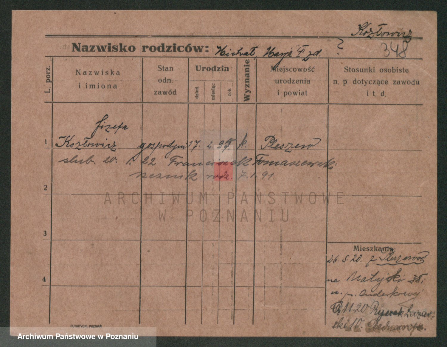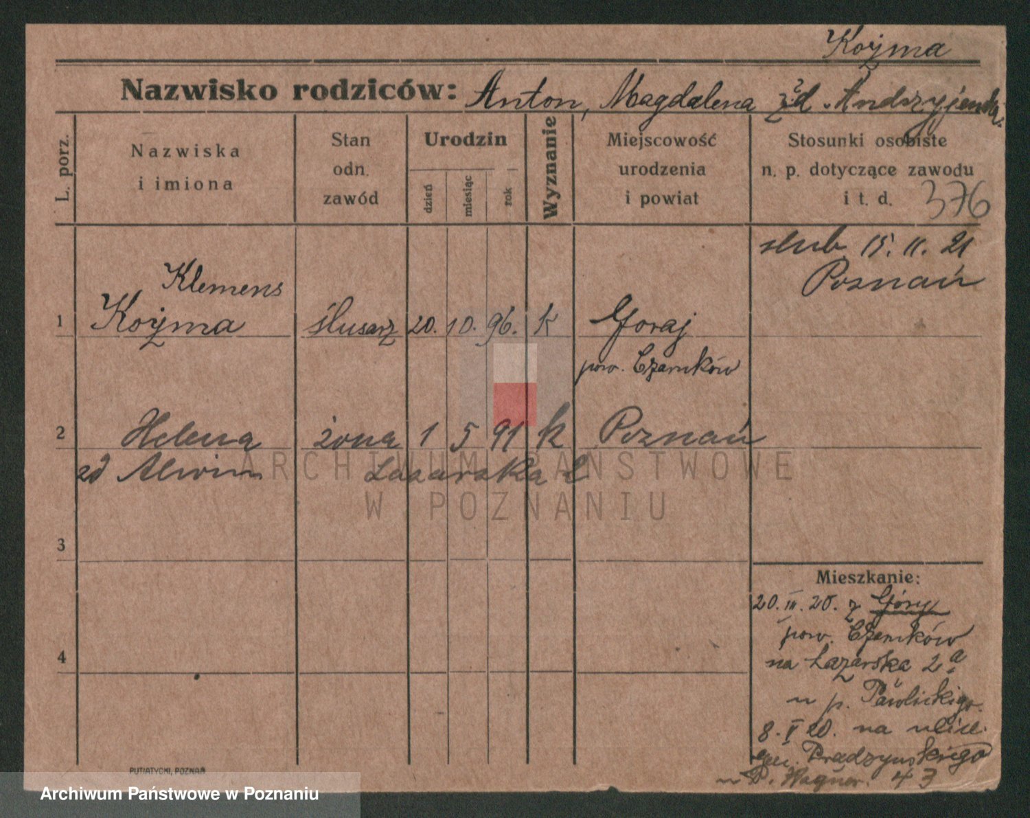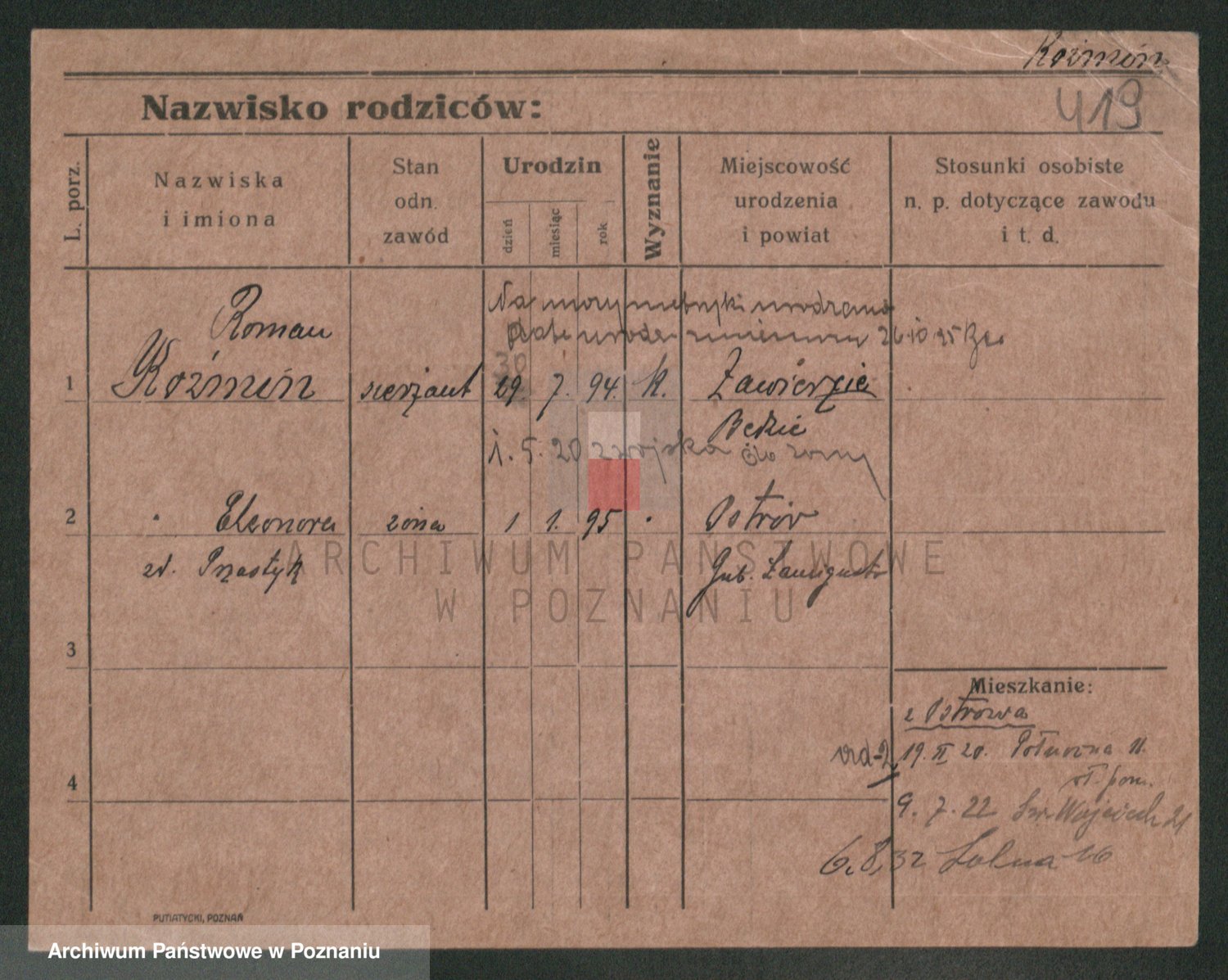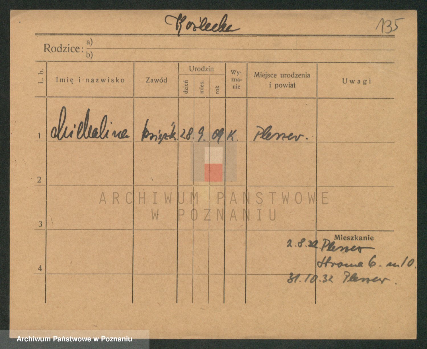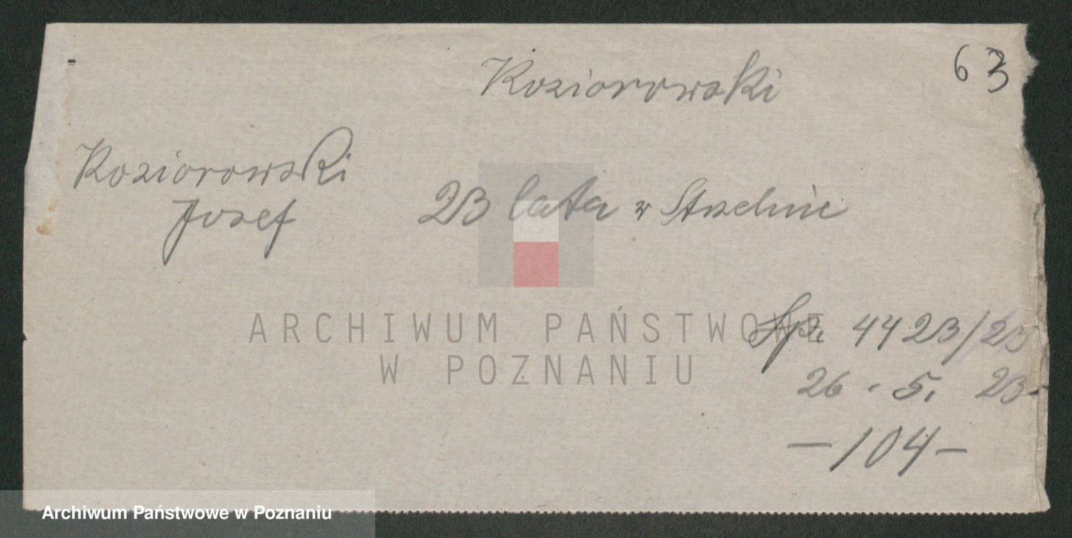 Podgląd karty osobowej dostępny jest po kliknięciu na nazwisko lub ikonkę karty. Można dokonywać powiększenia (ikony na górze) lub przechodzić między kolejnymi skanami (strzałki po bokach).