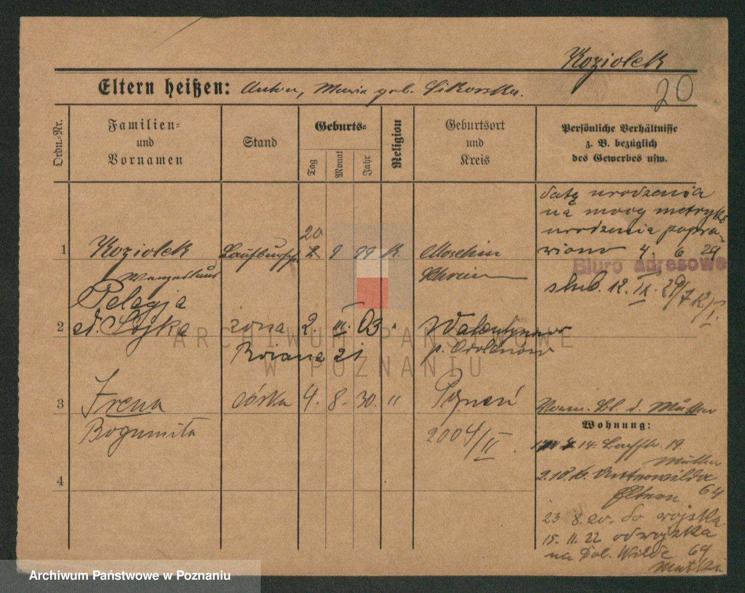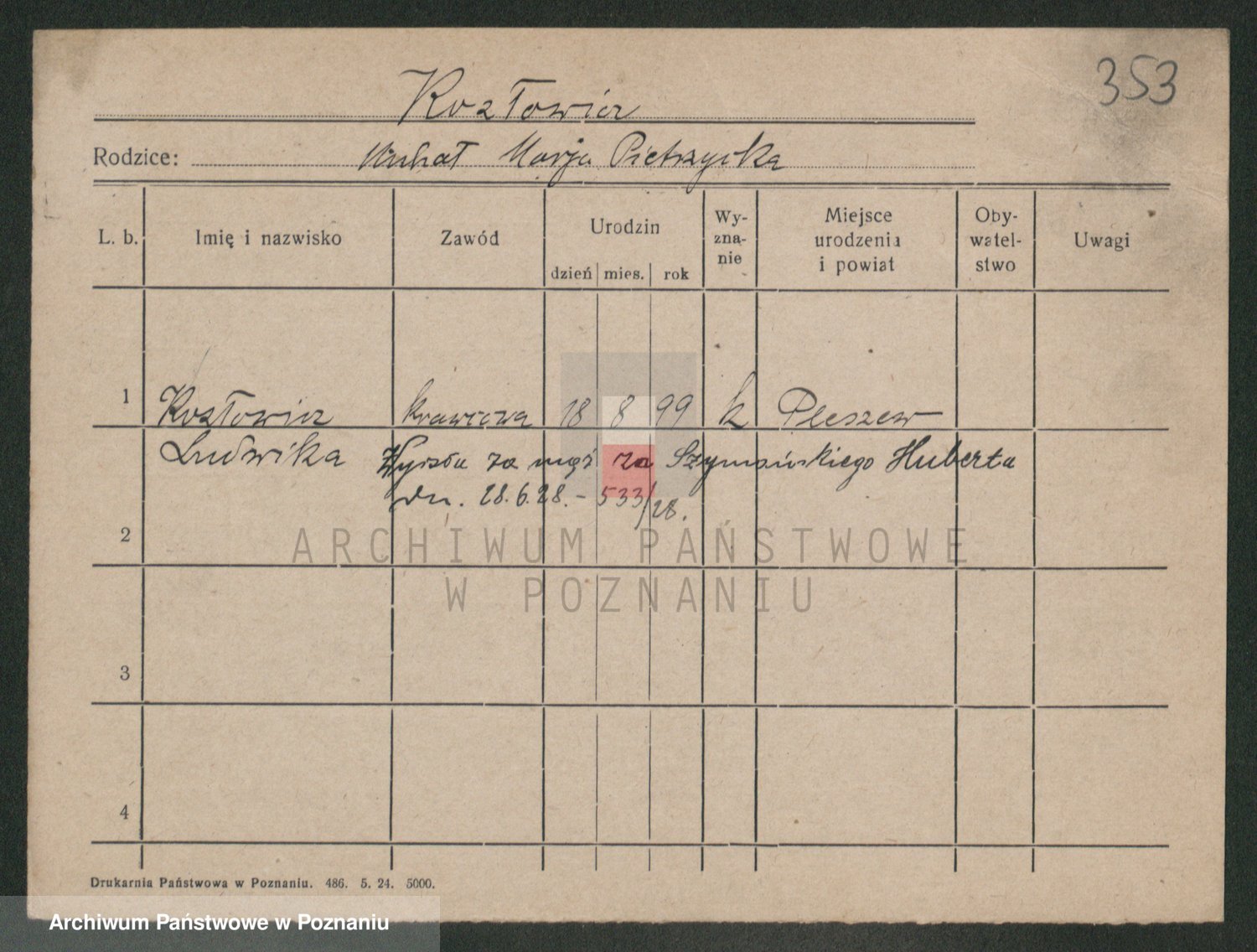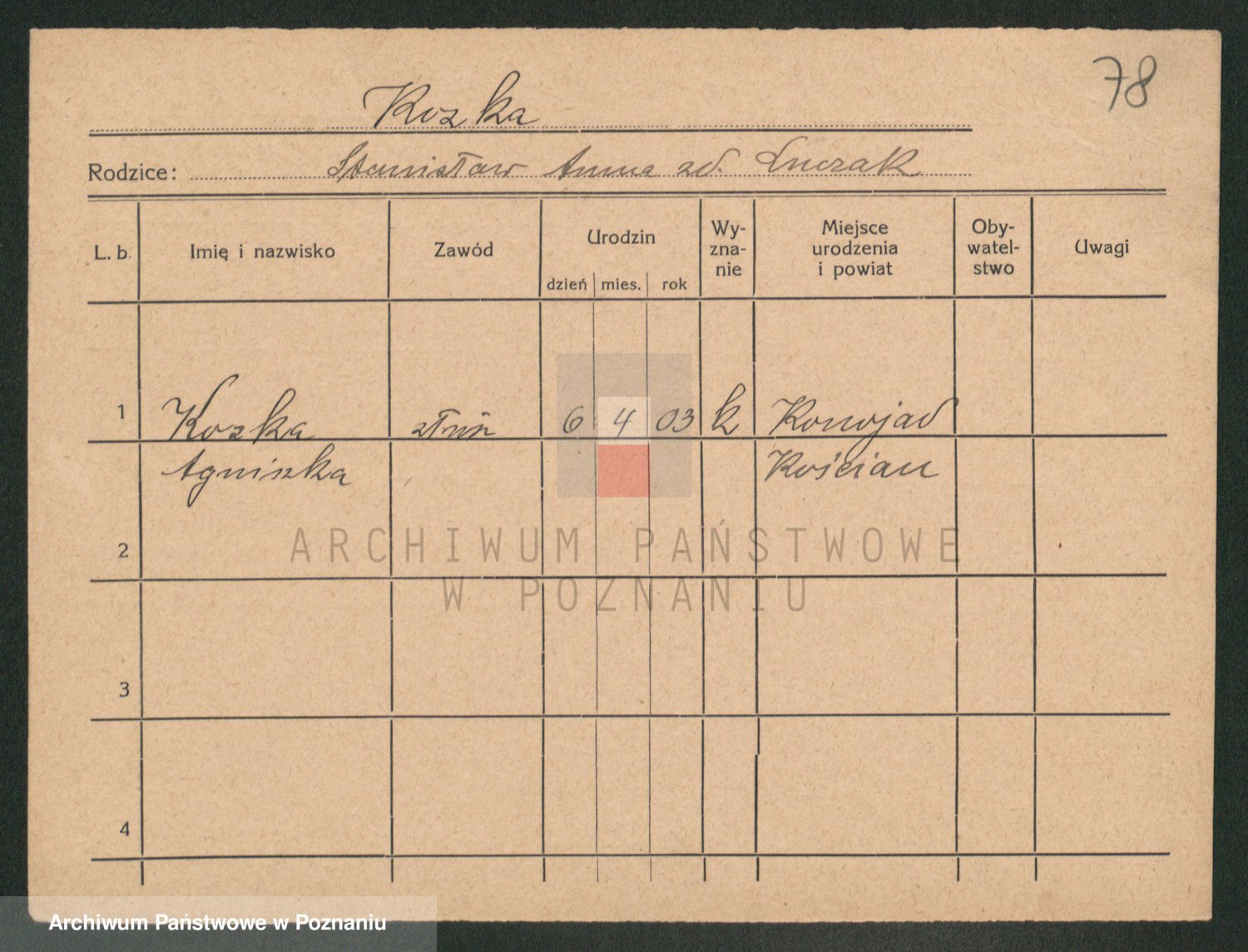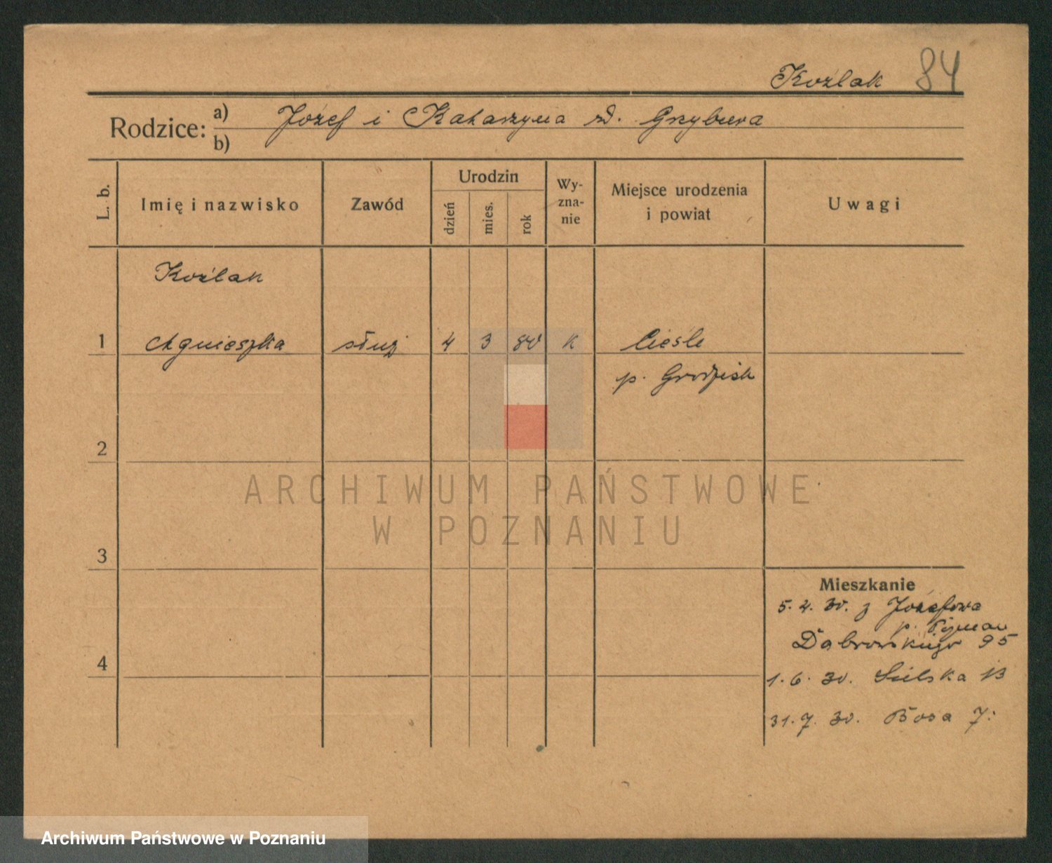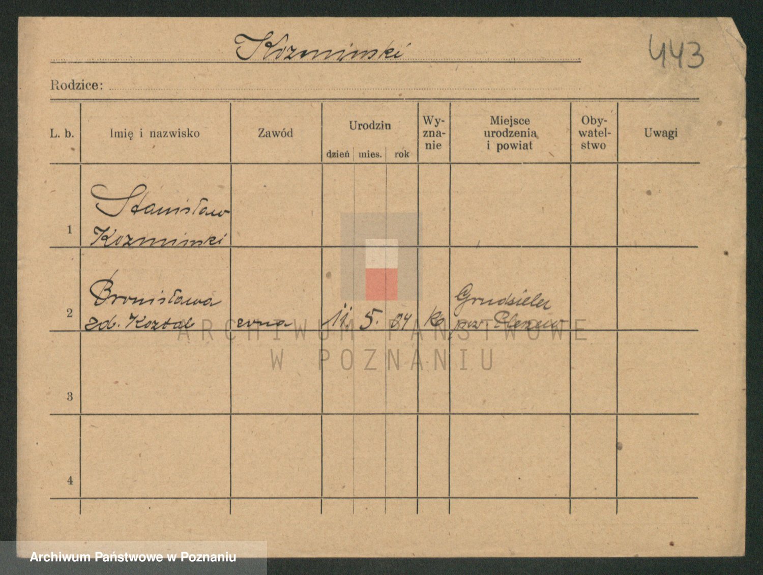 Podgląd karty osobowej dostępny jest po kliknięciu na nazwisko lub ikonkę karty. Można dokonywać powiększenia (ikony na górze) lub przechodzić między kolejnymi skanami (strzałki po bokach).