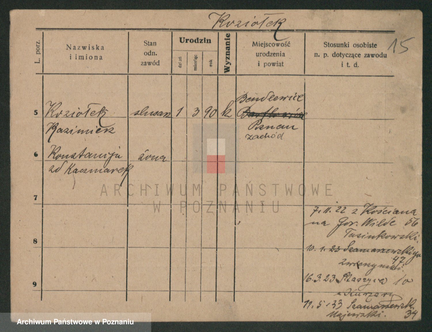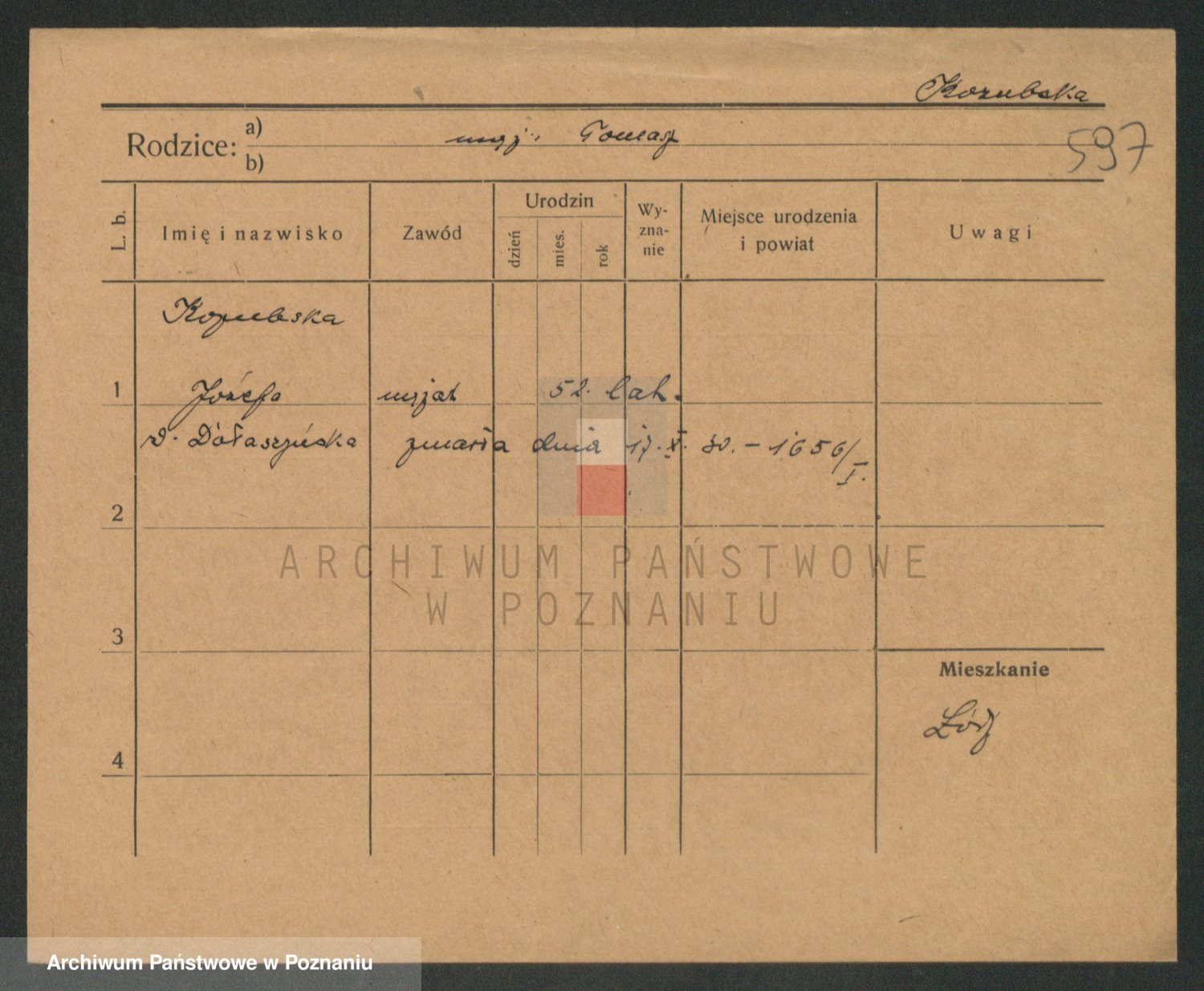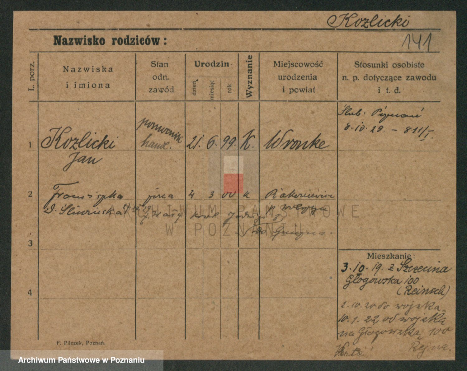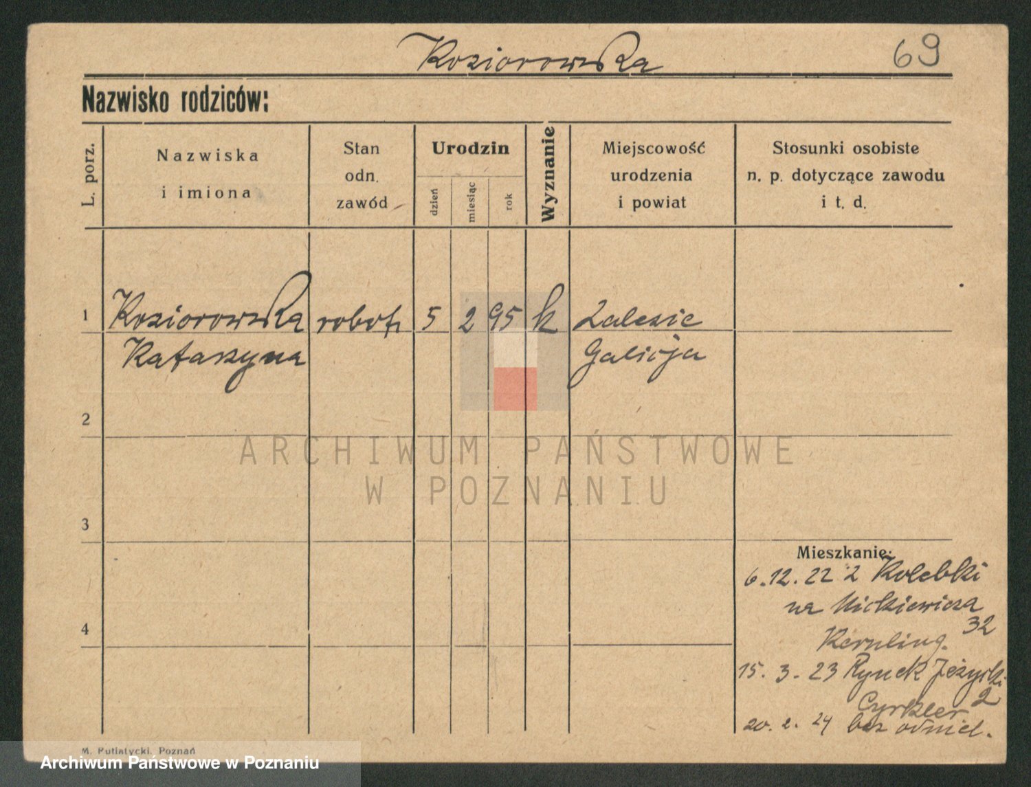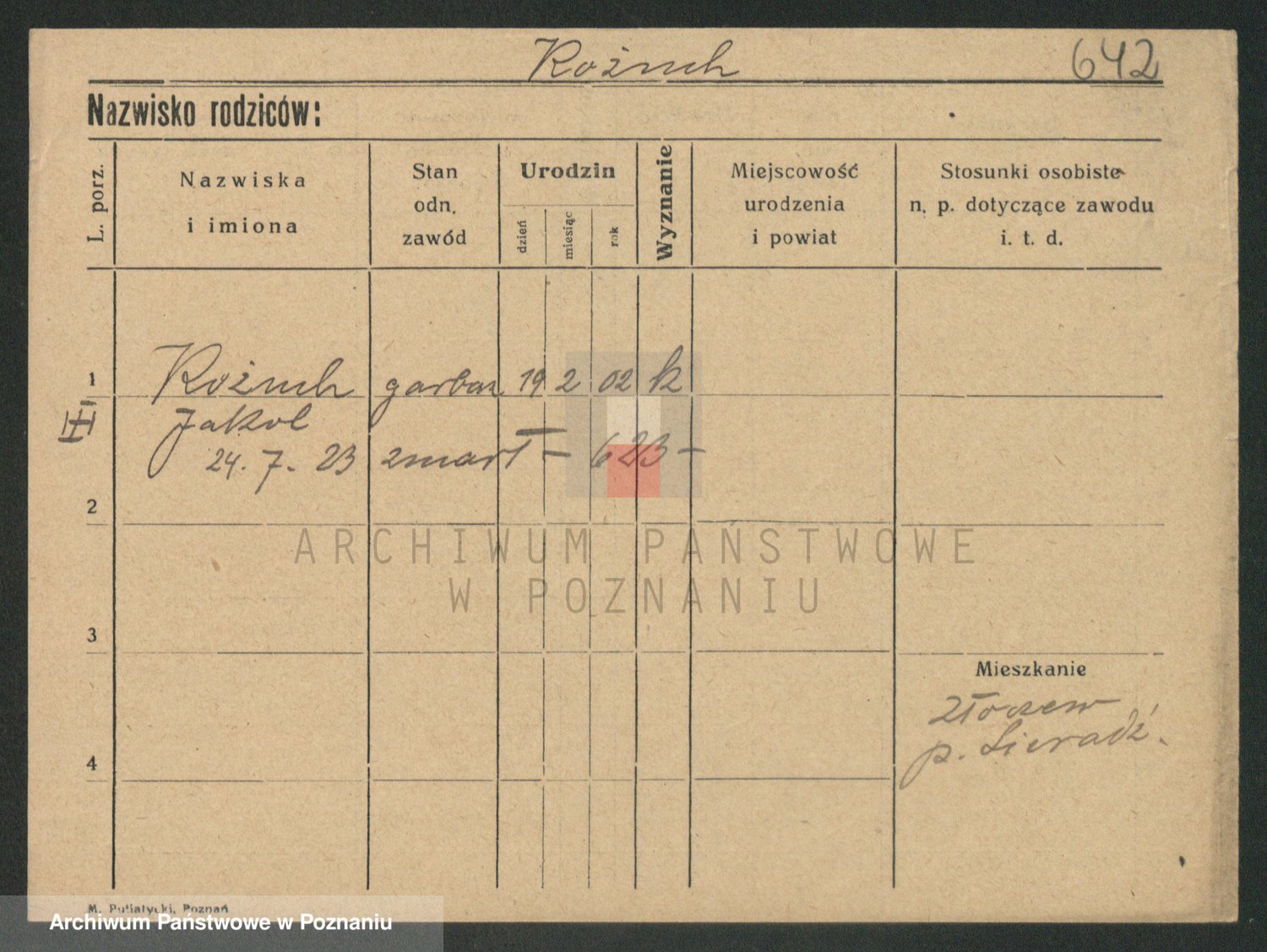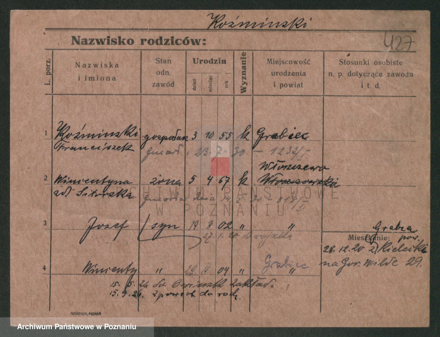 Podgląd karty osobowej dostępny jest po kliknięciu na nazwisko lub ikonkę karty. Można dokonywać powiększenia (ikony na górze) lub przechodzić między kolejnymi skanami (strzałki po bokach).