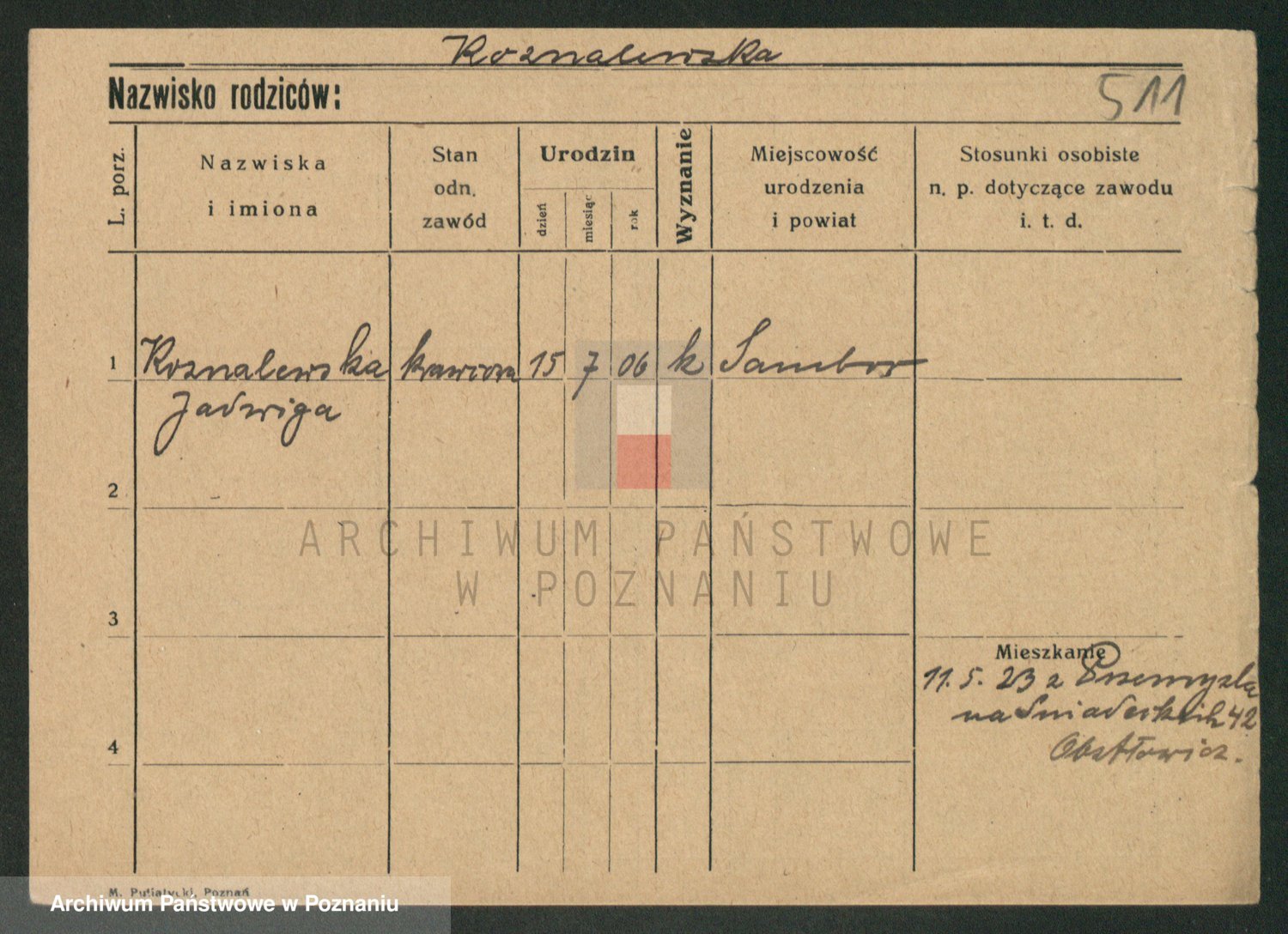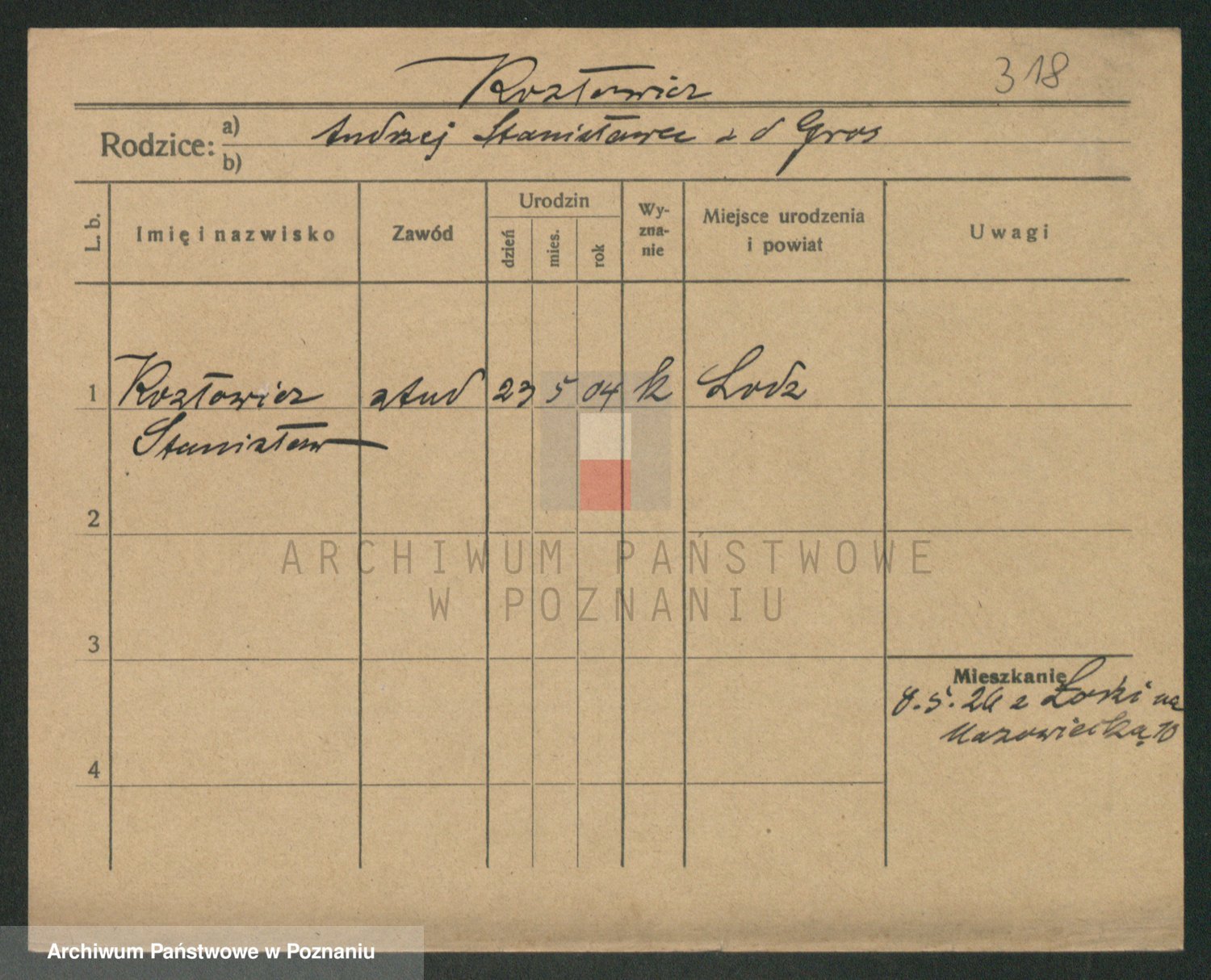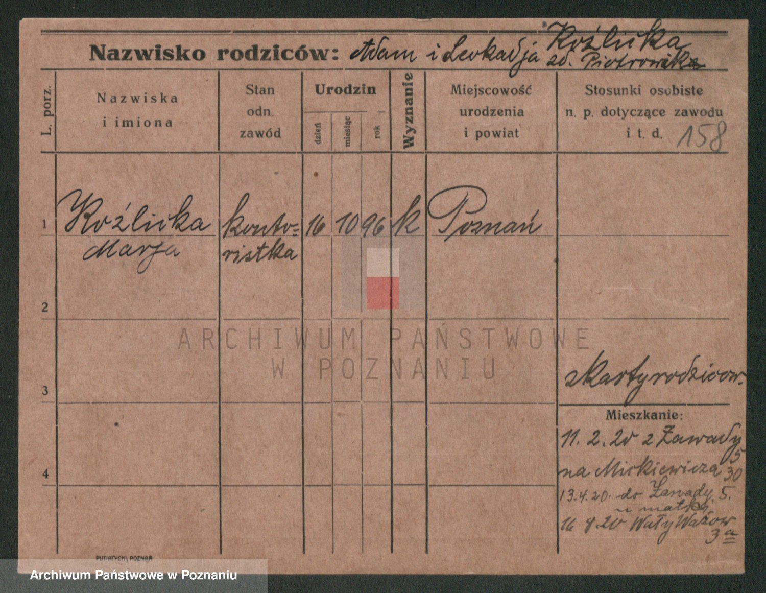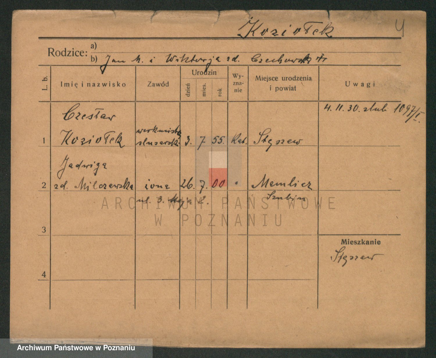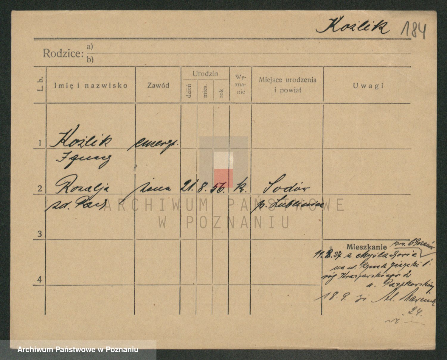 Podgląd karty osobowej dostępny jest po kliknięciu na nazwisko lub ikonkę karty. Można dokonywać powiększenia (ikony na górze) lub przechodzić między kolejnymi skanami (strzałki po bokach).