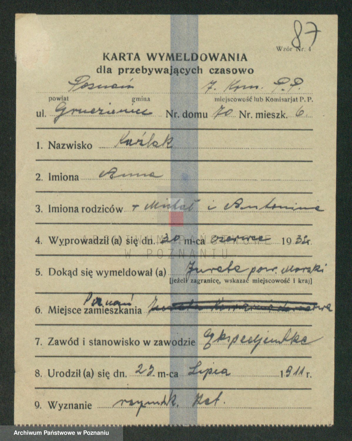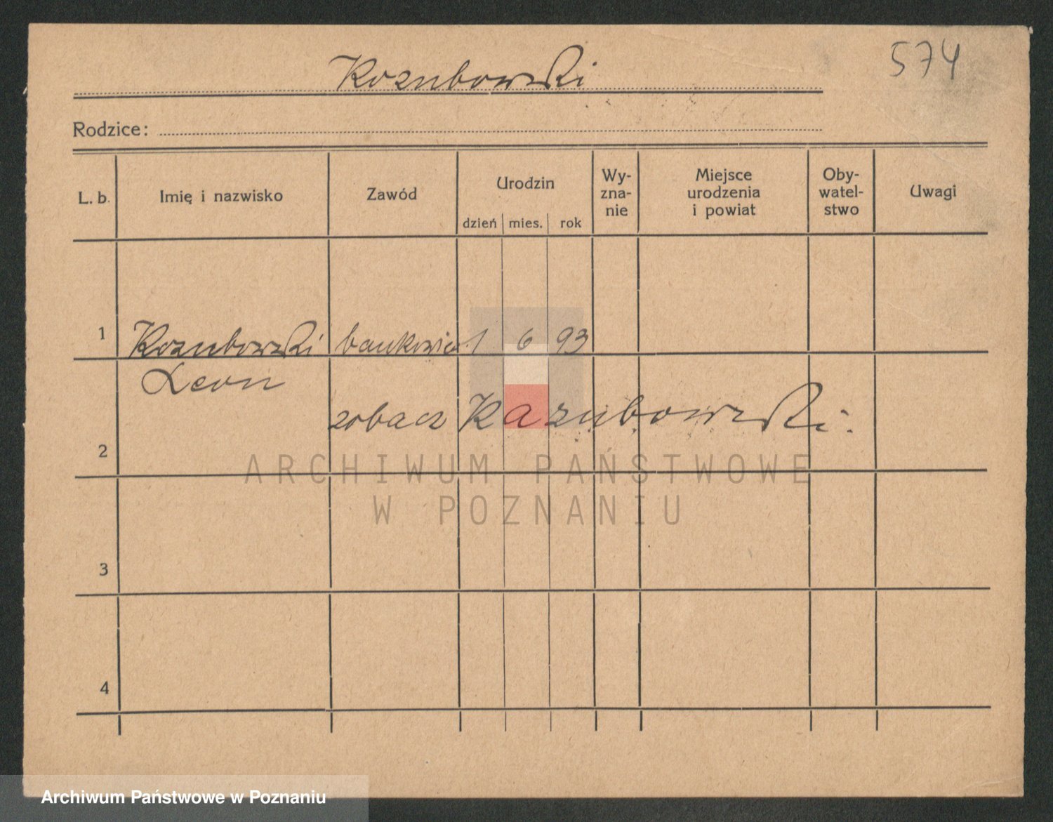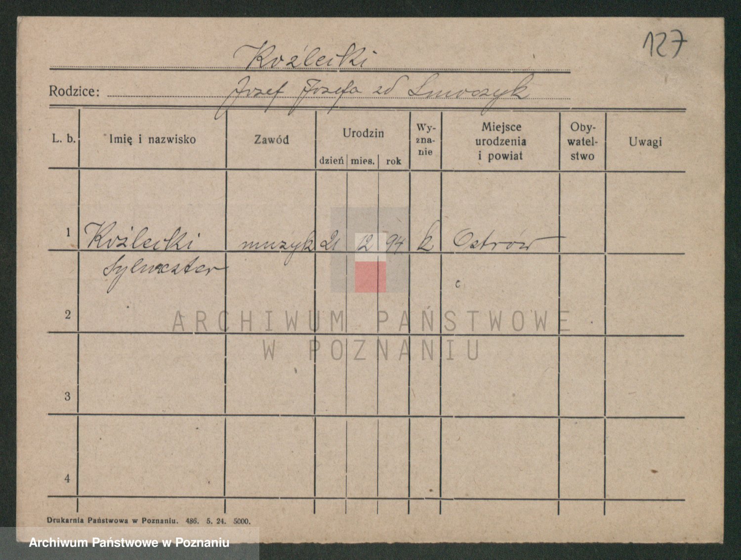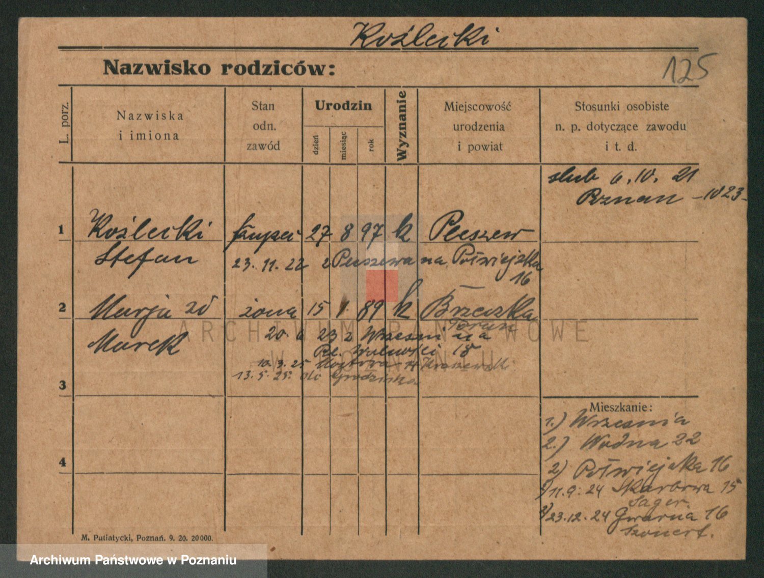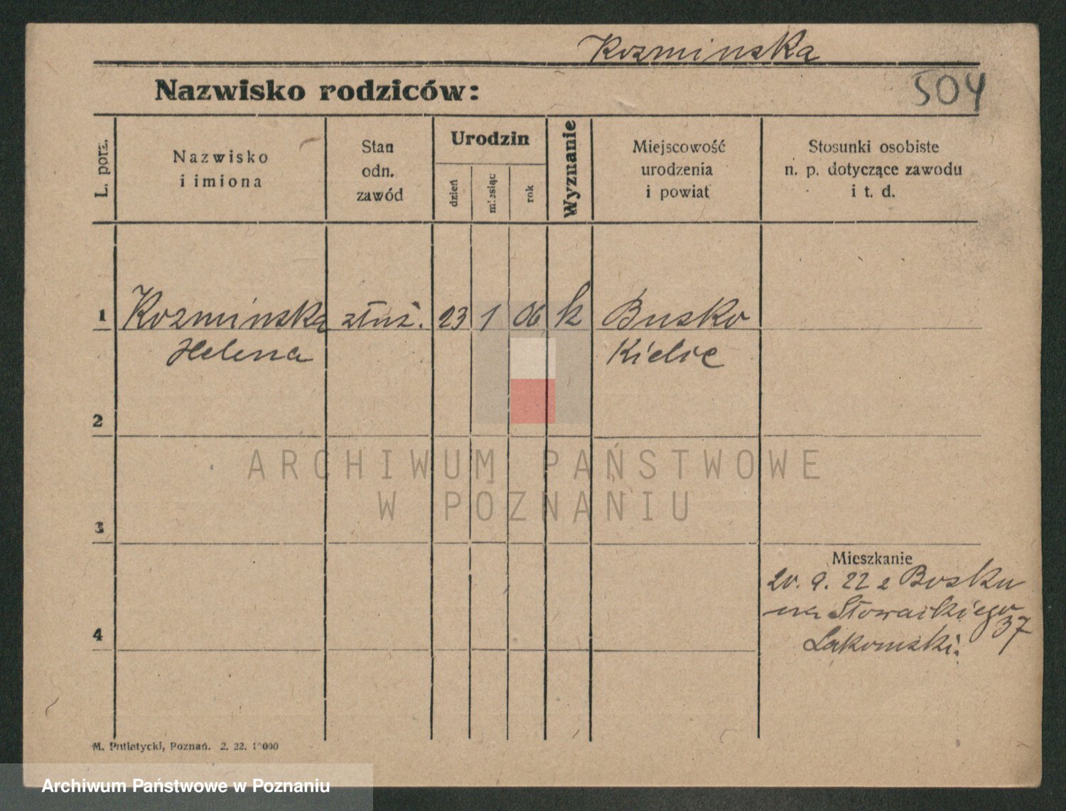 Podgląd karty osobowej dostępny jest po kliknięciu na nazwisko lub ikonkę karty. Można dokonywać powiększenia (ikony na górze) lub przechodzić między kolejnymi skanami (strzałki po bokach).
