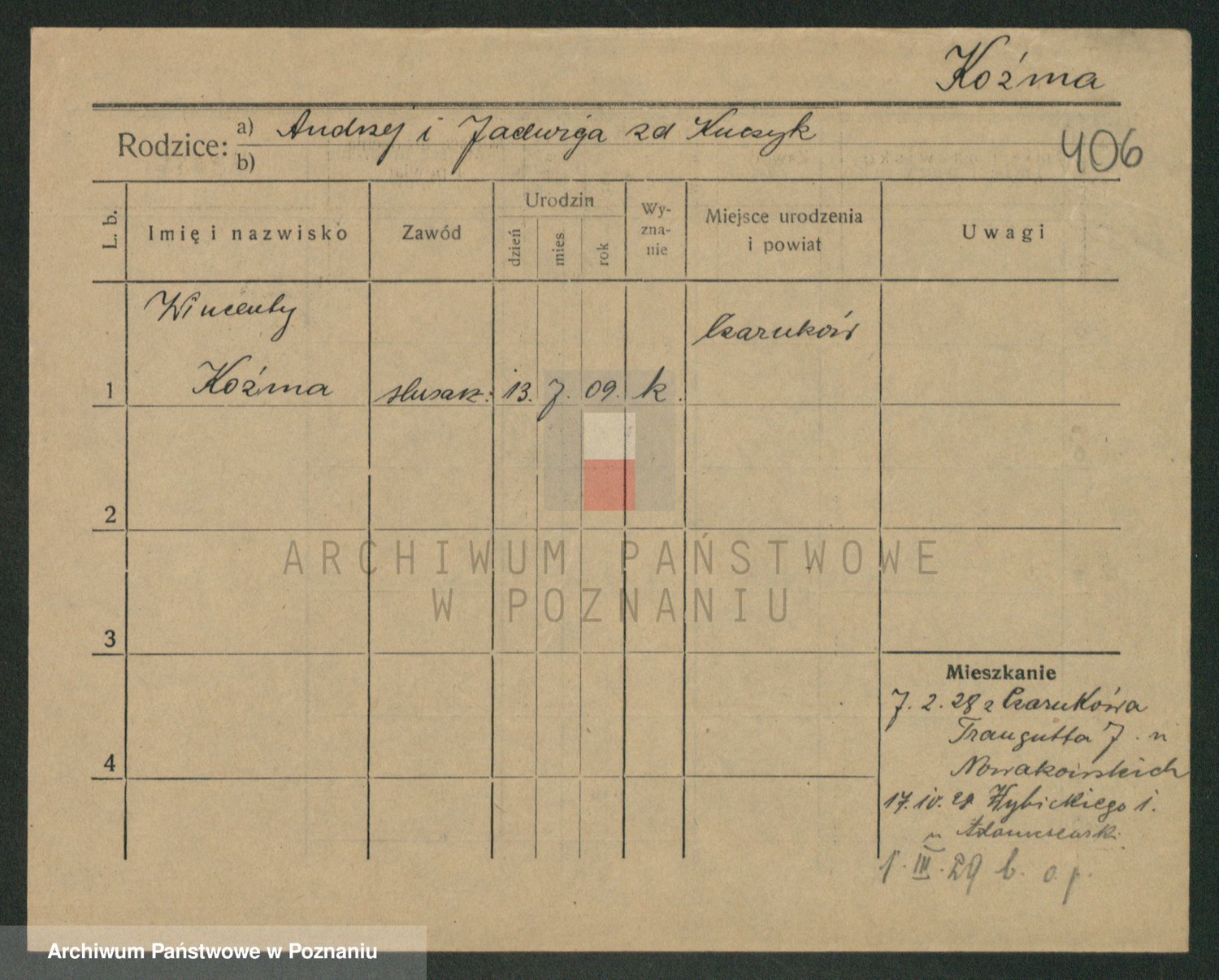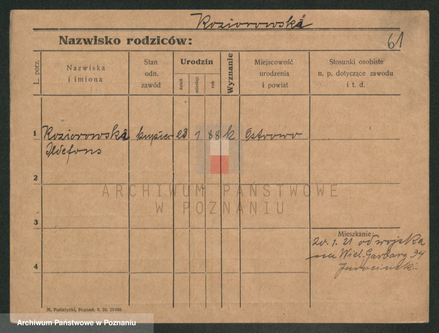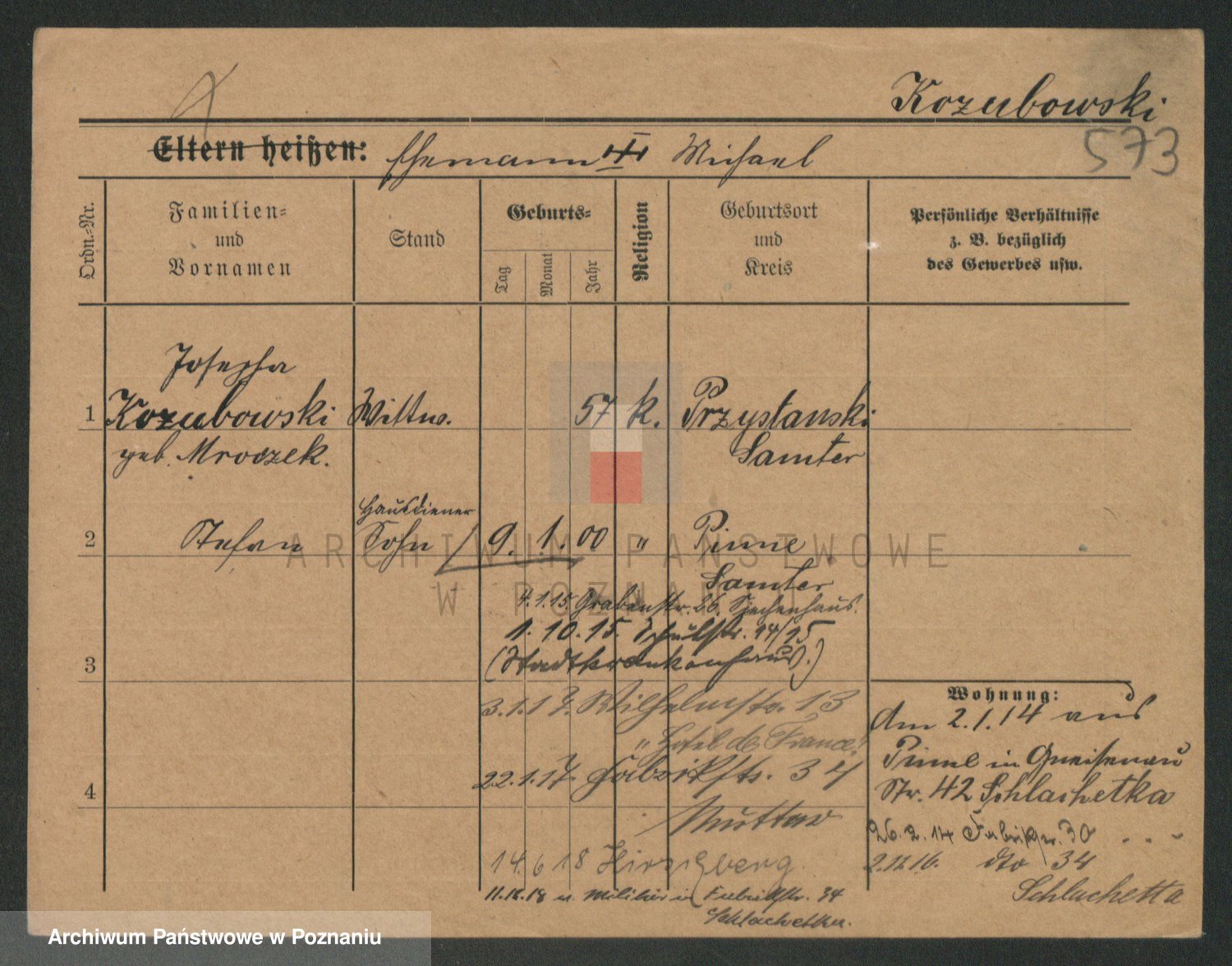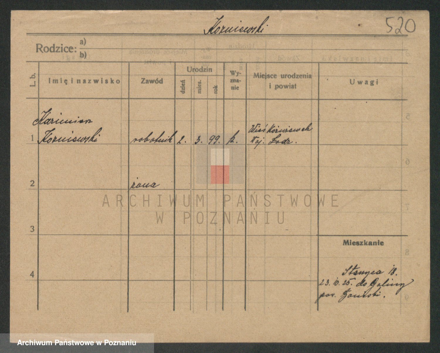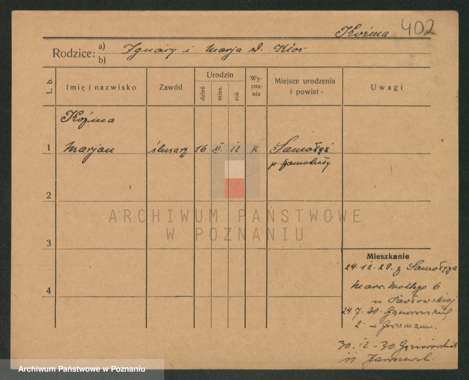 Podgląd karty osobowej dostępny jest po kliknięciu na nazwisko lub ikonkę karty. Można dokonywać powiększenia (ikony na górze) lub przechodzić między kolejnymi skanami (strzałki po bokach).