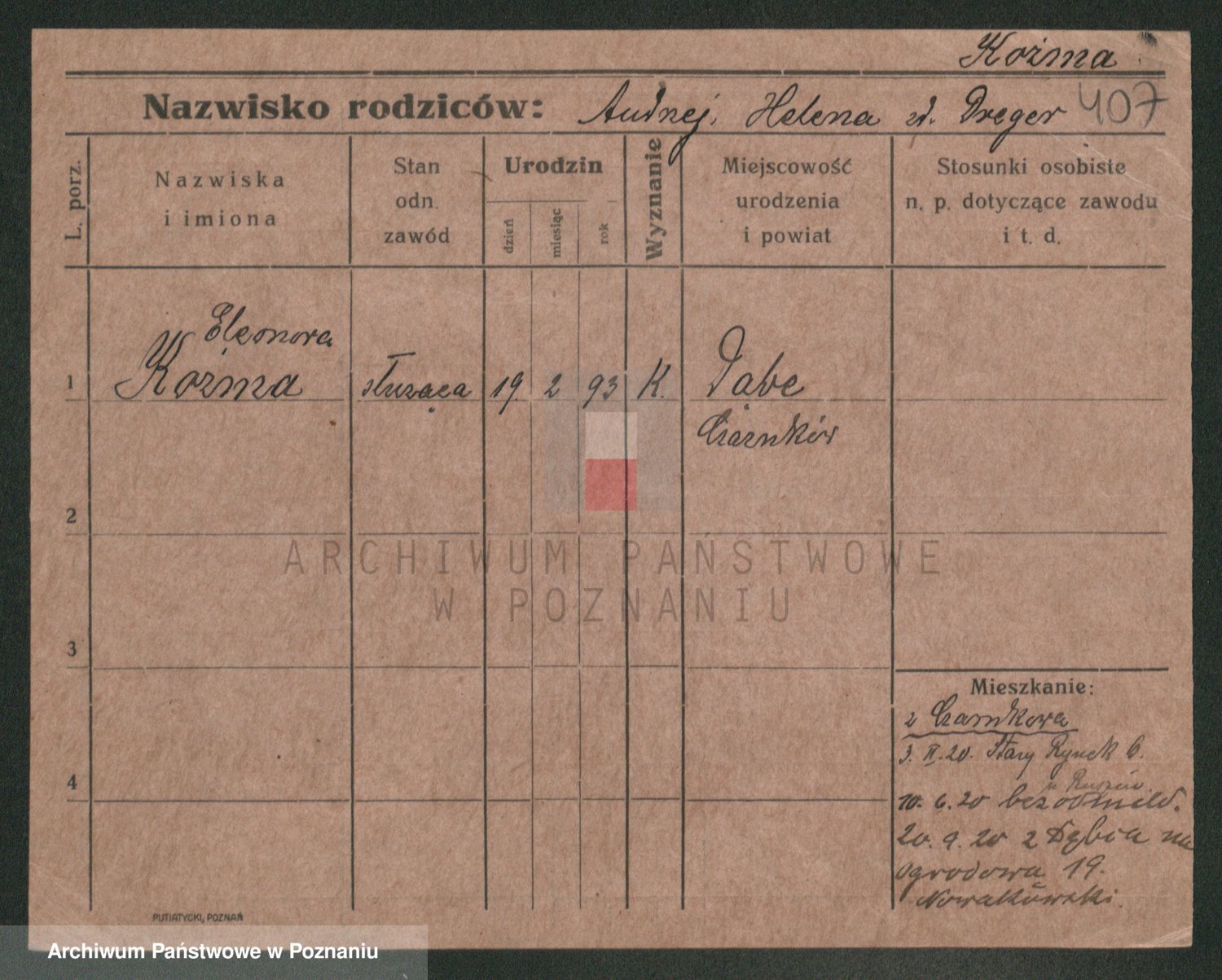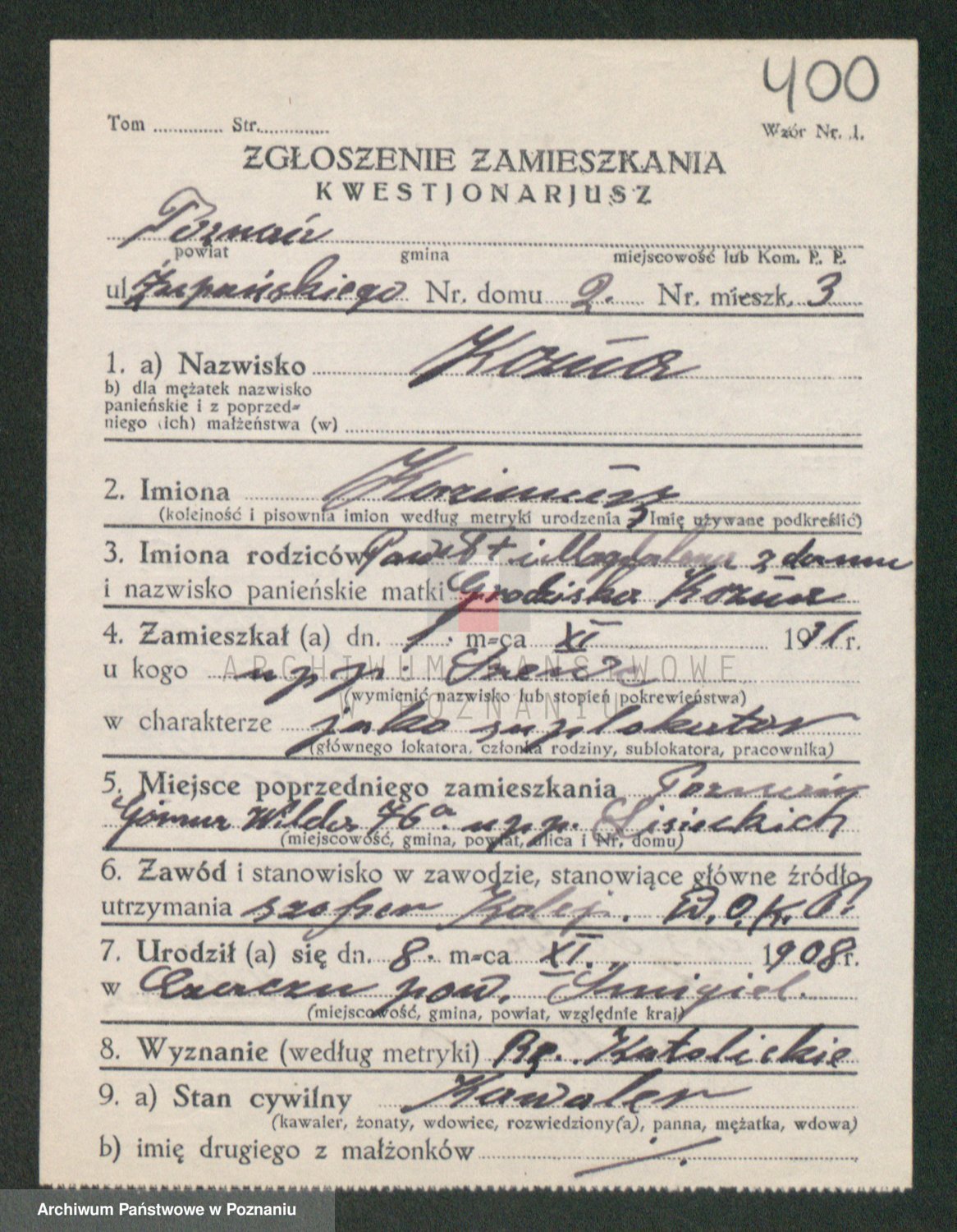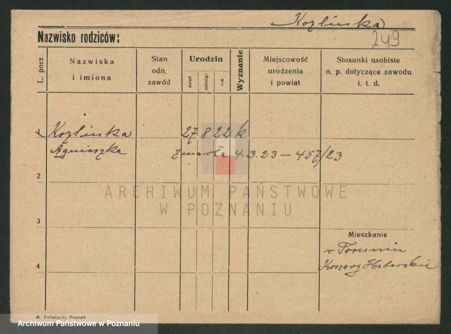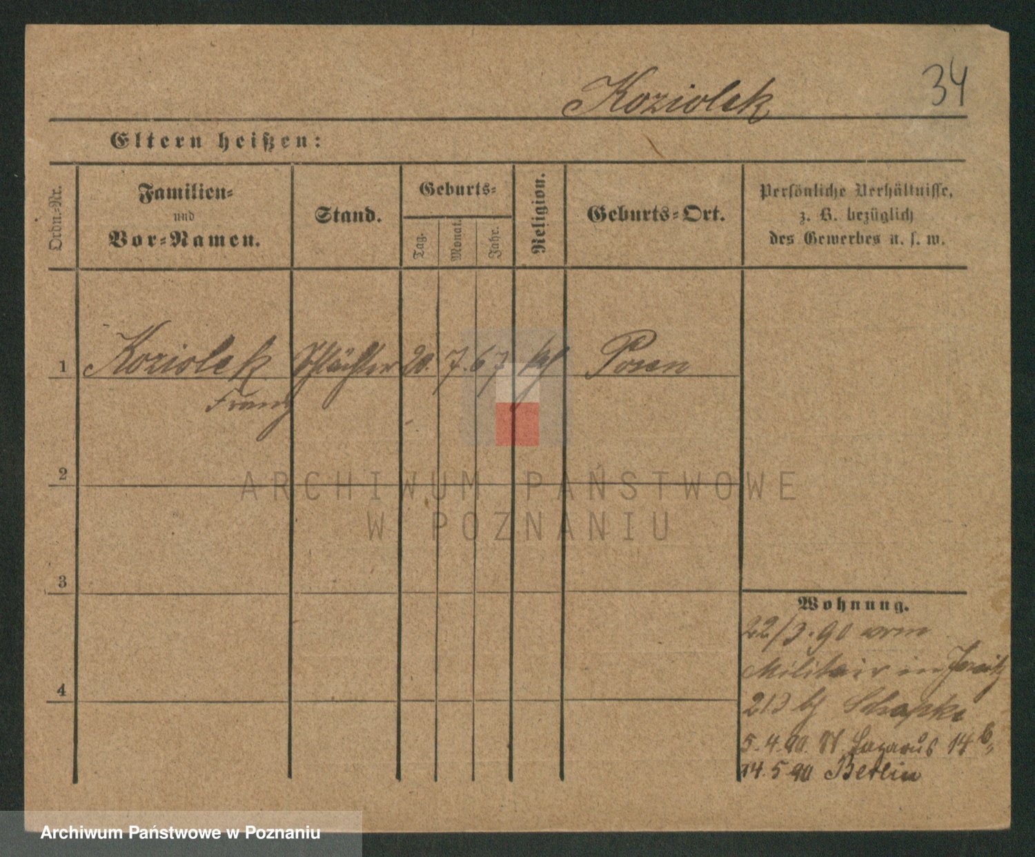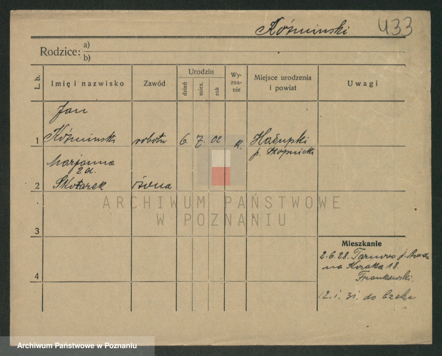 Podgląd karty osobowej dostępny jest po kliknięciu na nazwisko lub ikonkę karty. Można dokonywać powiększenia (ikony na górze) lub przechodzić między kolejnymi skanami (strzałki po bokach).