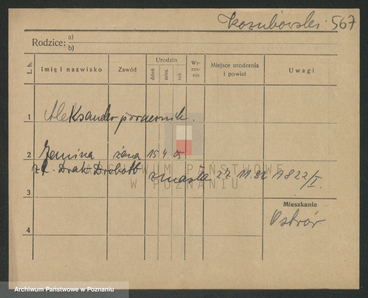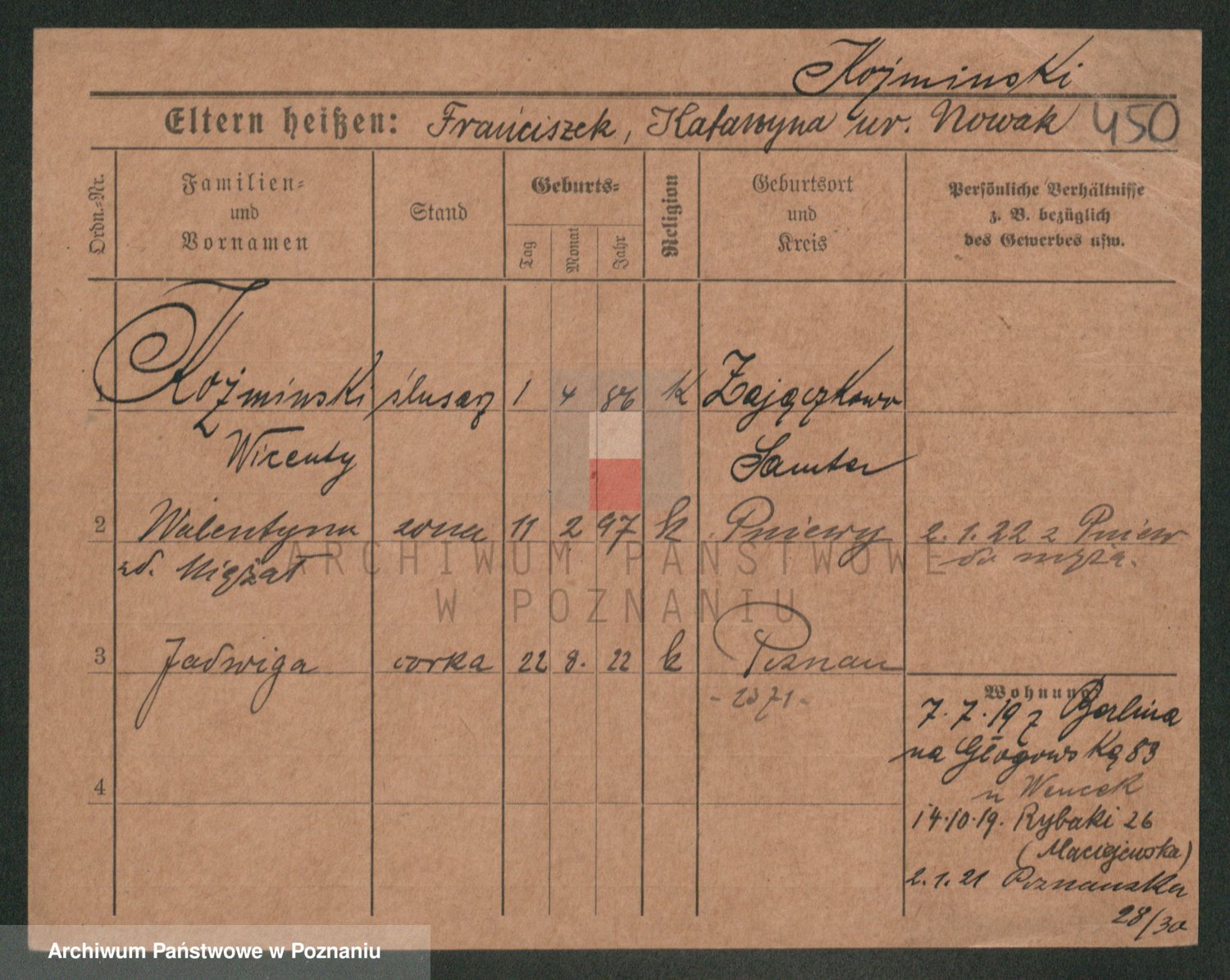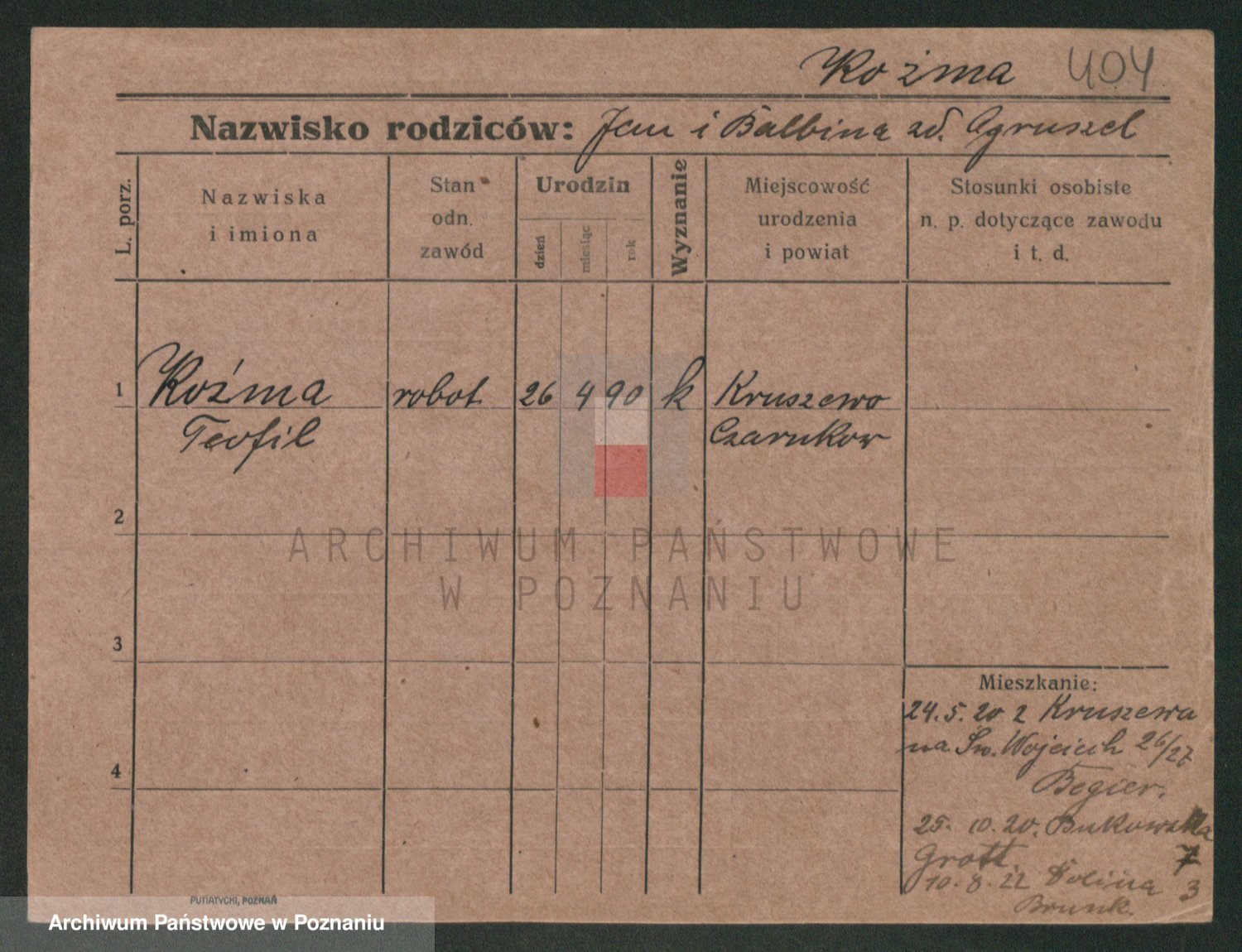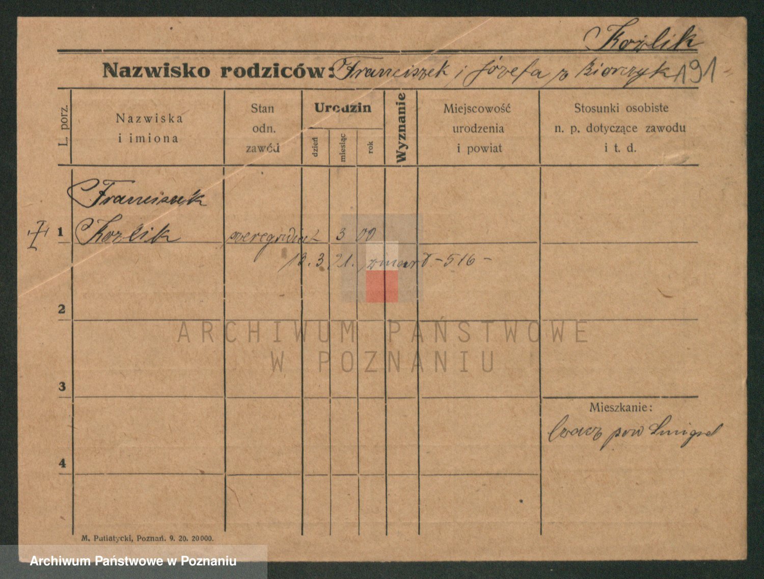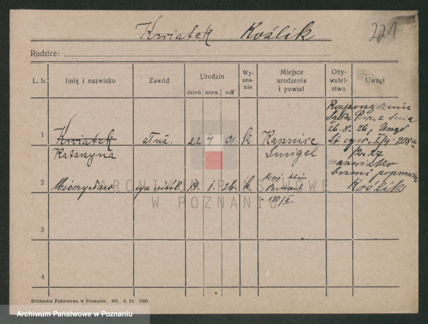 Podgląd karty osobowej dostępny jest po kliknięciu na nazwisko lub ikonkę karty. Można dokonywać powiększenia (ikony na górze) lub przechodzić między kolejnymi skanami (strzałki po bokach).