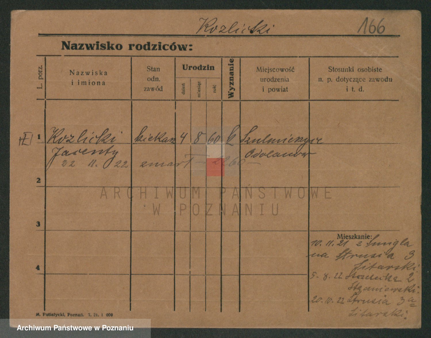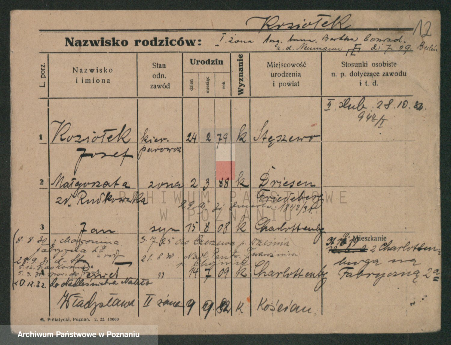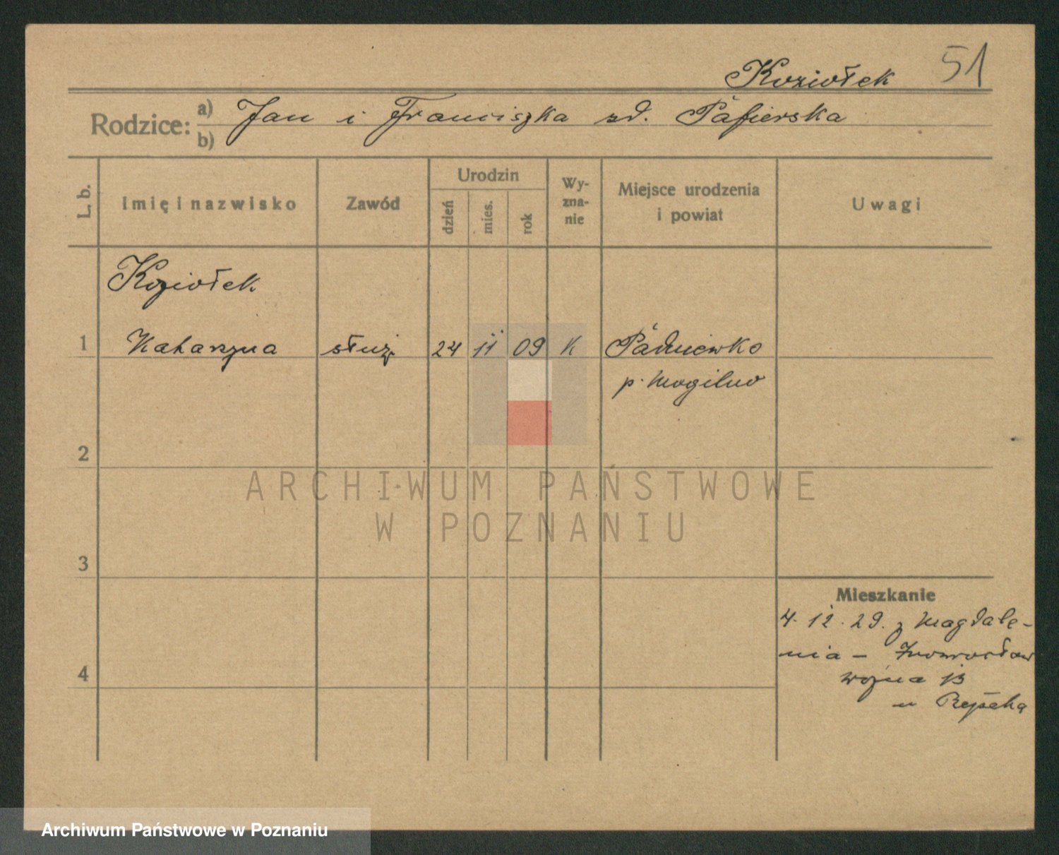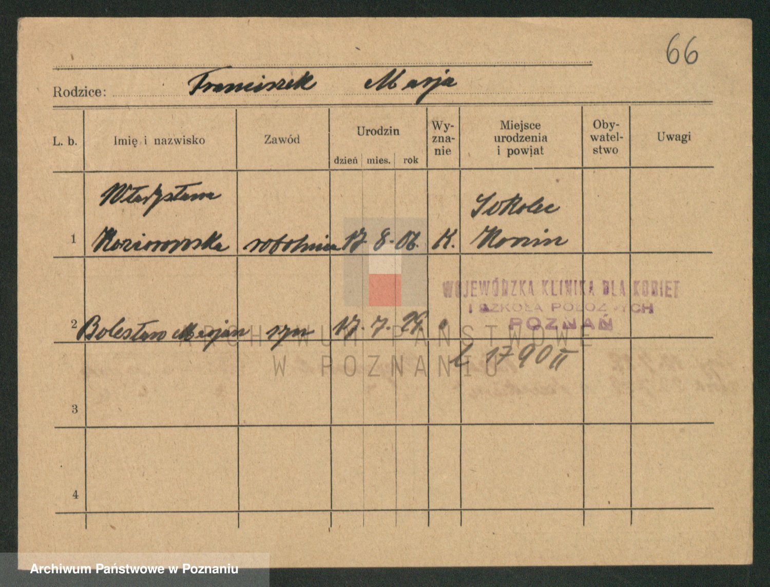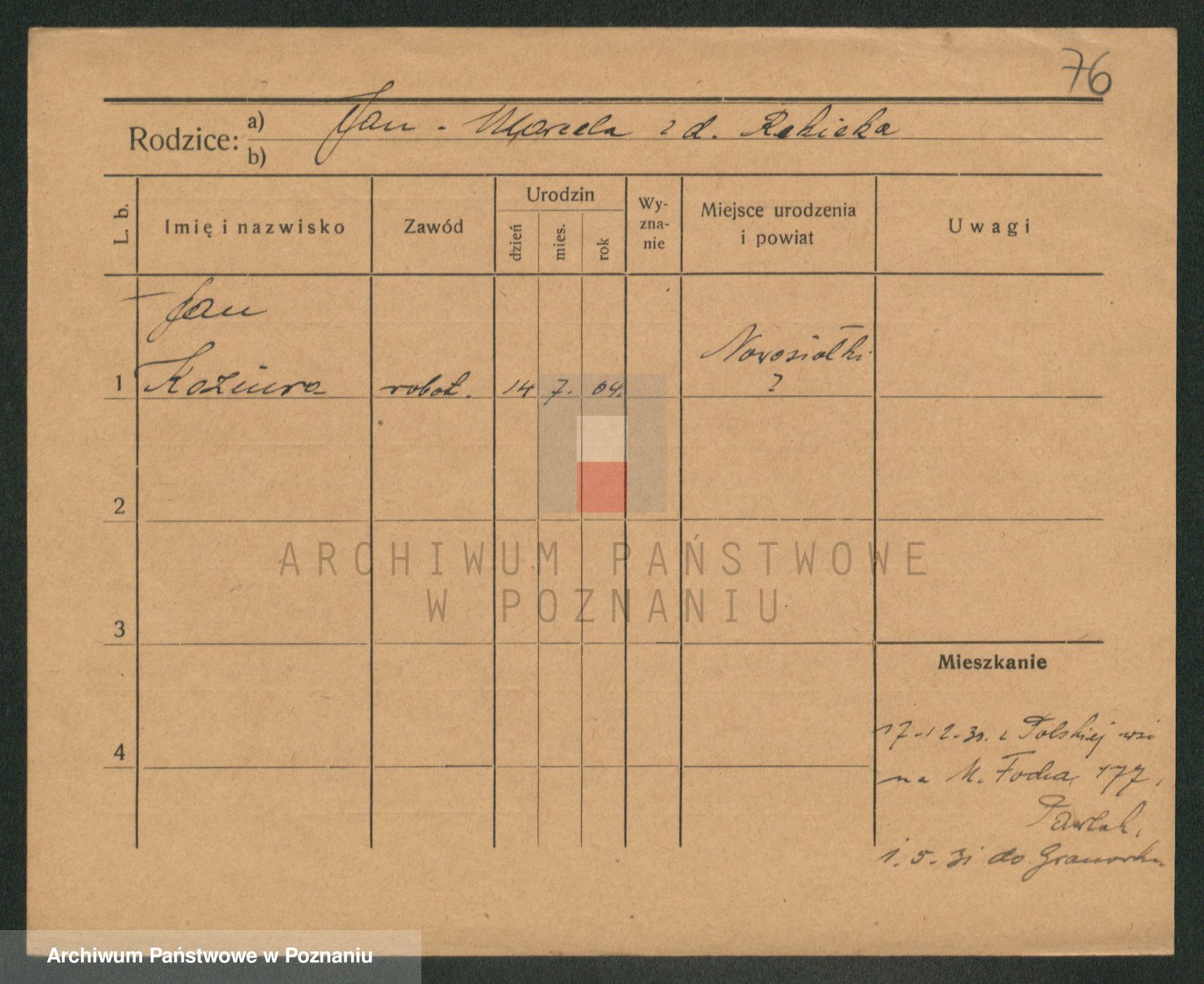 Podgląd karty osobowej dostępny jest po kliknięciu na nazwisko lub ikonkę karty. Można dokonywać powiększenia (ikony na górze) lub przechodzić między kolejnymi skanami (strzałki po bokach).