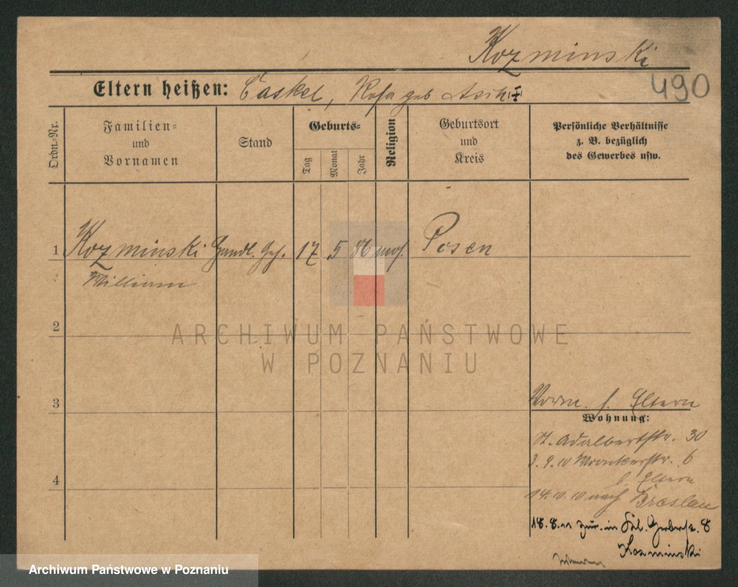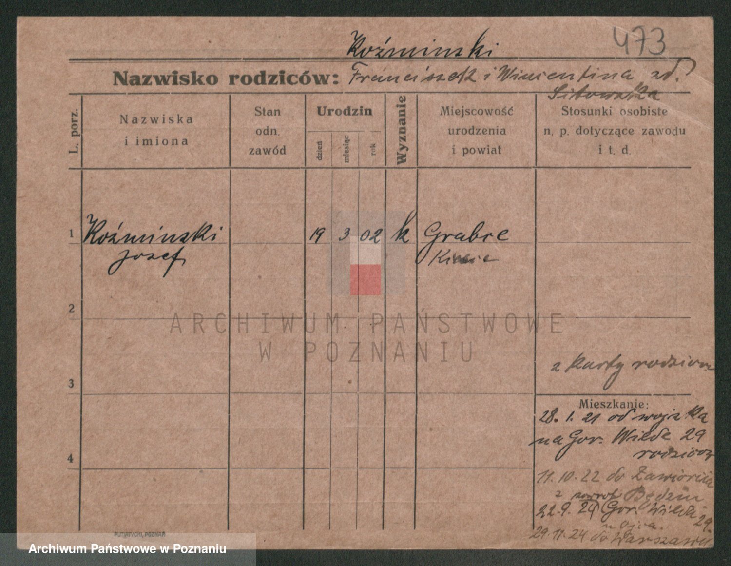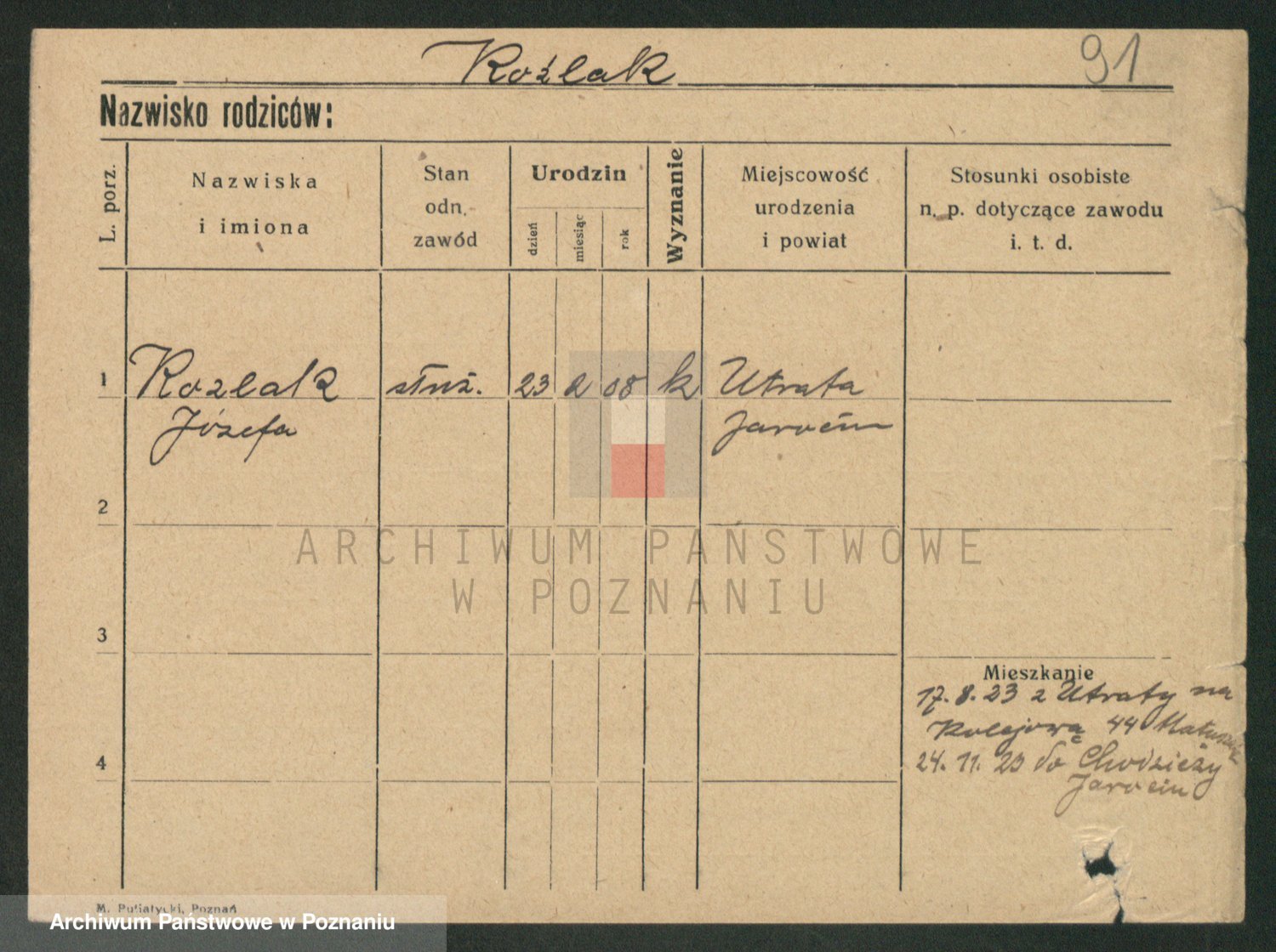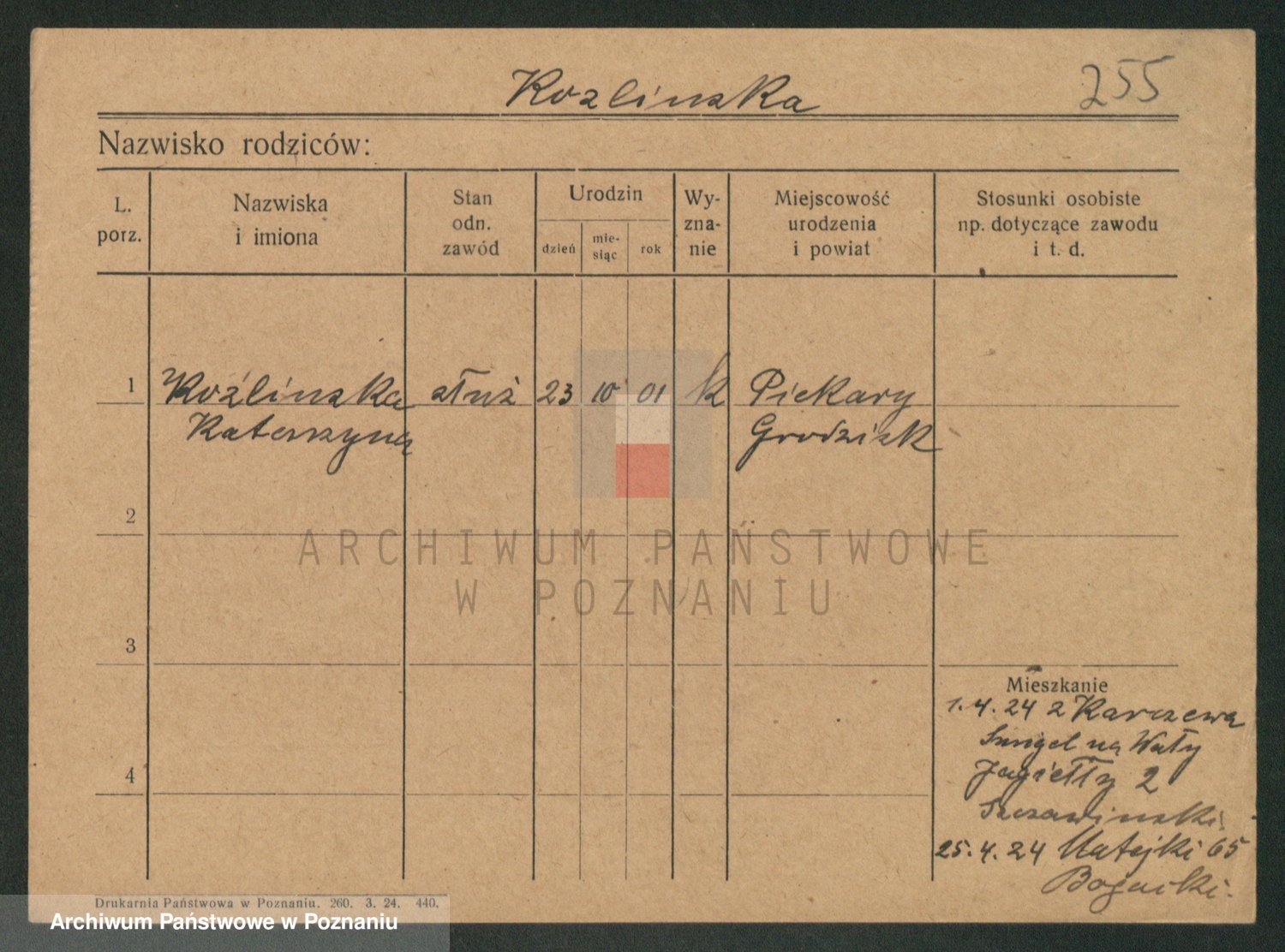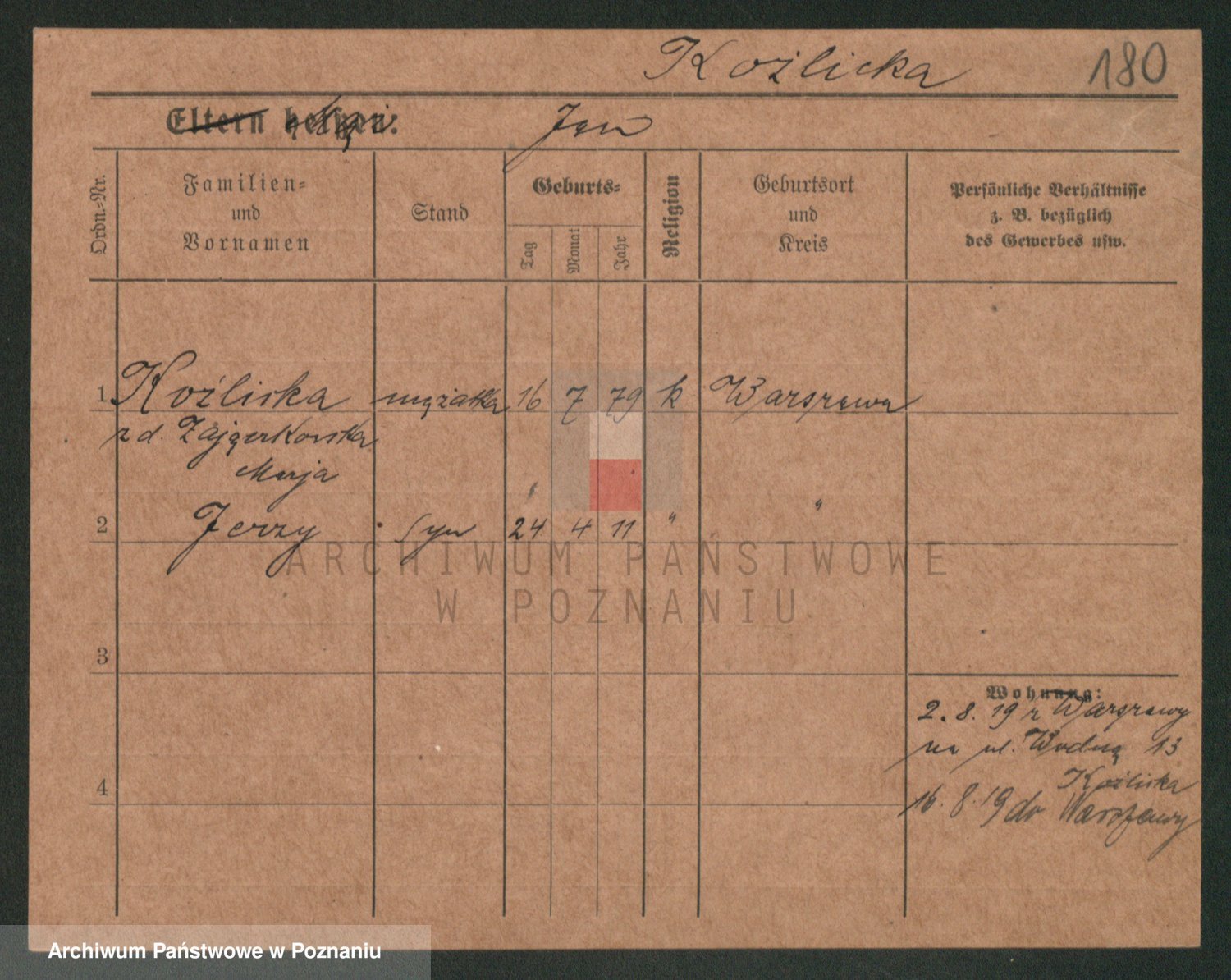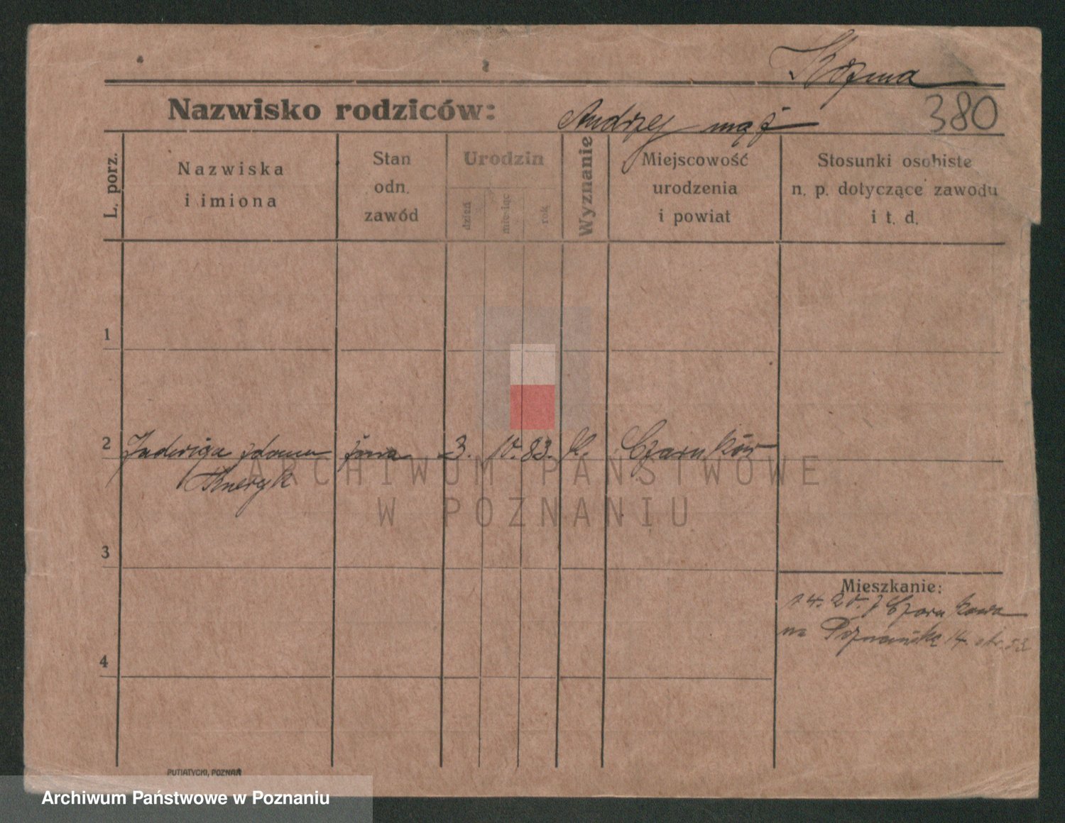 Podgląd karty osobowej dostępny jest po kliknięciu na nazwisko lub ikonkę karty. Można dokonywać powiększenia (ikony na górze) lub przechodzić między kolejnymi skanami (strzałki po bokach).