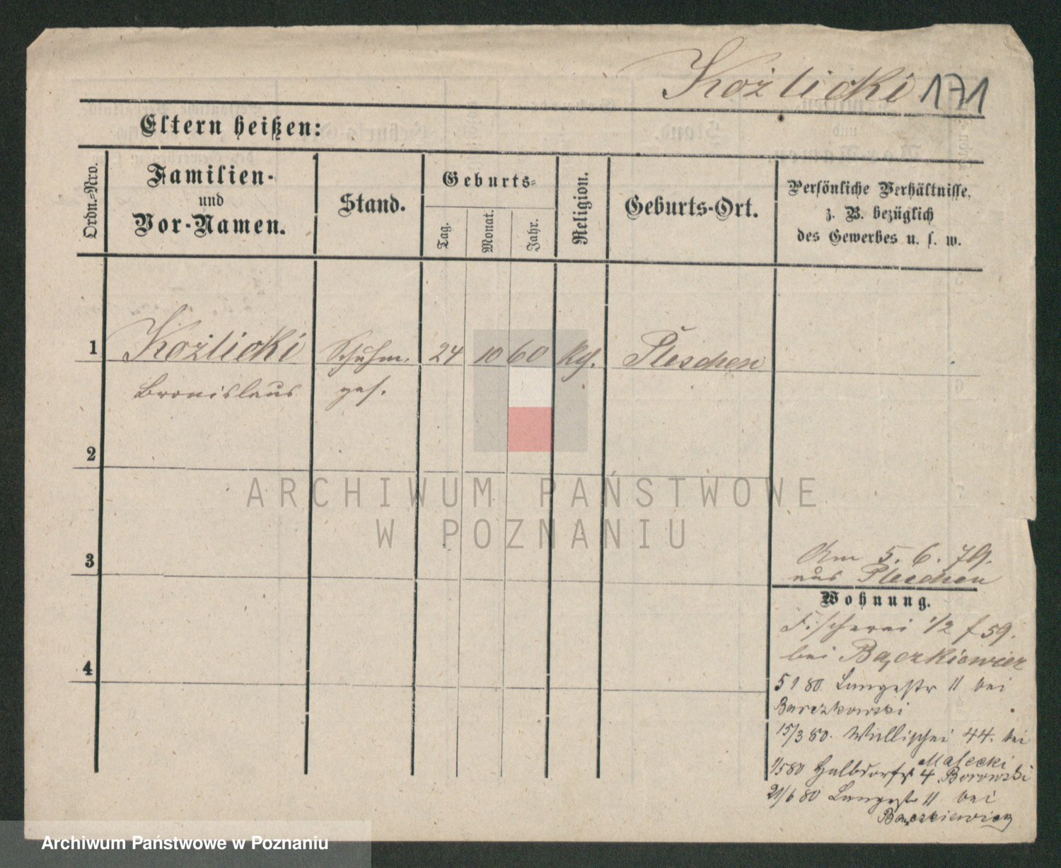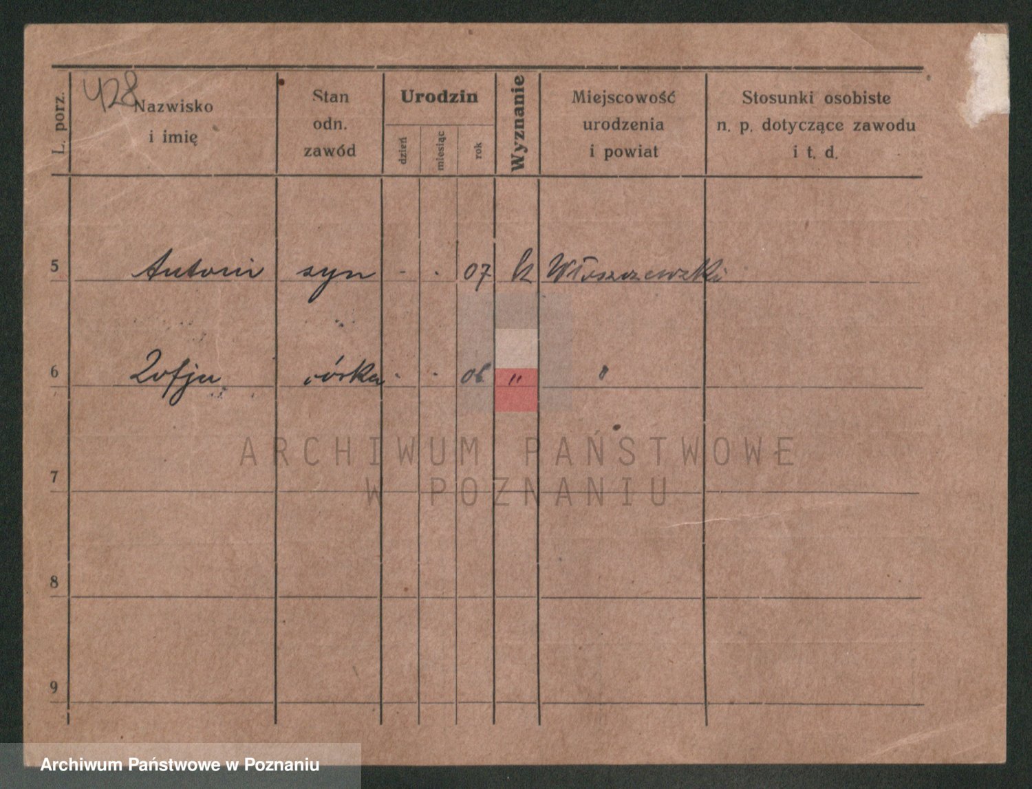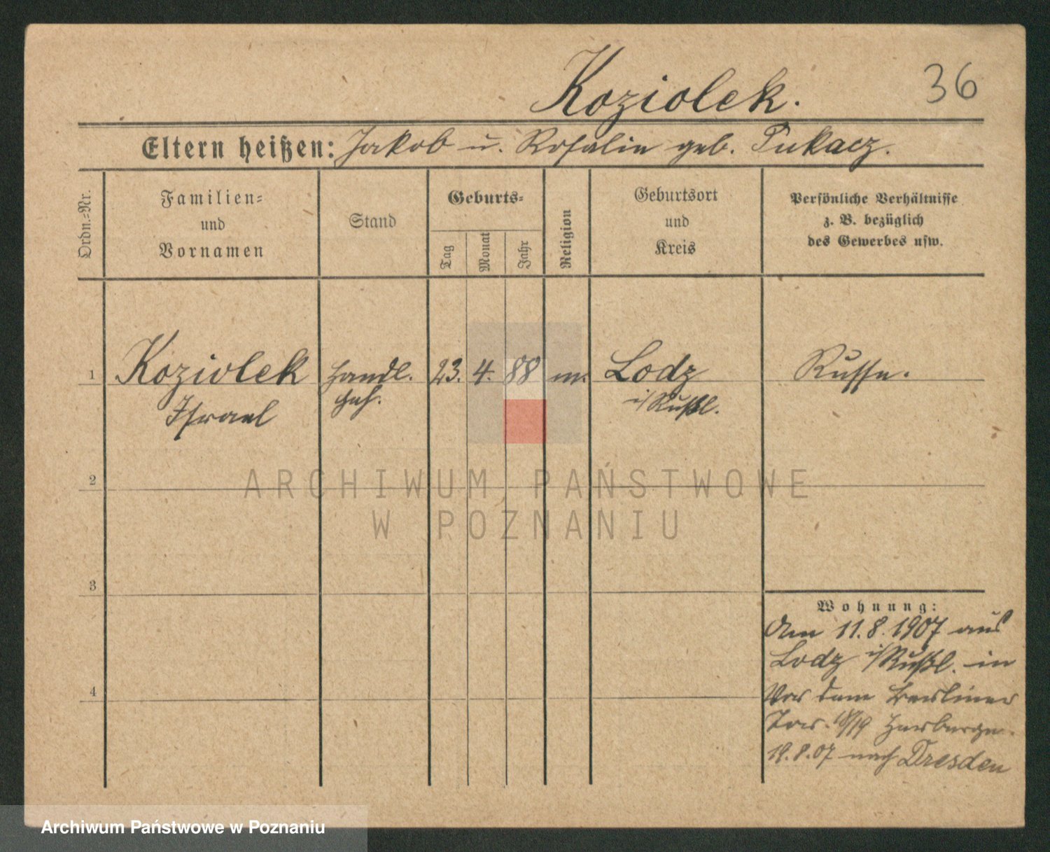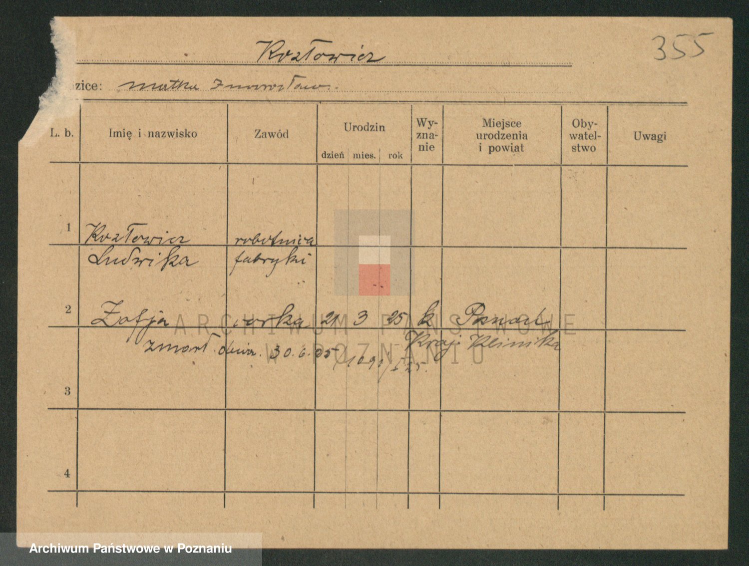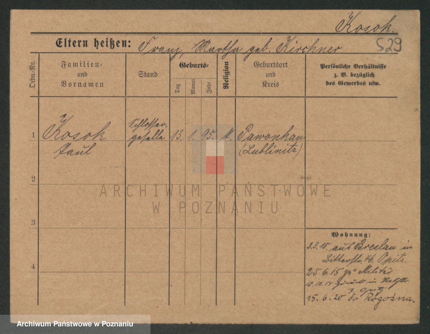 Podgląd karty osobowej dostępny jest po kliknięciu na nazwisko lub ikonkę karty. Można dokonywać powiększenia (ikony na górze) lub przechodzić między kolejnymi skanami (strzałki po bokach).