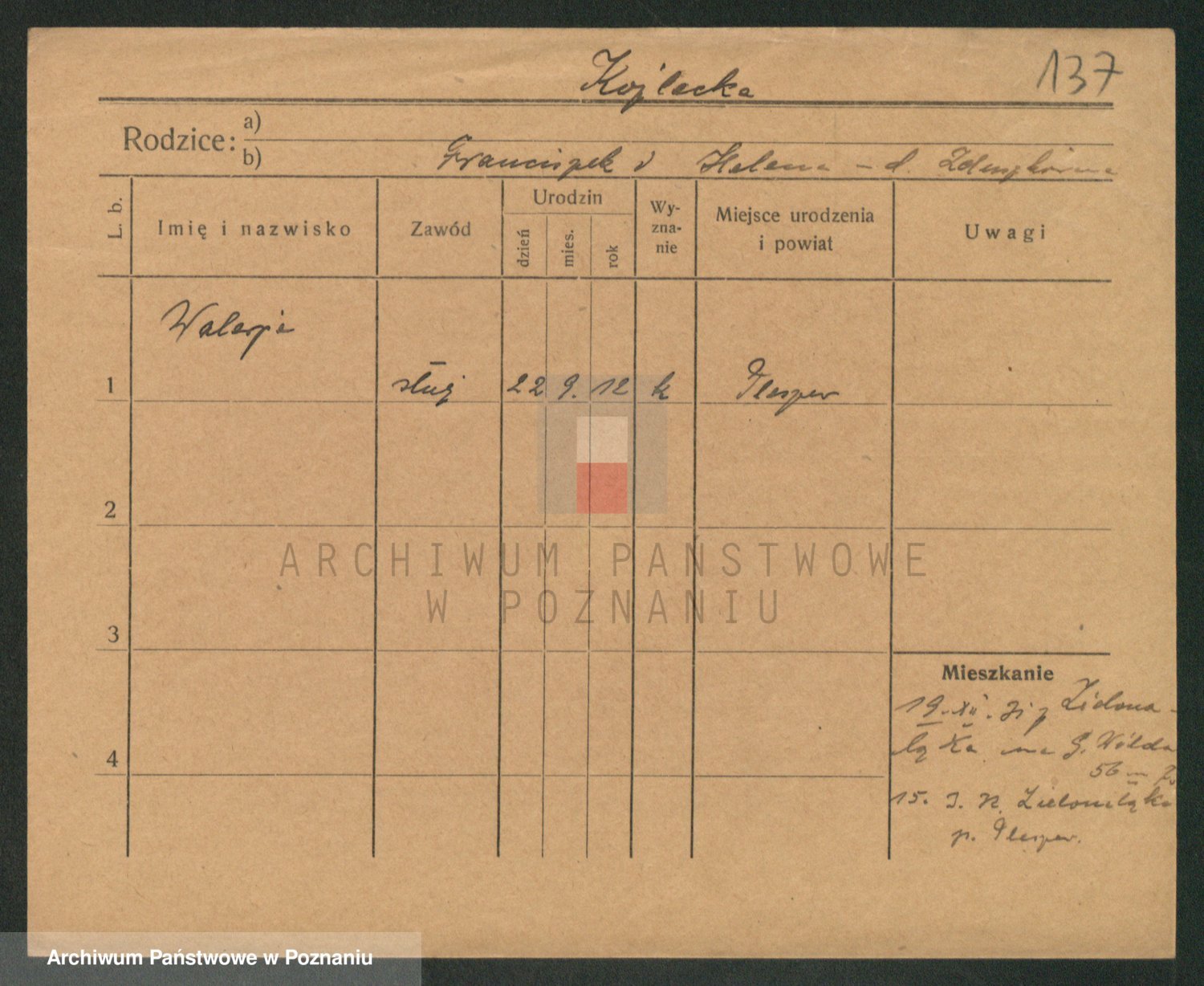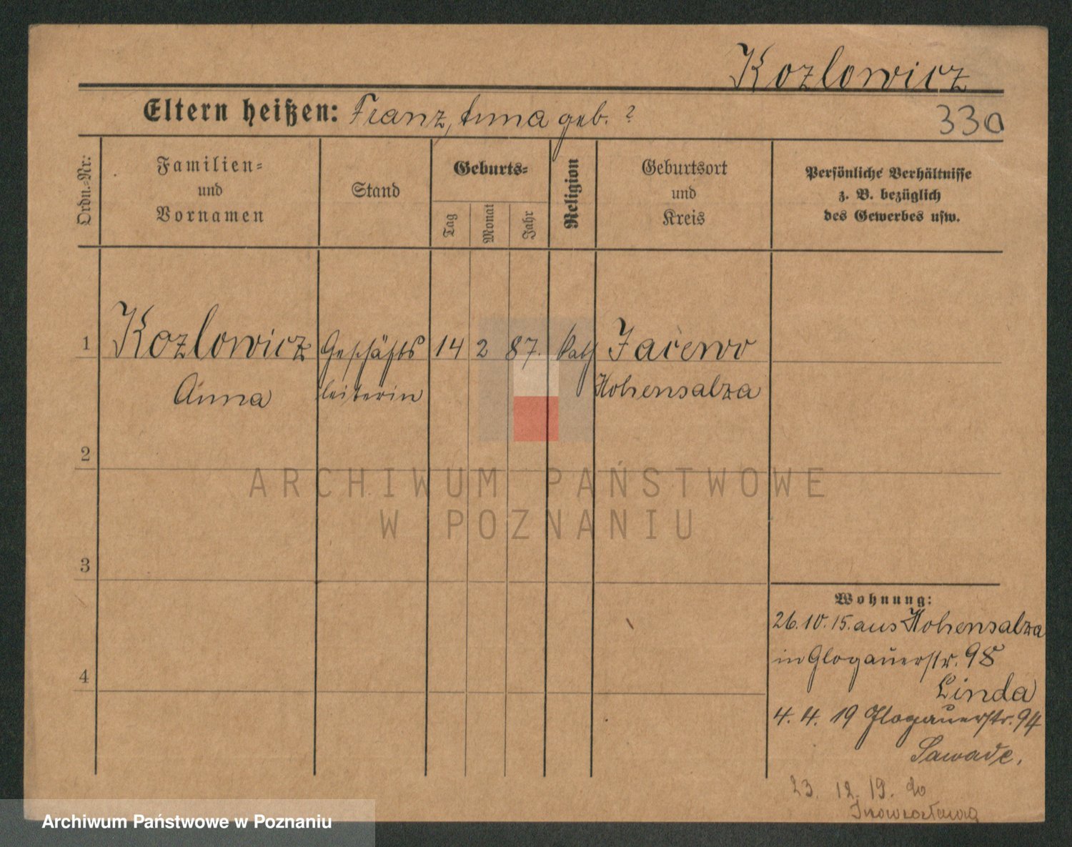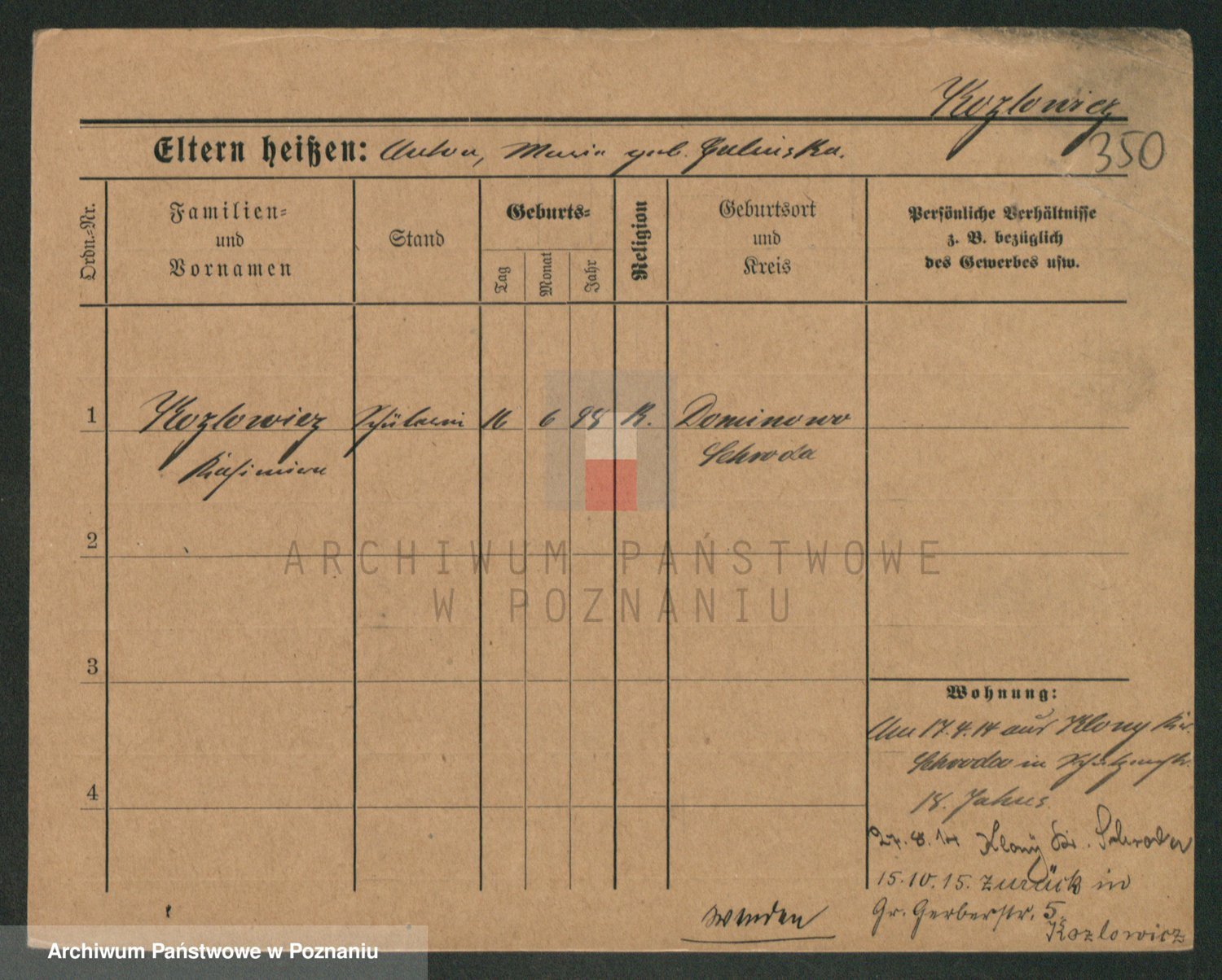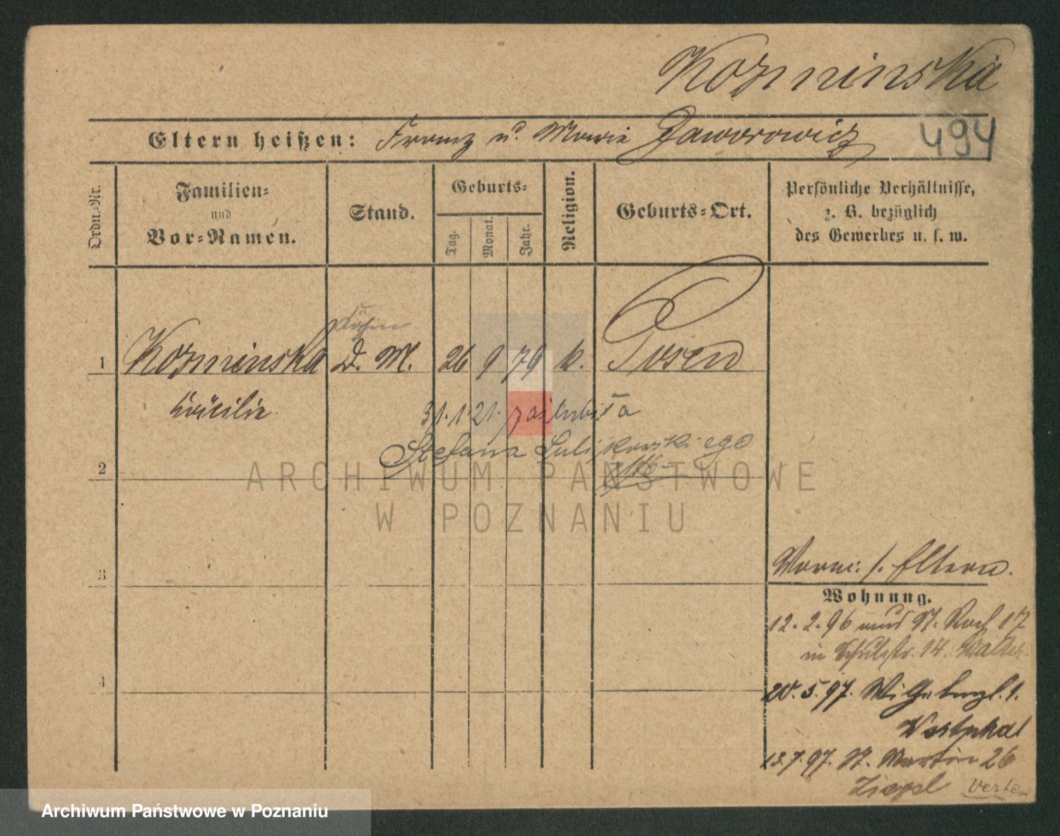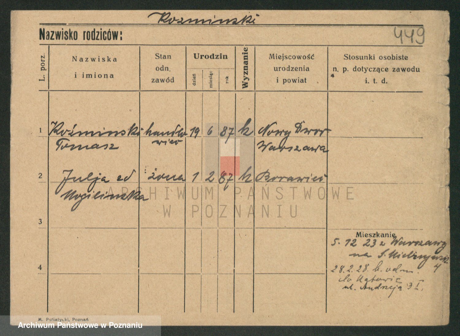 Podgląd karty osobowej dostępny jest po kliknięciu na nazwisko lub ikonkę karty. Można dokonywać powiększenia (ikony na górze) lub przechodzić między kolejnymi skanami (strzałki po bokach).