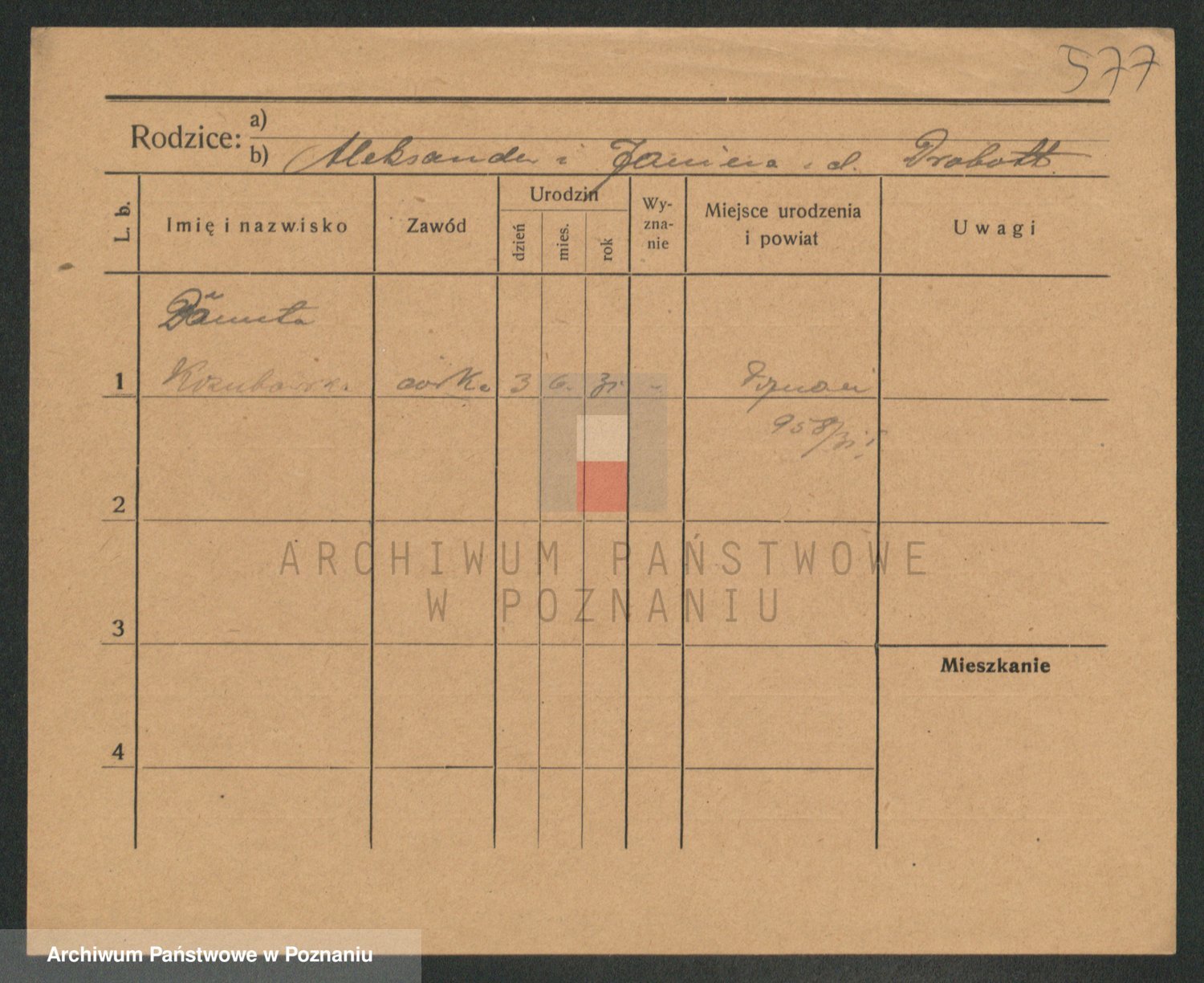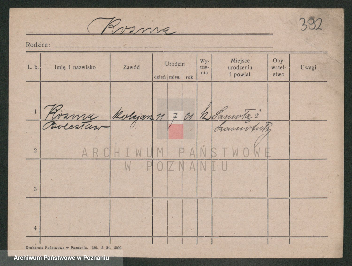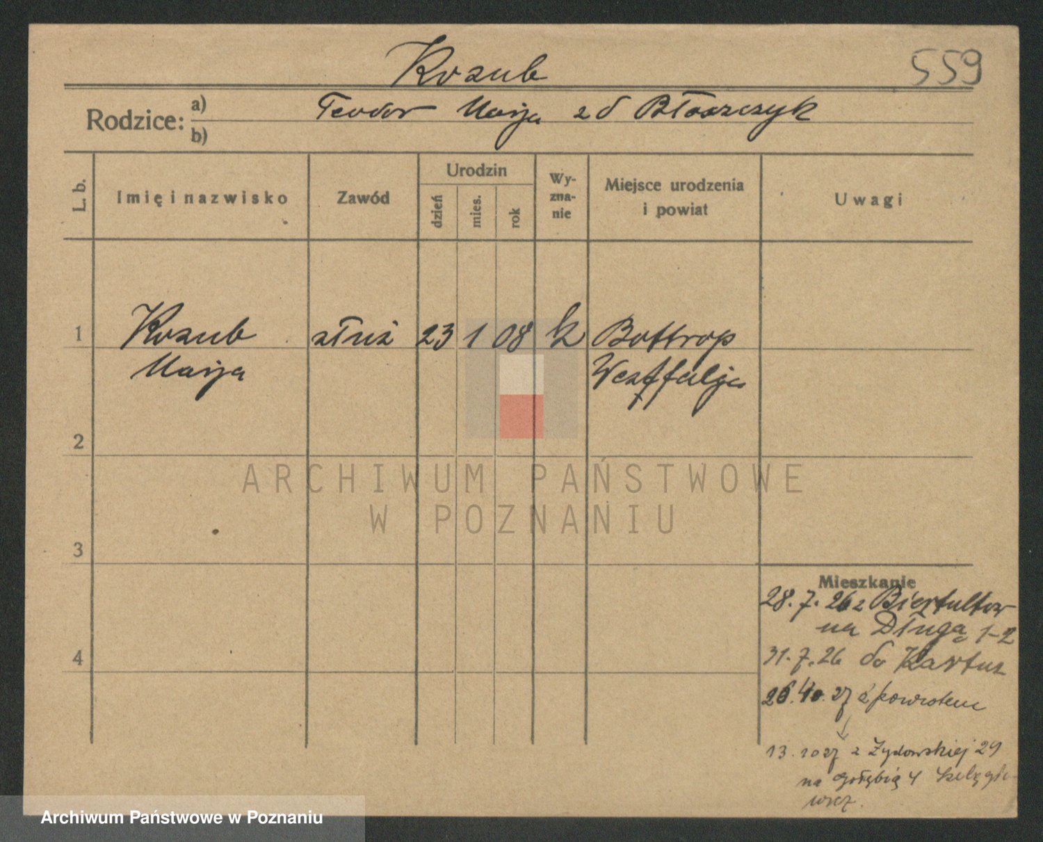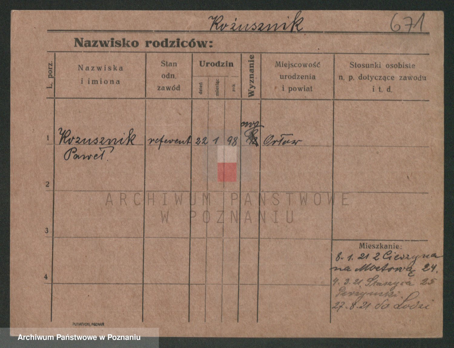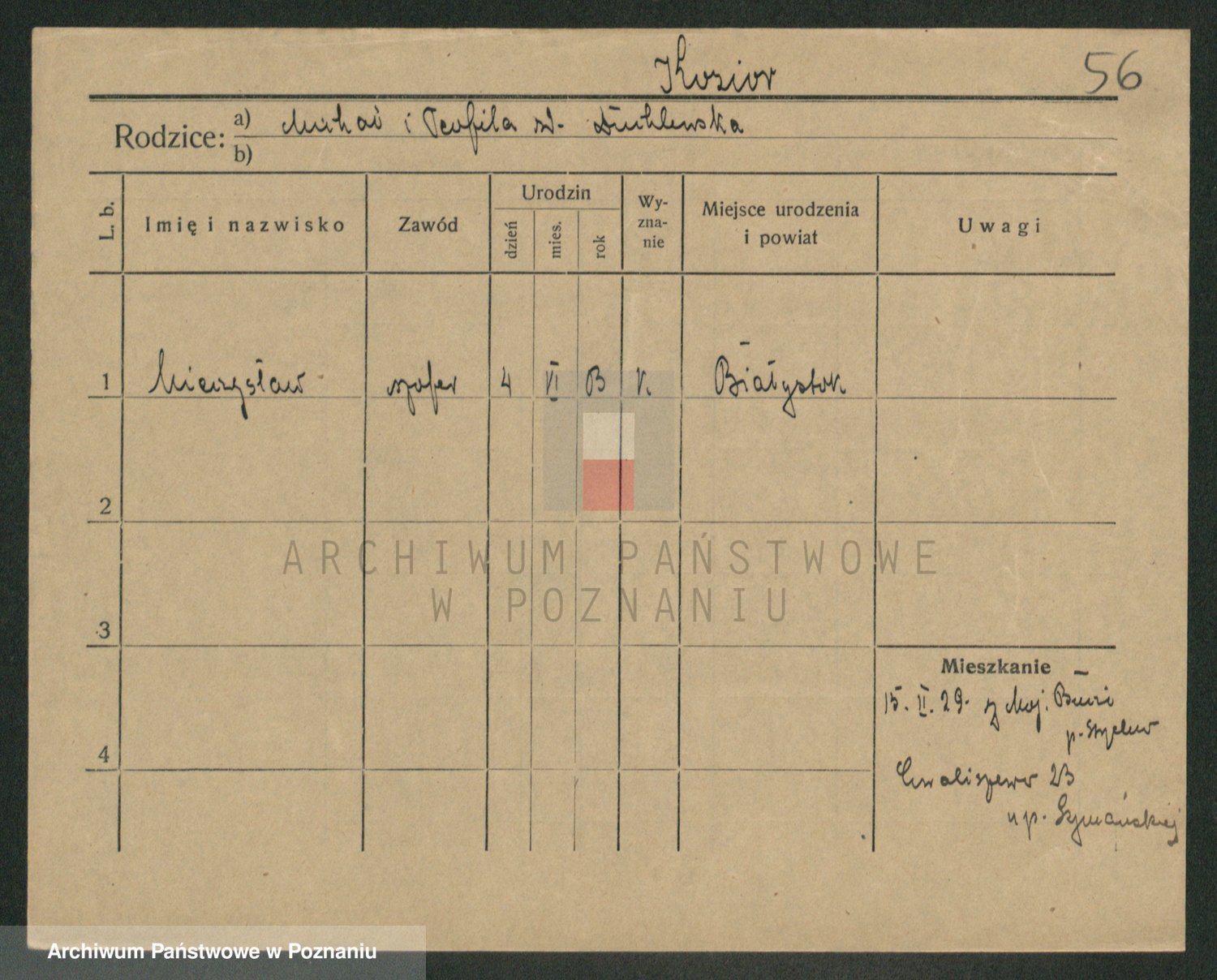 Podgląd karty osobowej dostępny jest po kliknięciu na nazwisko lub ikonkę karty. Można dokonywać powiększenia (ikony na górze) lub przechodzić między kolejnymi skanami (strzałki po bokach).