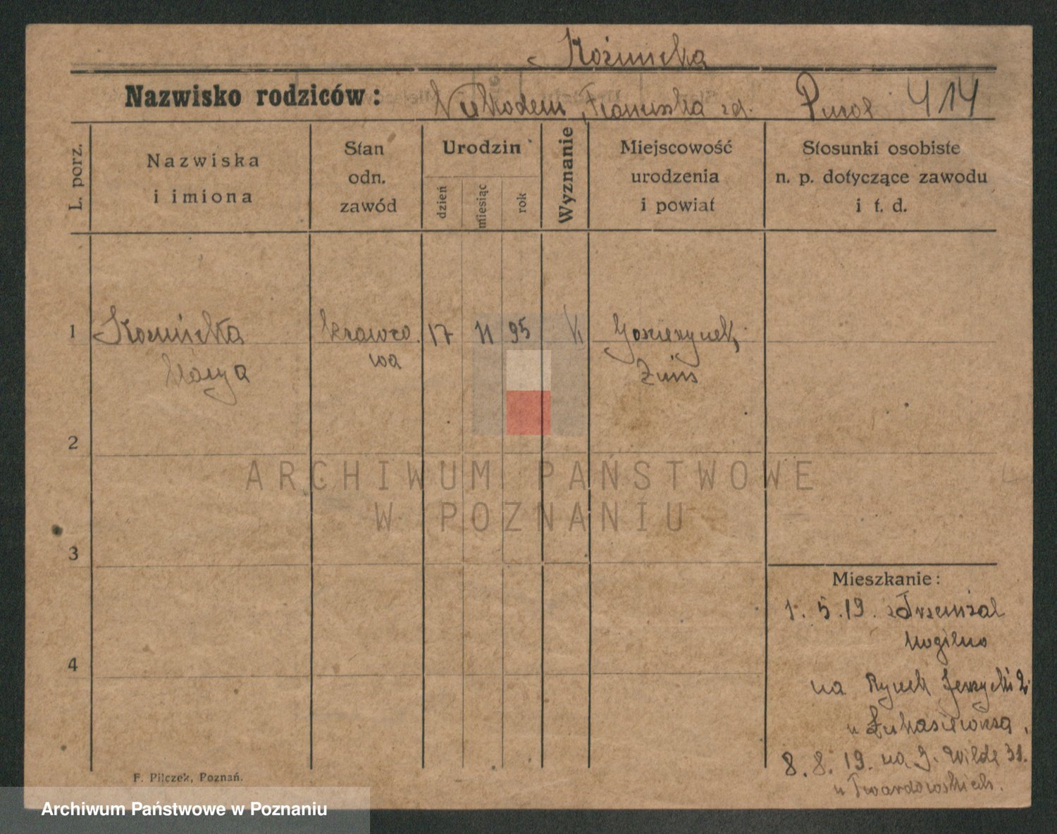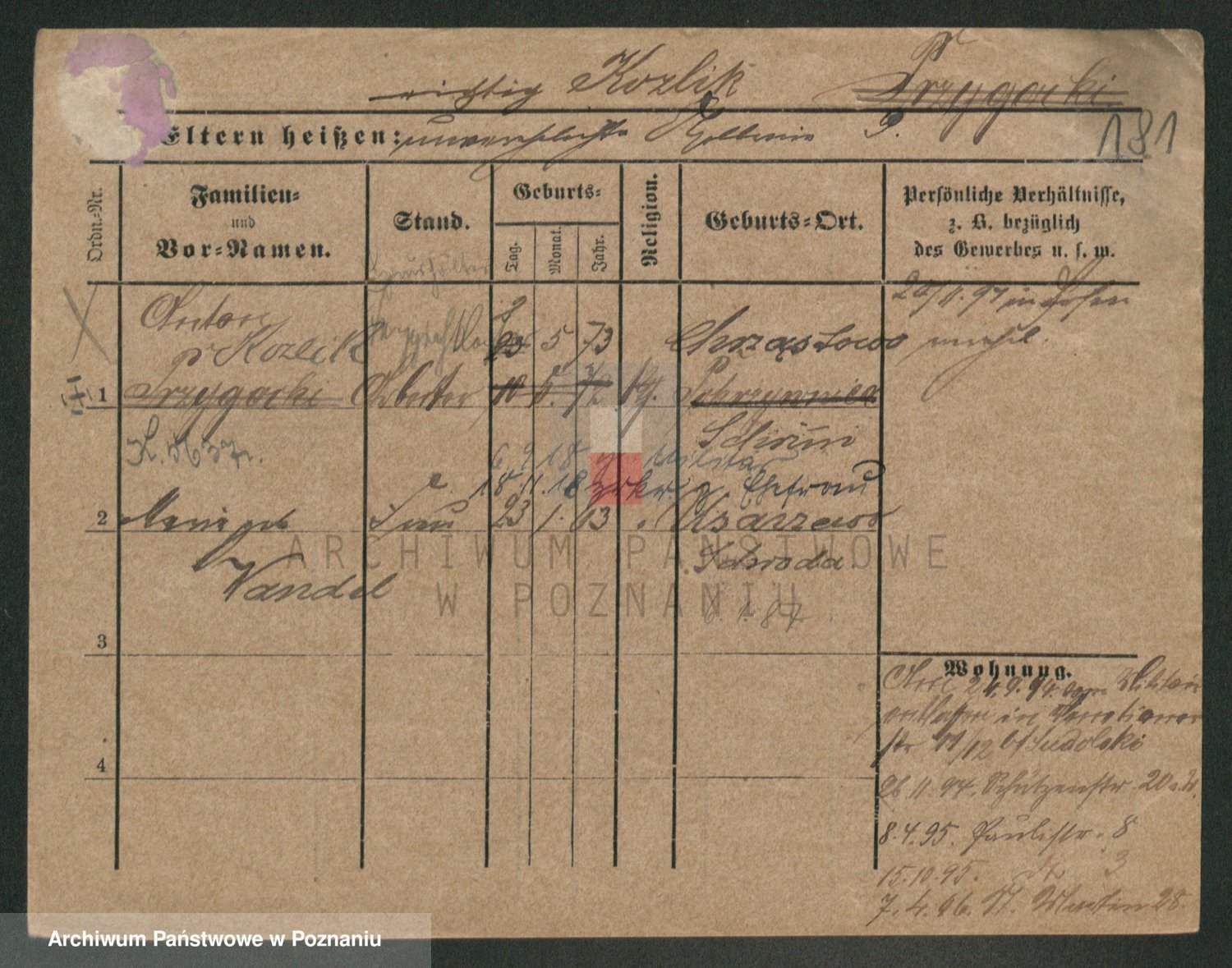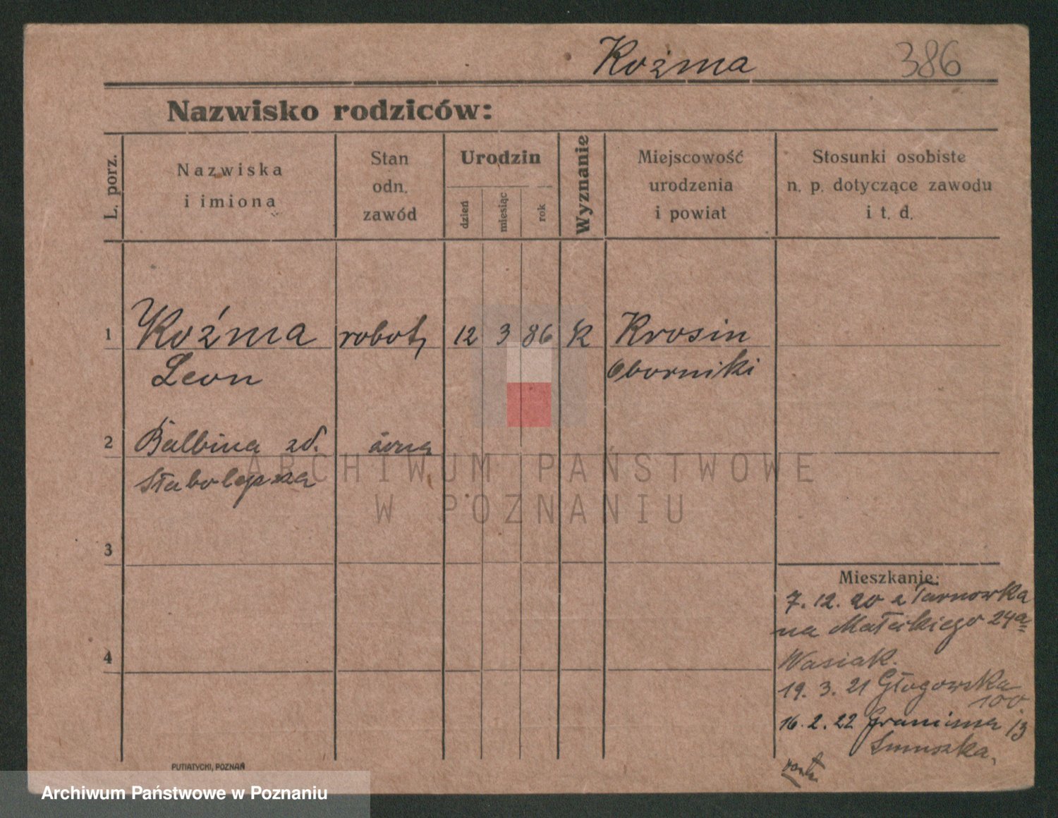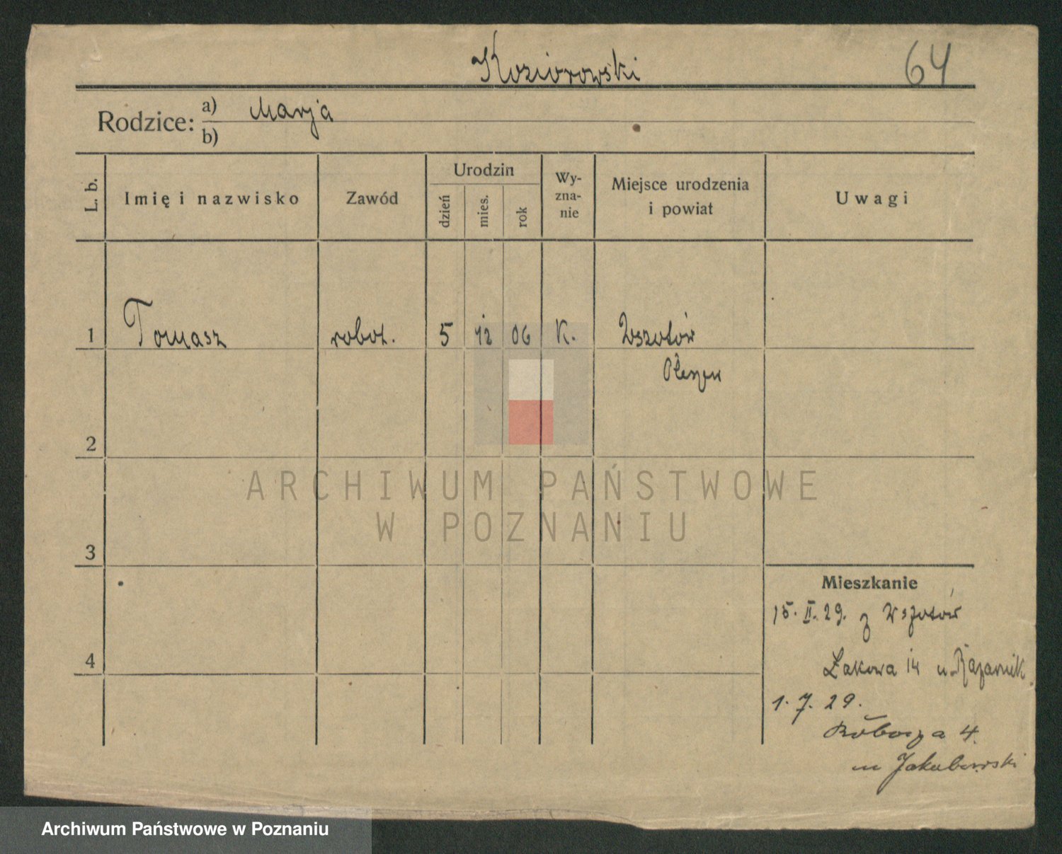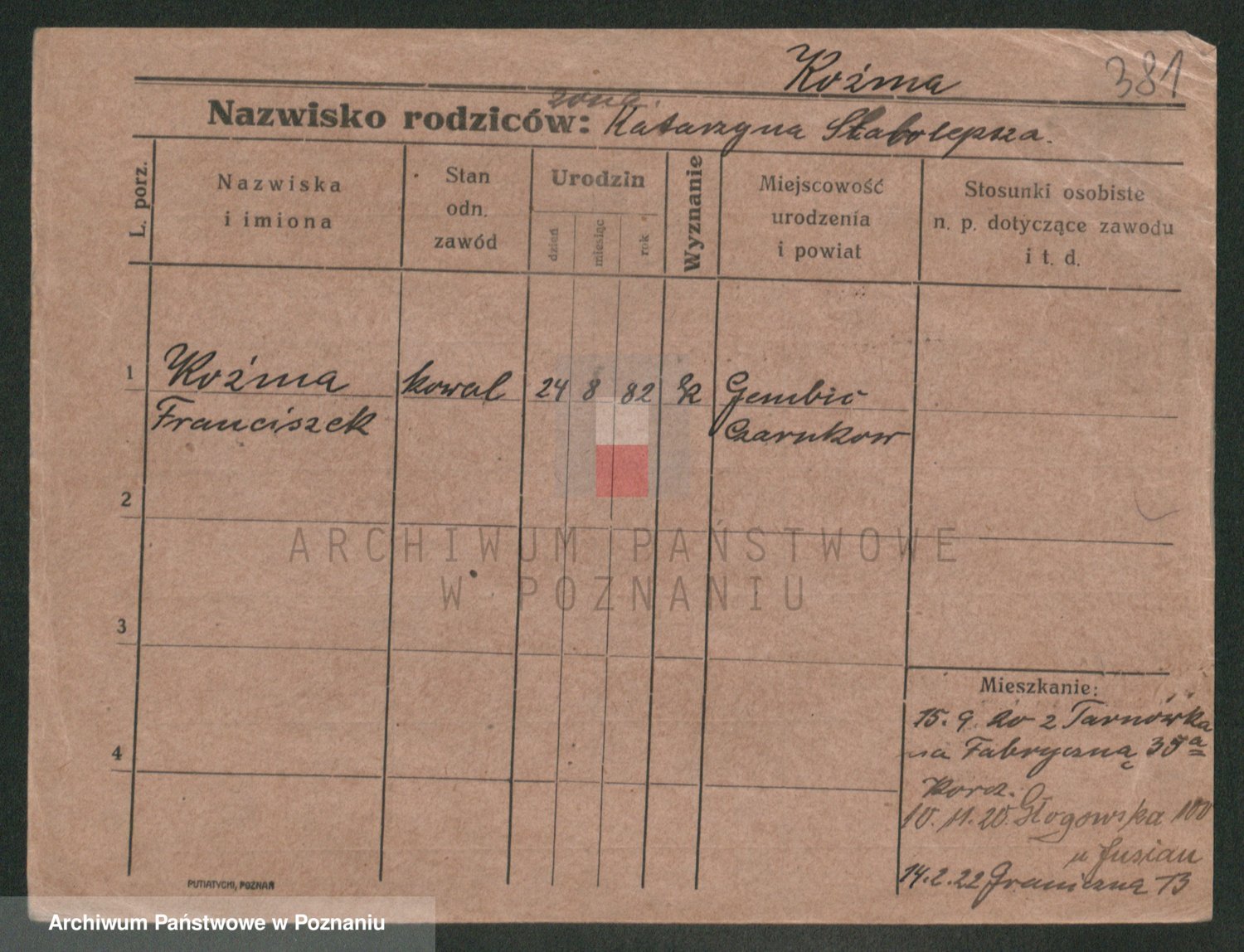 Podgląd karty osobowej dostępny jest po kliknięciu na nazwisko lub ikonkę karty. Można dokonywać powiększenia (ikony na górze) lub przechodzić między kolejnymi skanami (strzałki po bokach).