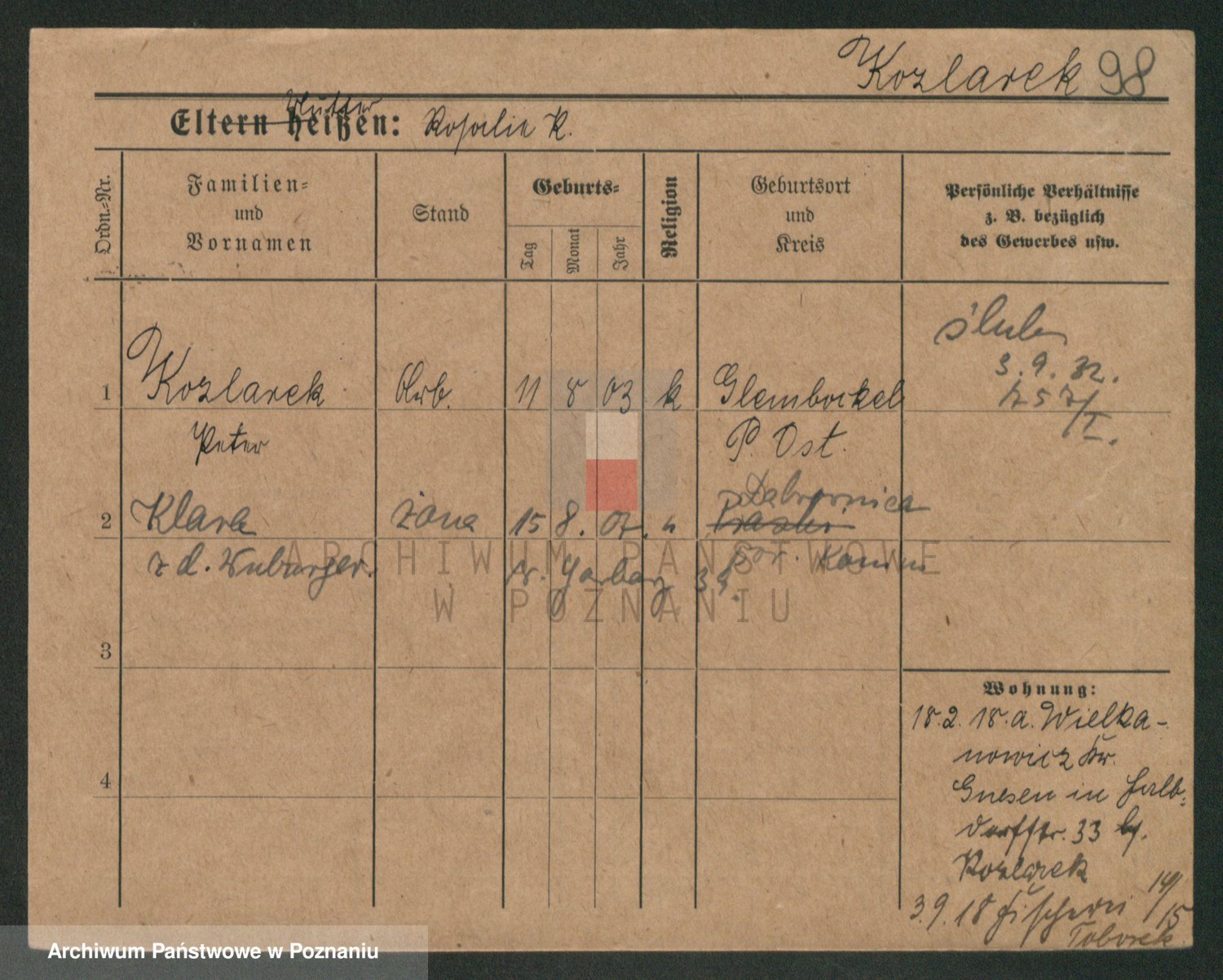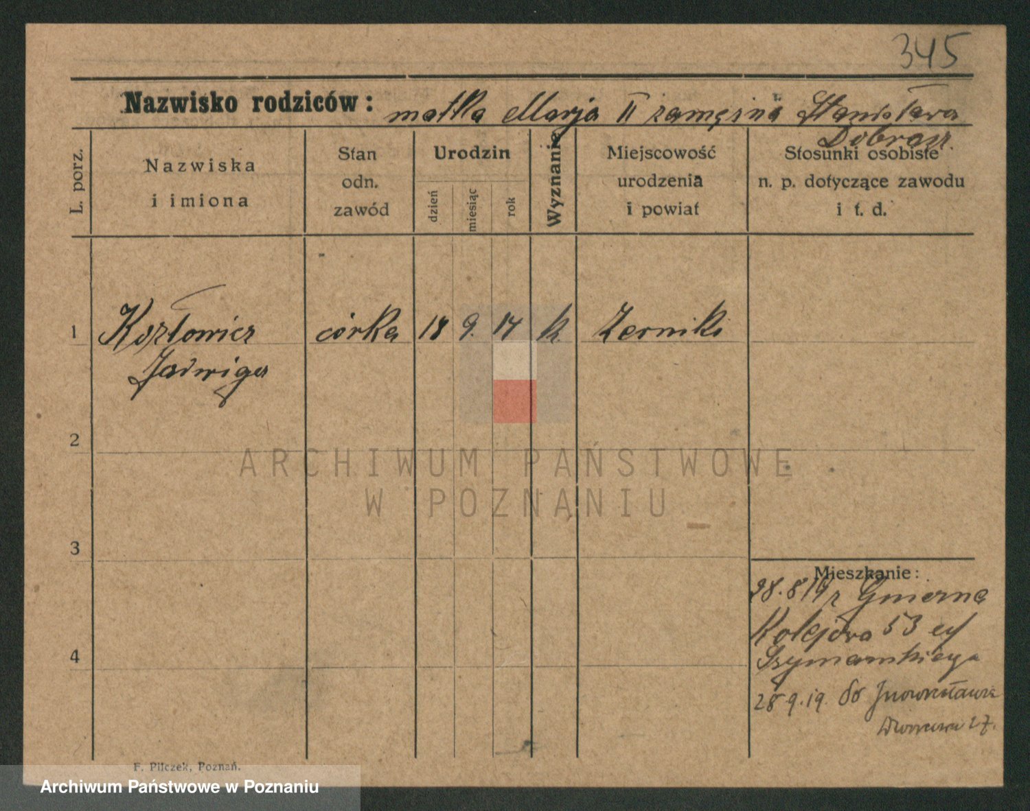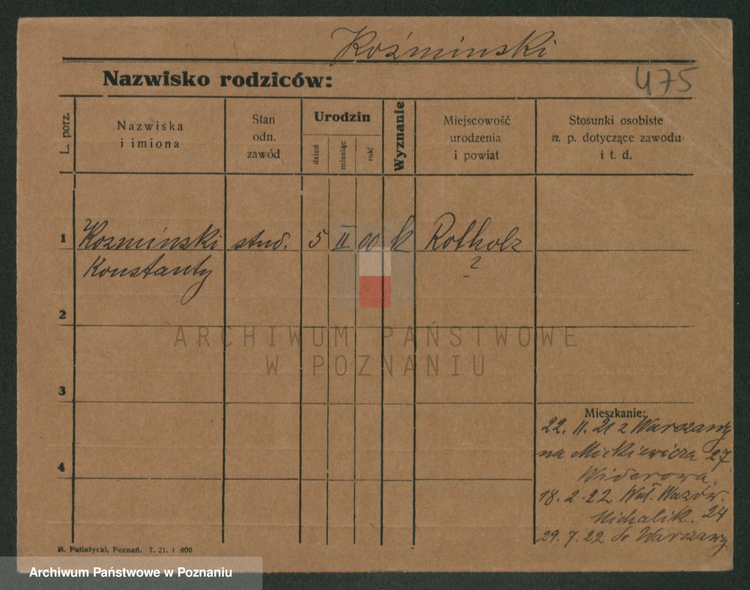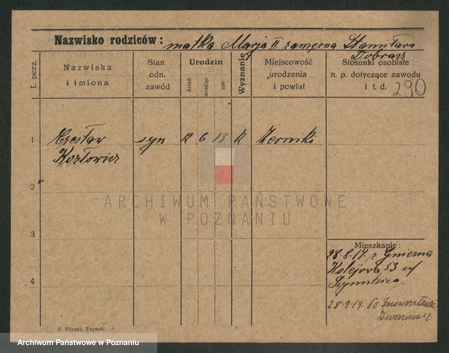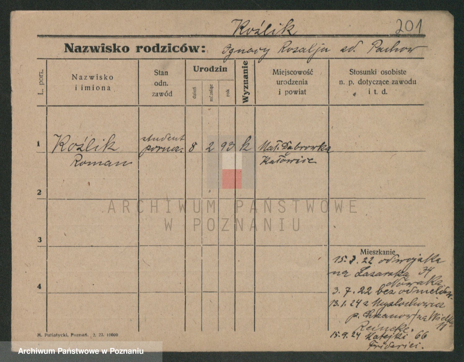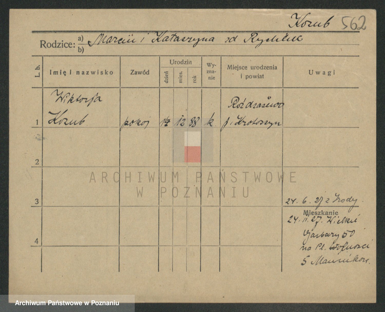 Podgląd karty osobowej dostępny jest po kliknięciu na nazwisko lub ikonkę karty. Można dokonywać powiększenia (ikony na górze) lub przechodzić między kolejnymi skanami (strzałki po bokach).