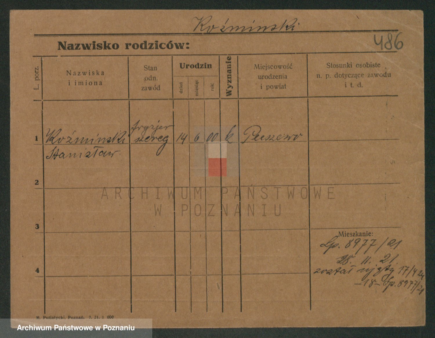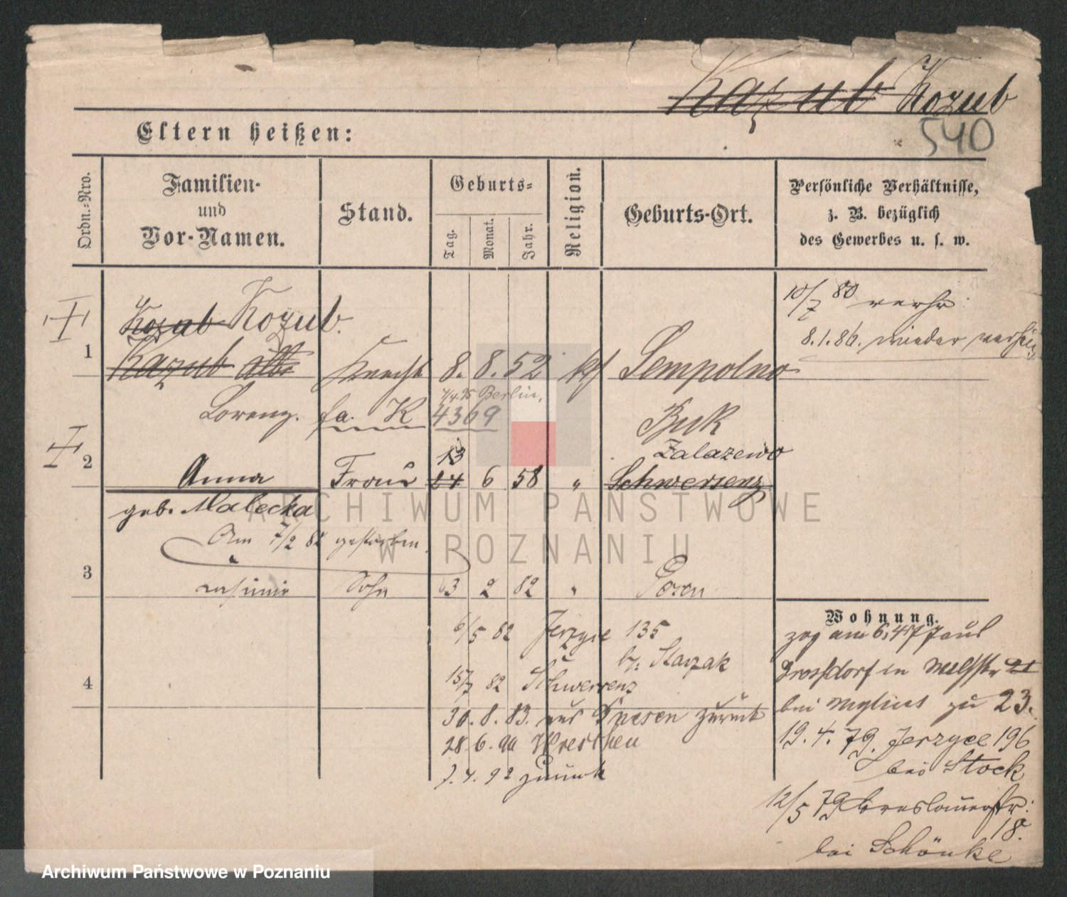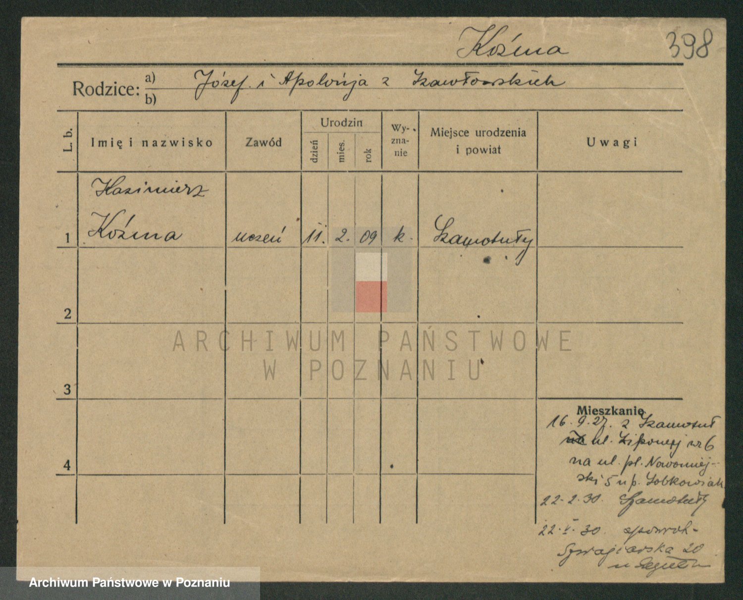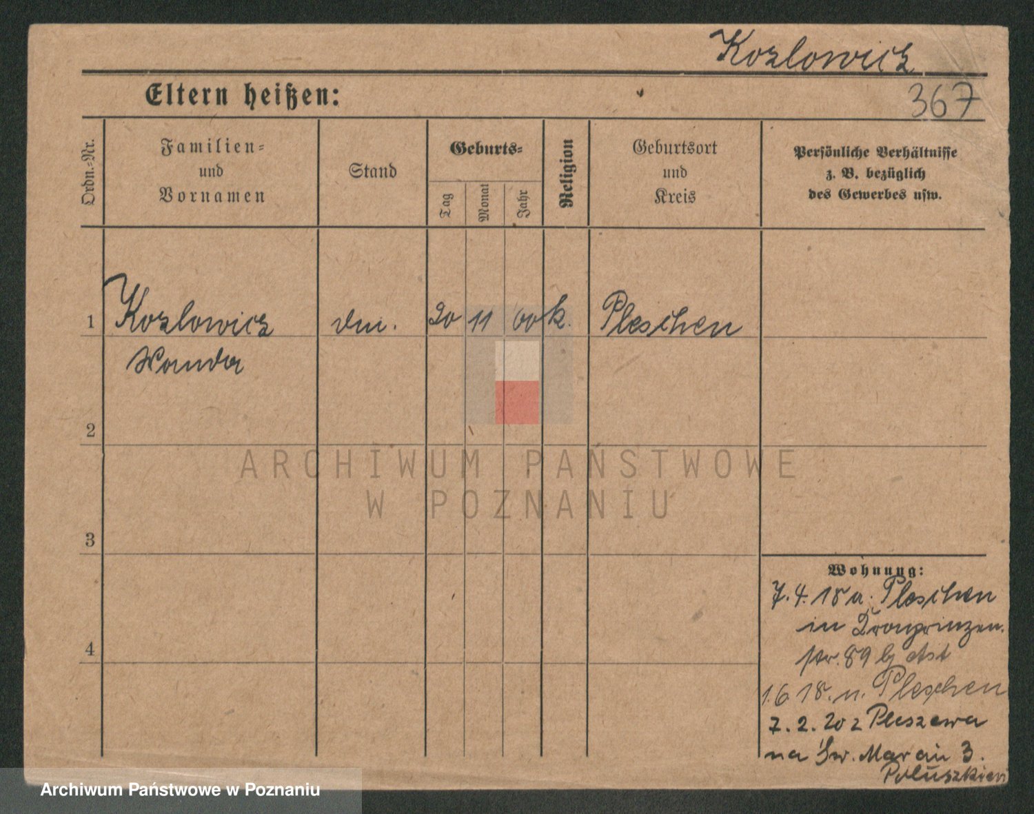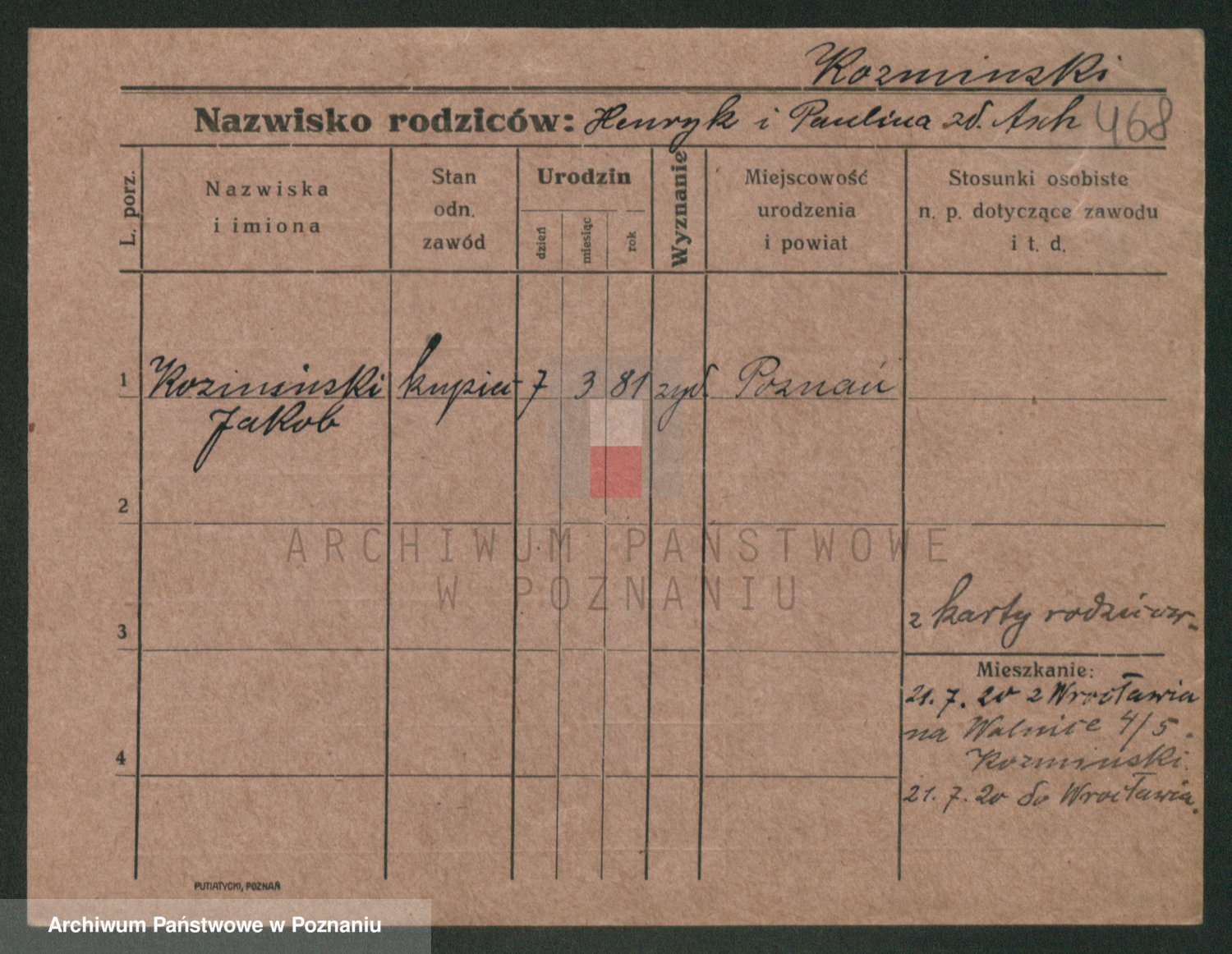 Podgląd karty osobowej dostępny jest po kliknięciu na nazwisko lub ikonkę karty. Można dokonywać powiększenia (ikony na górze) lub przechodzić między kolejnymi skanami (strzałki po bokach).