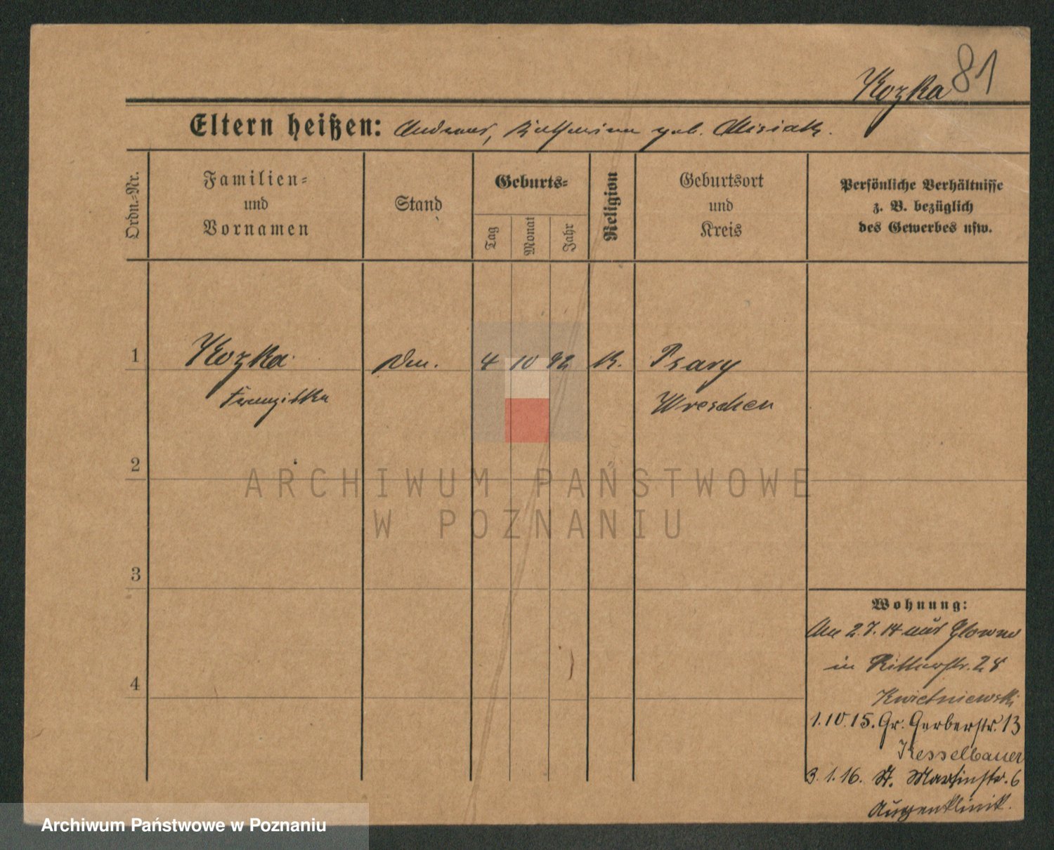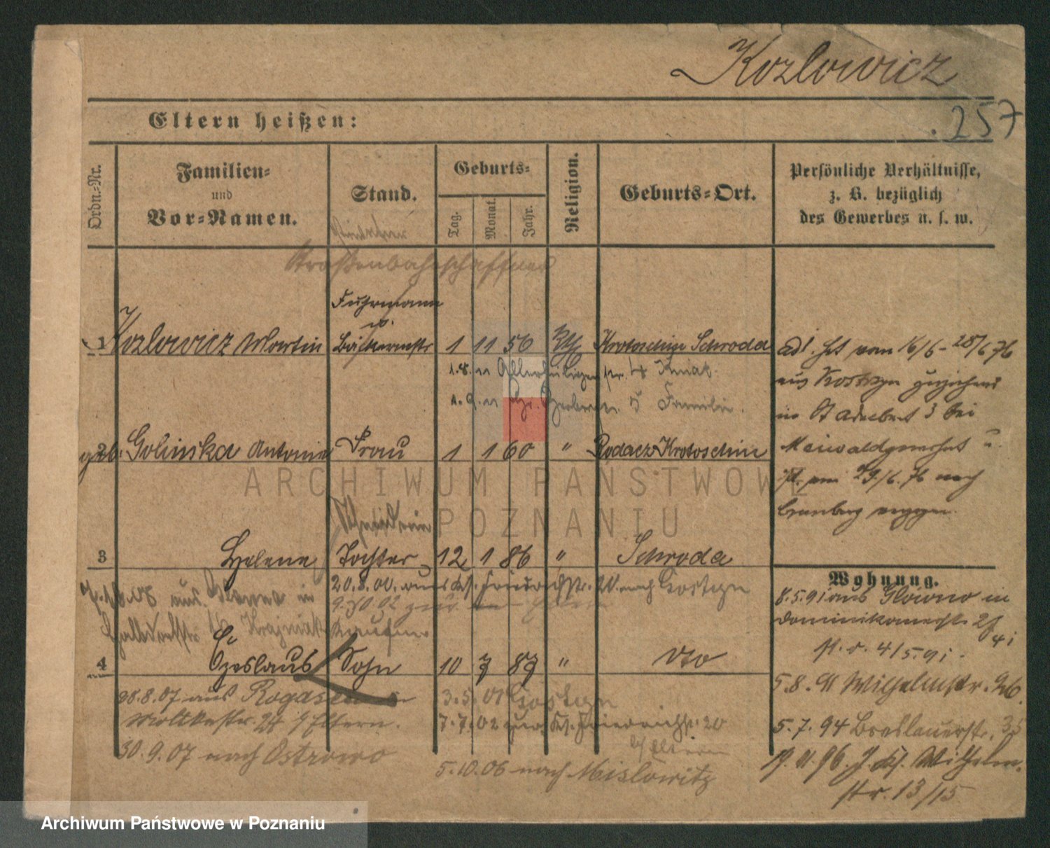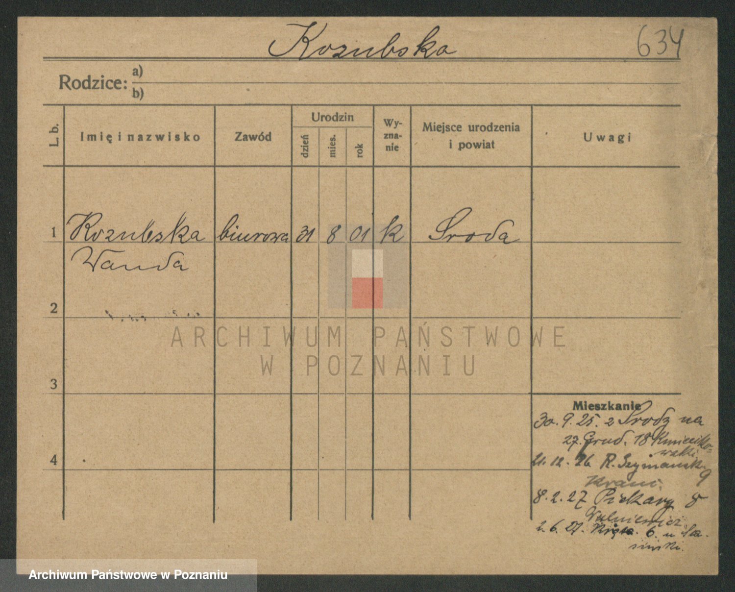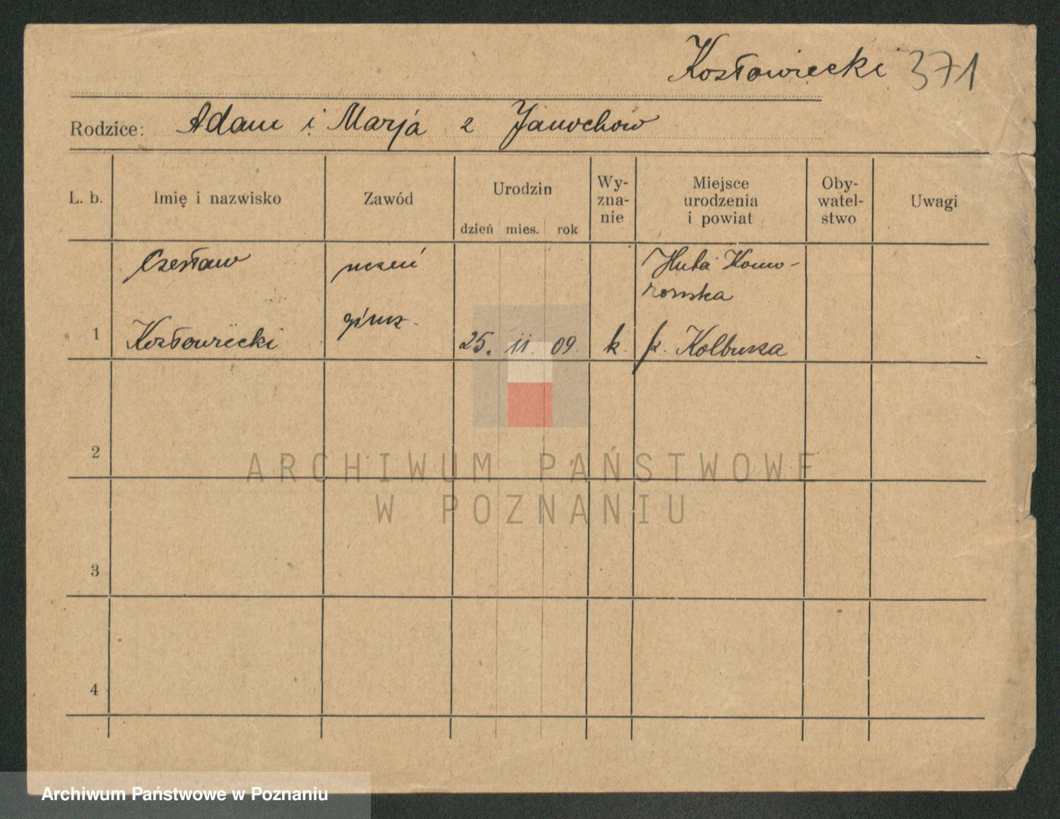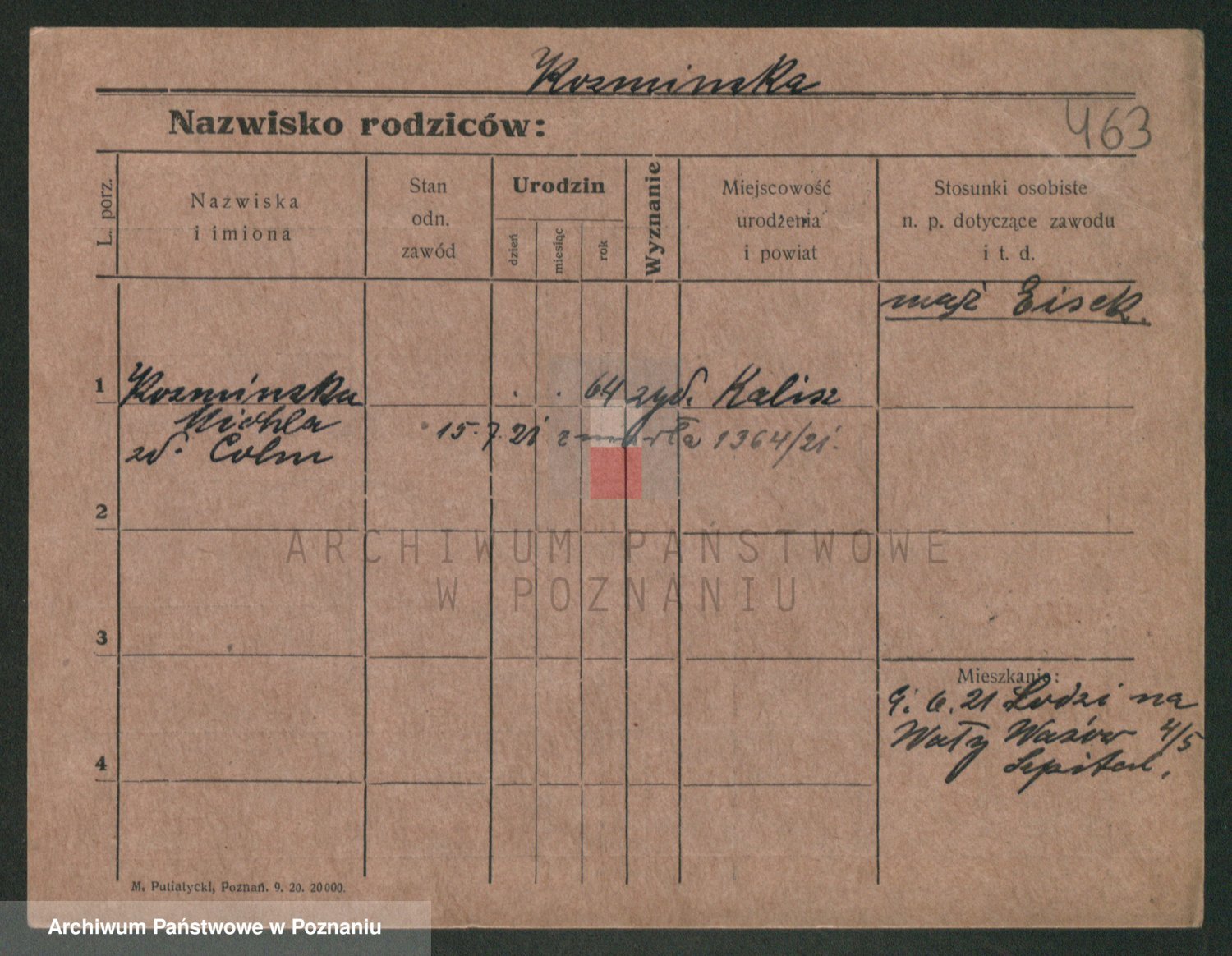 Podgląd karty osobowej dostępny jest po kliknięciu na nazwisko lub ikonkę karty. Można dokonywać powiększenia (ikony na górze) lub przechodzić między kolejnymi skanami (strzałki po bokach).