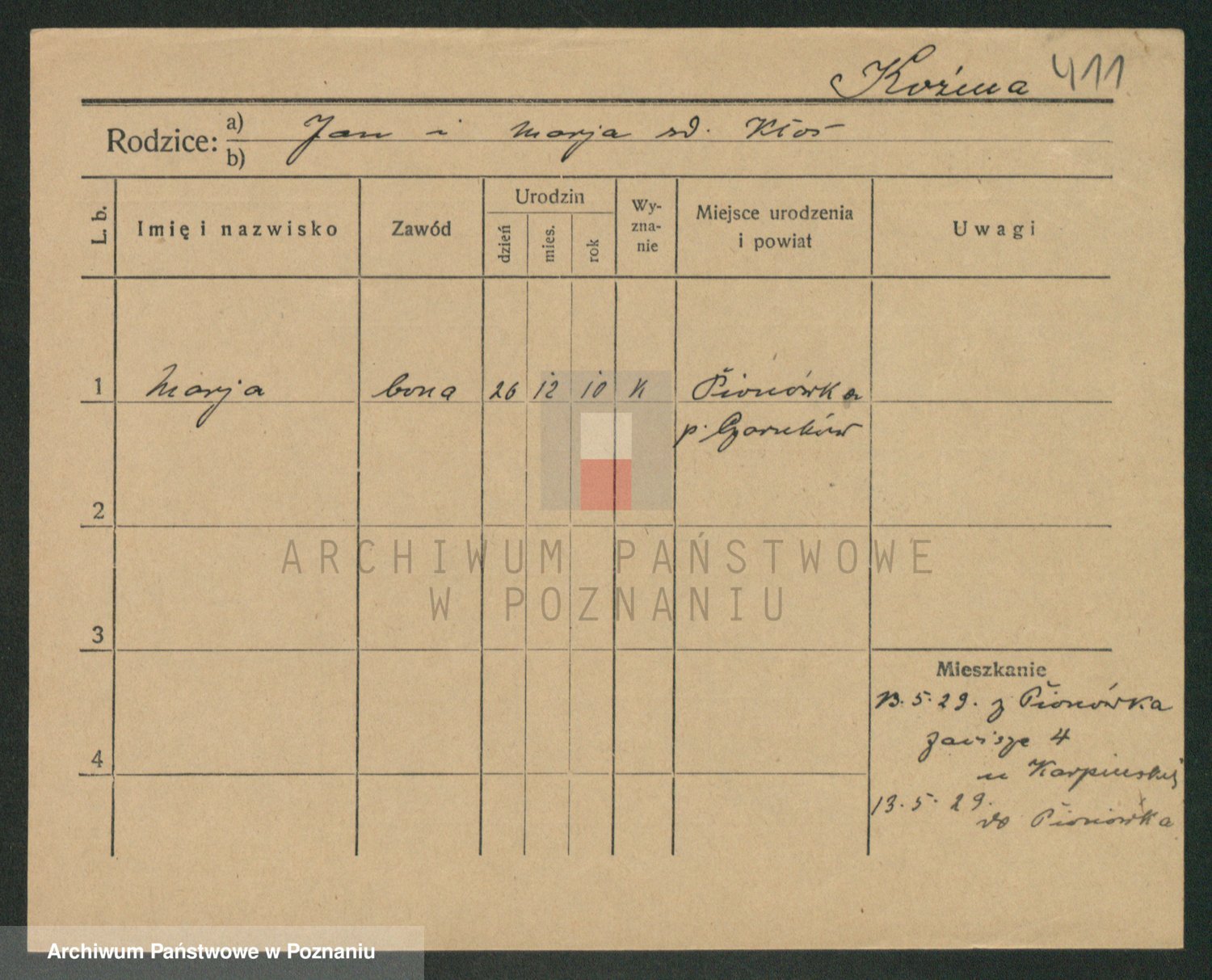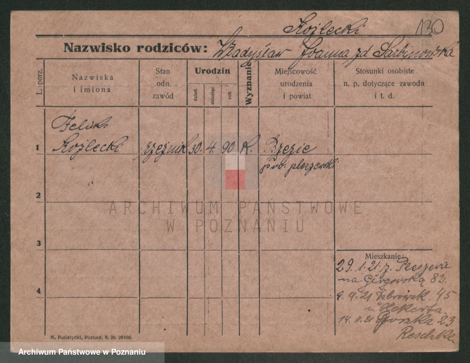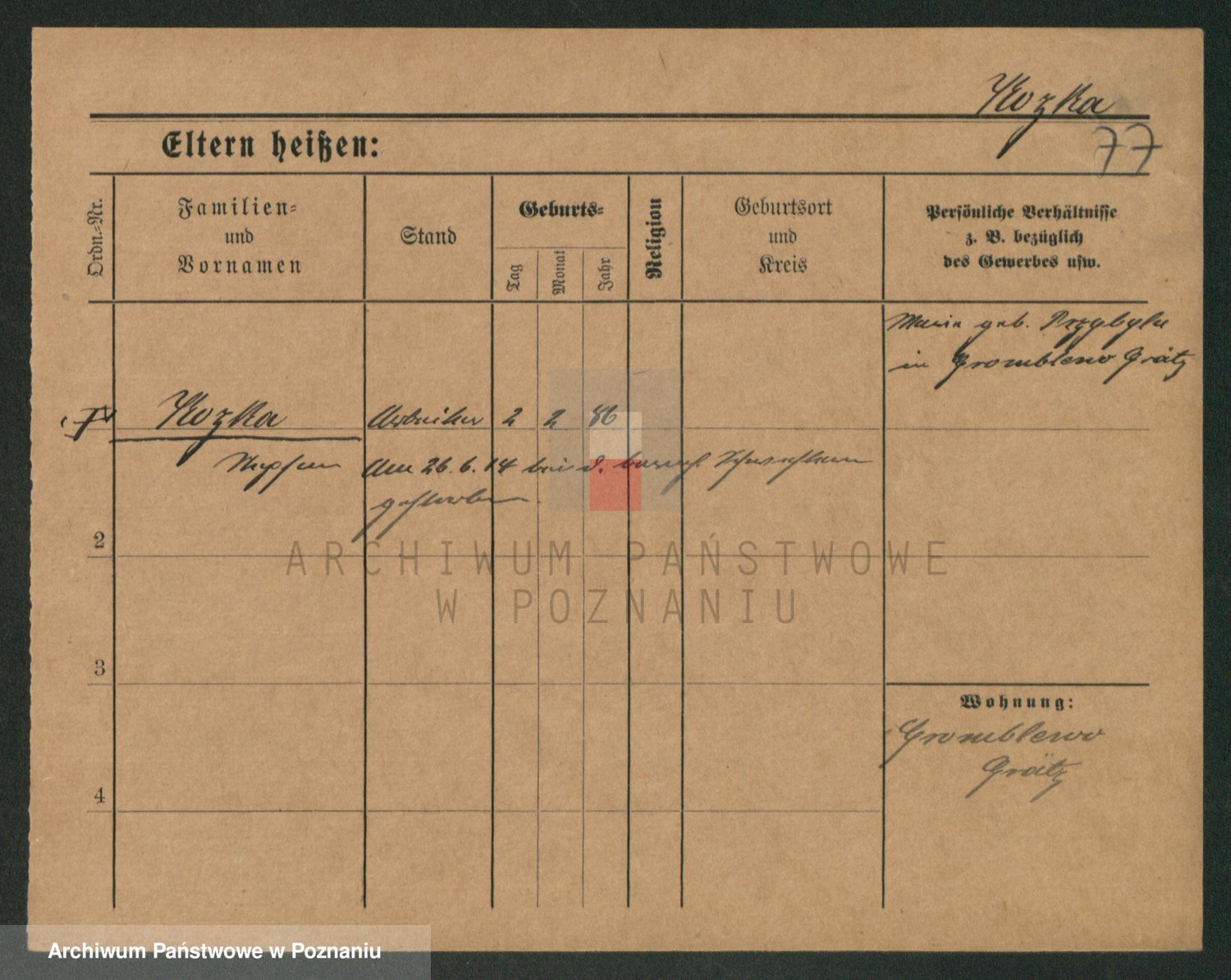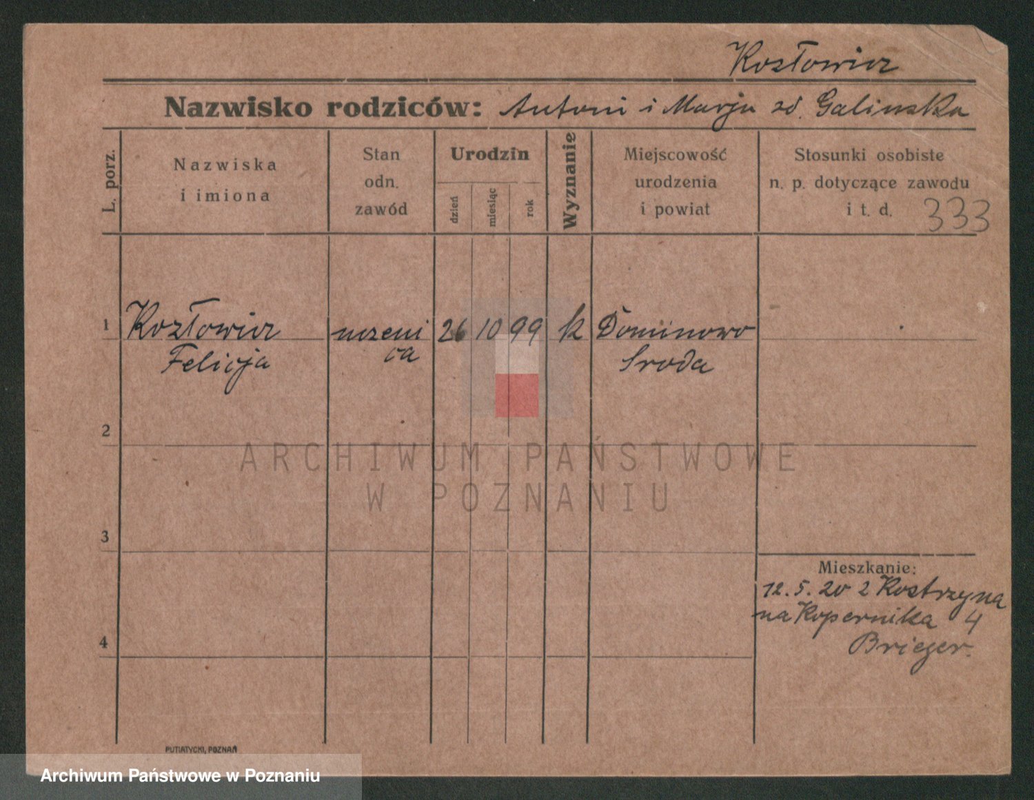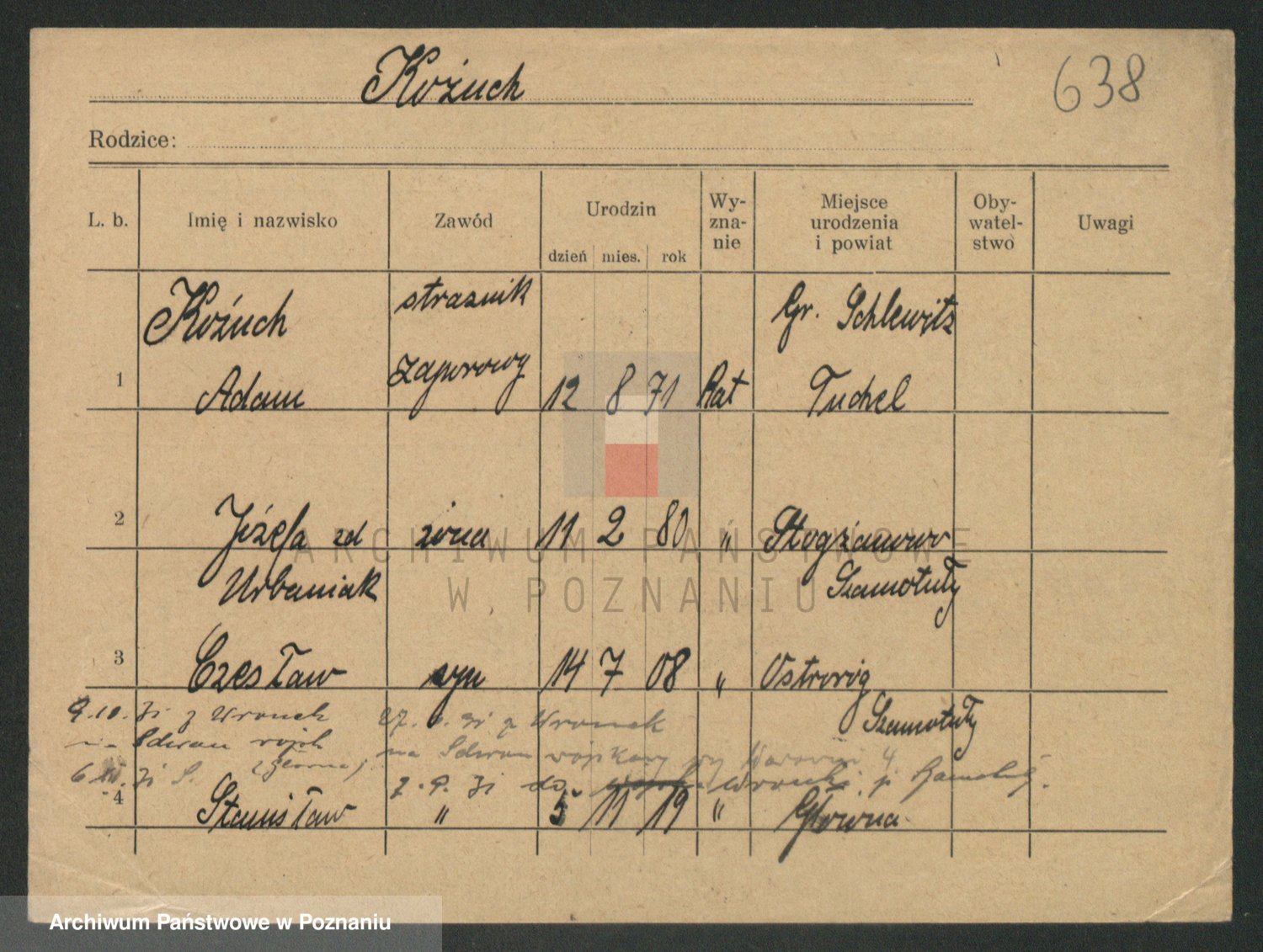 Podgląd karty osobowej dostępny jest po kliknięciu na nazwisko lub ikonkę karty. Można dokonywać powiększenia (ikony na górze) lub przechodzić między kolejnymi skanami (strzałki po bokach).