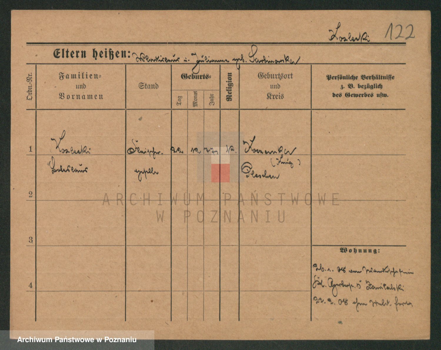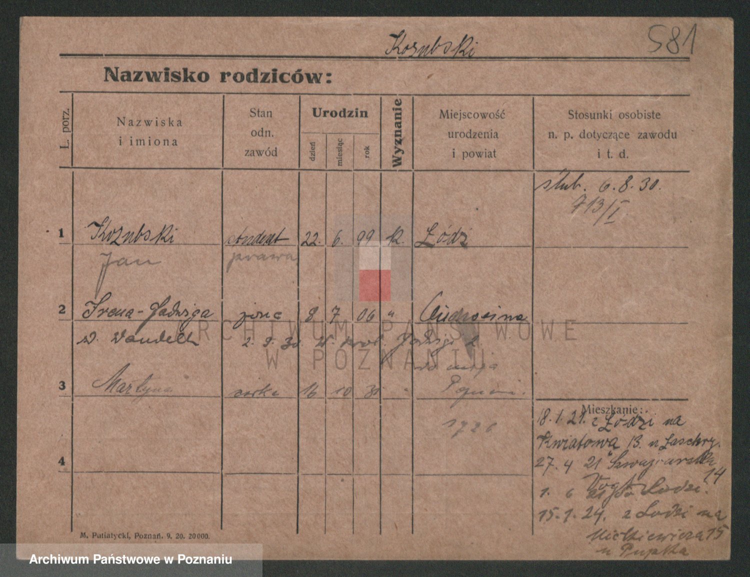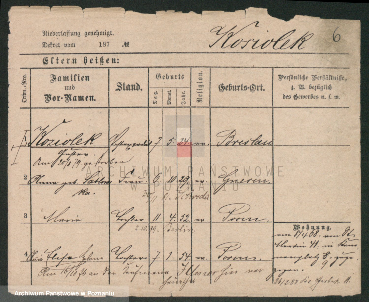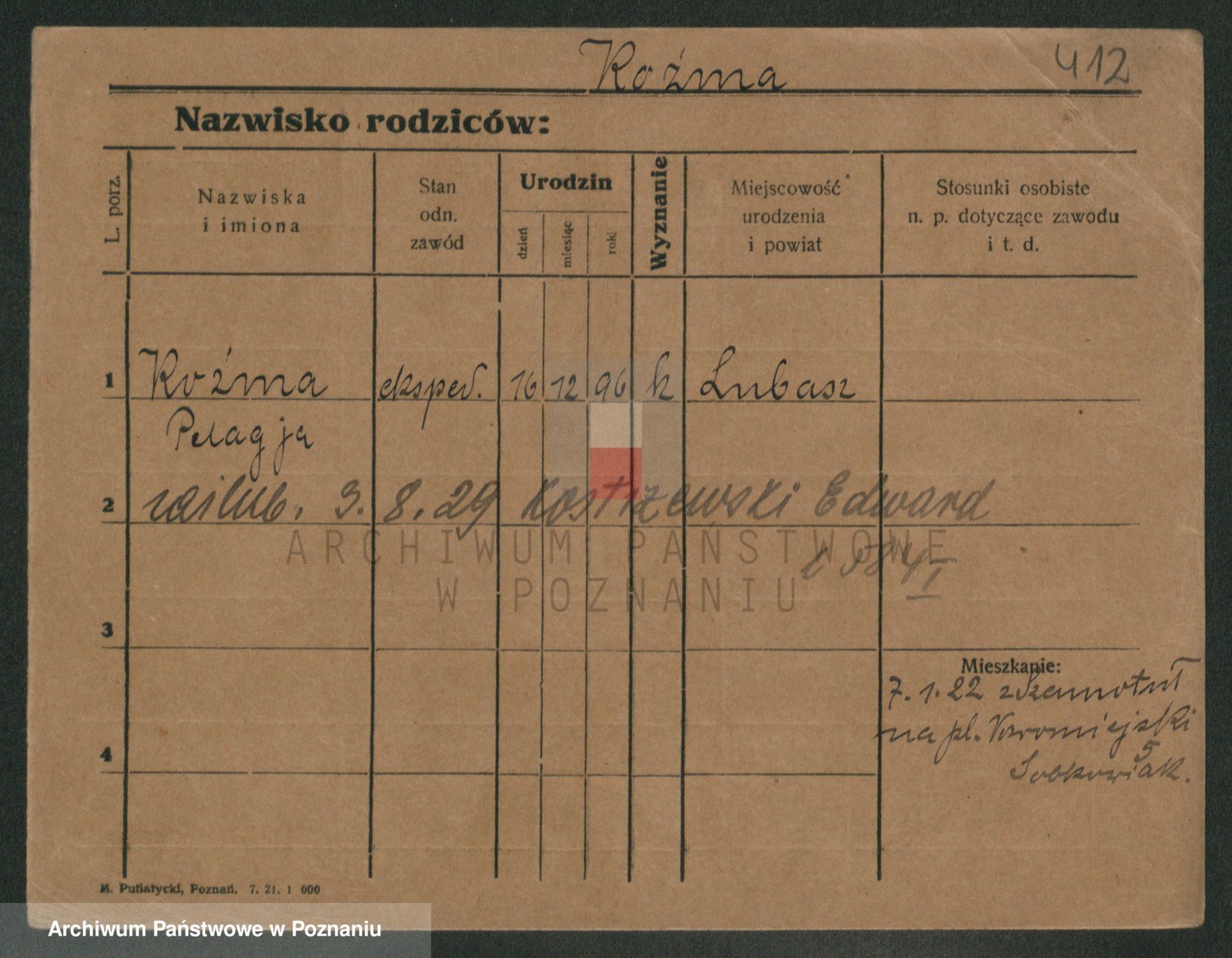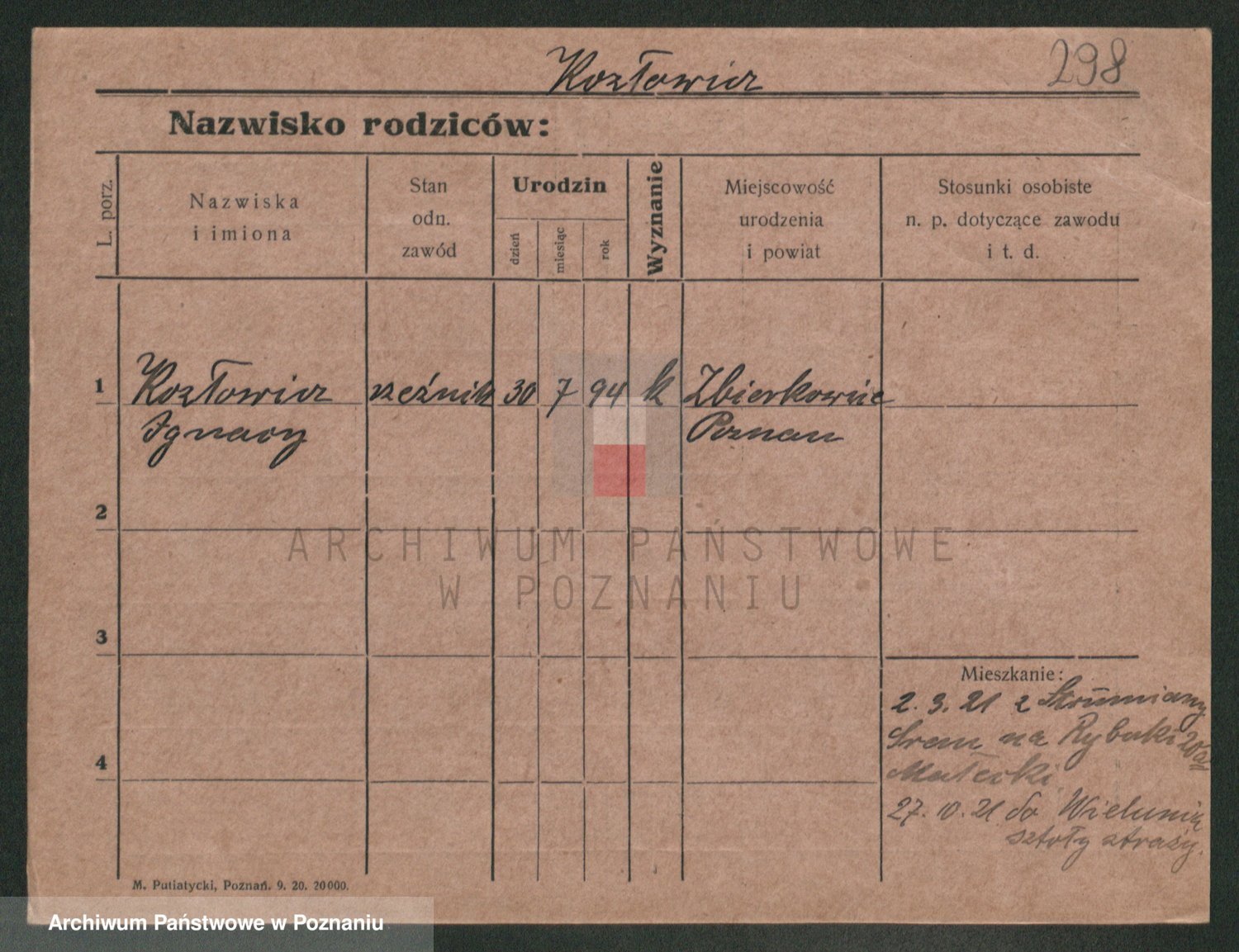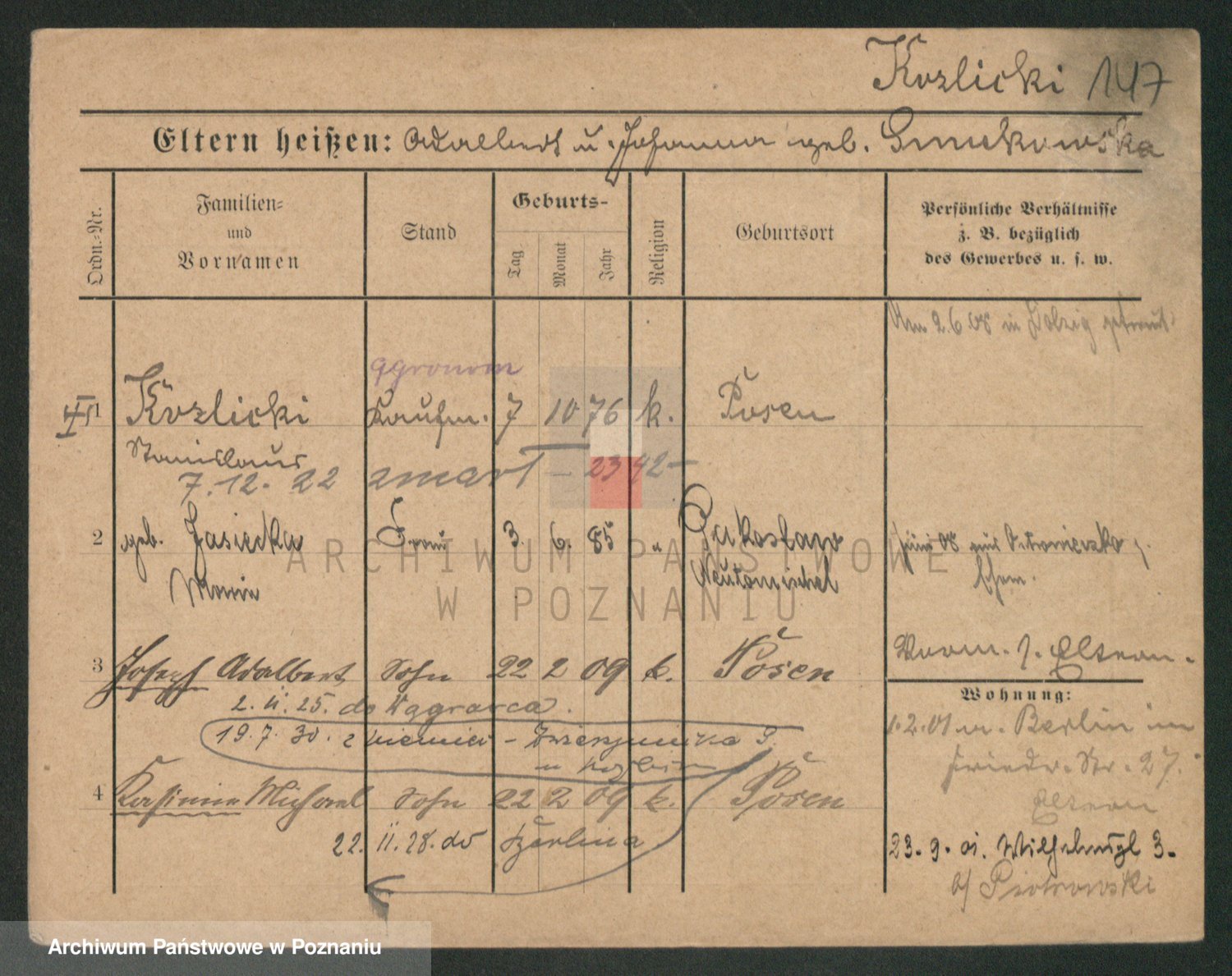 Podgląd karty osobowej dostępny jest po kliknięciu na nazwisko lub ikonkę karty. Można dokonywać powiększenia (ikony na górze) lub przechodzić między kolejnymi skanami (strzałki po bokach).