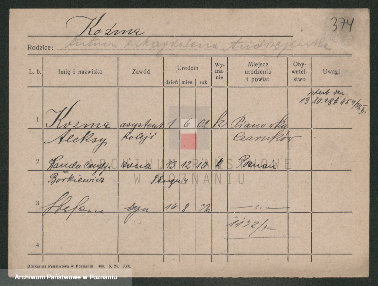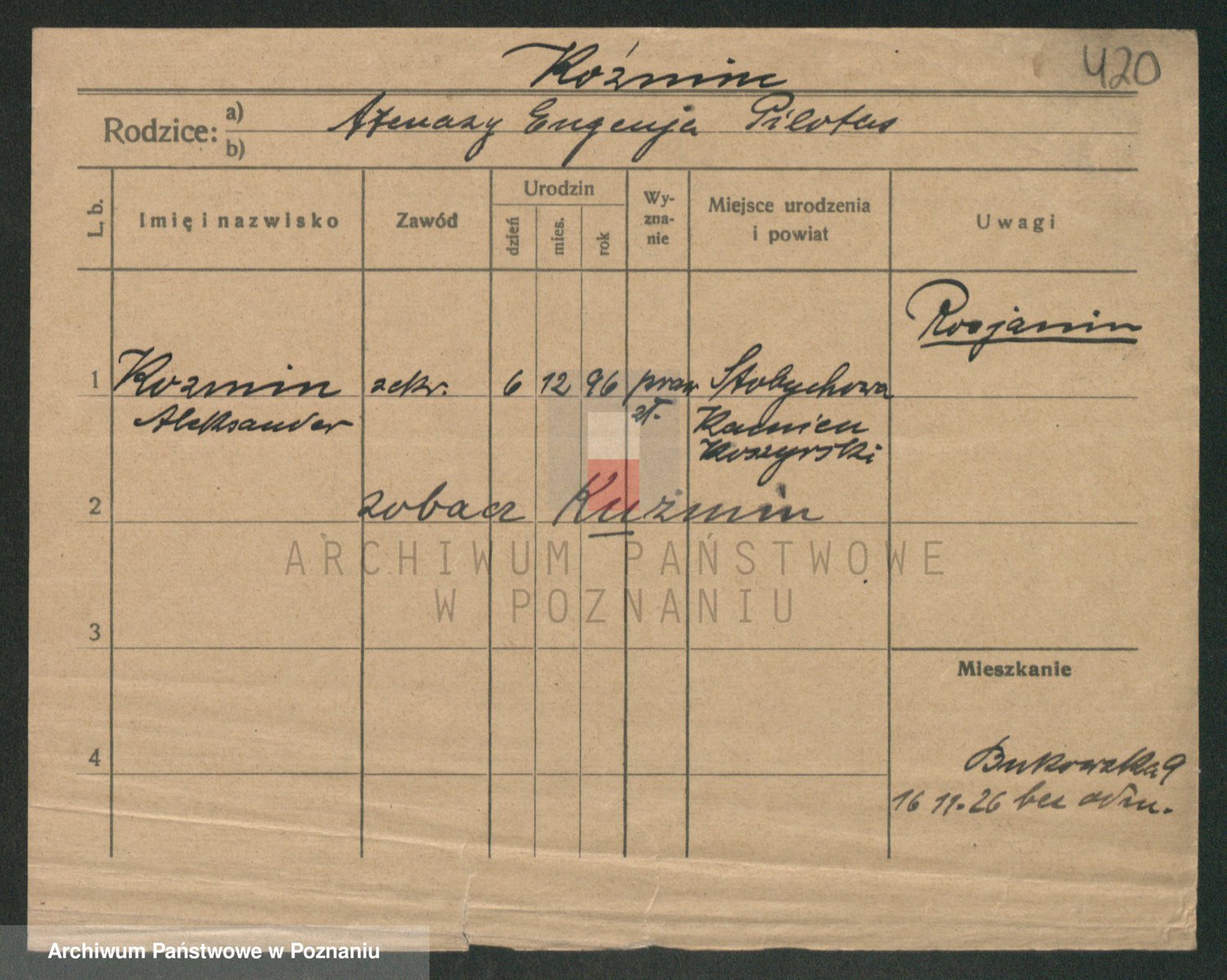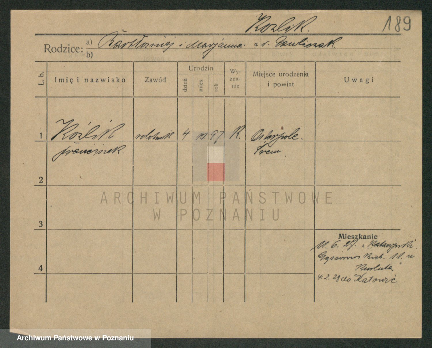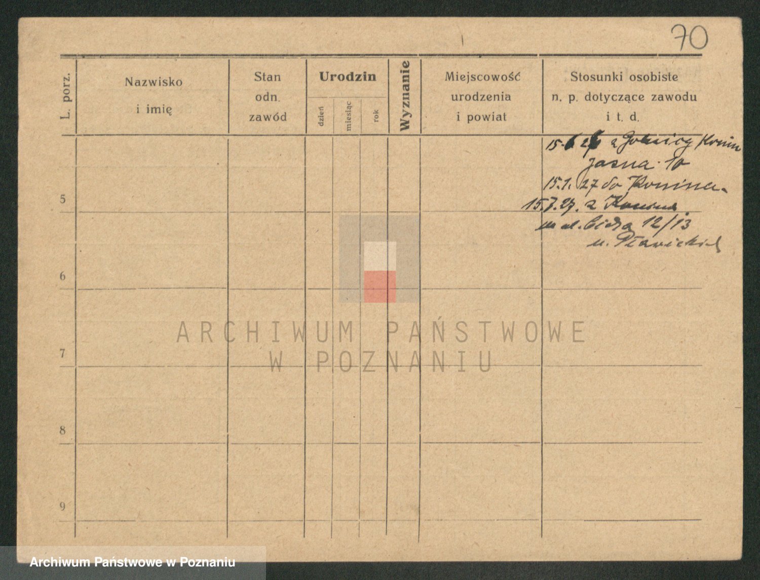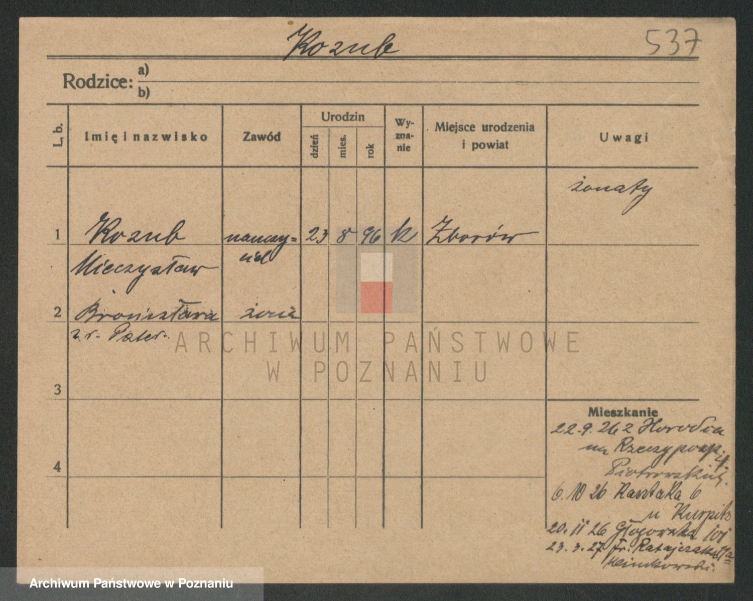 Podgląd karty osobowej dostępny jest po kliknięciu na nazwisko lub ikonkę karty. Można dokonywać powiększenia (ikony na górze) lub przechodzić między kolejnymi skanami (strzałki po bokach).