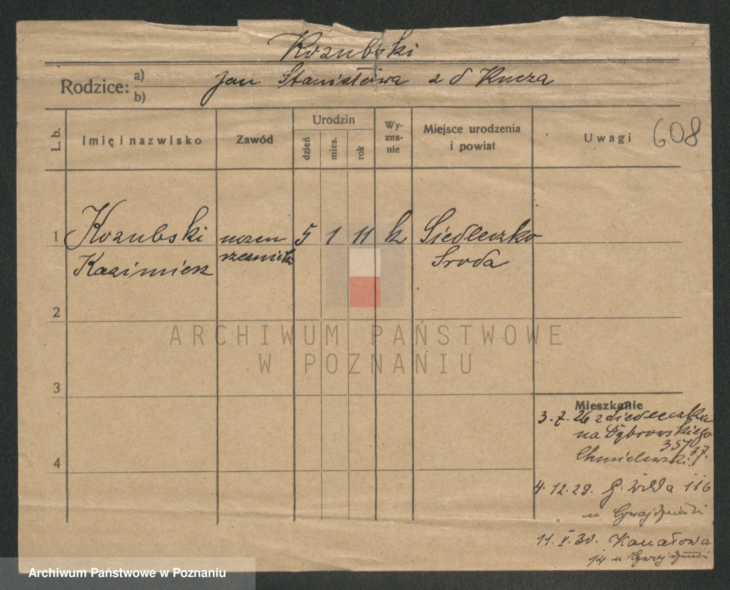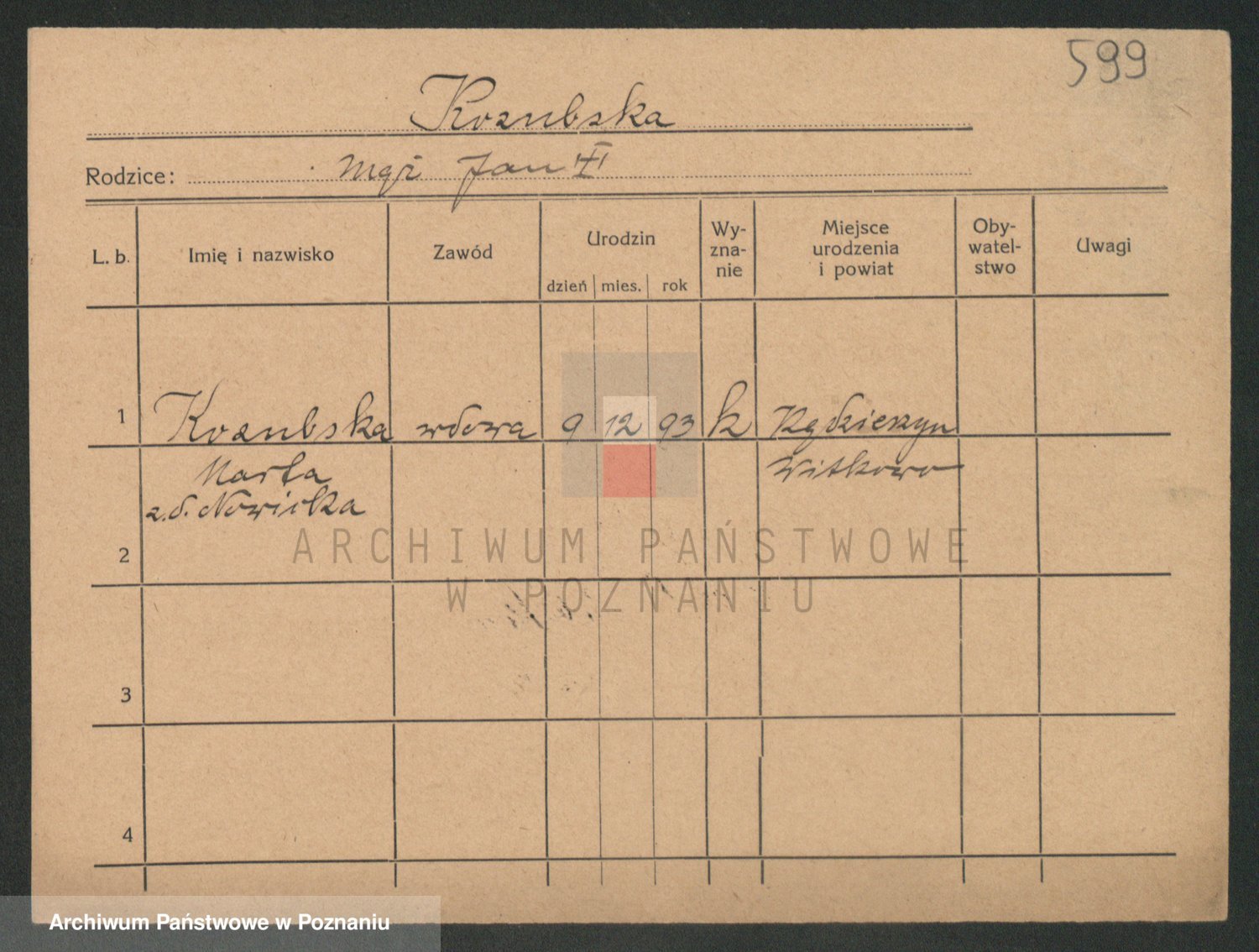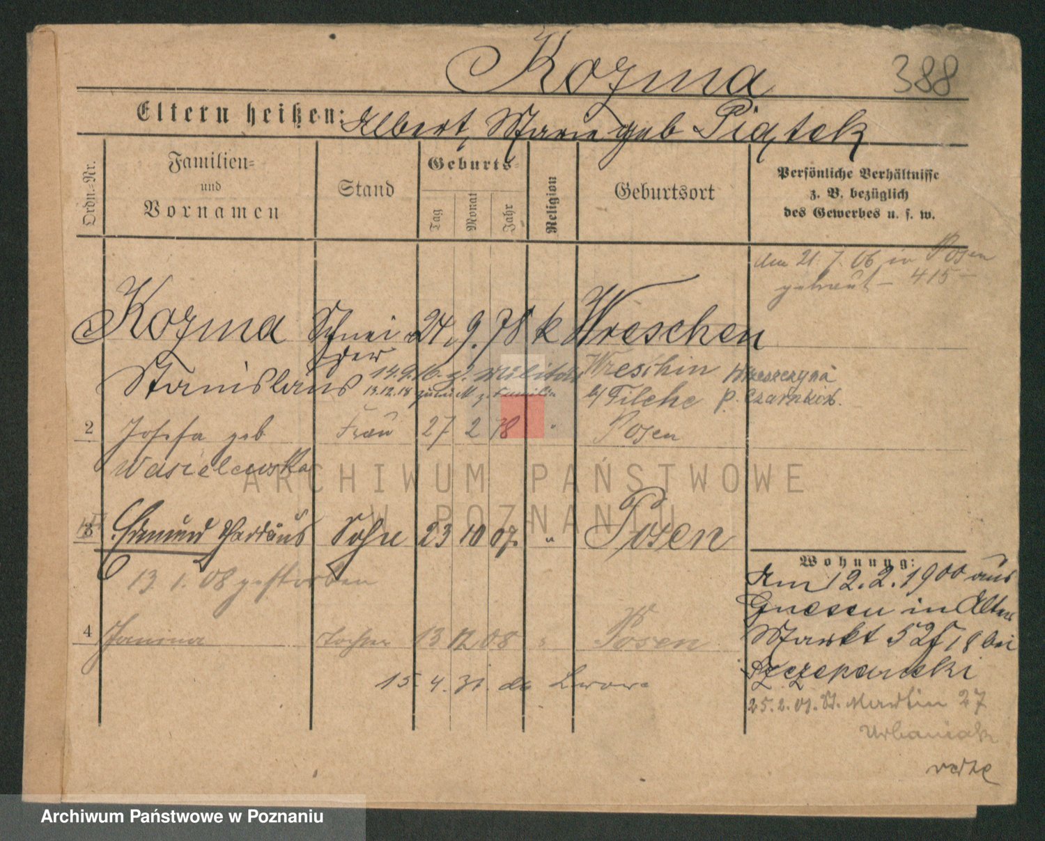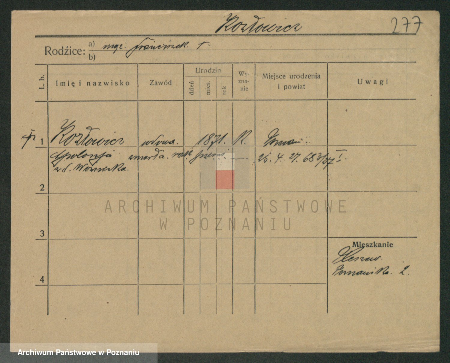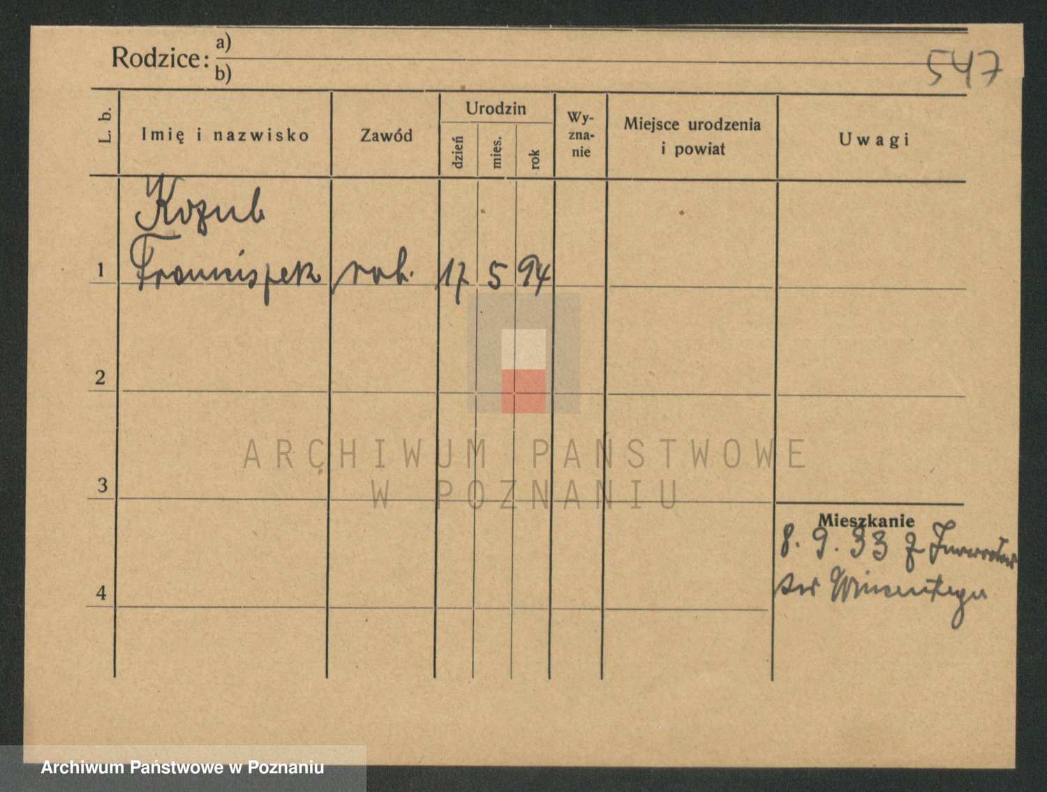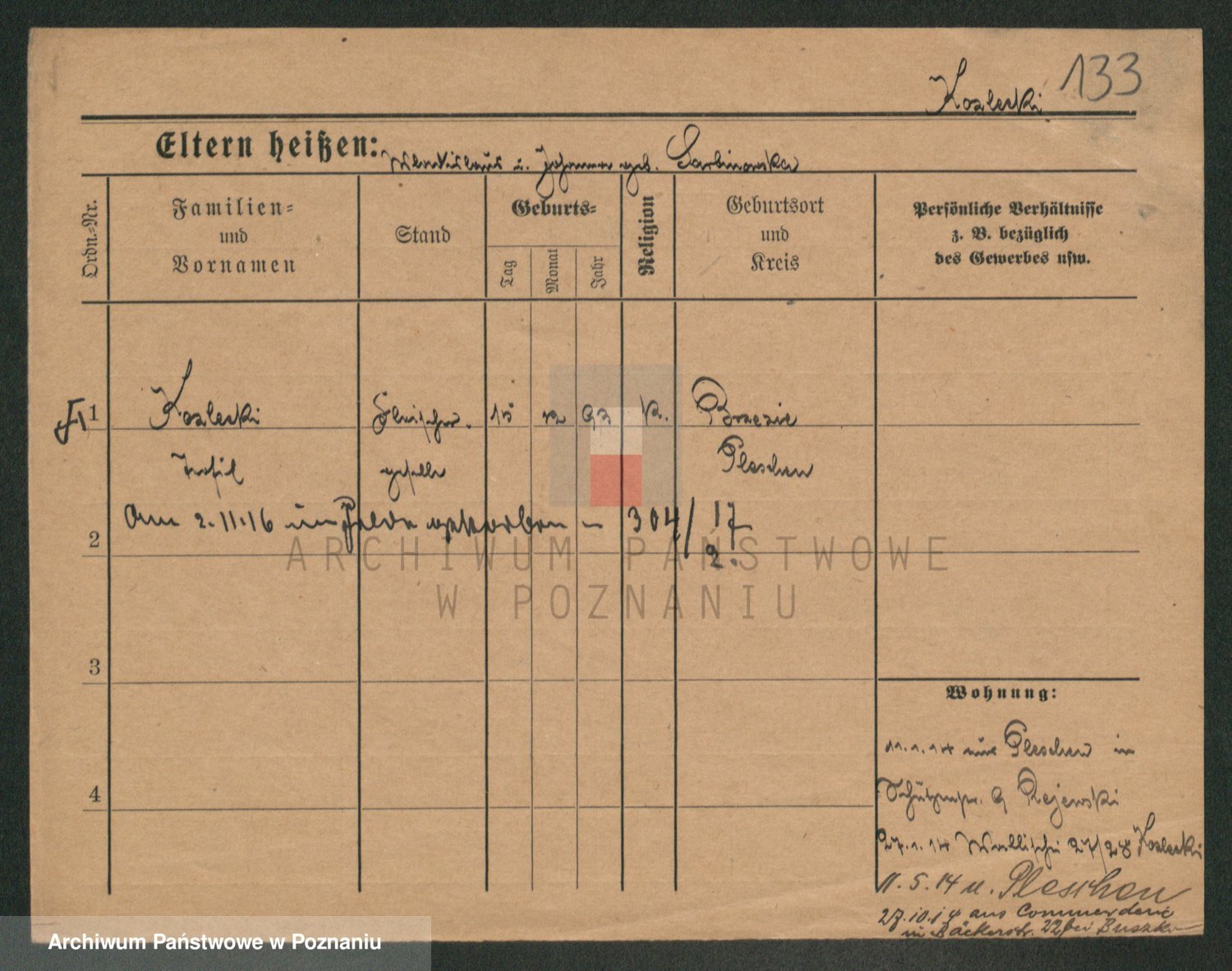 Podgląd karty osobowej dostępny jest po kliknięciu na nazwisko lub ikonkę karty. Można dokonywać powiększenia (ikony na górze) lub przechodzić między kolejnymi skanami (strzałki po bokach).