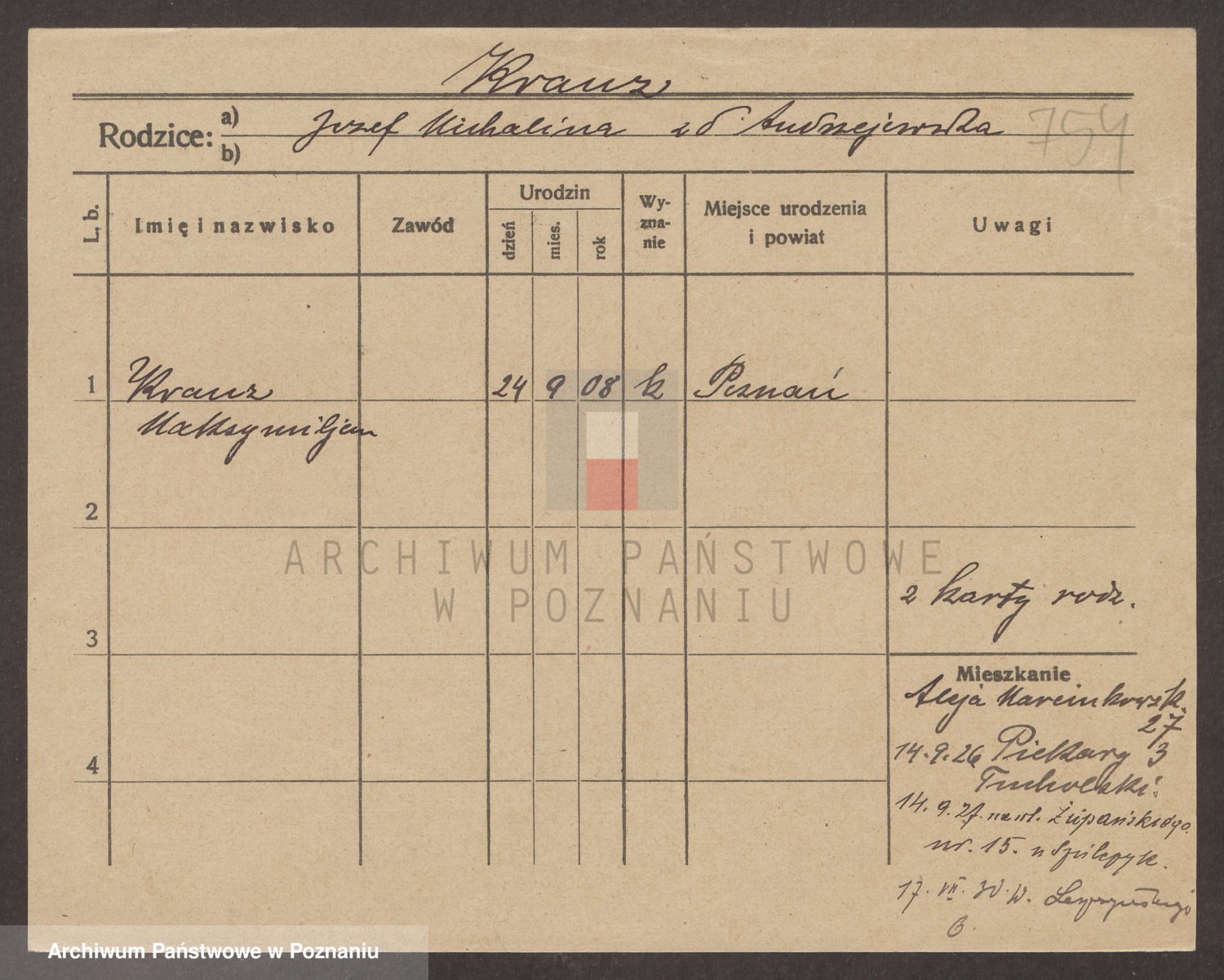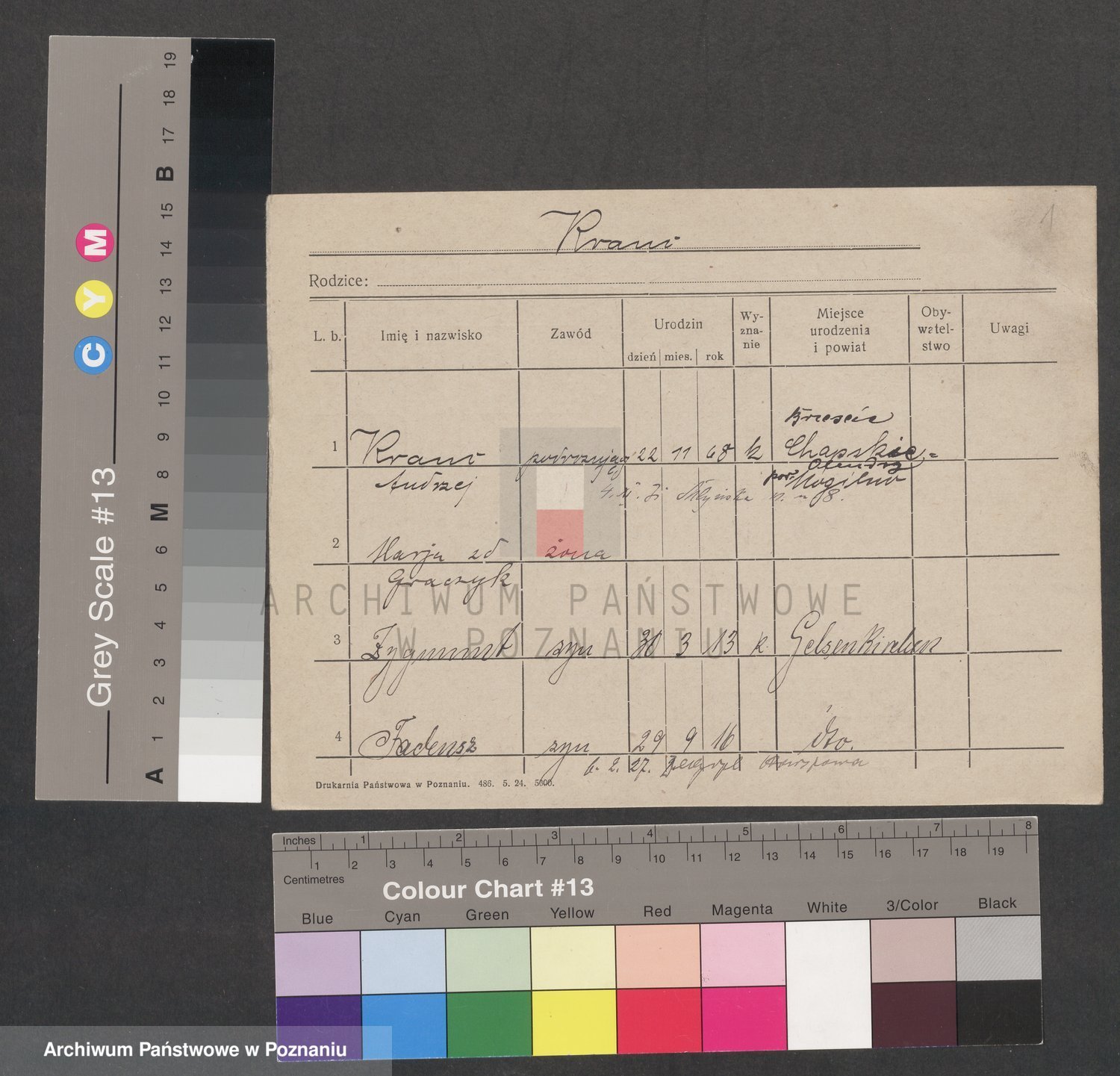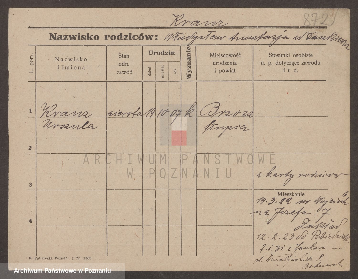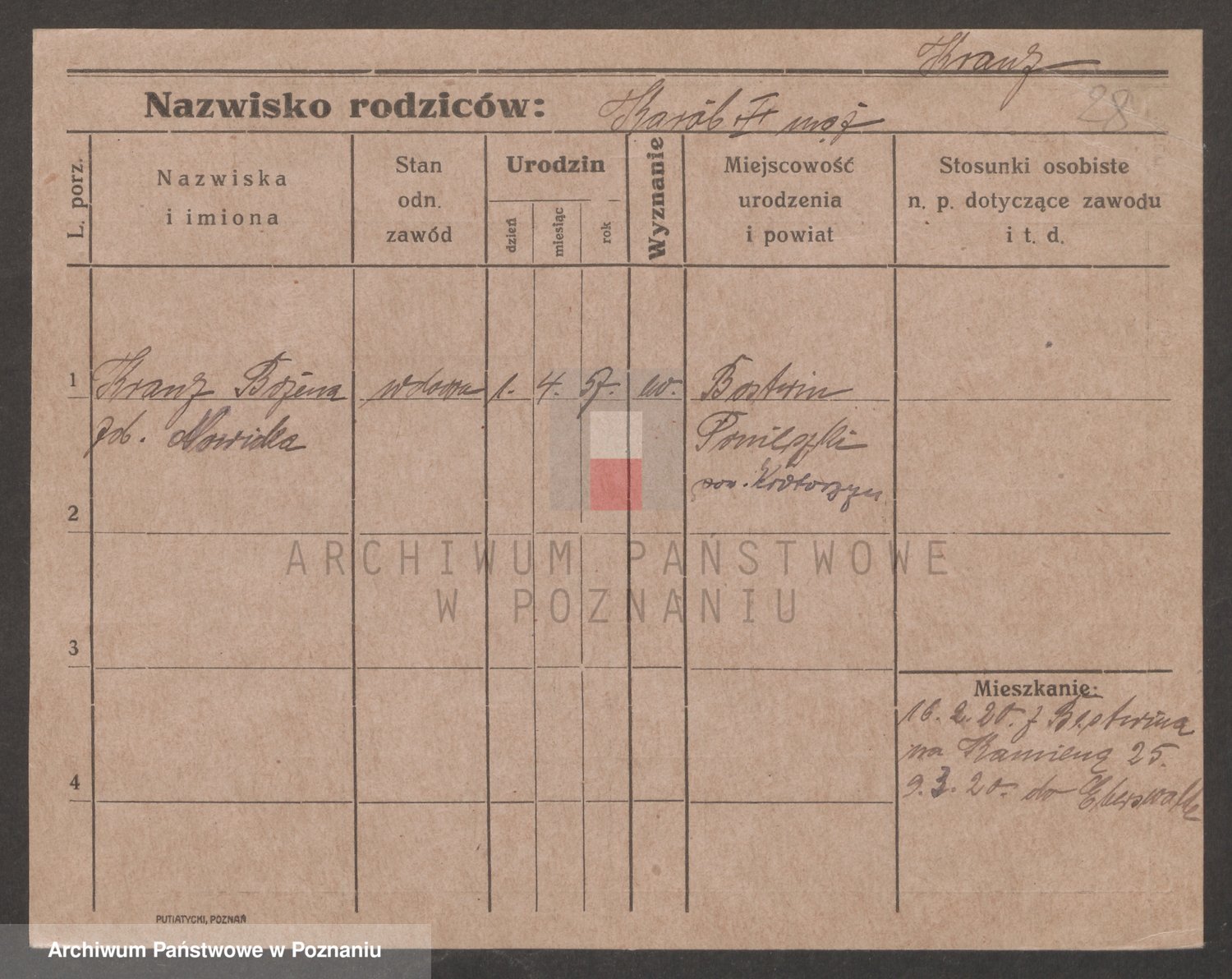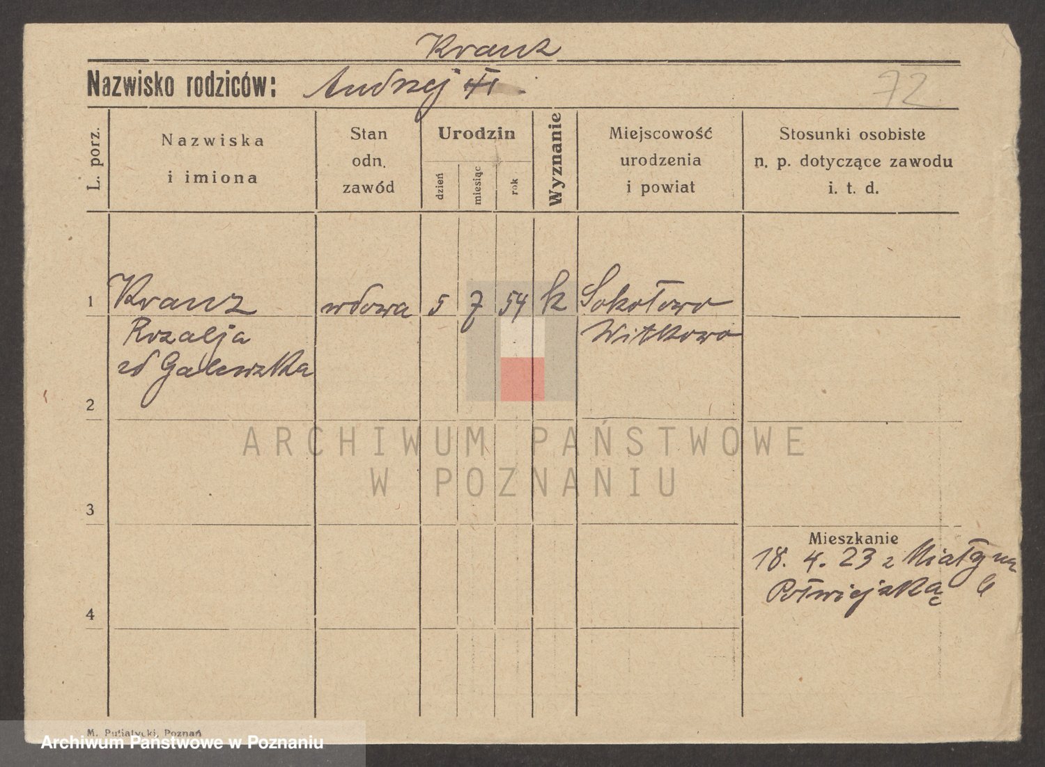 Podgląd karty osobowej dostępny jest po kliknięciu na nazwisko lub ikonkę karty. Można dokonywać powiększenia (ikony na górze) lub przechodzić między kolejnymi skanami (strzałki po bokach).