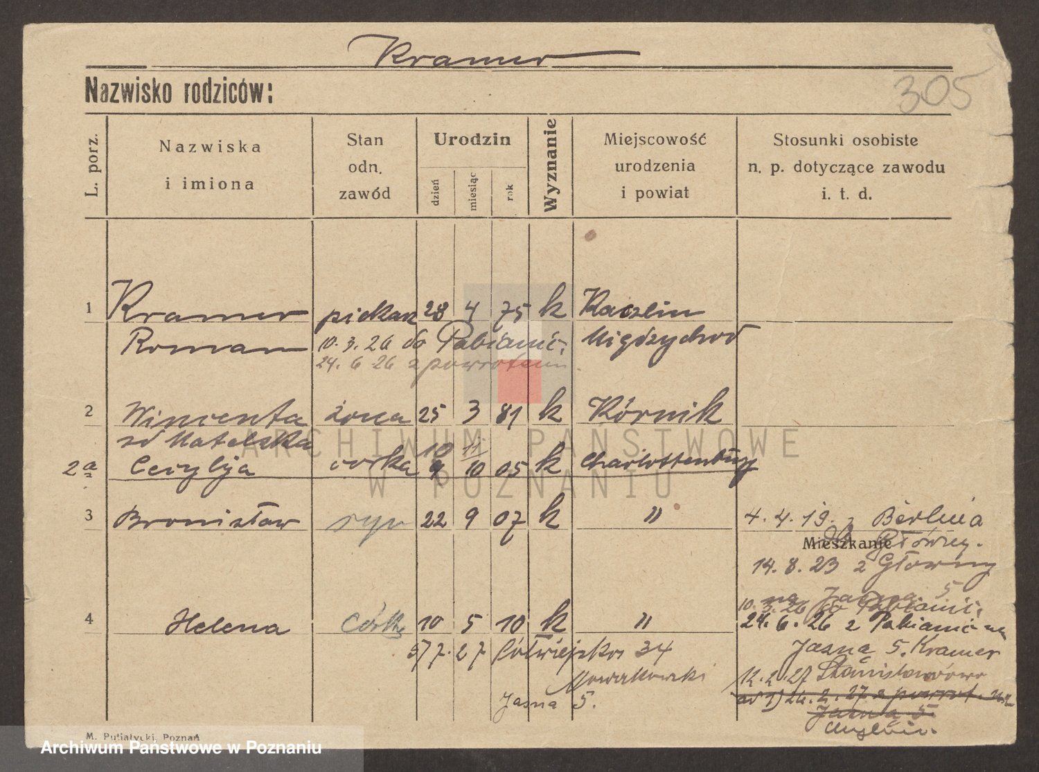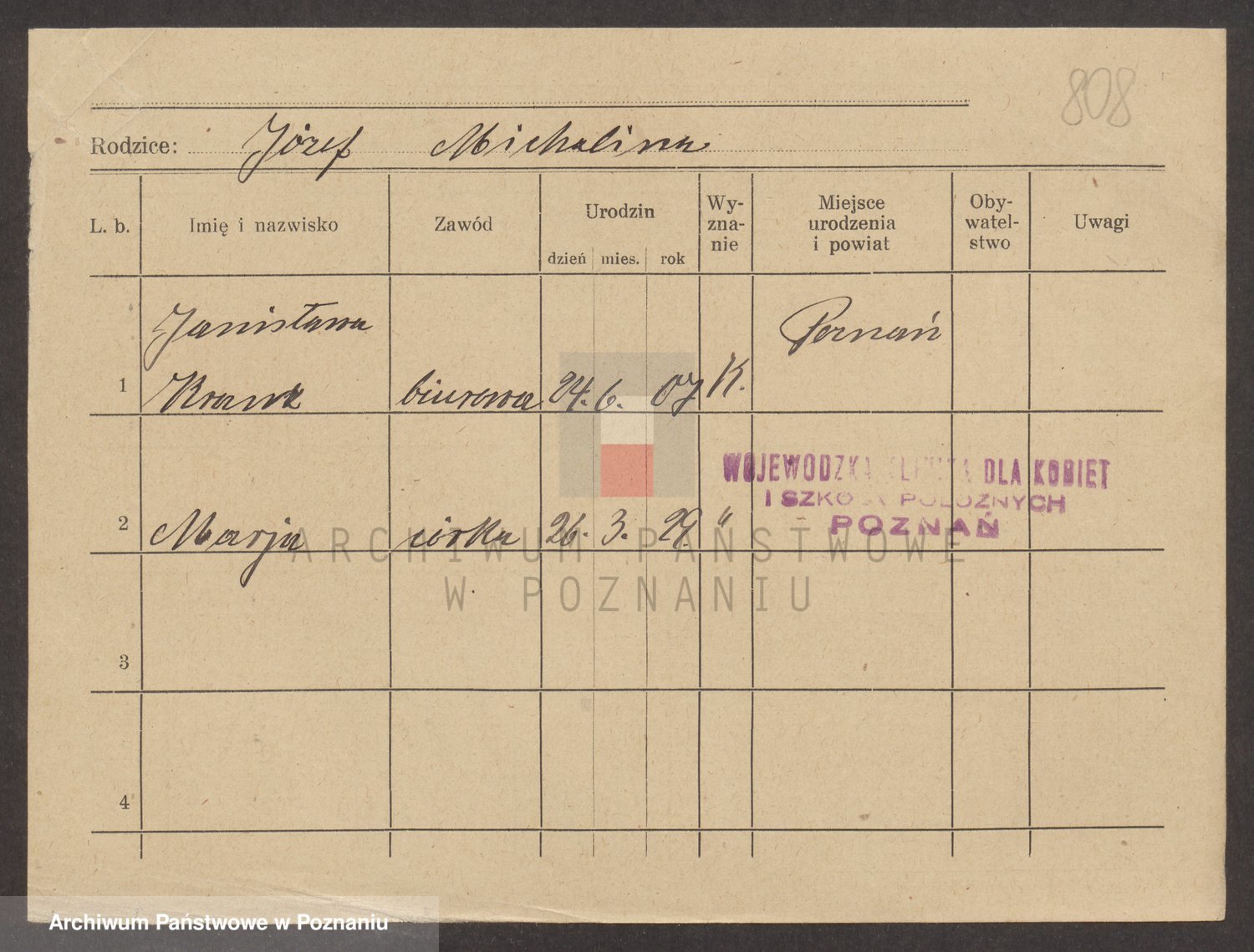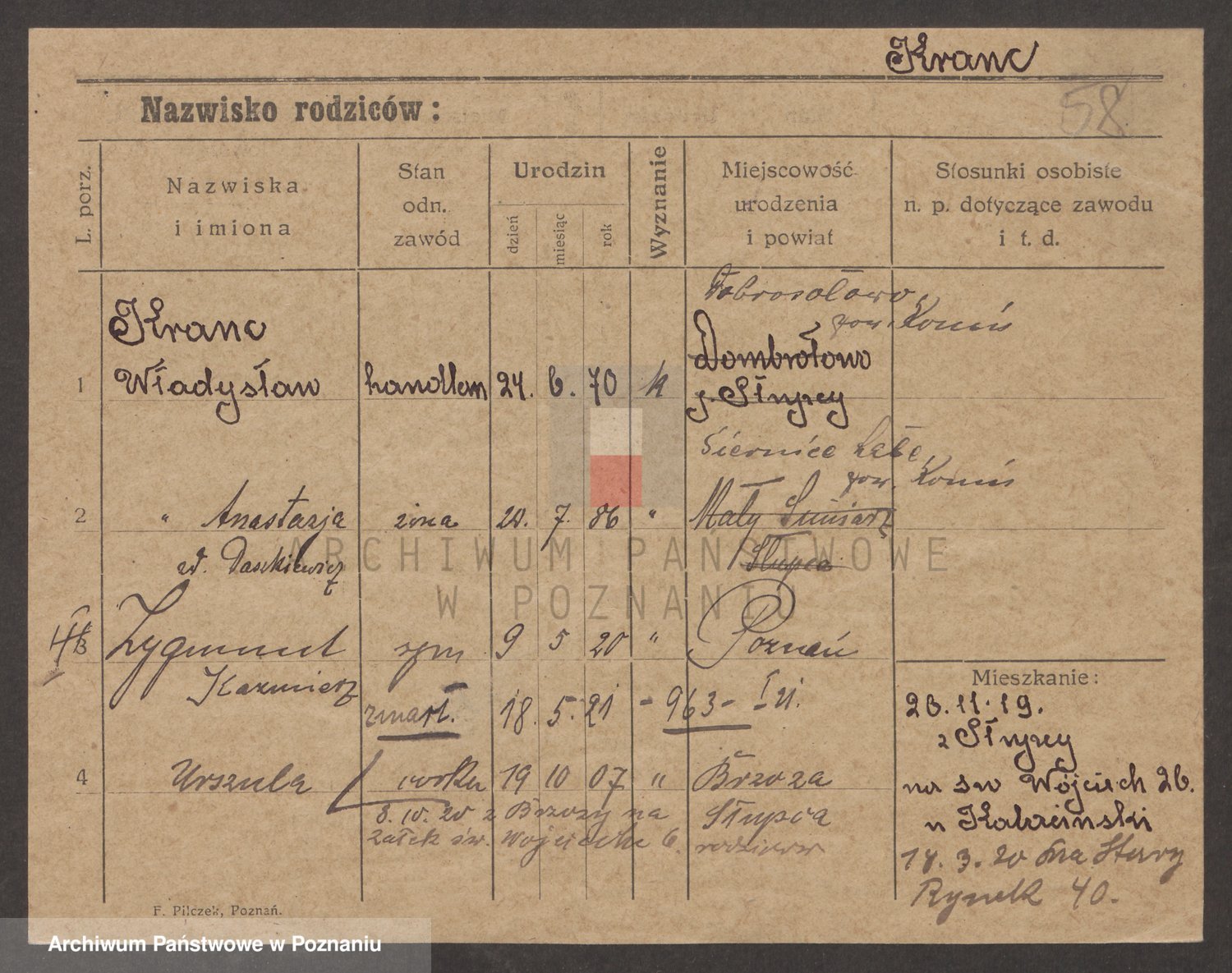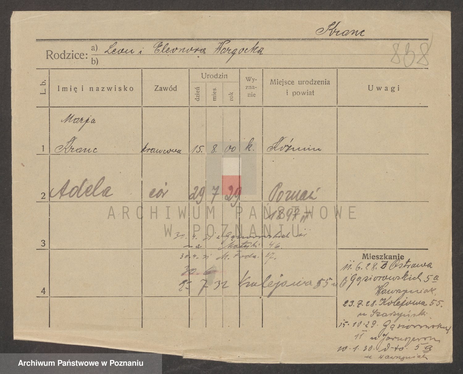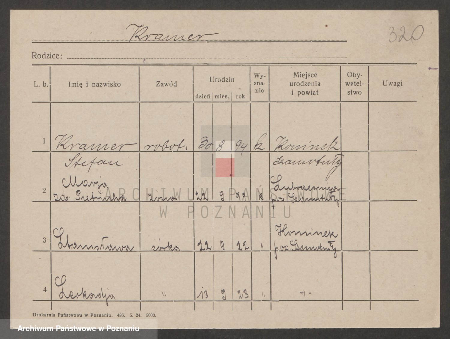 Podgląd karty osobowej dostępny jest po kliknięciu na nazwisko lub ikonkę karty. Można dokonywać powiększenia (ikony na górze) lub przechodzić między kolejnymi skanami (strzałki po bokach).