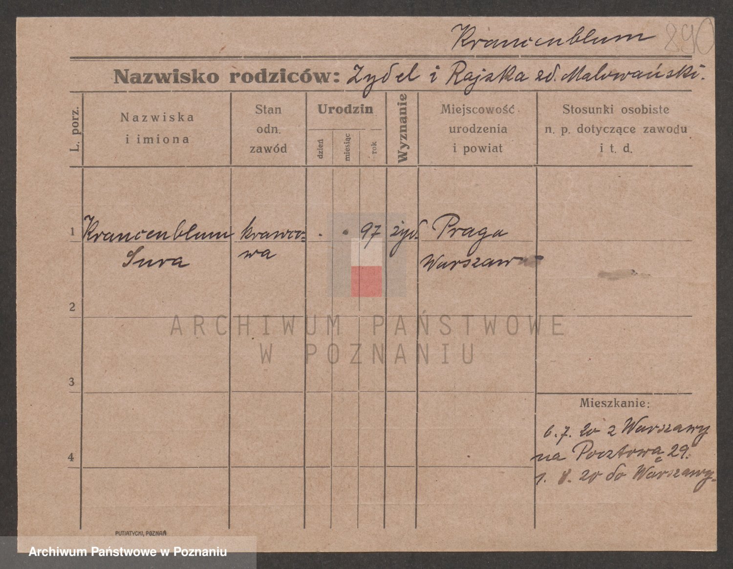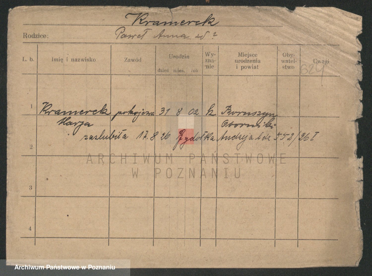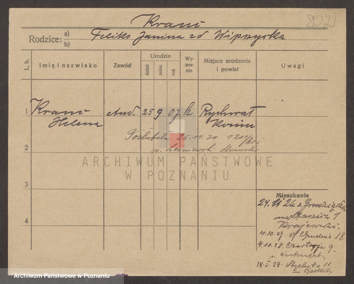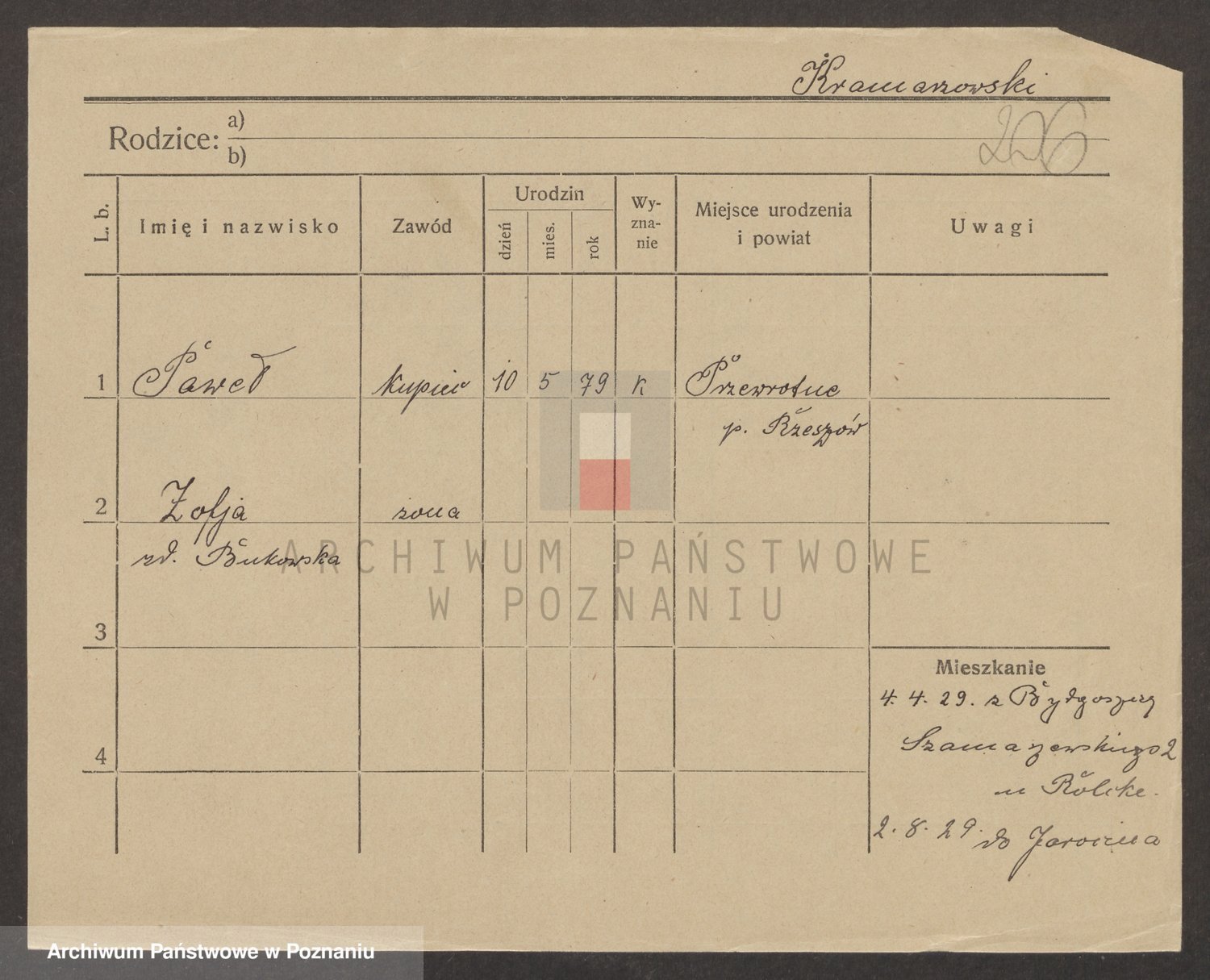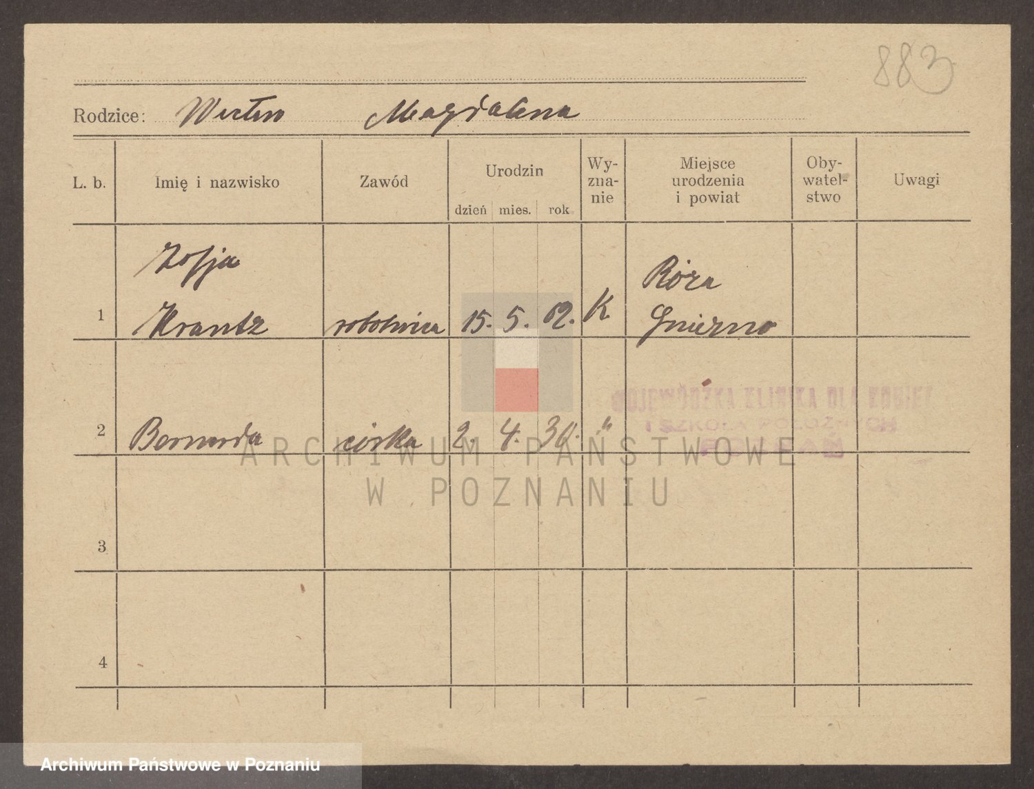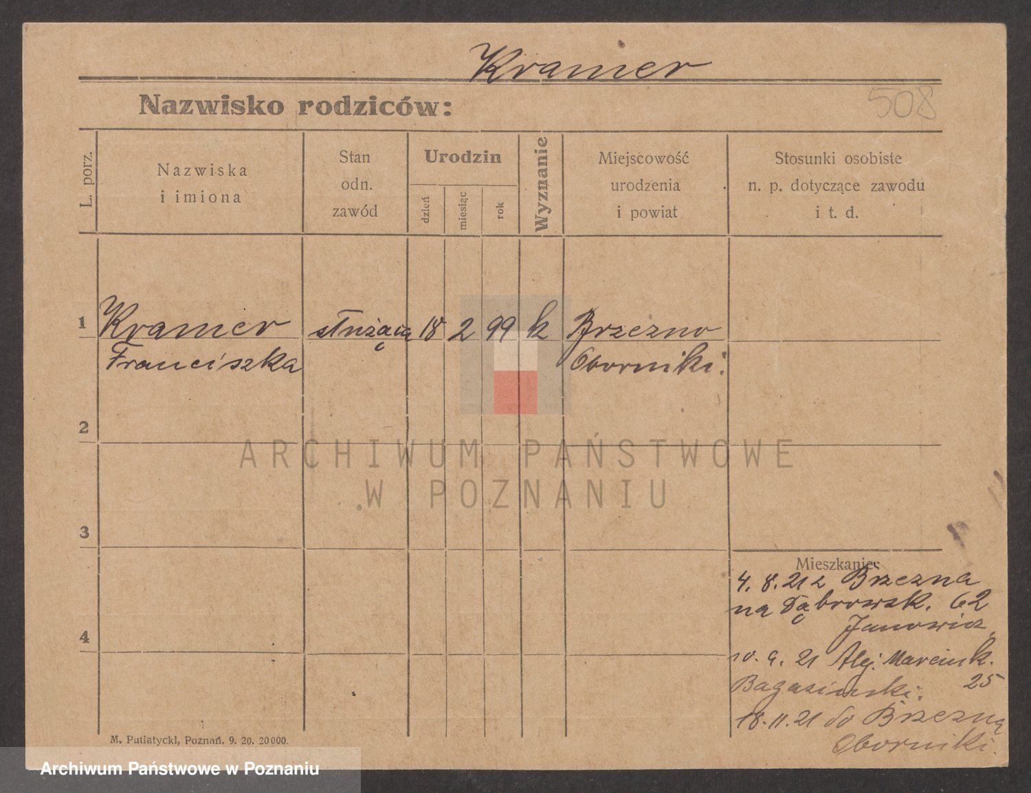 Podgląd karty osobowej dostępny jest po kliknięciu na nazwisko lub ikonkę karty. Można dokonywać powiększenia (ikony na górze) lub przechodzić między kolejnymi skanami (strzałki po bokach).