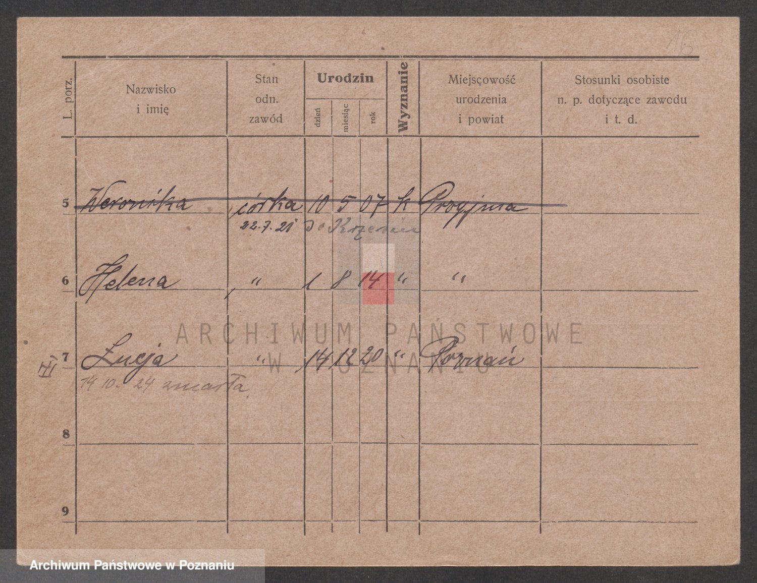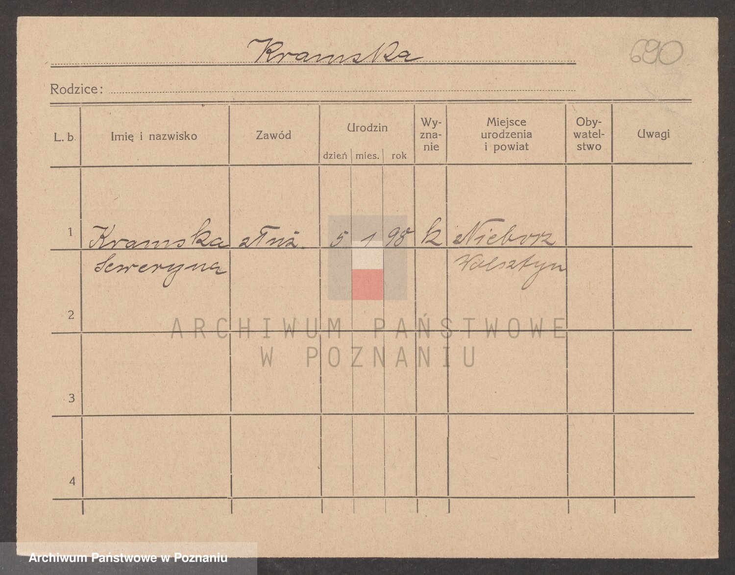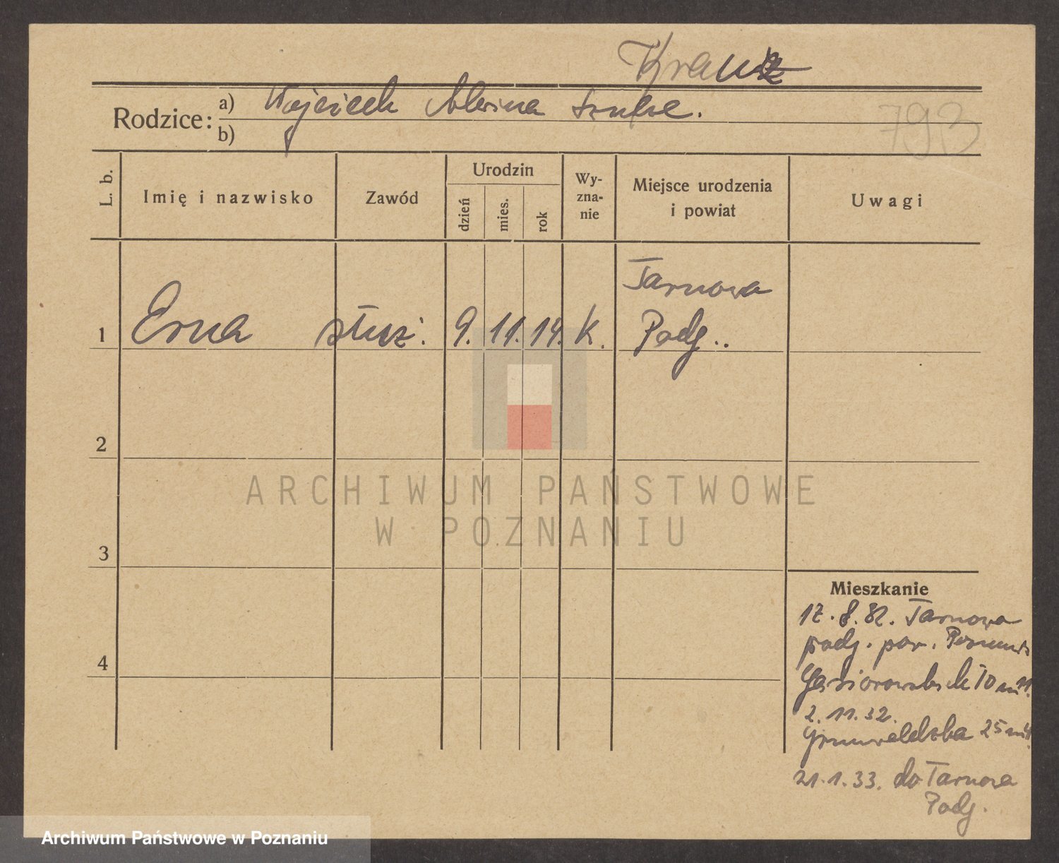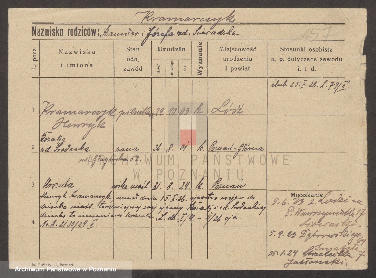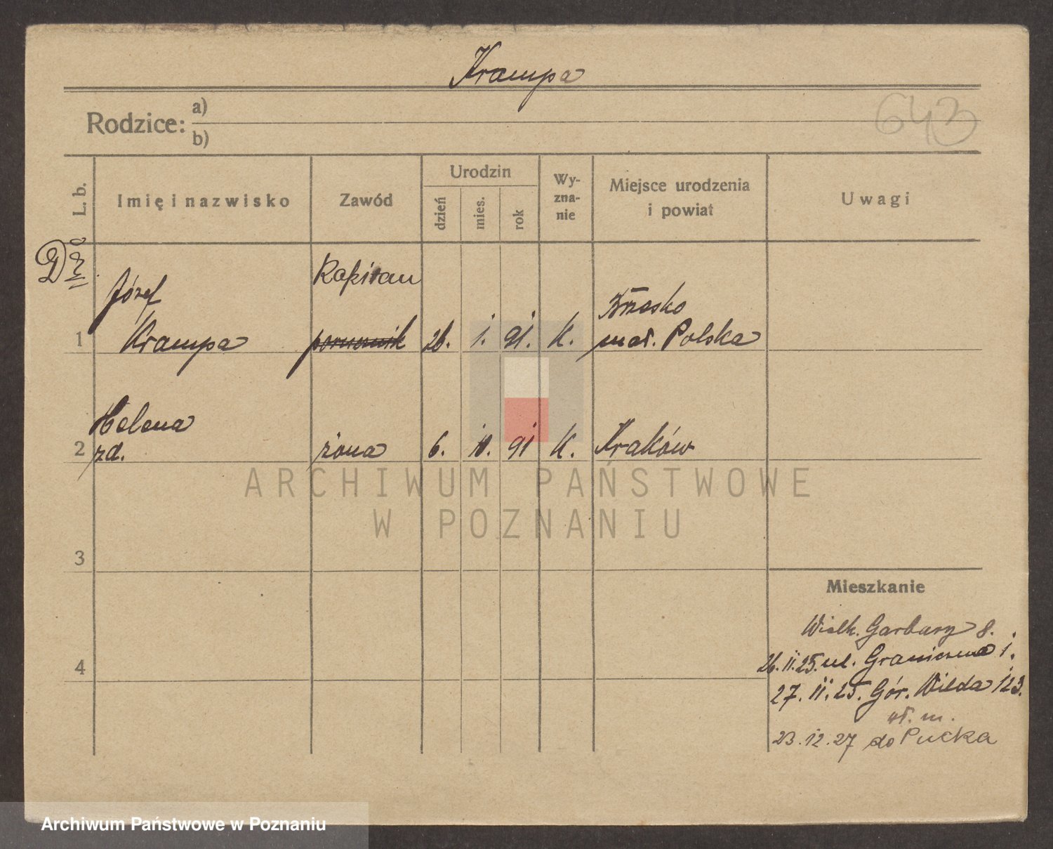 Podgląd karty osobowej dostępny jest po kliknięciu na nazwisko lub ikonkę karty. Można dokonywać powiększenia (ikony na górze) lub przechodzić między kolejnymi skanami (strzałki po bokach).