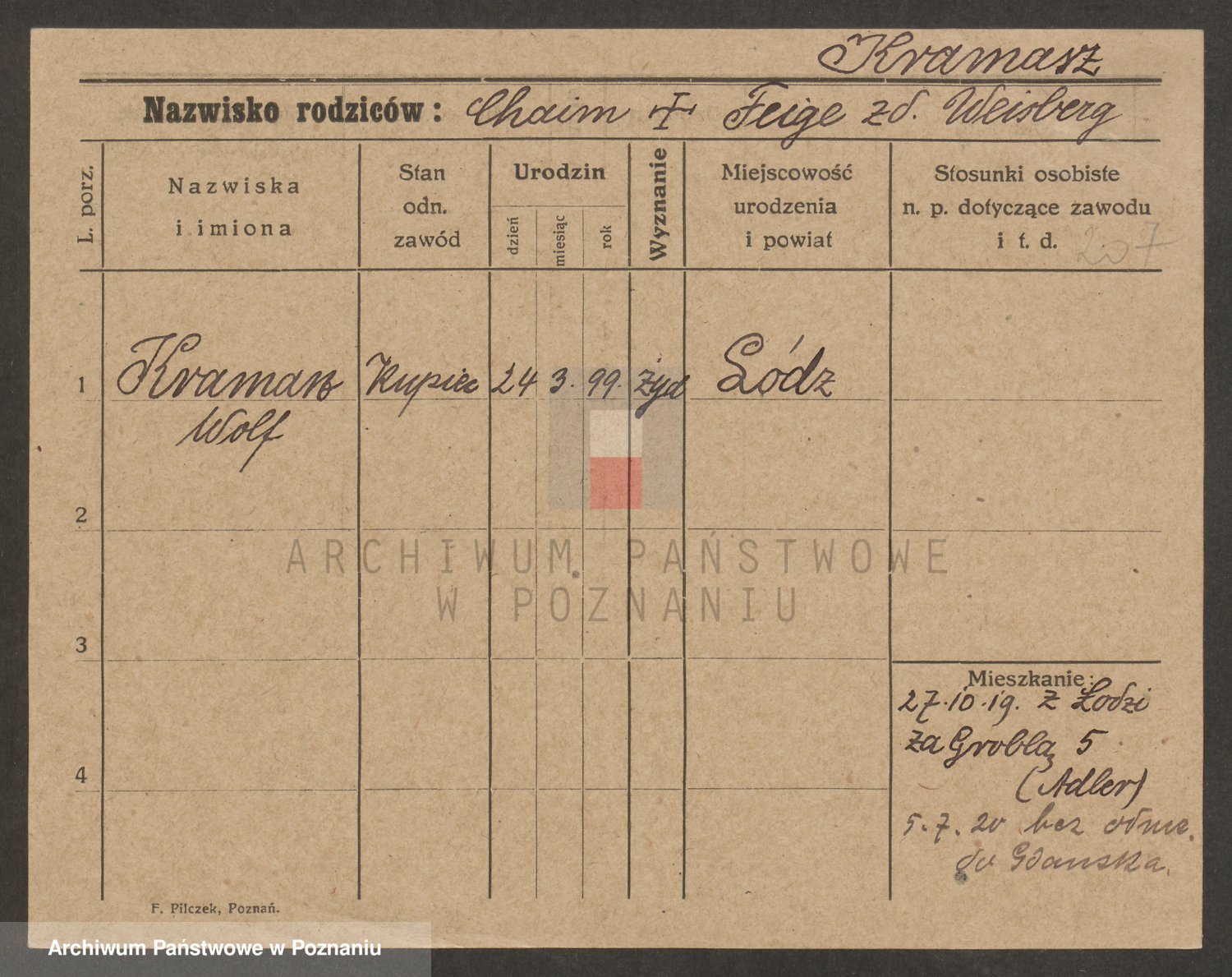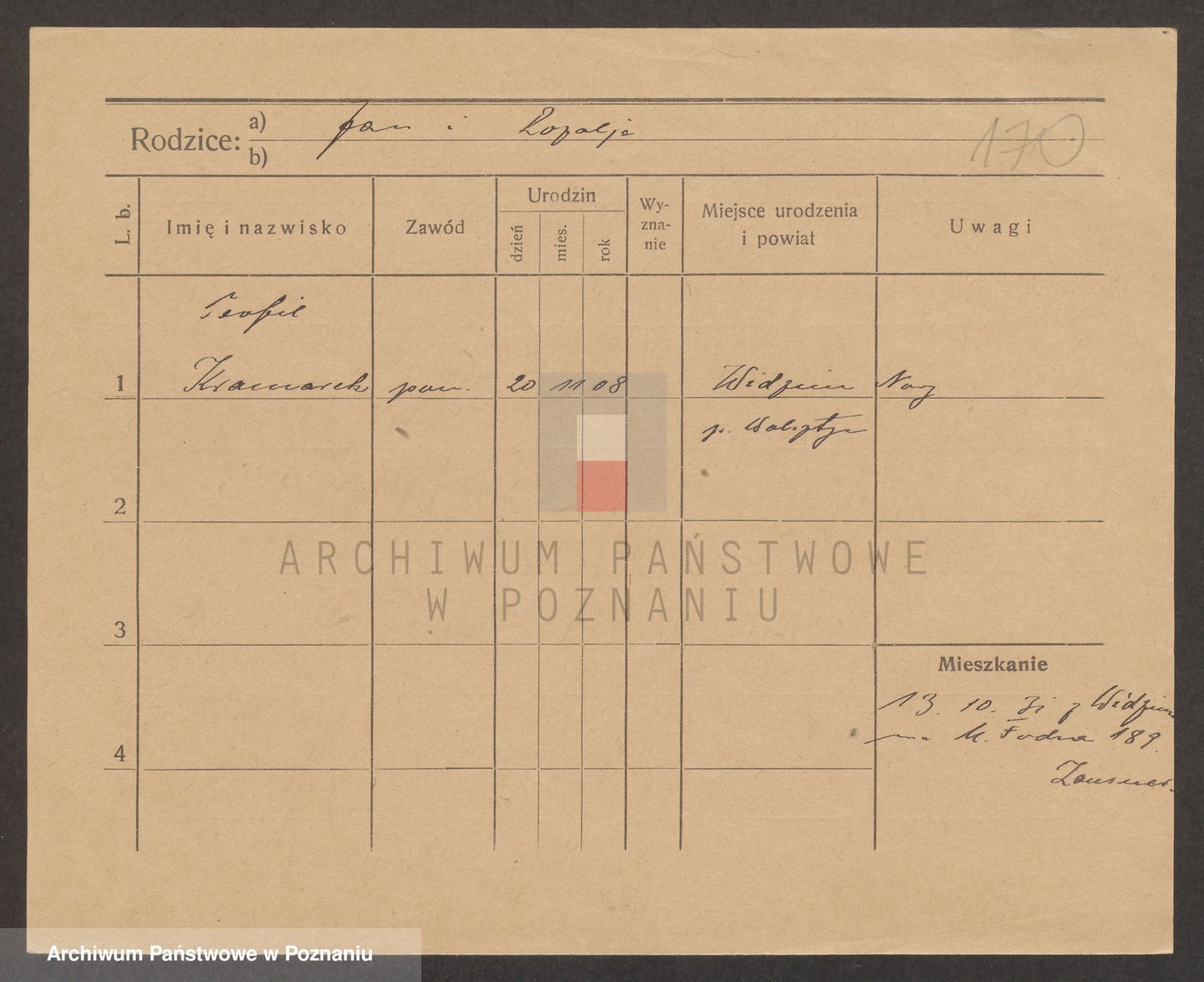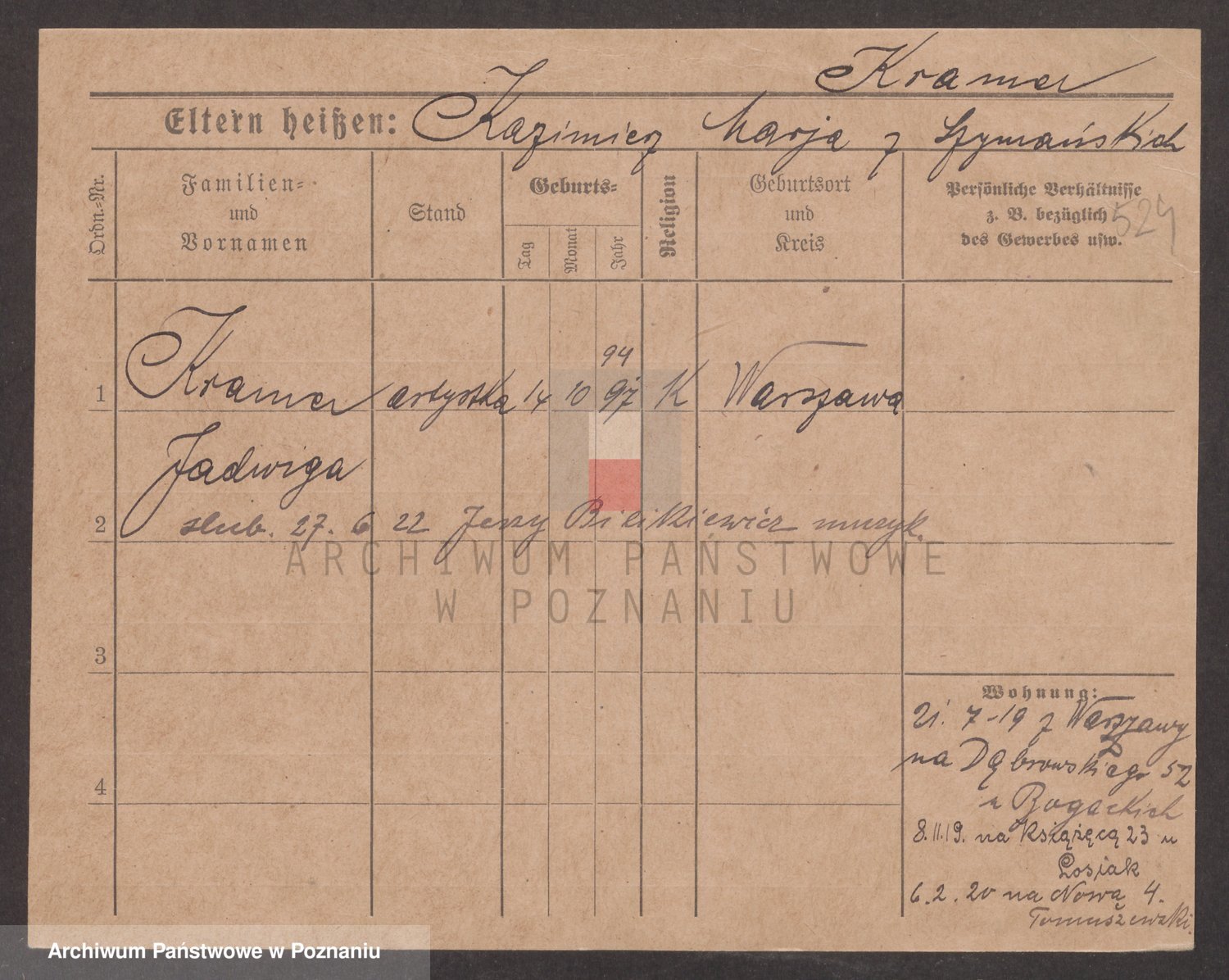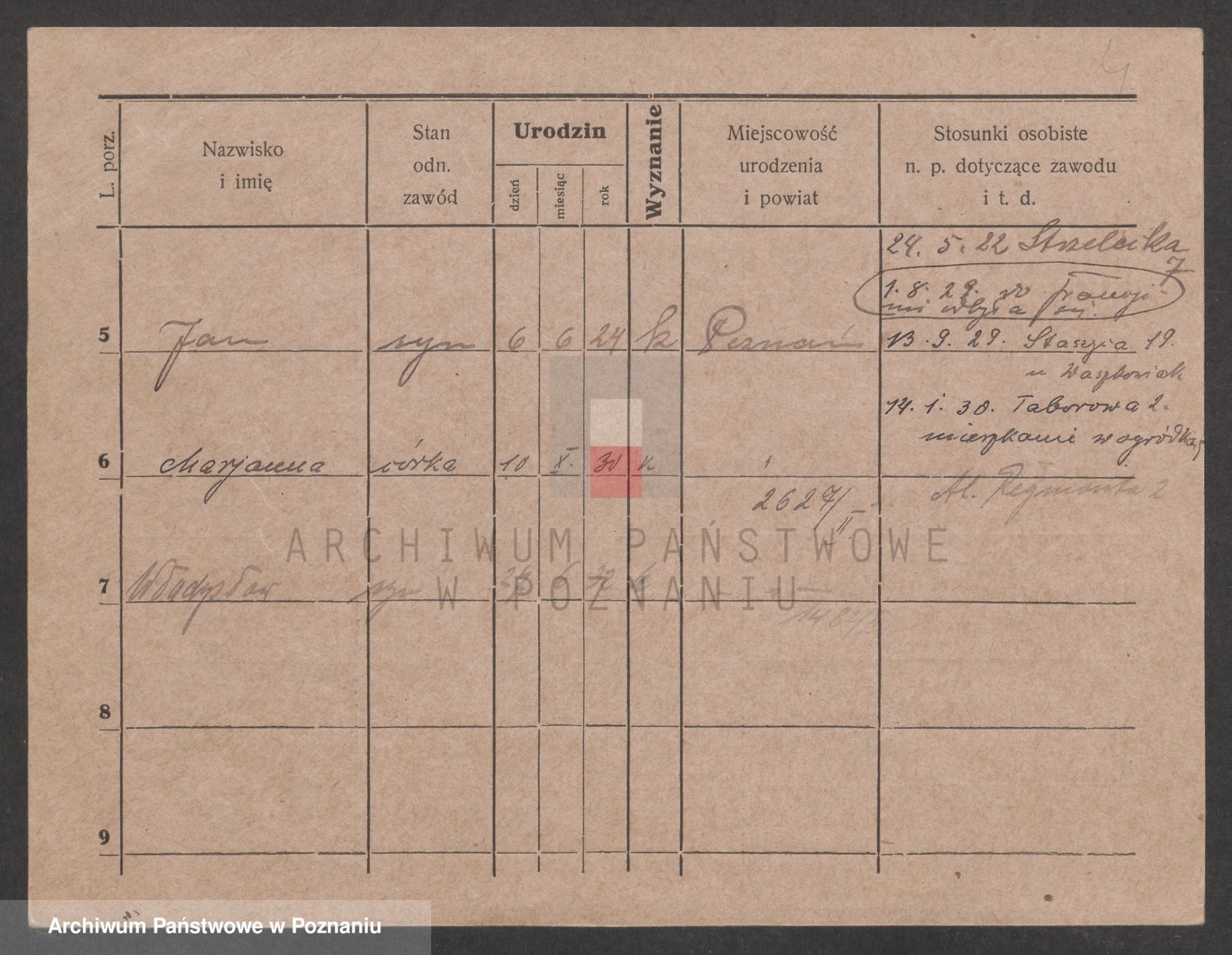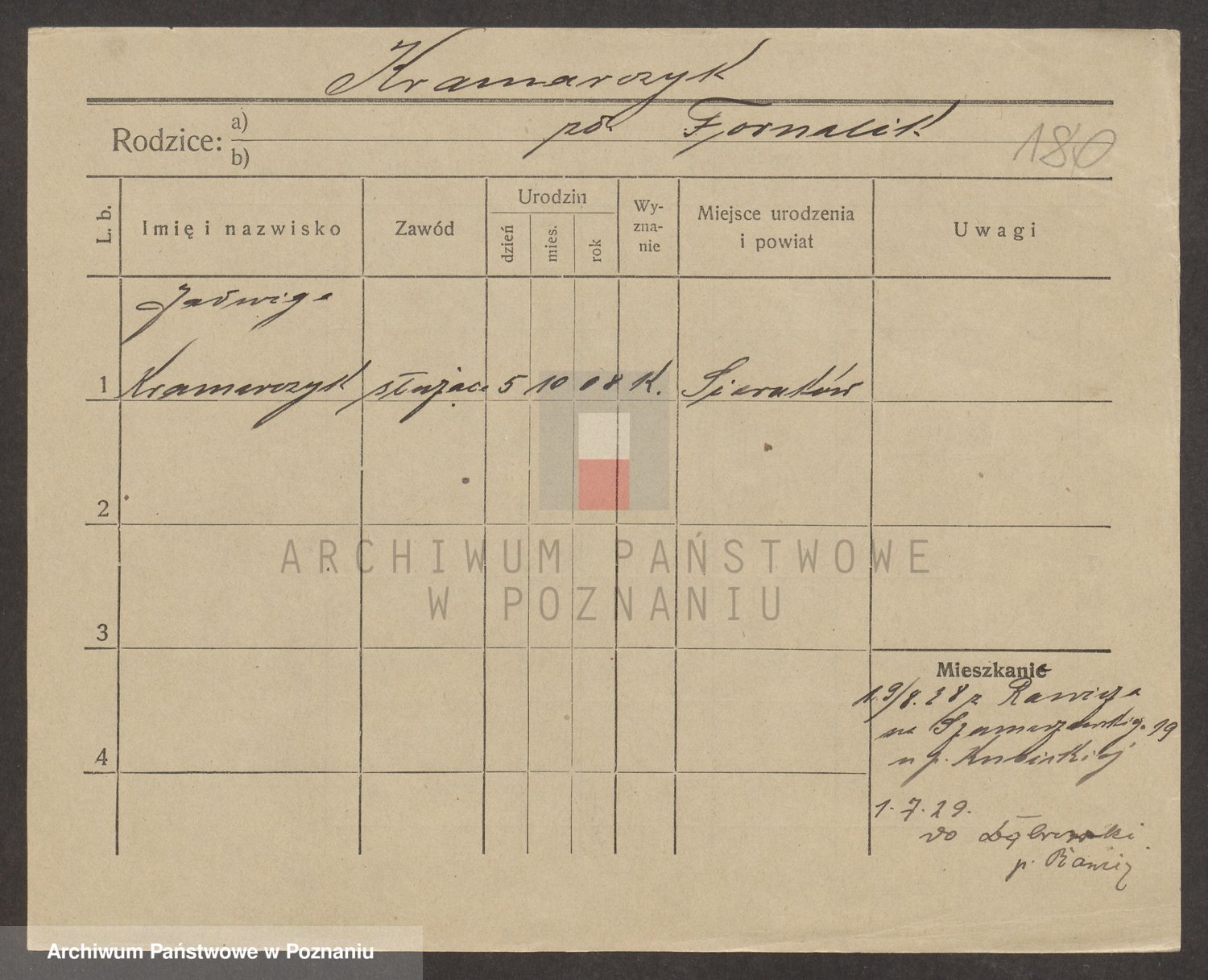 Podgląd karty osobowej dostępny jest po kliknięciu na nazwisko lub ikonkę karty. Można dokonywać powiększenia (ikony na górze) lub przechodzić między kolejnymi skanami (strzałki po bokach).