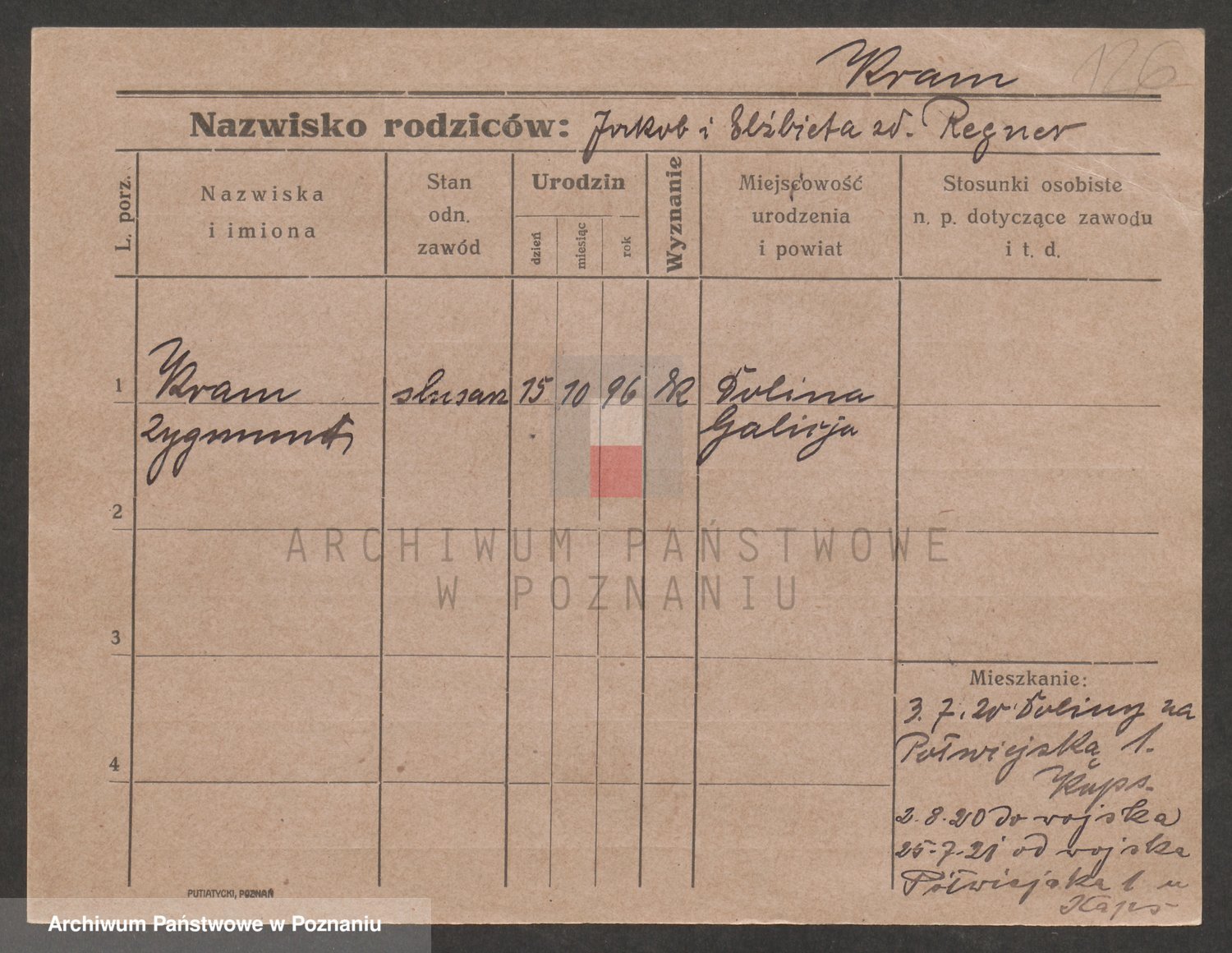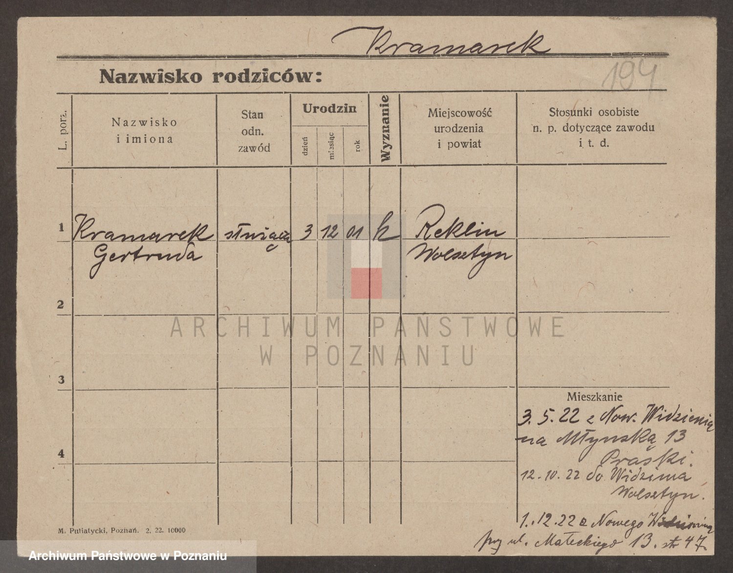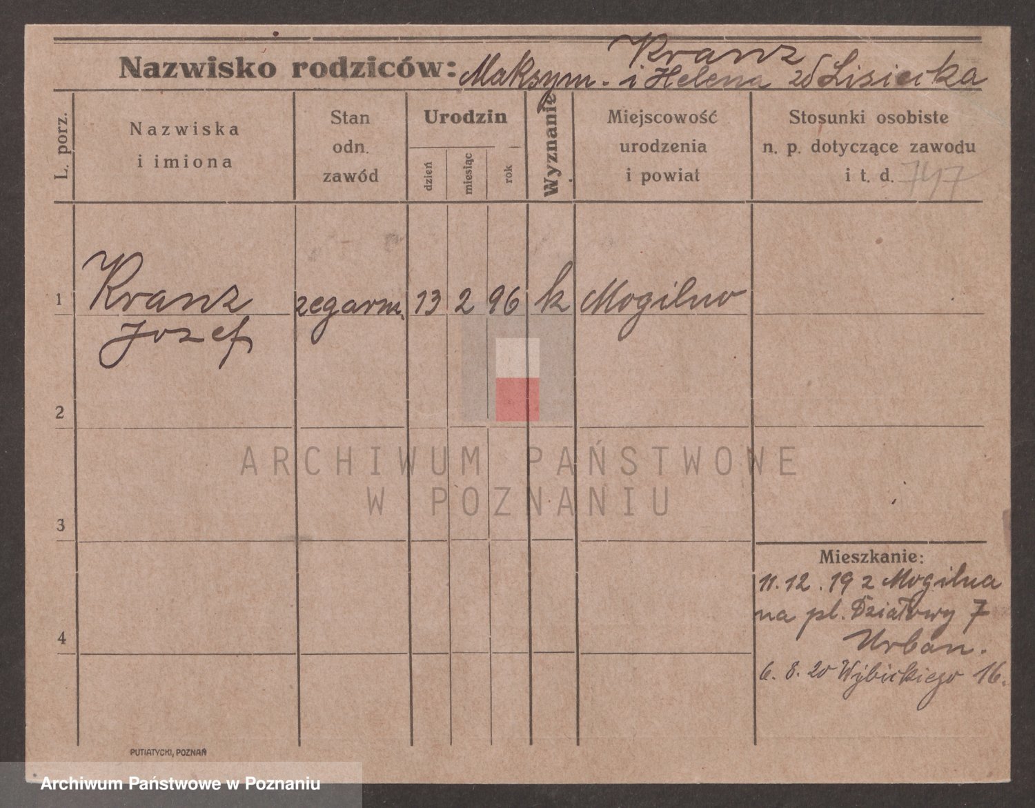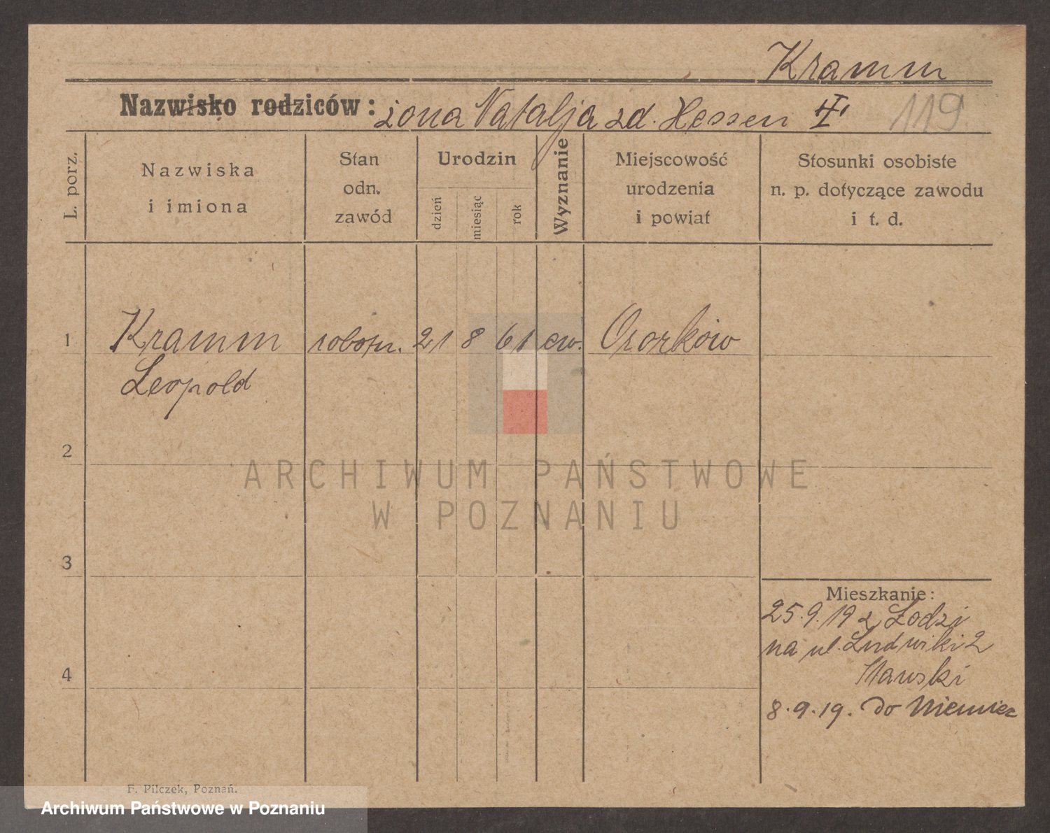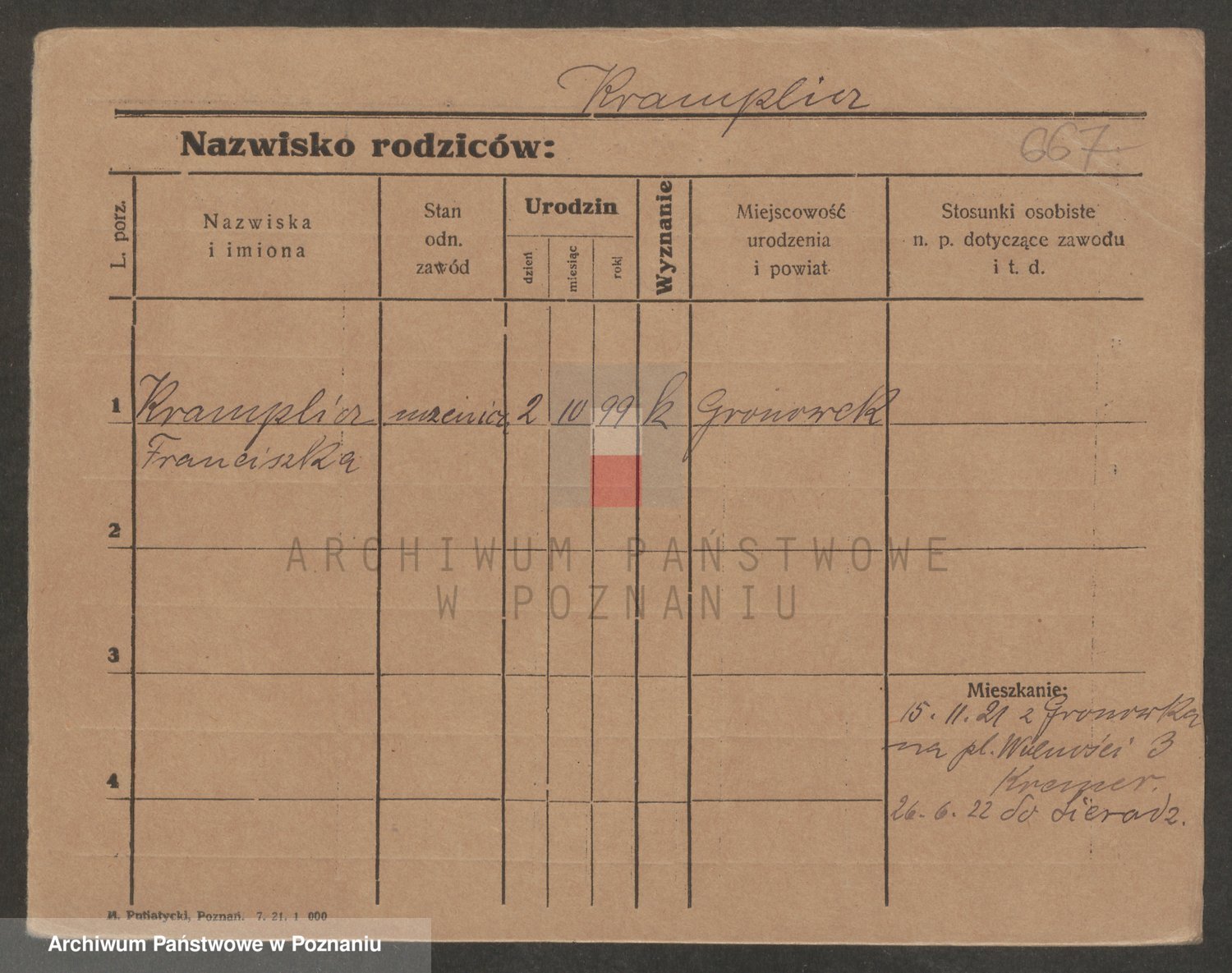 Podgląd karty osobowej dostępny jest po kliknięciu na nazwisko lub ikonkę karty. Można dokonywać powiększenia (ikony na górze) lub przechodzić między kolejnymi skanami (strzałki po bokach).