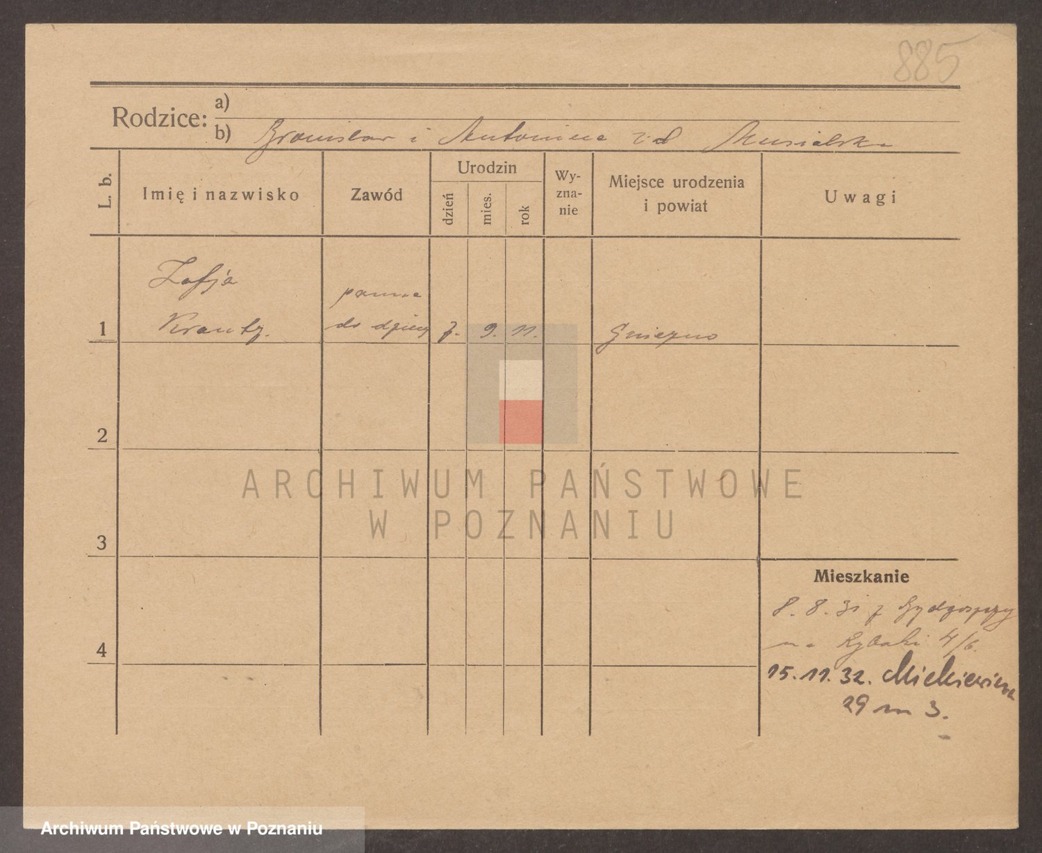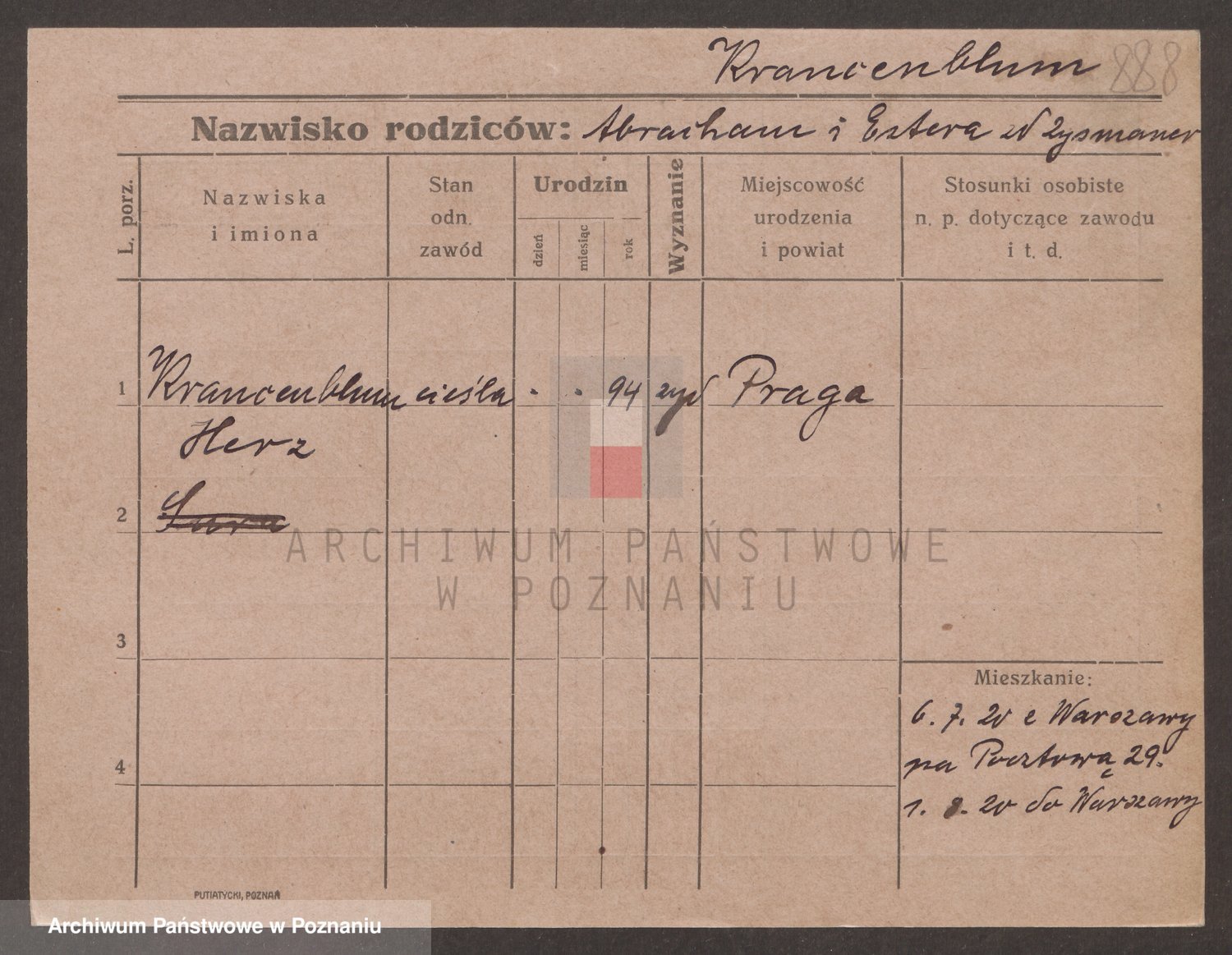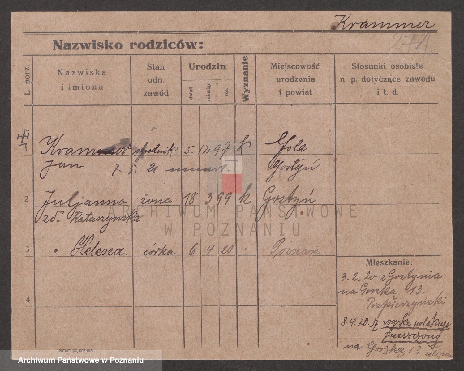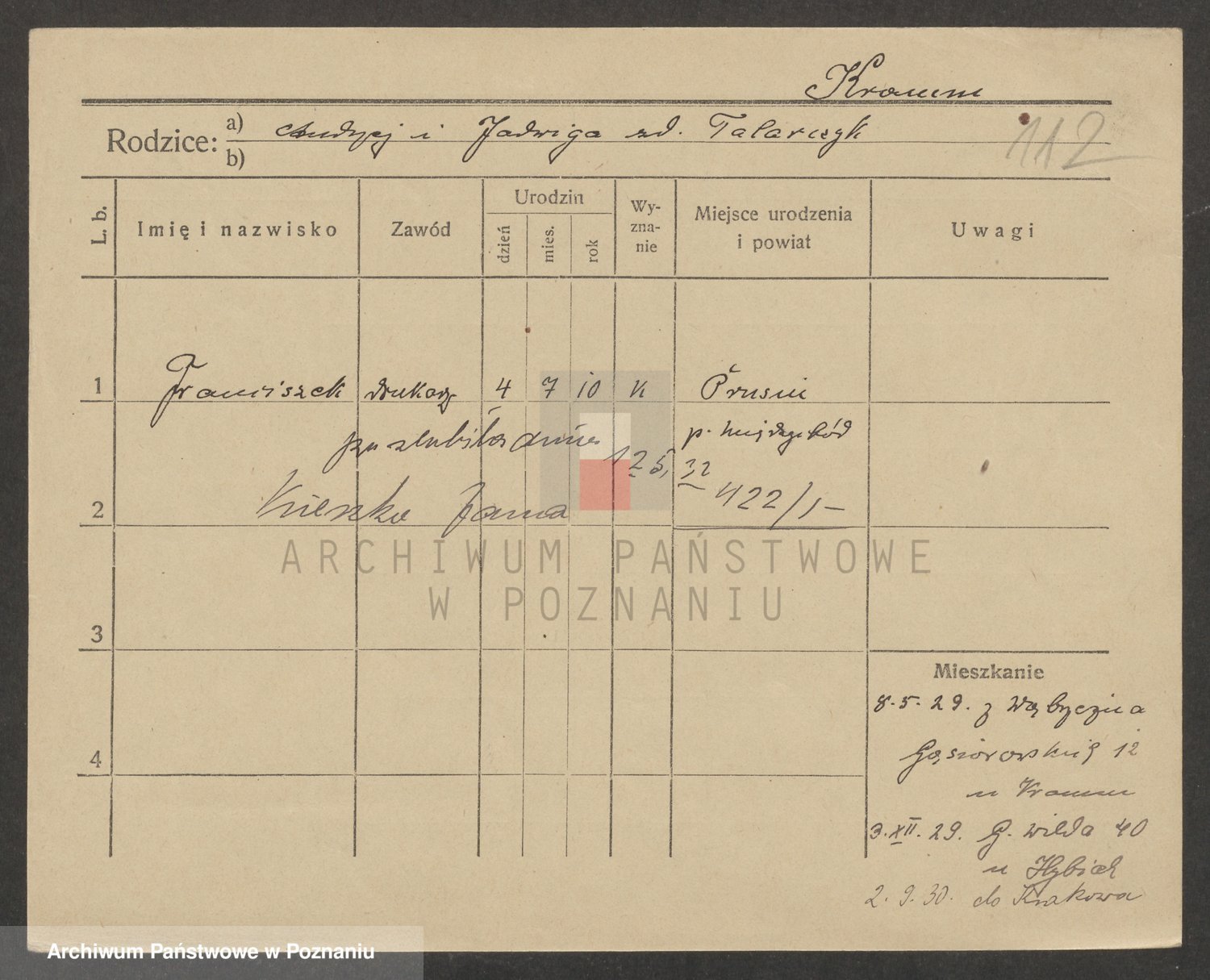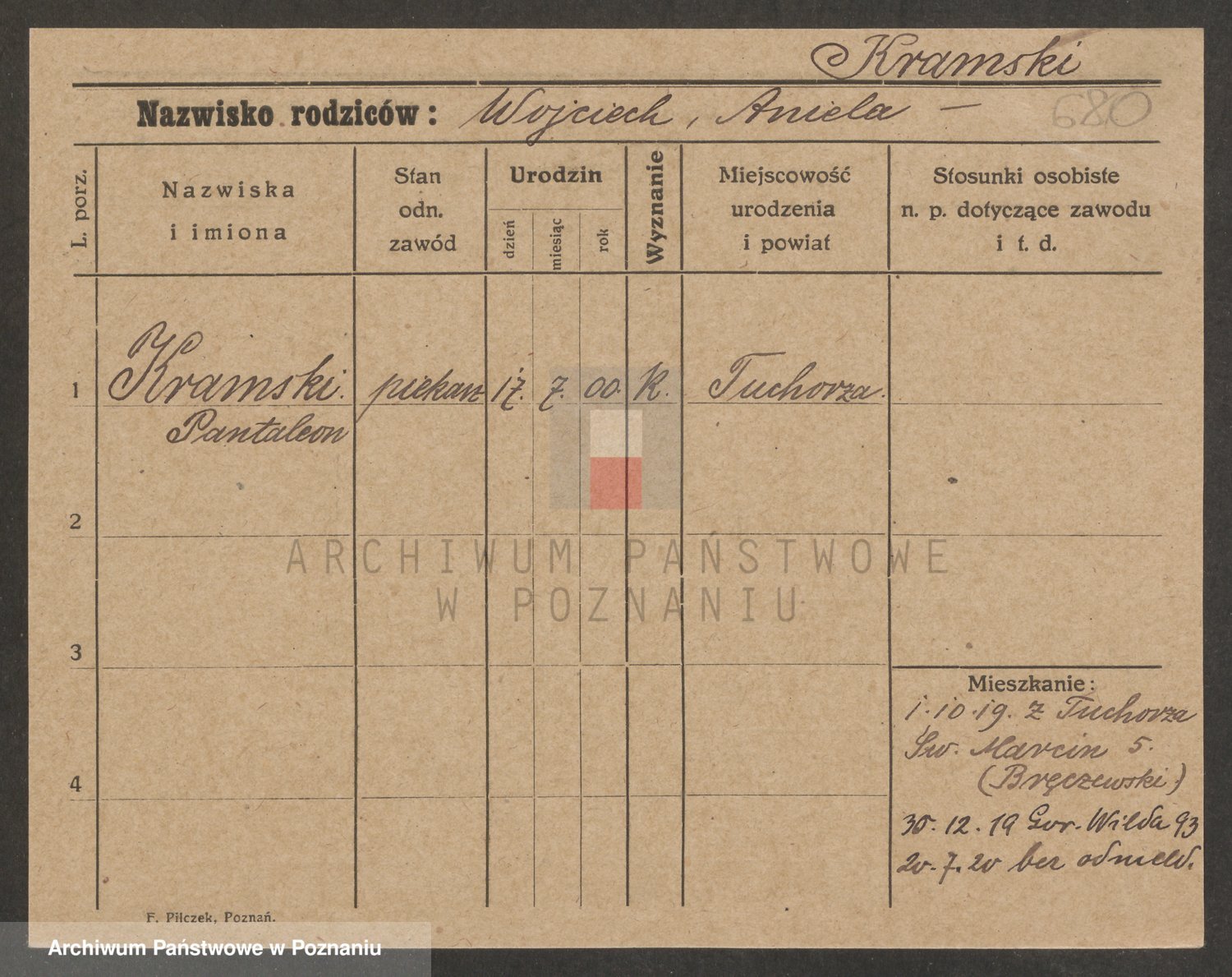Podgląd karty osobowej dostępny jest po kliknięciu na nazwisko lub ikonkę karty. Można dokonywać powiększenia (ikony na górze) lub przechodzić między kolejnymi skanami (strzałki po bokach).