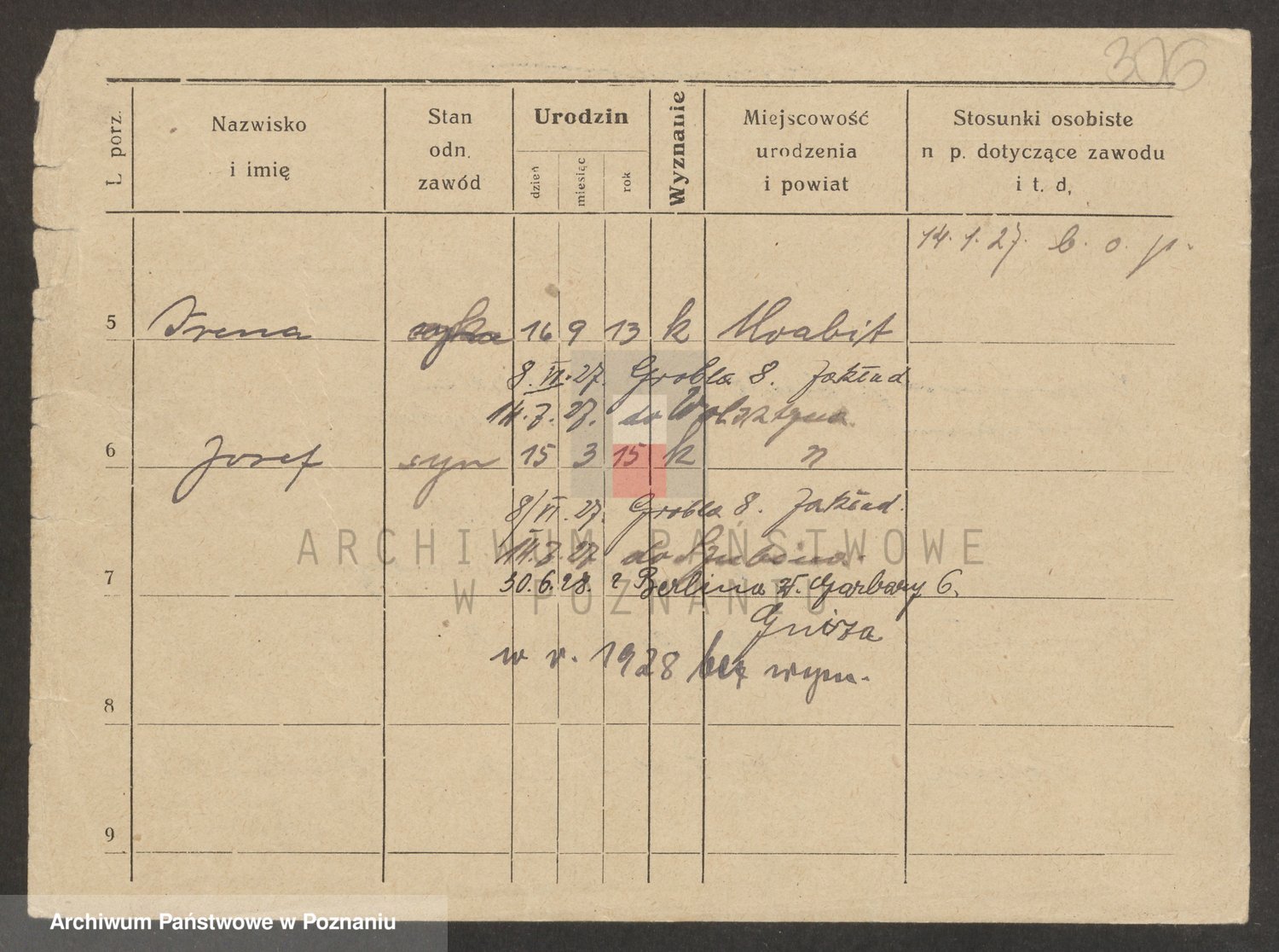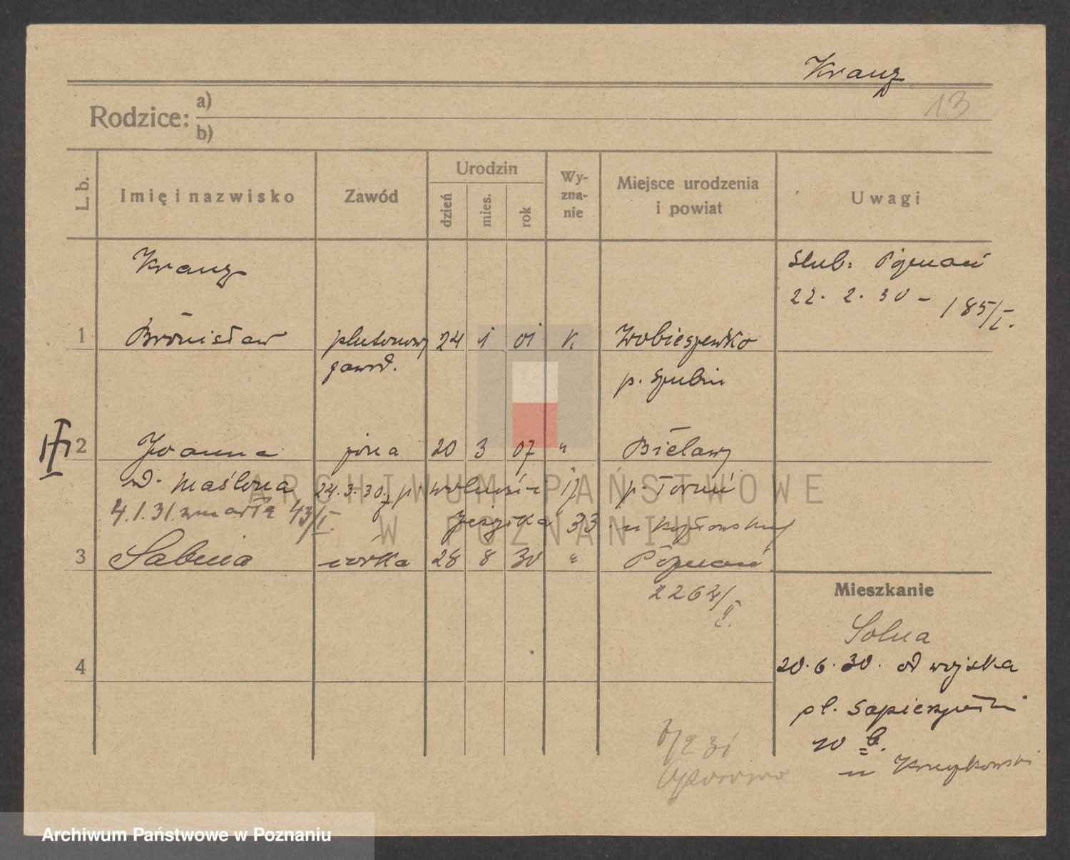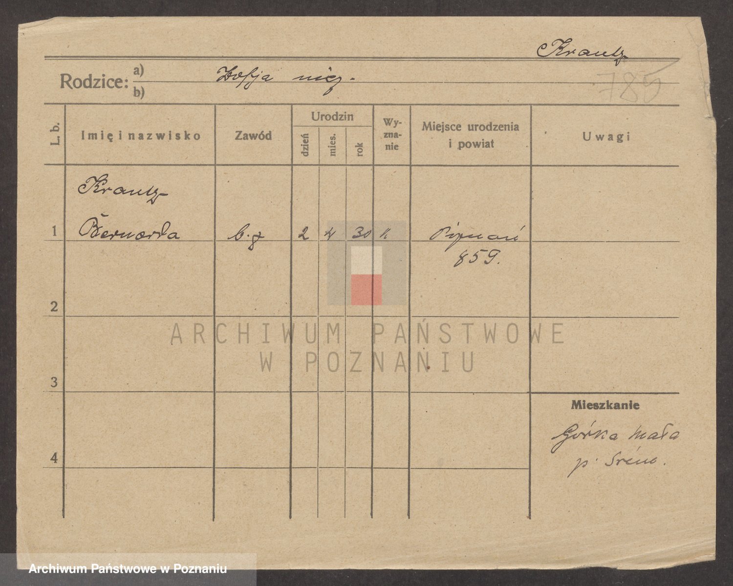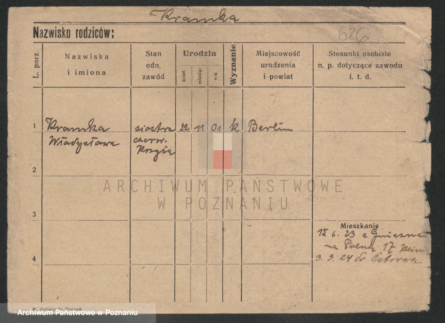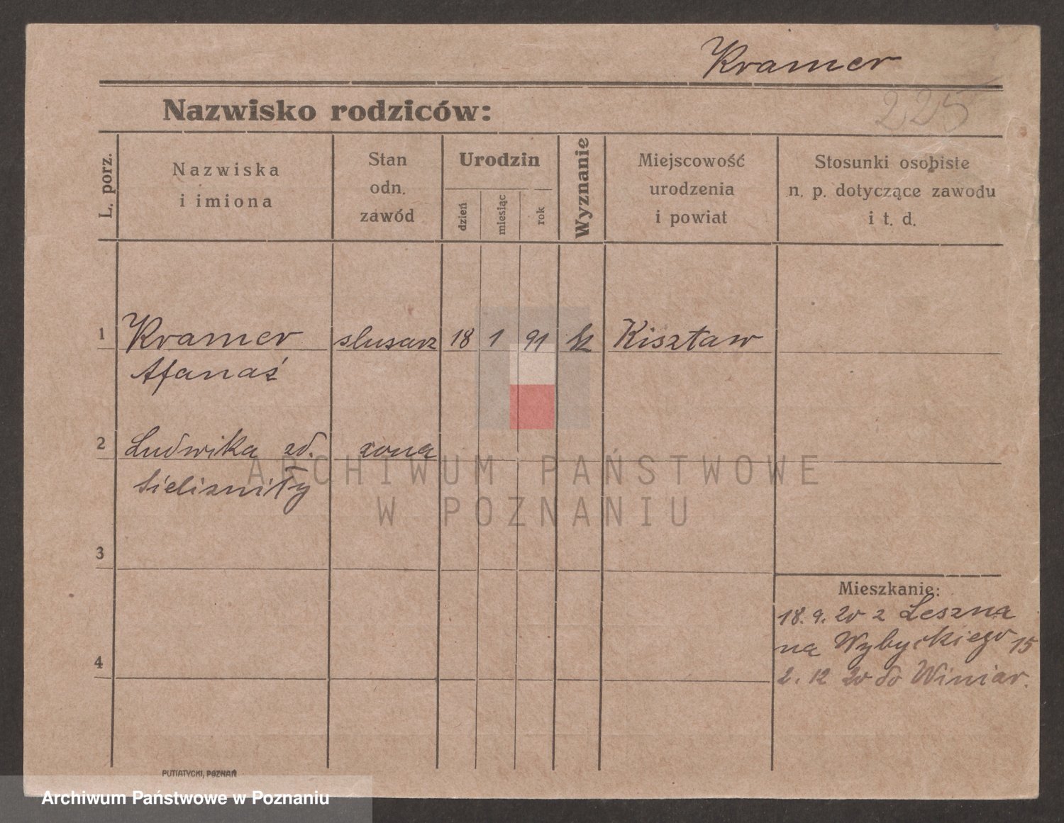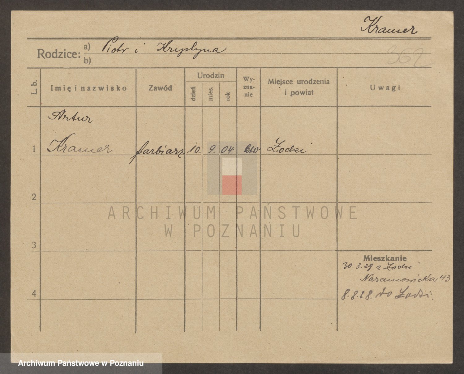 Podgląd karty osobowej dostępny jest po kliknięciu na nazwisko lub ikonkę karty. Można dokonywać powiększenia (ikony na górze) lub przechodzić między kolejnymi skanami (strzałki po bokach).