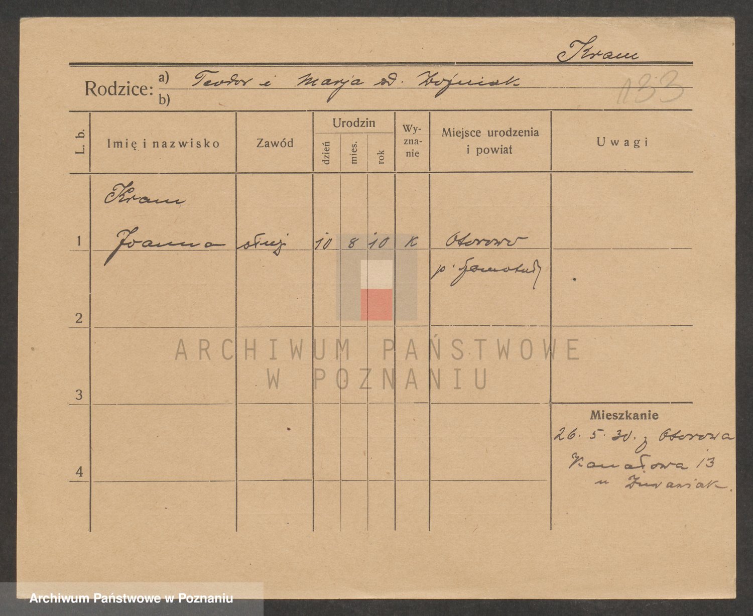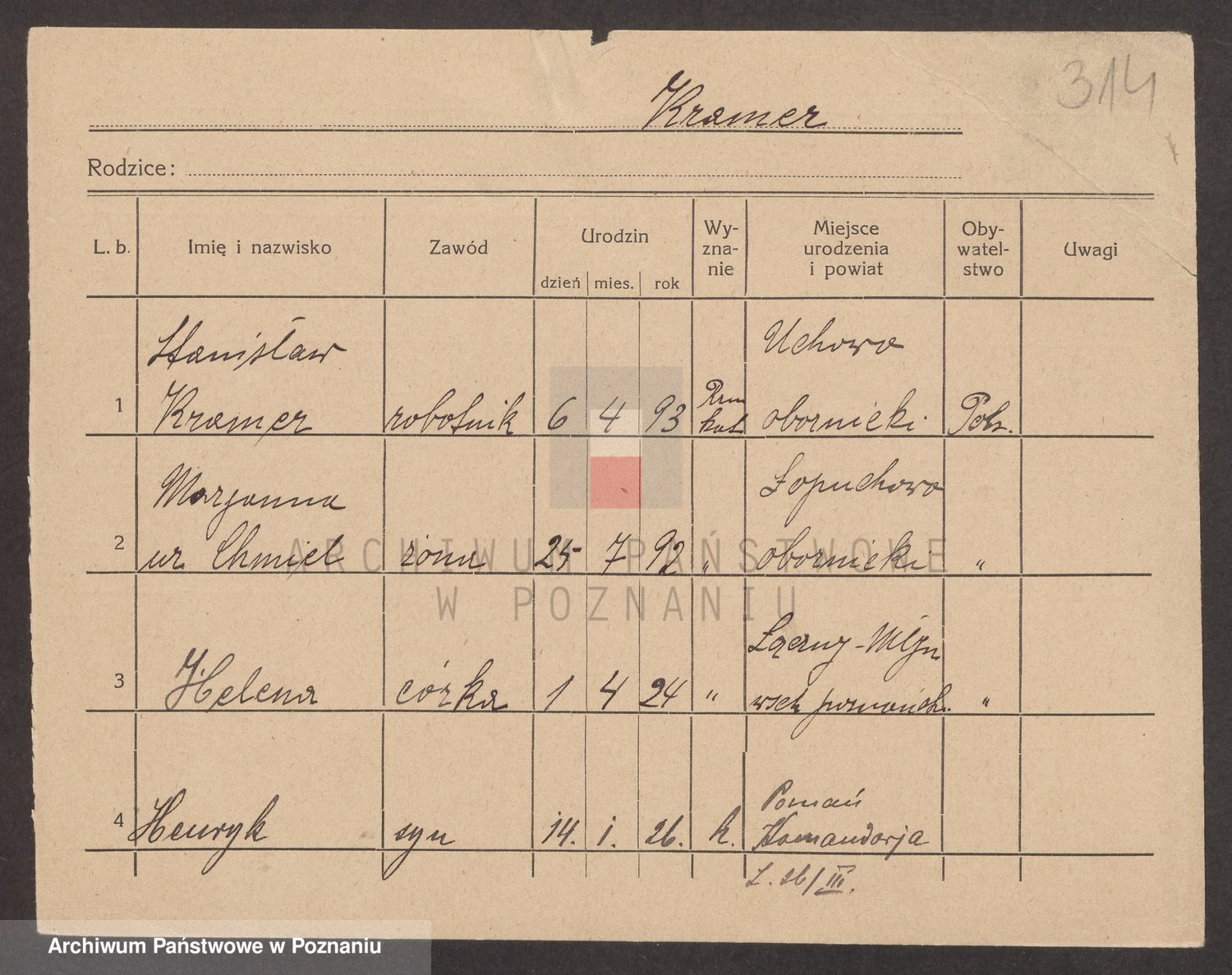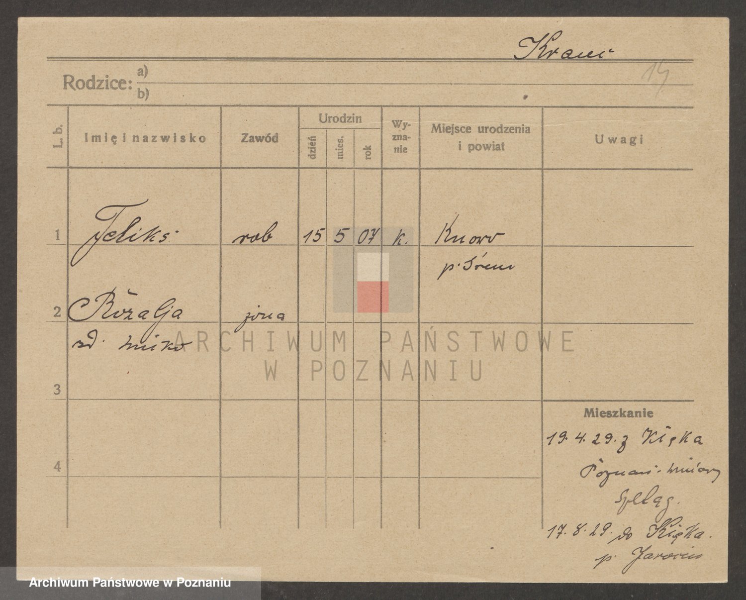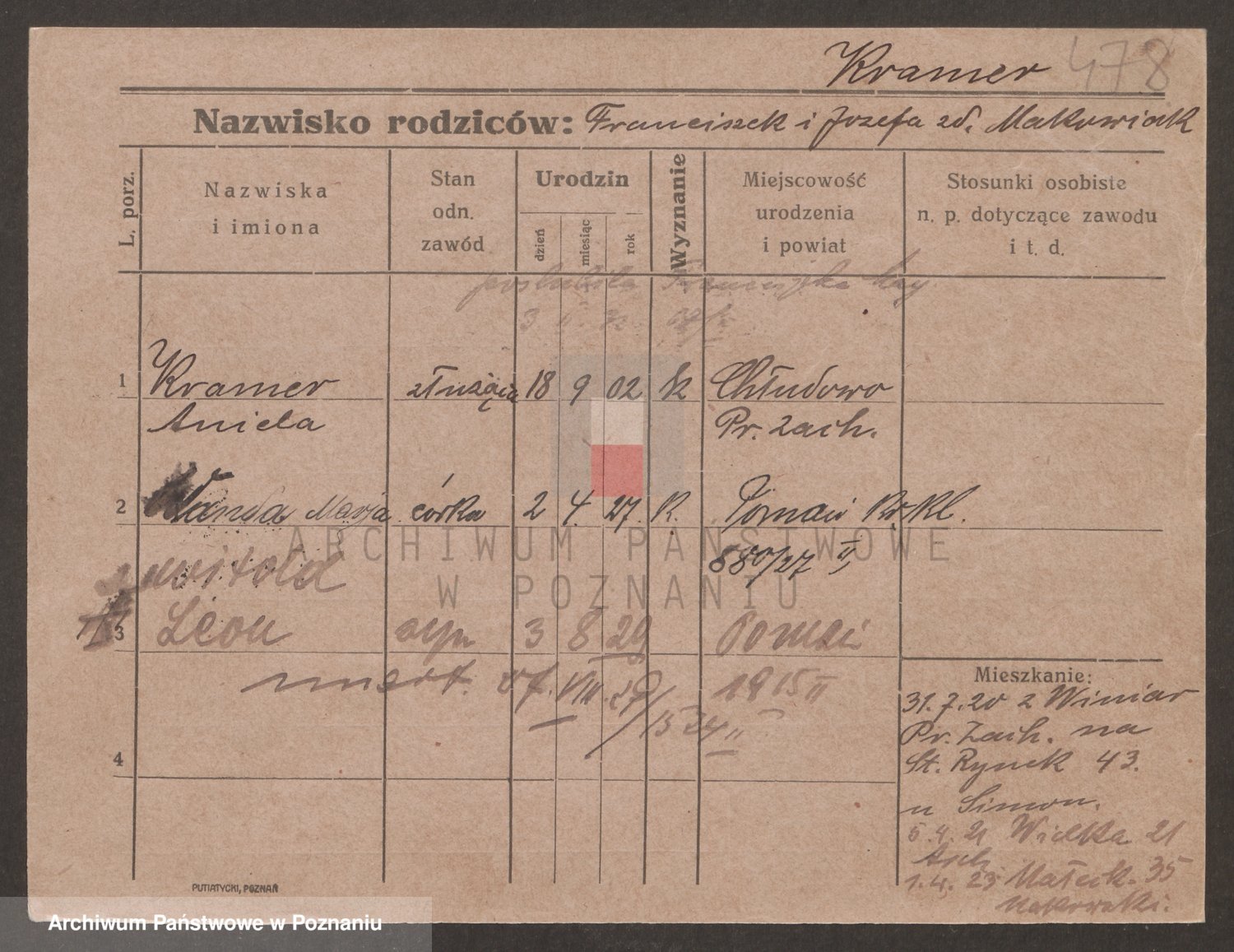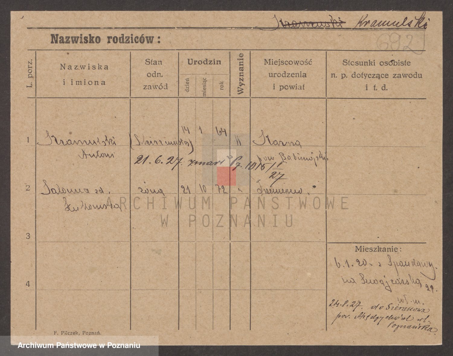 Podgląd karty osobowej dostępny jest po kliknięciu na nazwisko lub ikonkę karty. Można dokonywać powiększenia (ikony na górze) lub przechodzić między kolejnymi skanami (strzałki po bokach).