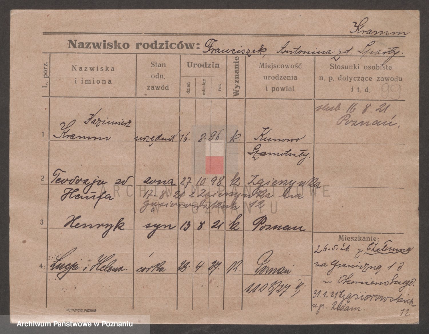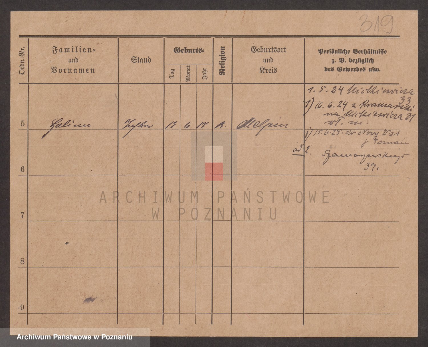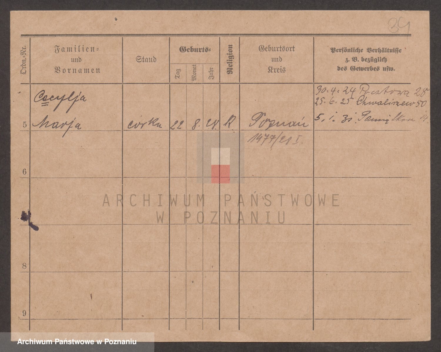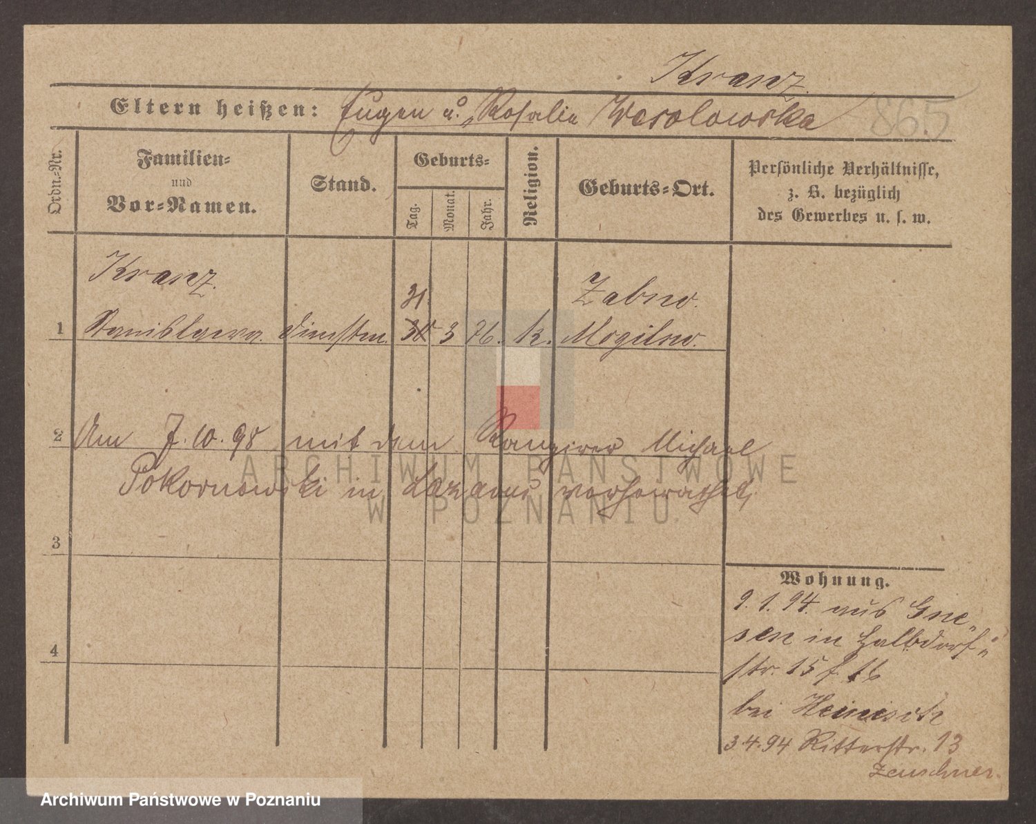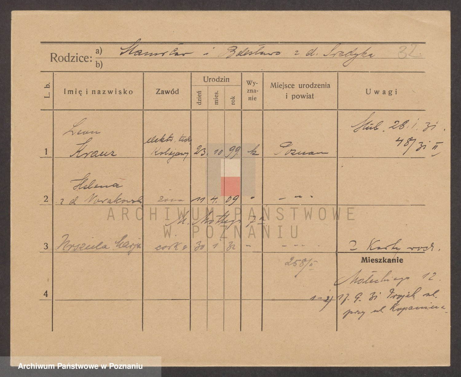 Podgląd karty osobowej dostępny jest po kliknięciu na nazwisko lub ikonkę karty. Można dokonywać powiększenia (ikony na górze) lub przechodzić między kolejnymi skanami (strzałki po bokach).