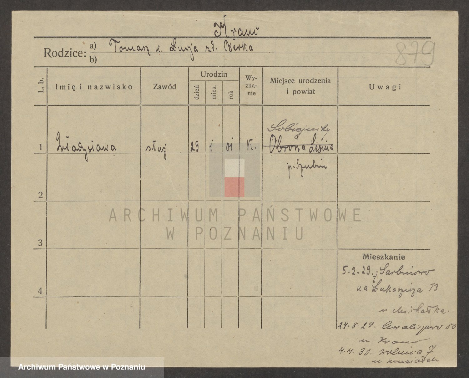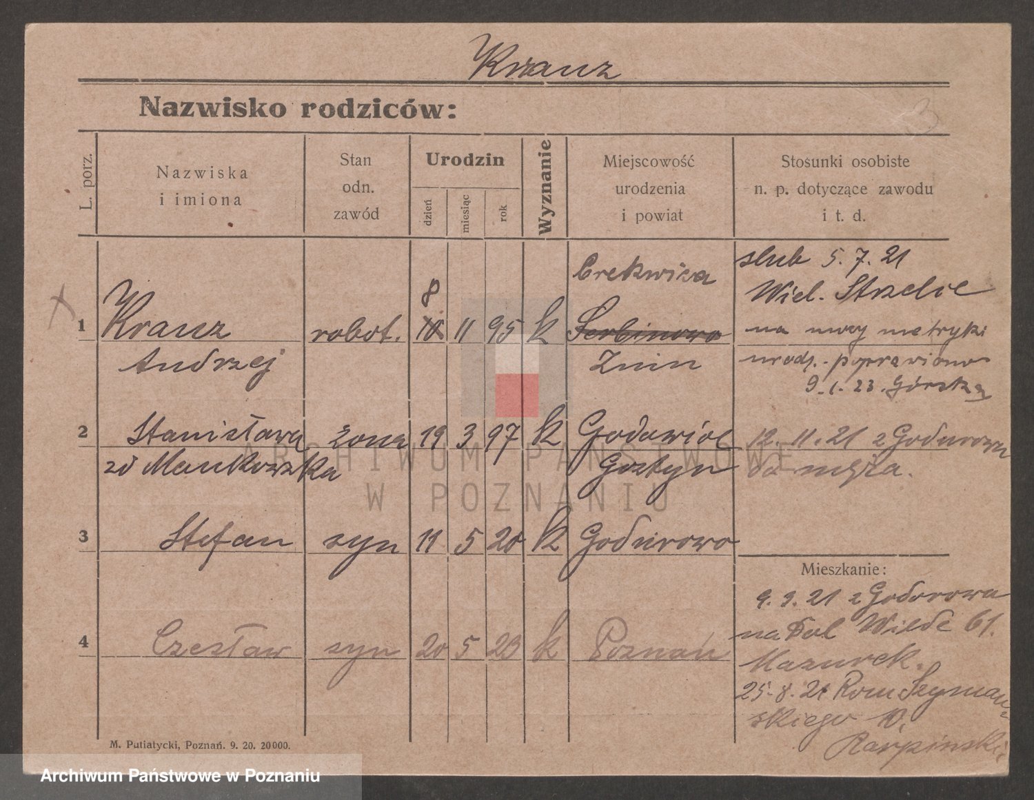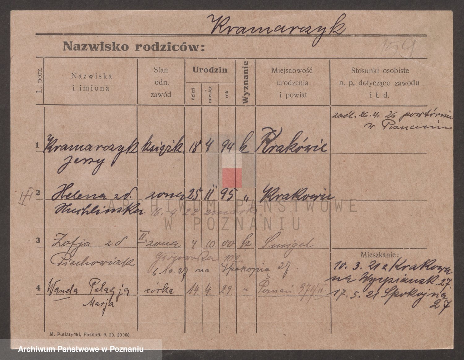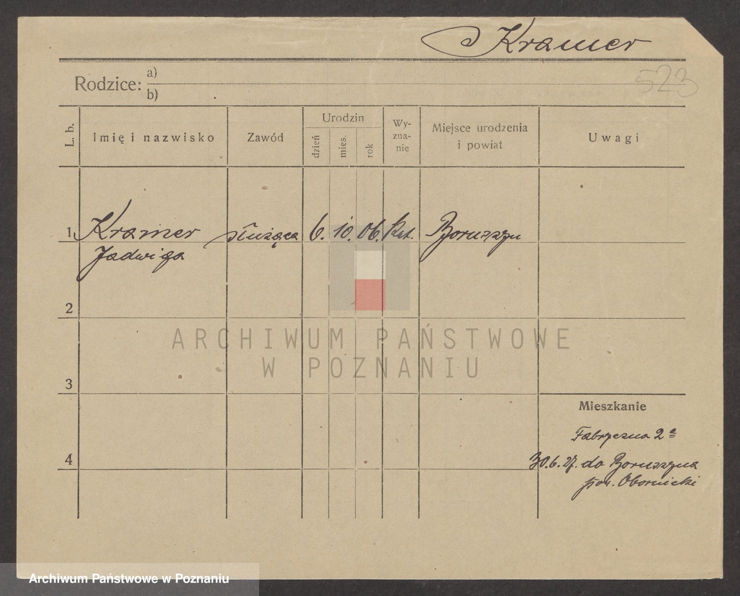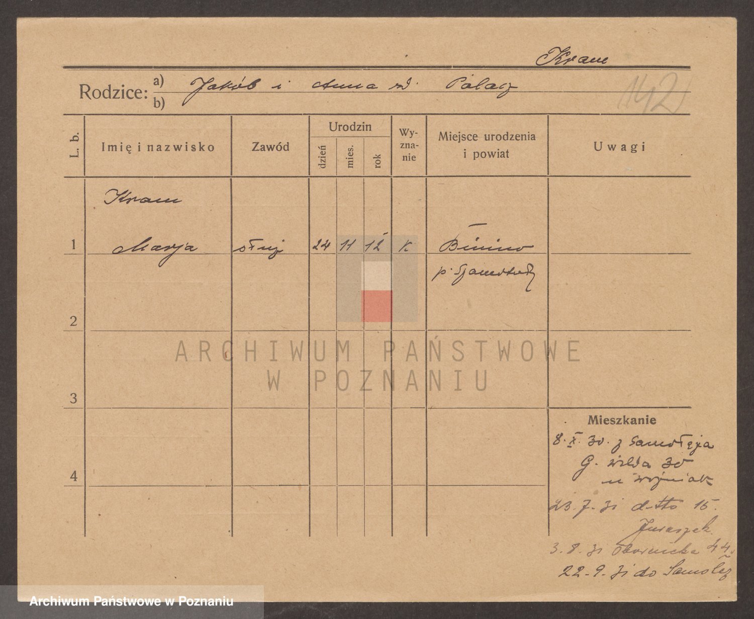 Podgląd karty osobowej dostępny jest po kliknięciu na nazwisko lub ikonkę karty. Można dokonywać powiększenia (ikony na górze) lub przechodzić między kolejnymi skanami (strzałki po bokach).