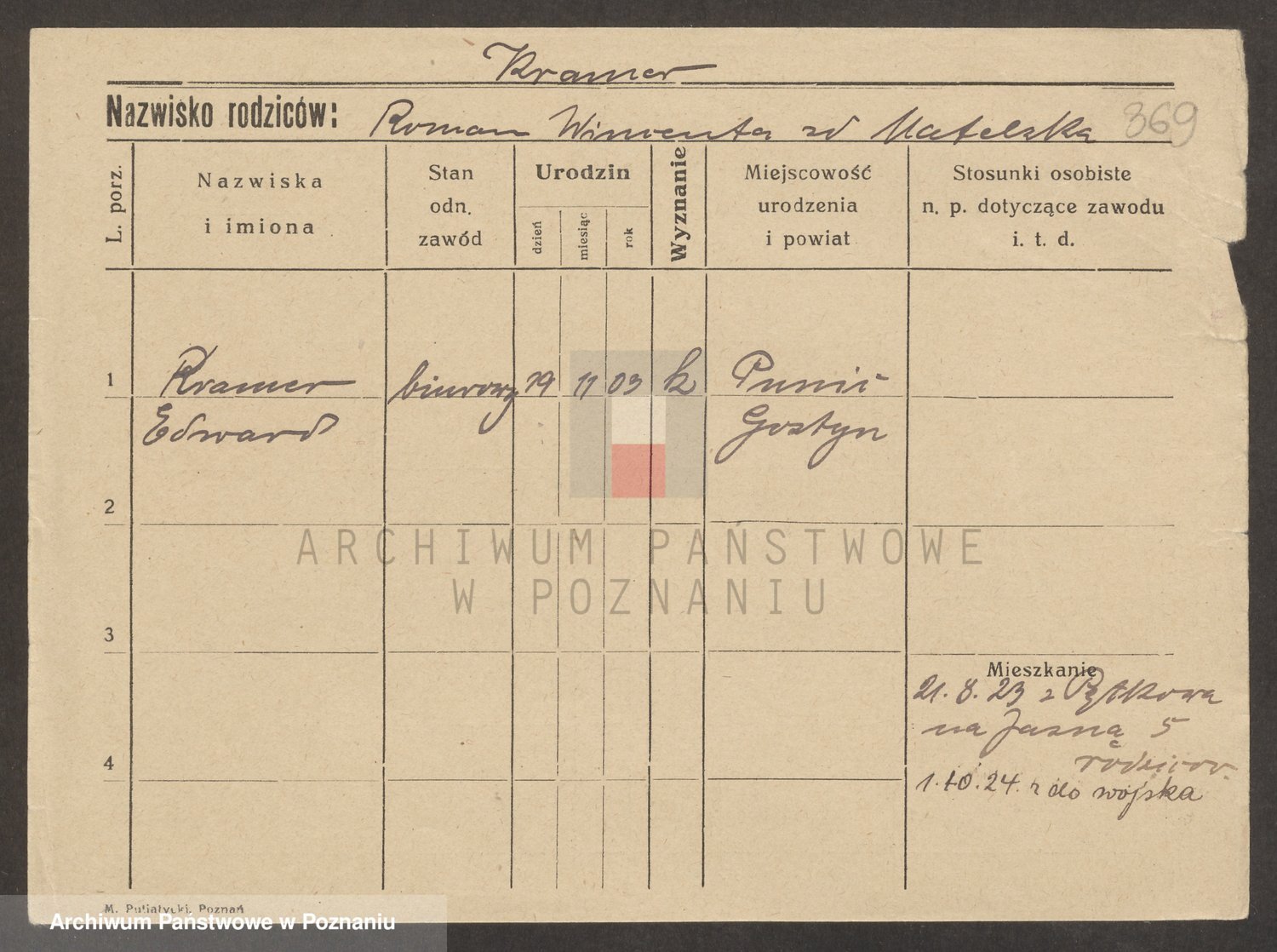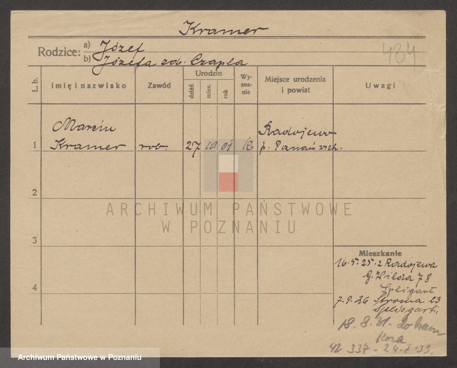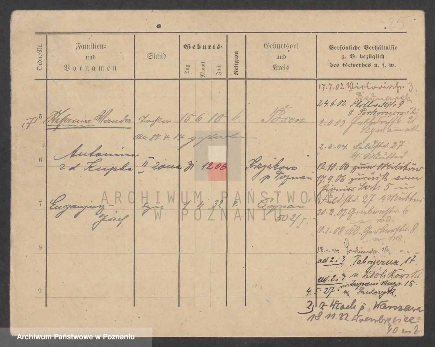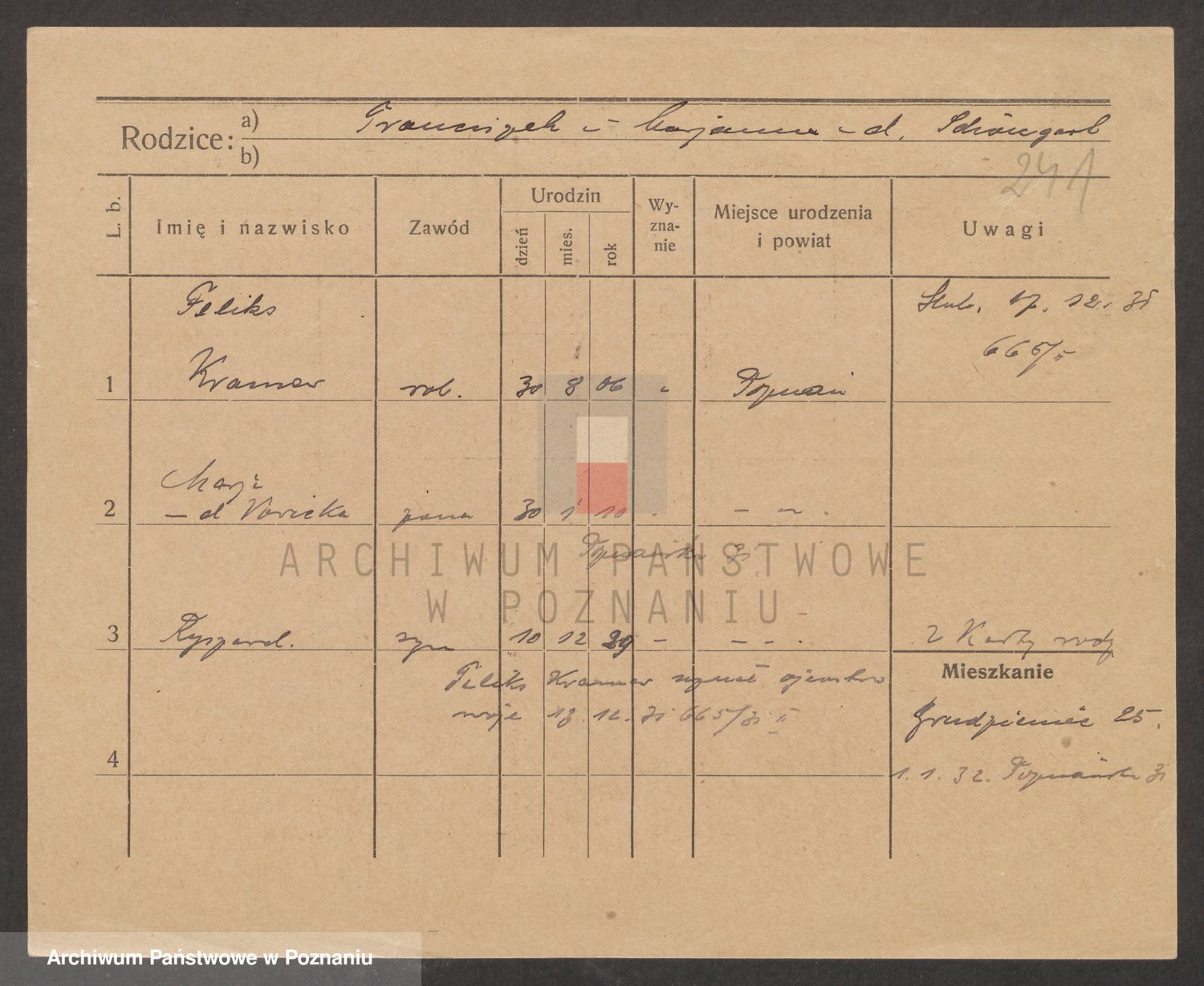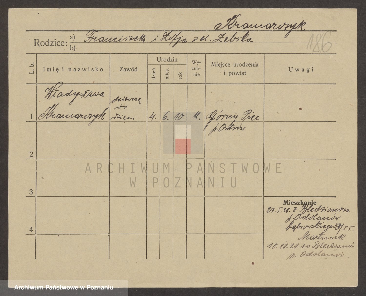 Podgląd karty osobowej dostępny jest po kliknięciu na nazwisko lub ikonkę karty. Można dokonywać powiększenia (ikony na górze) lub przechodzić między kolejnymi skanami (strzałki po bokach).
