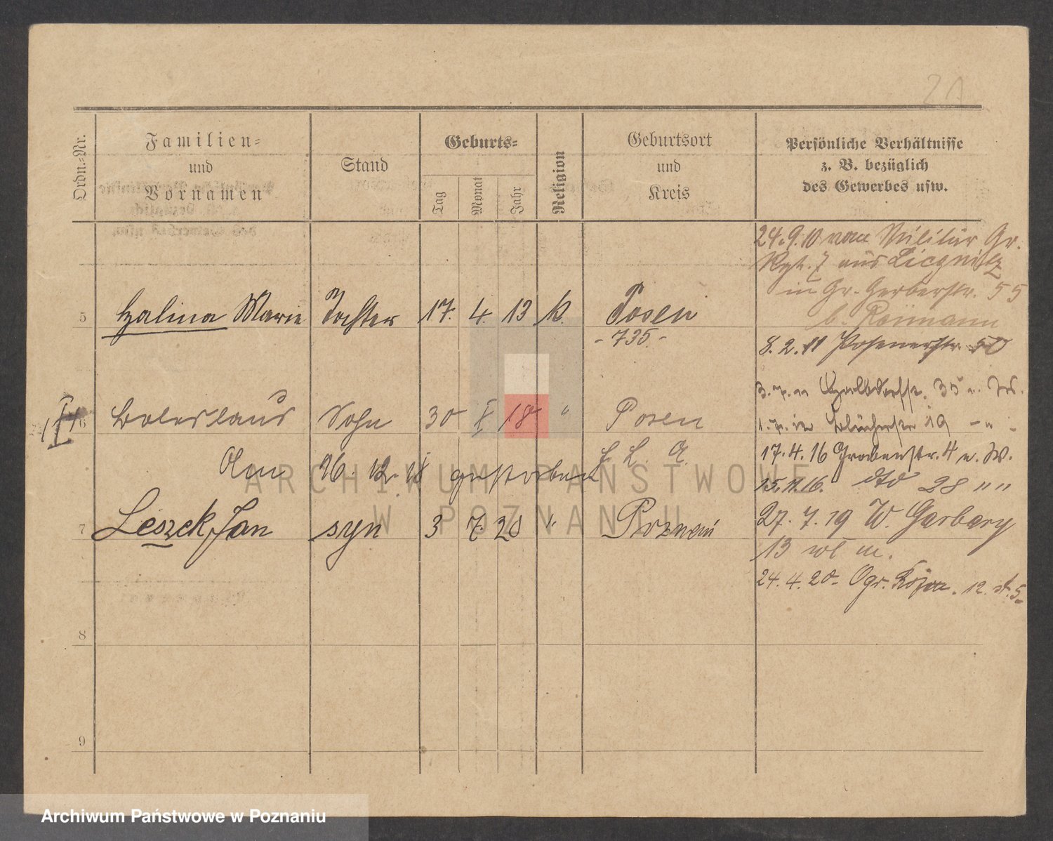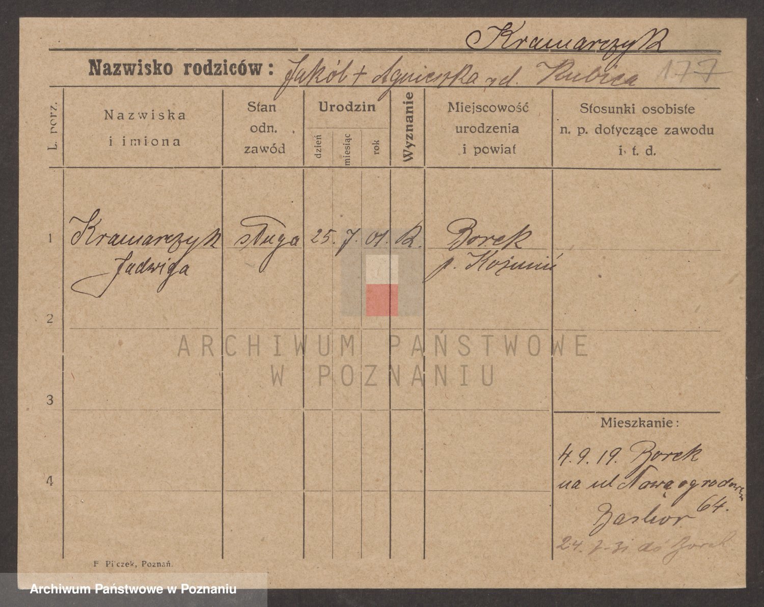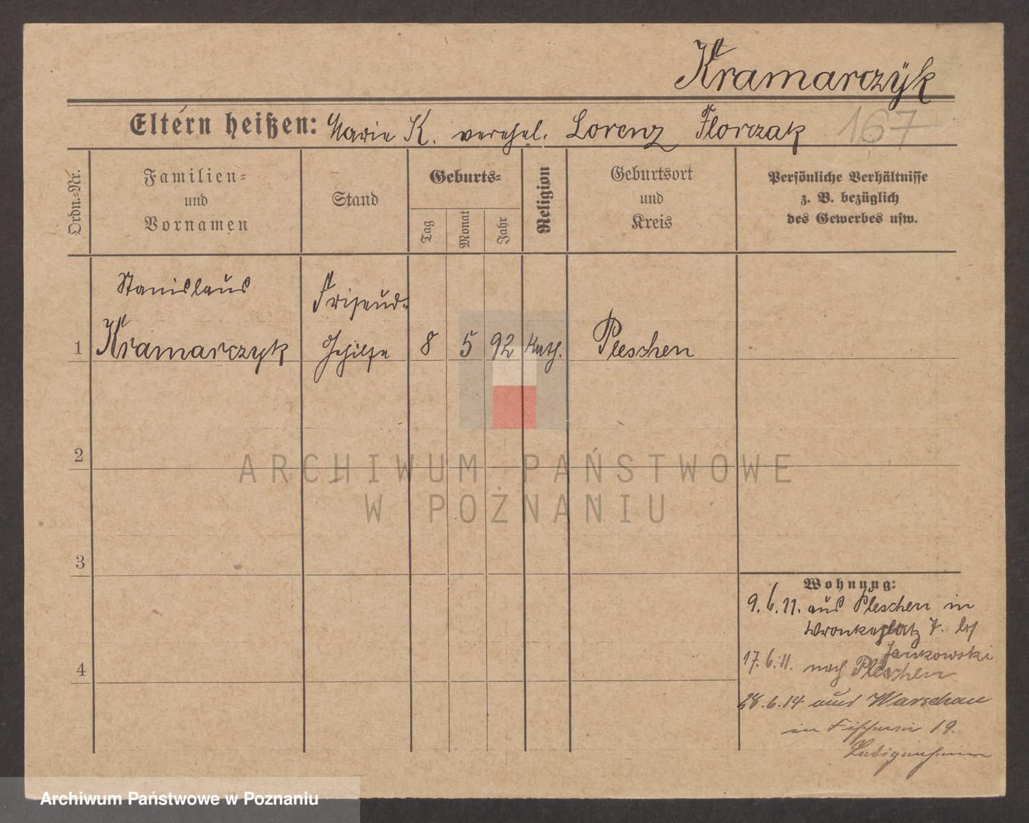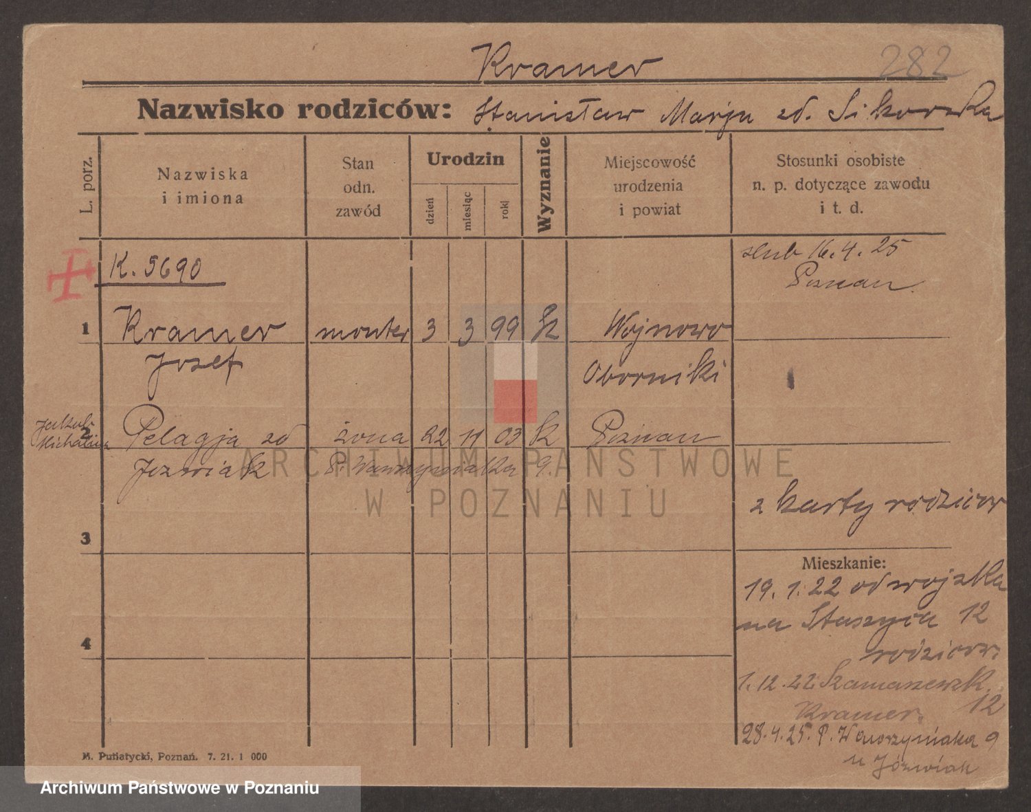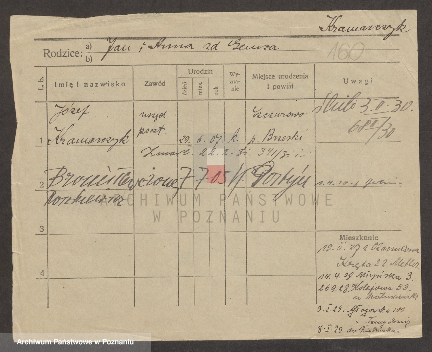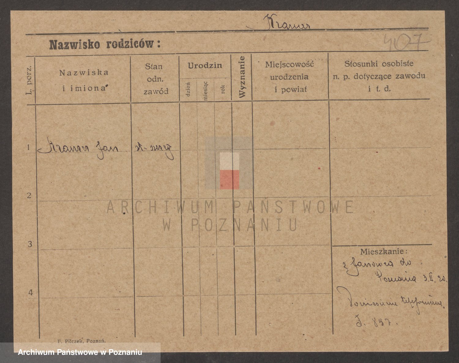 Podgląd karty osobowej dostępny jest po kliknięciu na nazwisko lub ikonkę karty. Można dokonywać powiększenia (ikony na górze) lub przechodzić między kolejnymi skanami (strzałki po bokach).