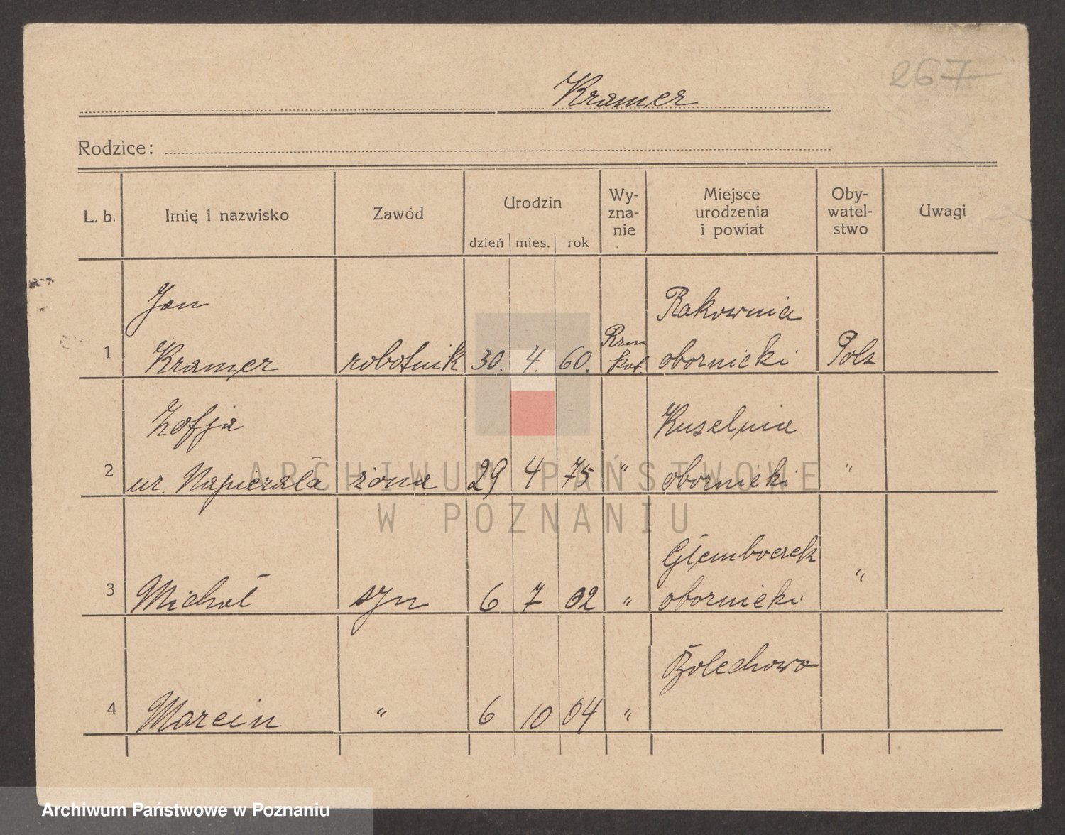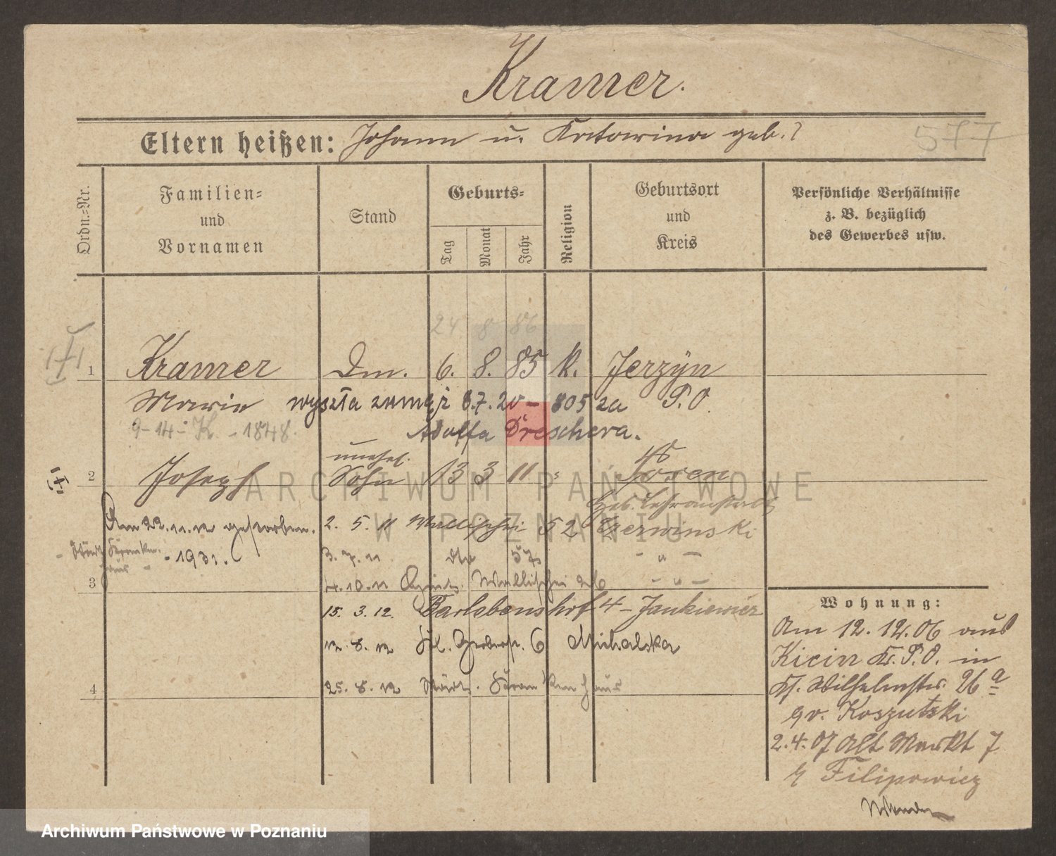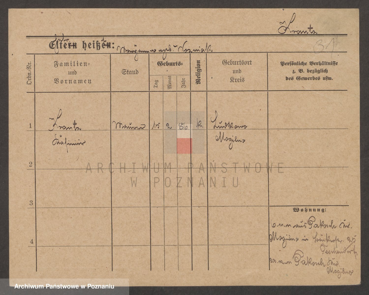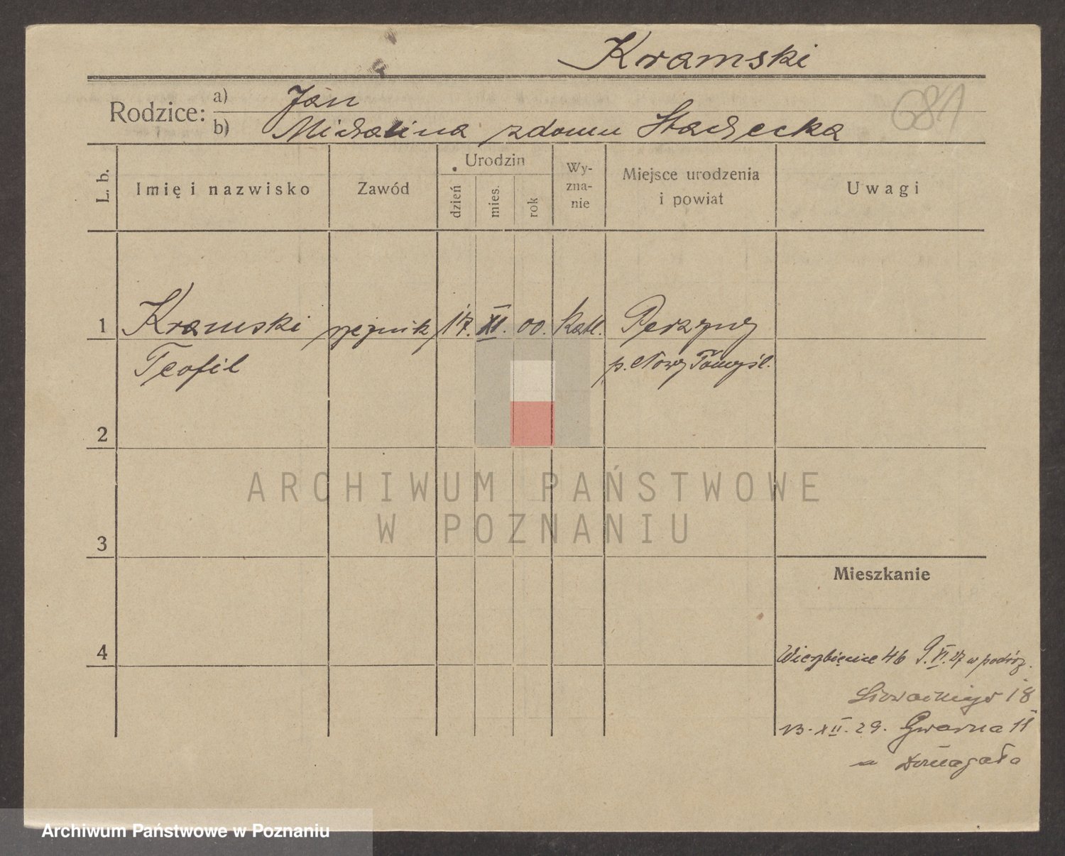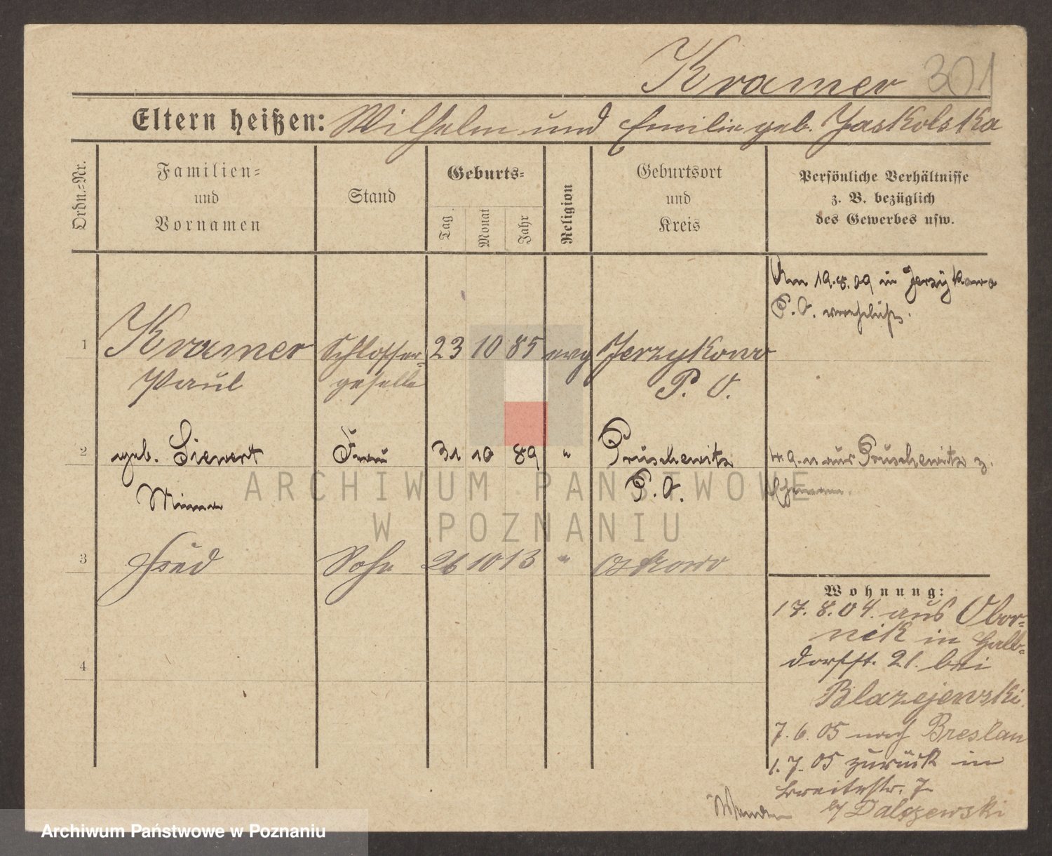 Podgląd karty osobowej dostępny jest po kliknięciu na nazwisko lub ikonkę karty. Można dokonywać powiększenia (ikony na górze) lub przechodzić między kolejnymi skanami (strzałki po bokach).