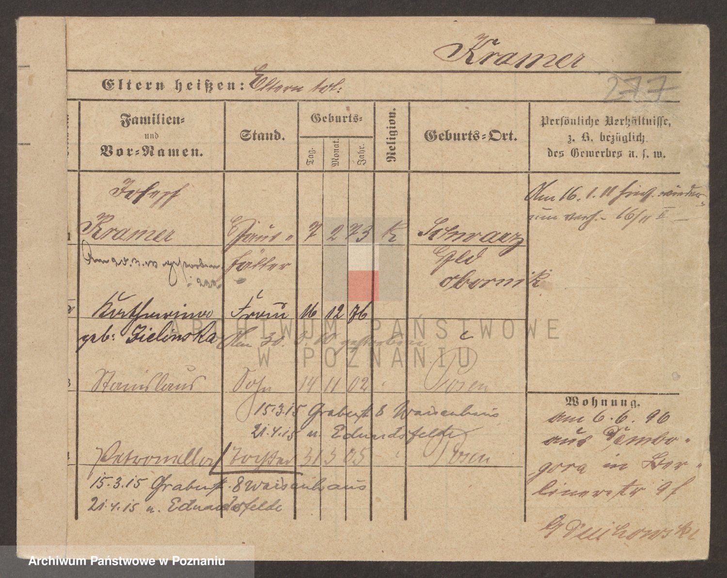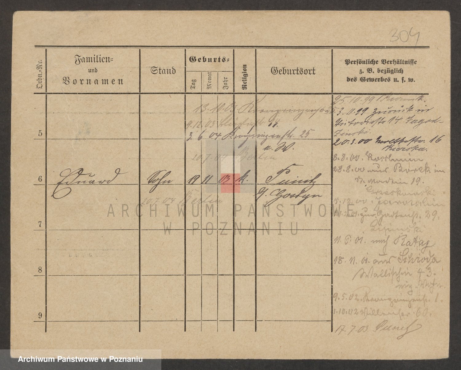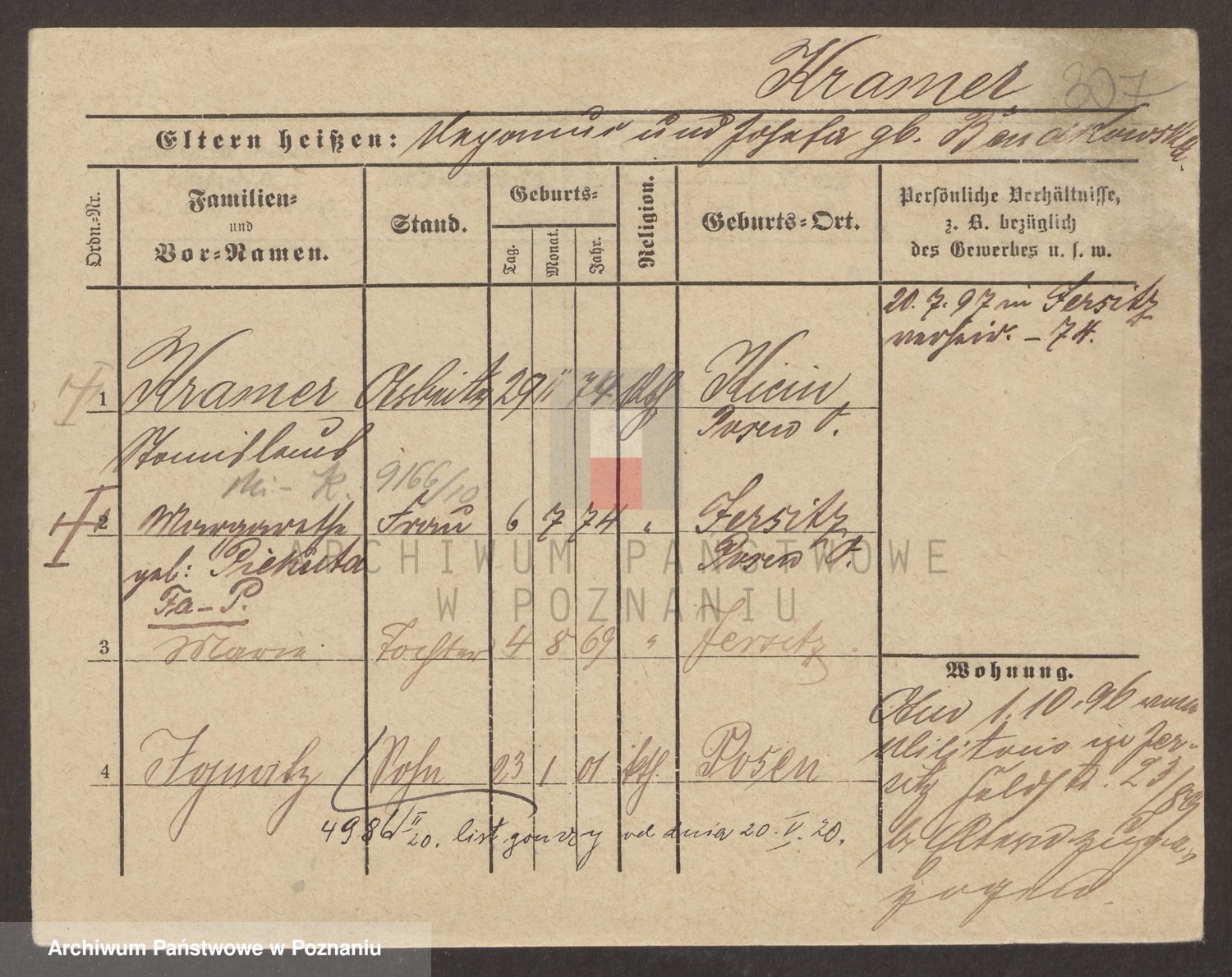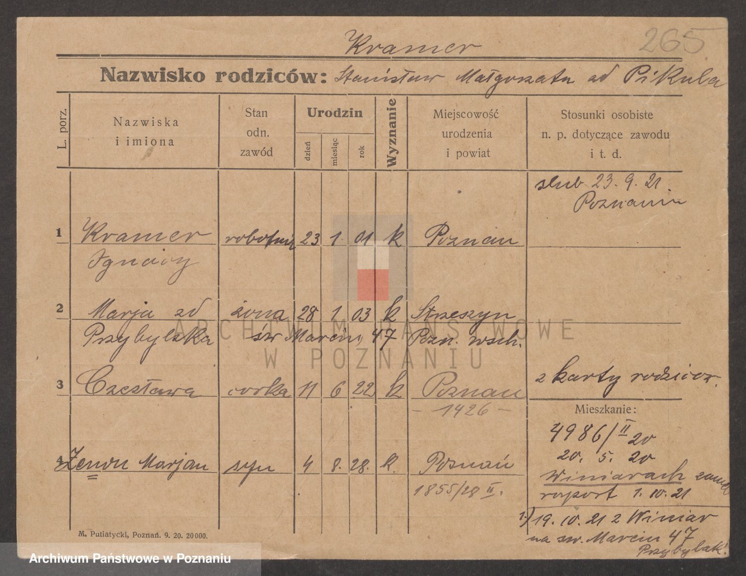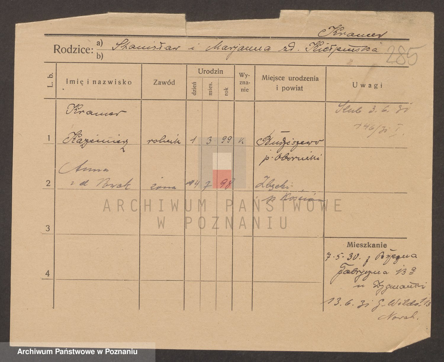 Podgląd karty osobowej dostępny jest po kliknięciu na nazwisko lub ikonkę karty. Można dokonywać powiększenia (ikony na górze) lub przechodzić między kolejnymi skanami (strzałki po bokach).