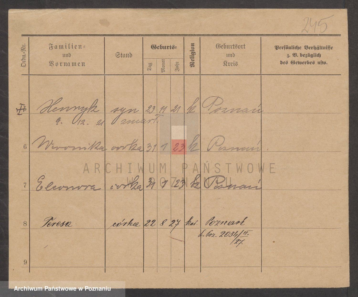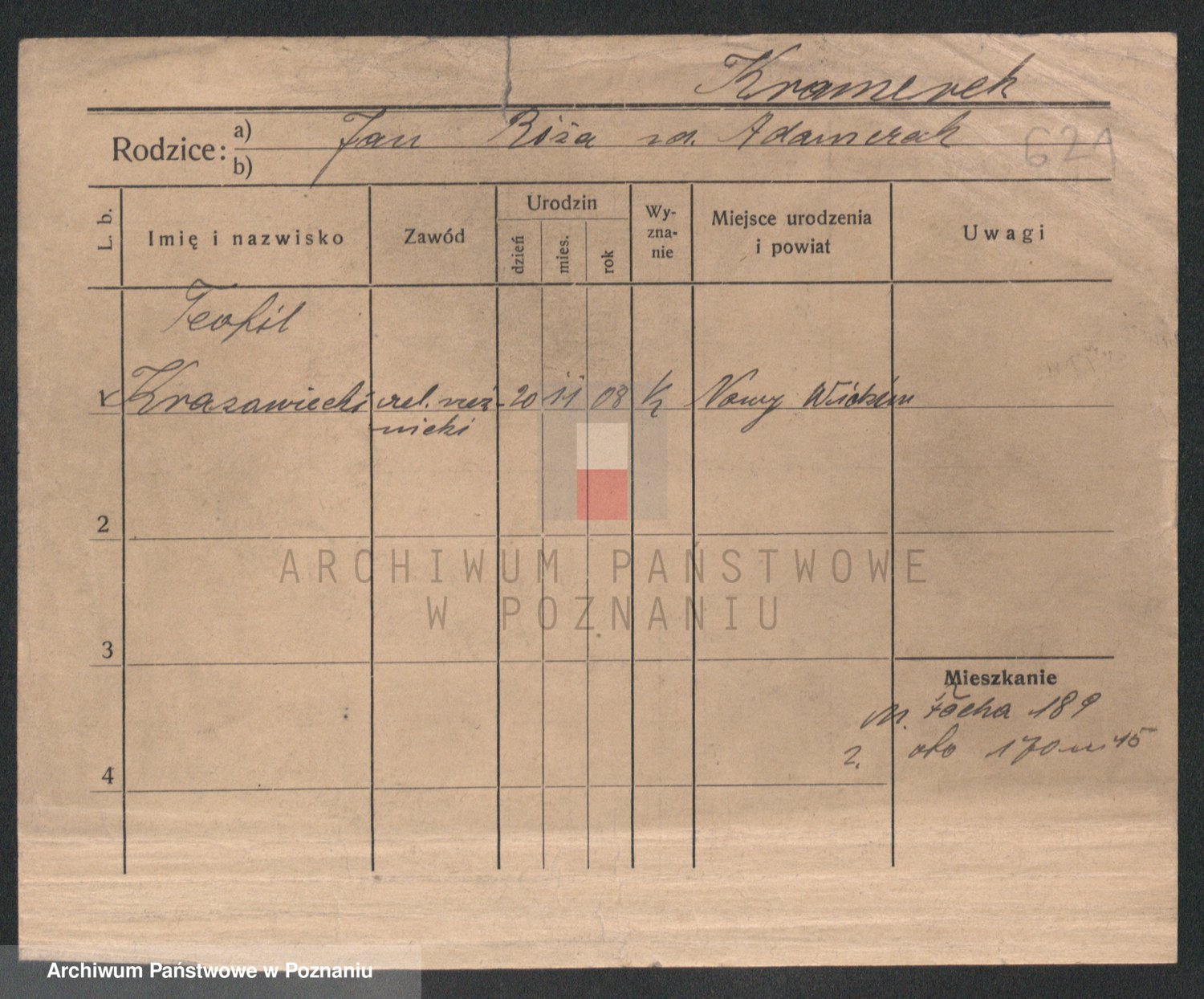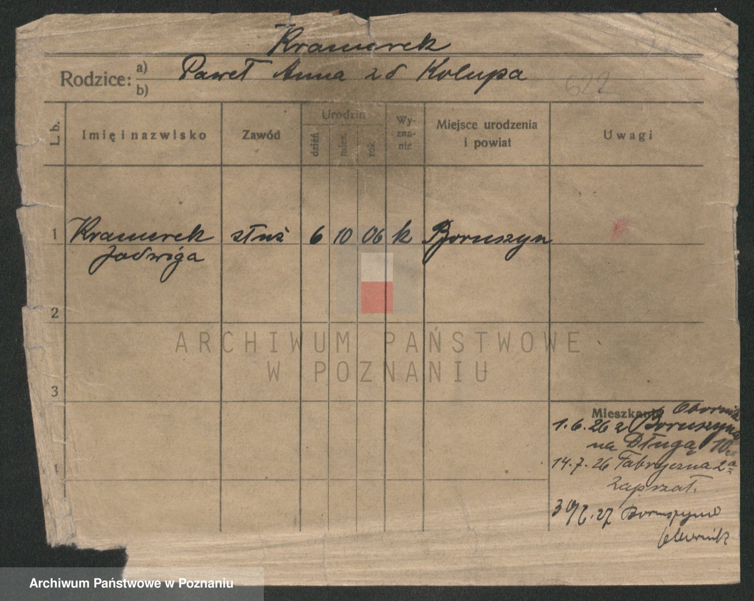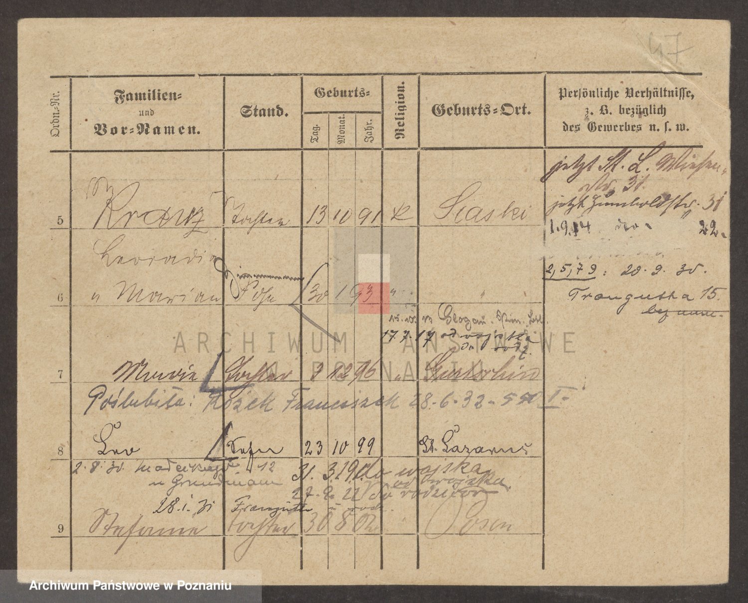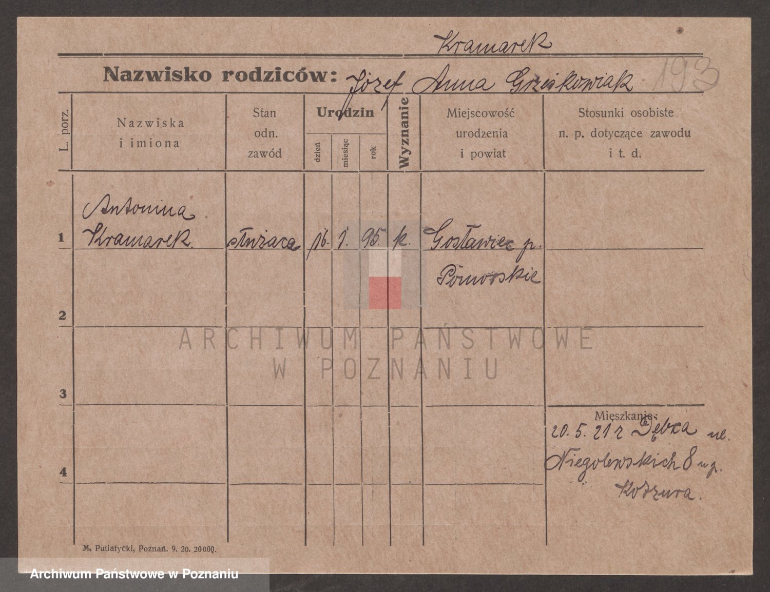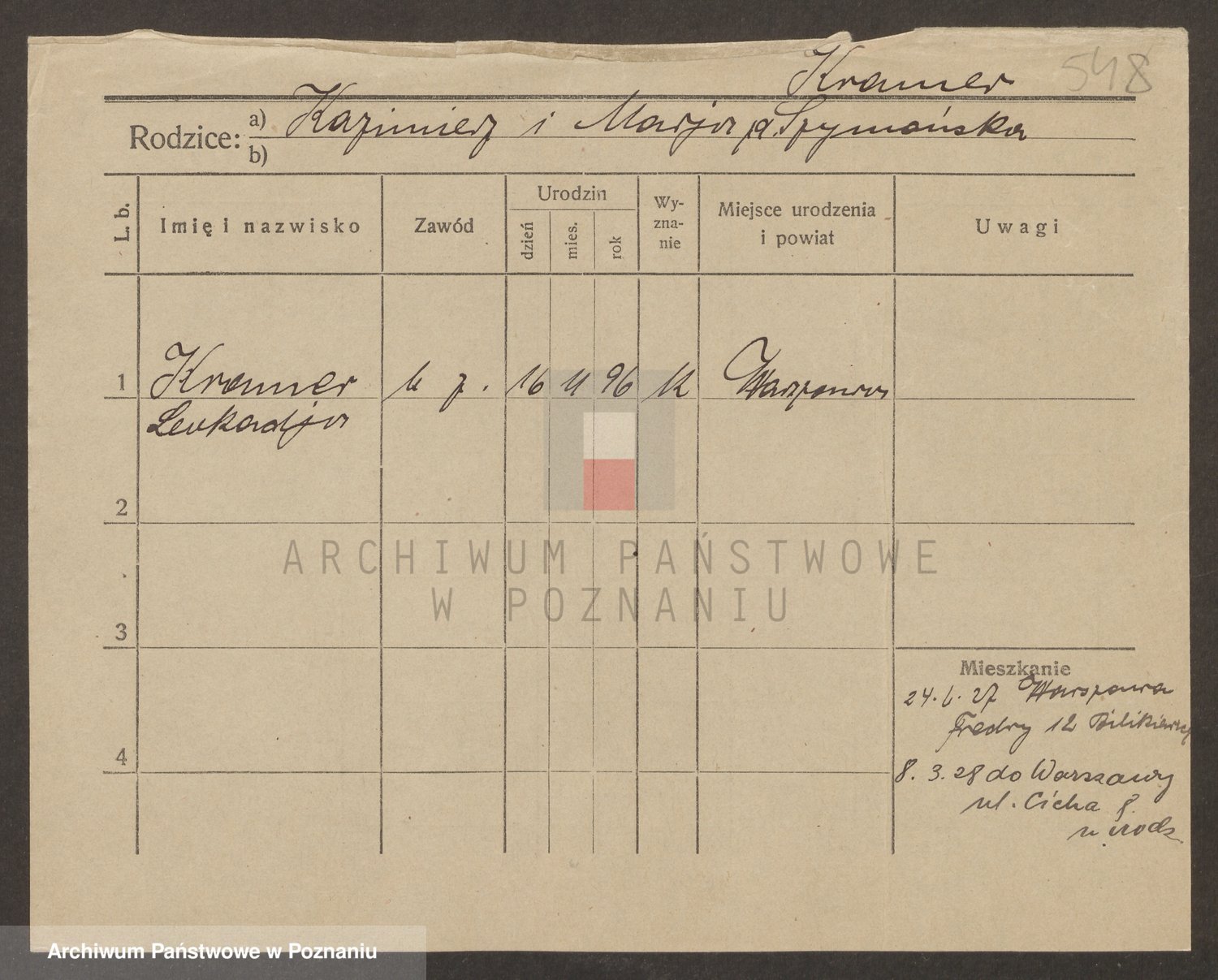 Podgląd karty osobowej dostępny jest po kliknięciu na nazwisko lub ikonkę karty. Można dokonywać powiększenia (ikony na górze) lub przechodzić między kolejnymi skanami (strzałki po bokach).