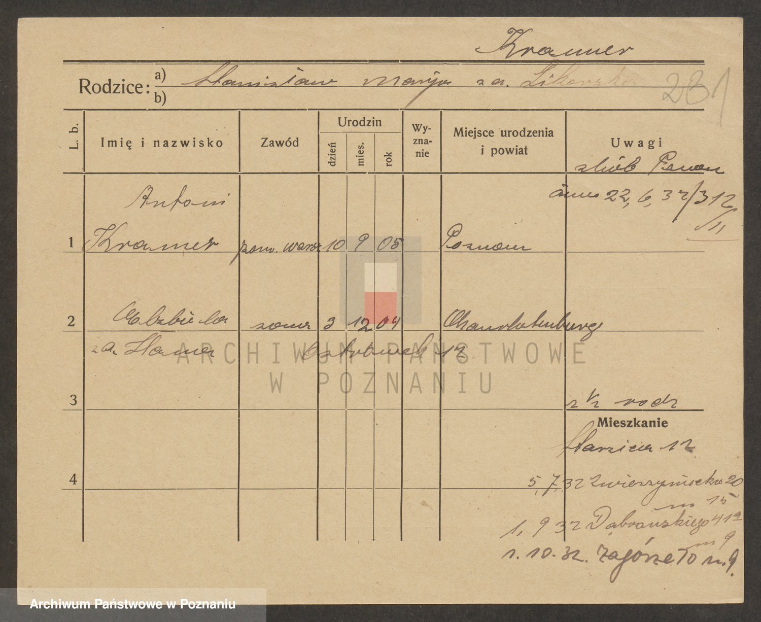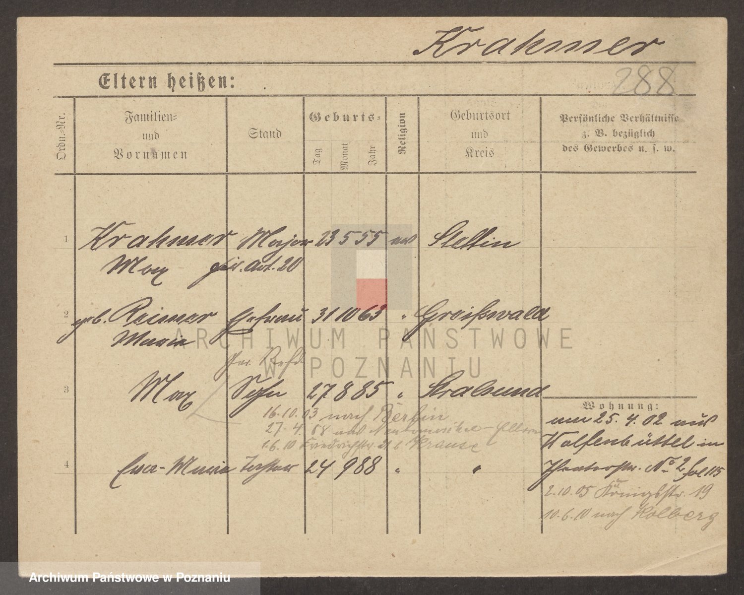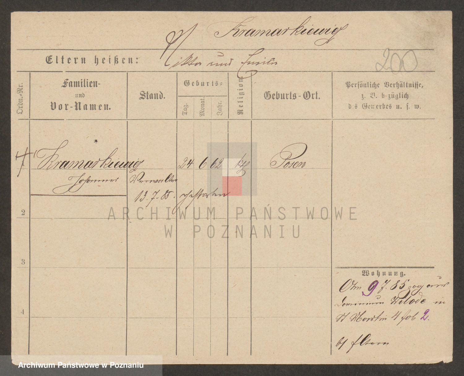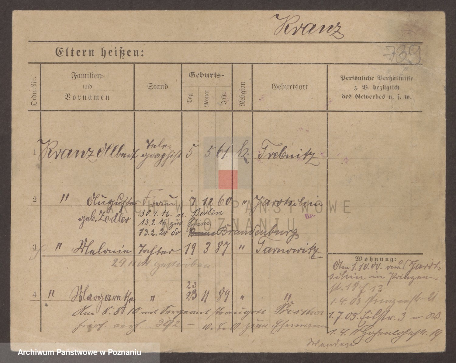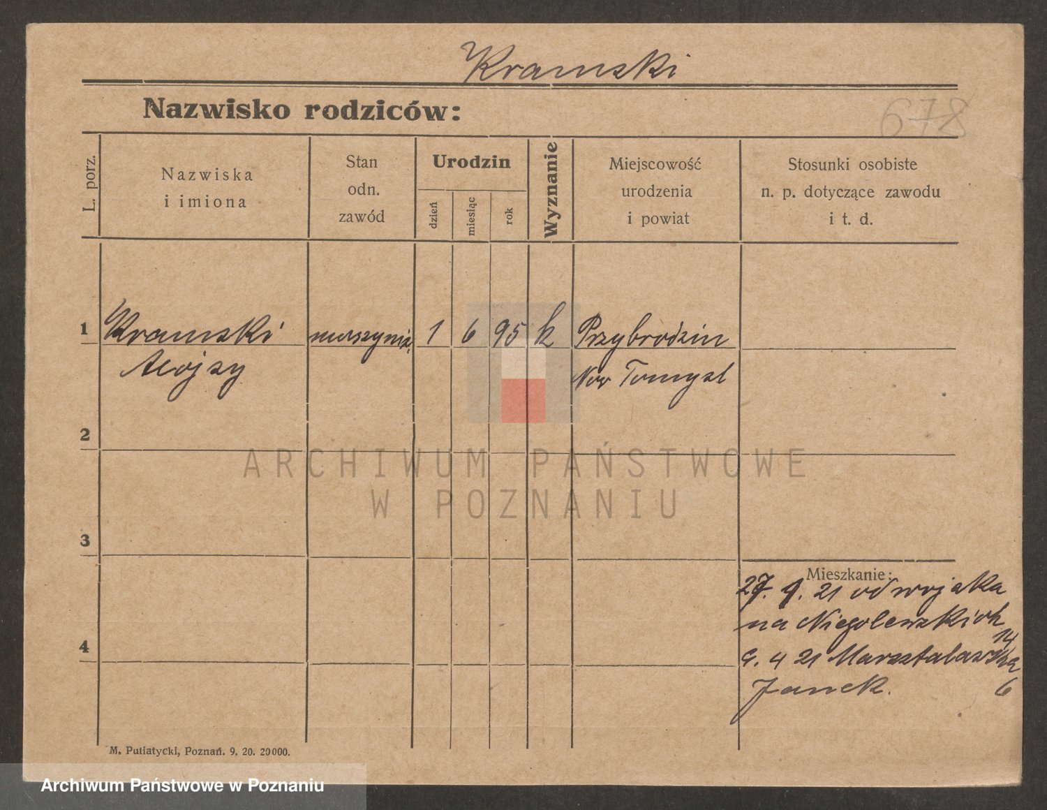 Podgląd karty osobowej dostępny jest po kliknięciu na nazwisko lub ikonkę karty. Można dokonywać powiększenia (ikony na górze) lub przechodzić między kolejnymi skanami (strzałki po bokach).