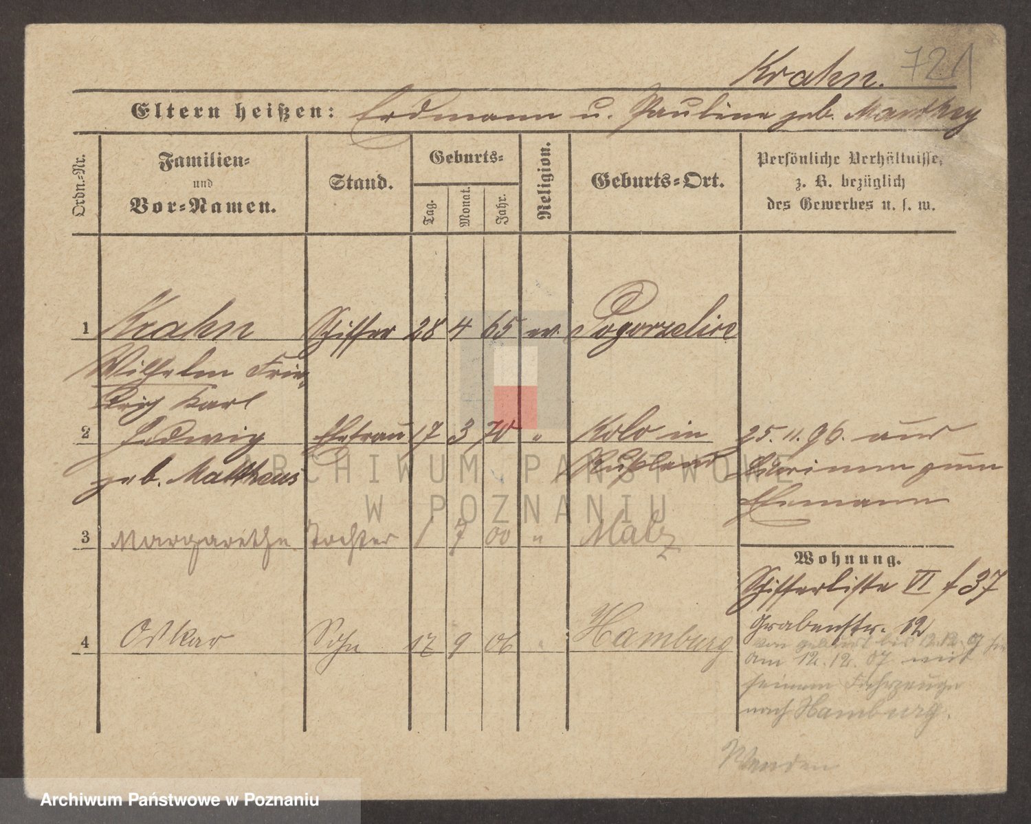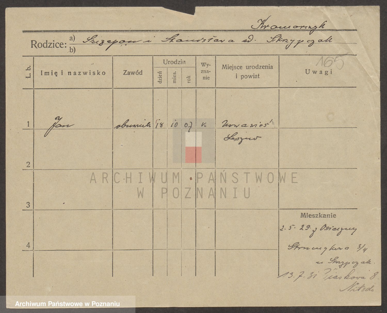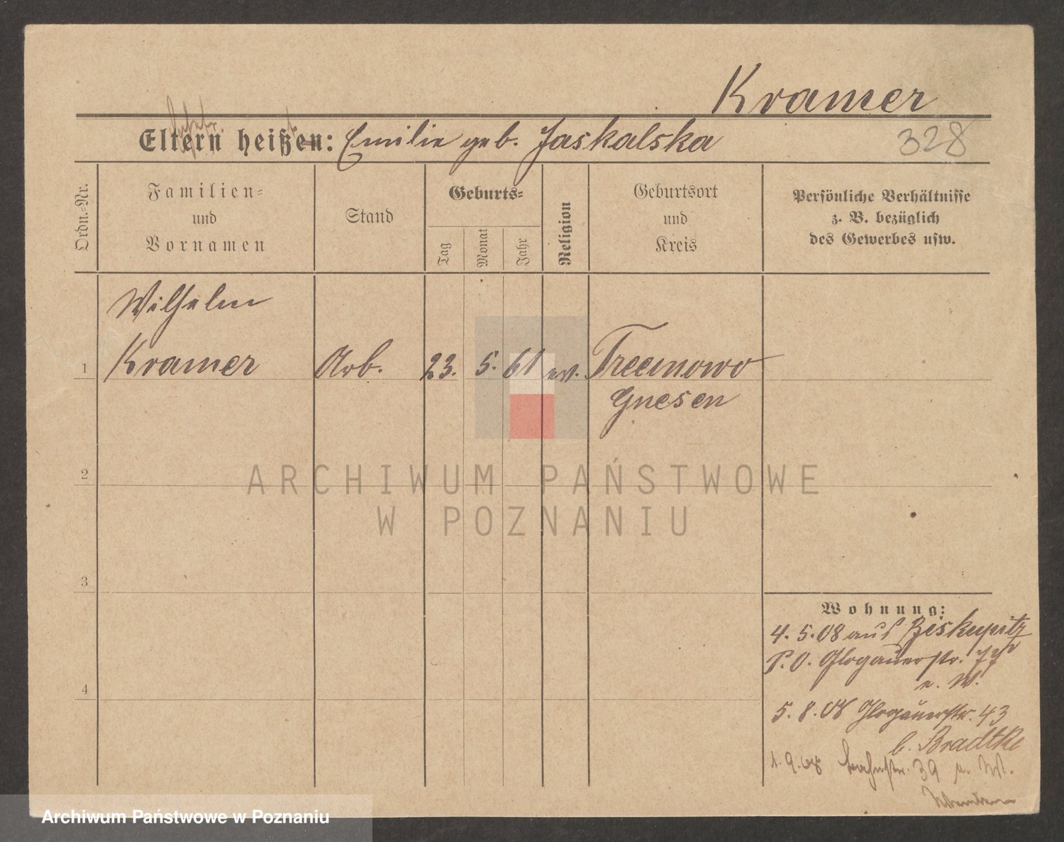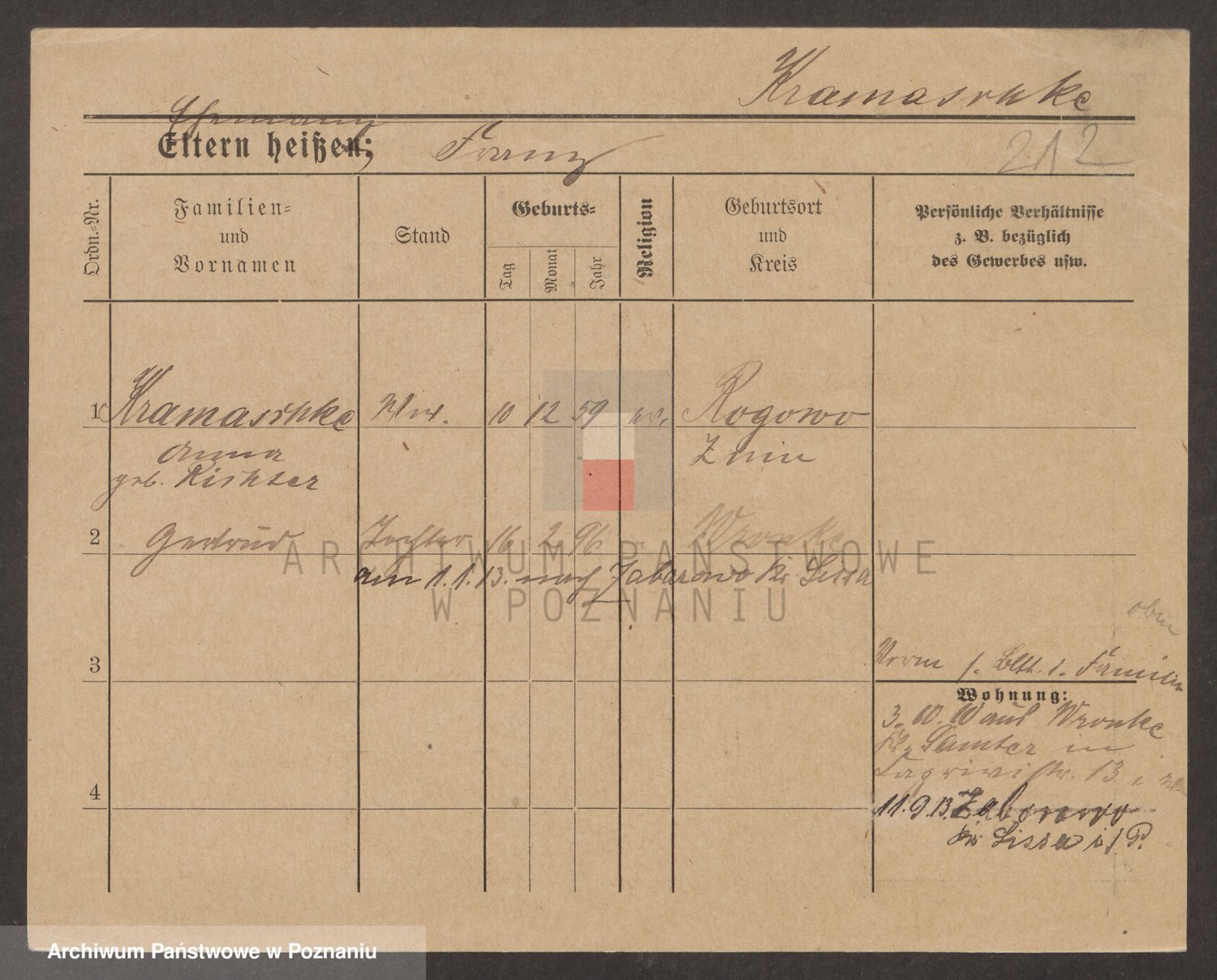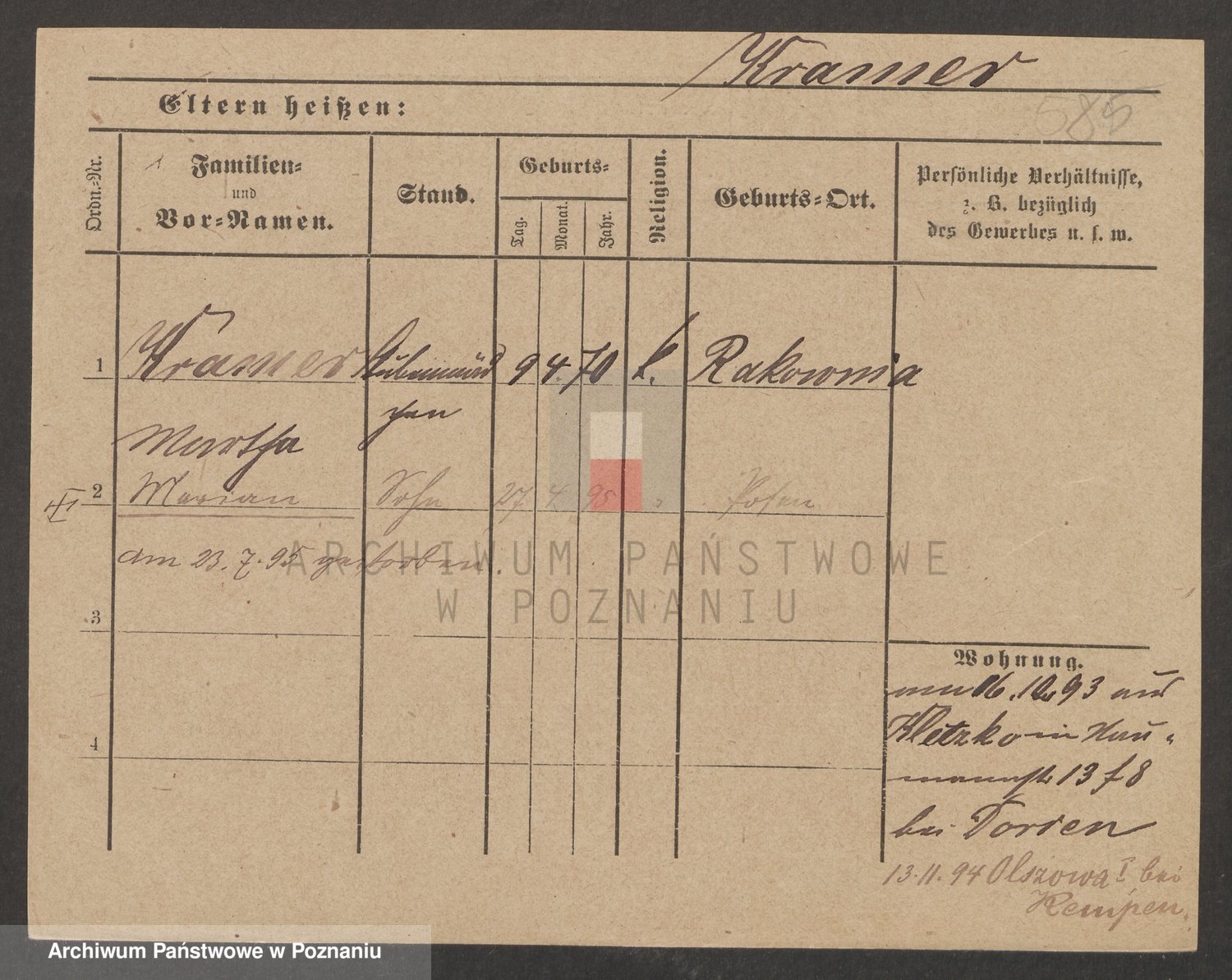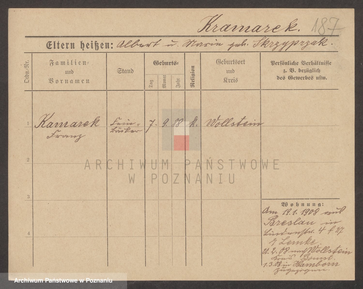 Podgląd karty osobowej dostępny jest po kliknięciu na nazwisko lub ikonkę karty. Można dokonywać powiększenia (ikony na górze) lub przechodzić między kolejnymi skanami (strzałki po bokach).