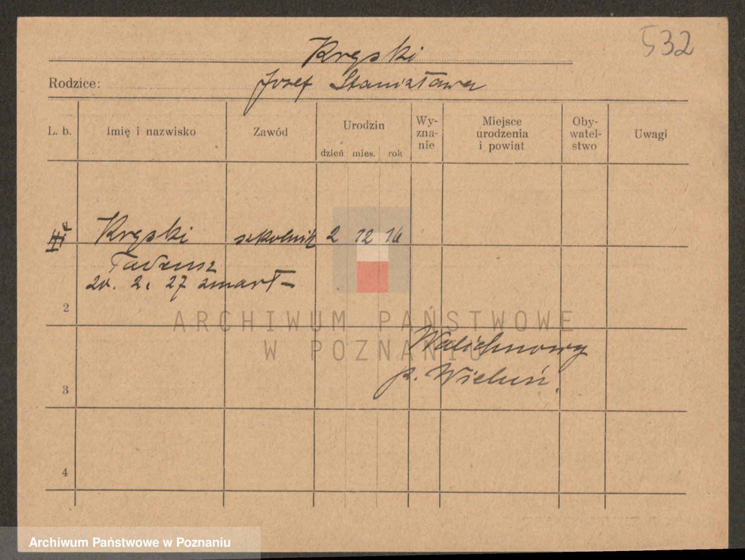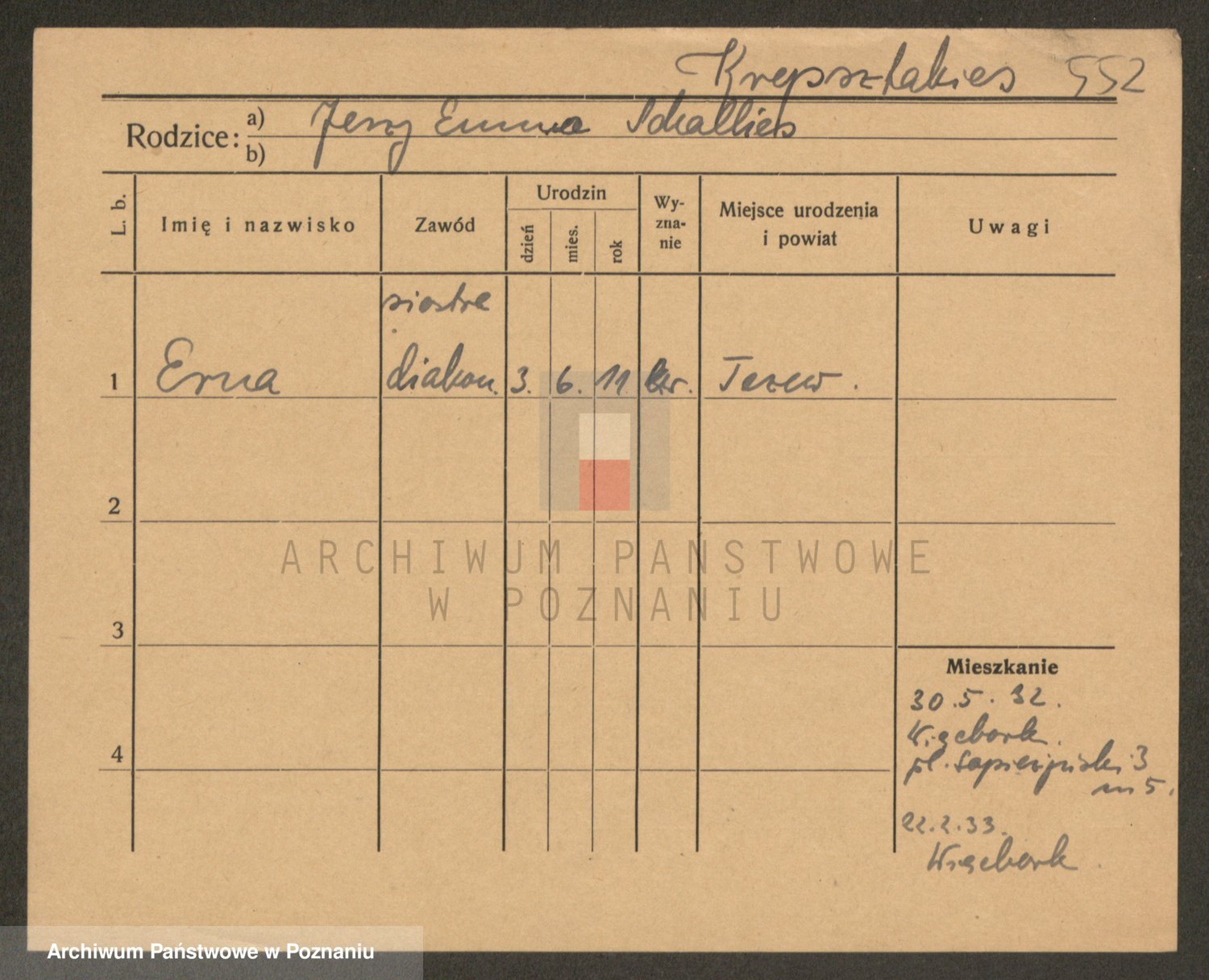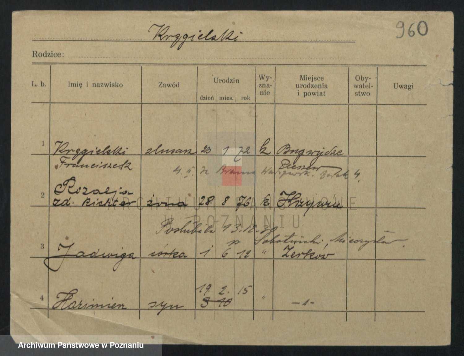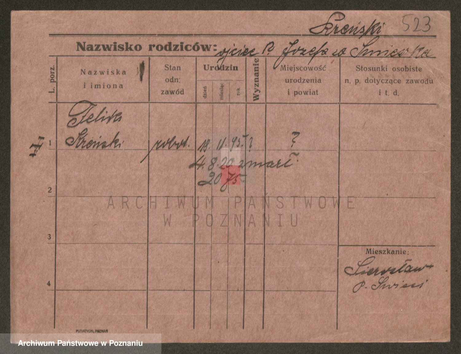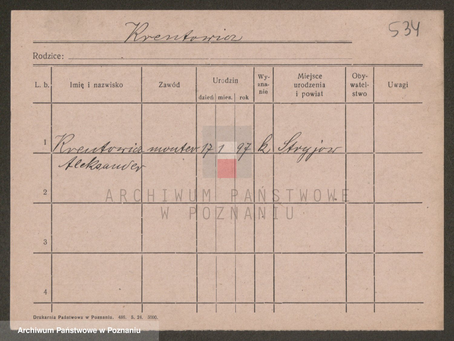 Podgląd karty osobowej dostępny jest po kliknięciu na nazwisko lub ikonkę karty. Można dokonywać powiększenia (ikony na górze) lub przechodzić między kolejnymi skanami (strzałki po bokach).