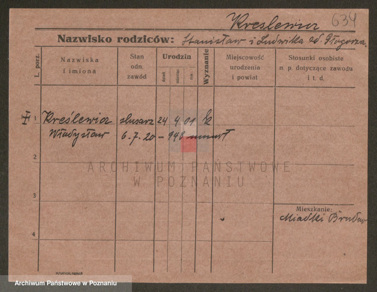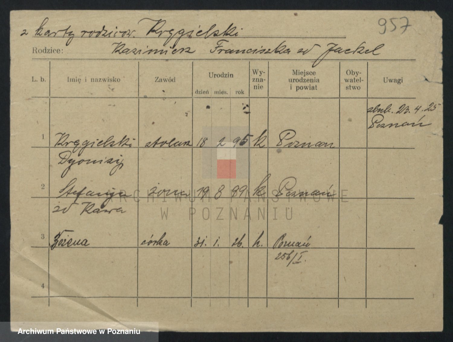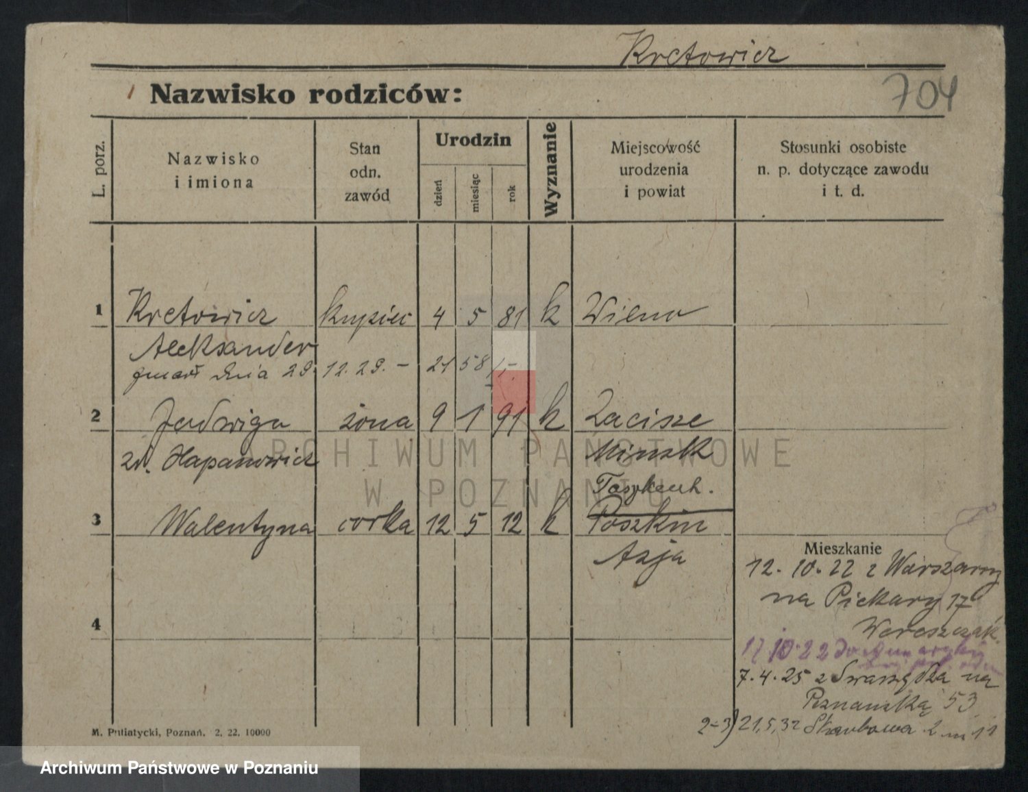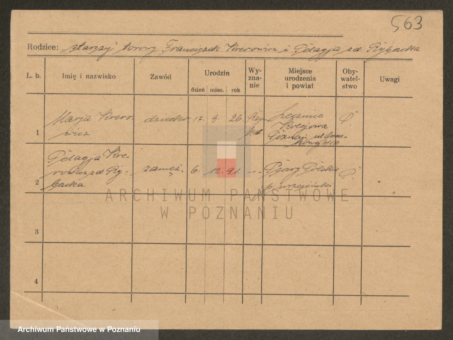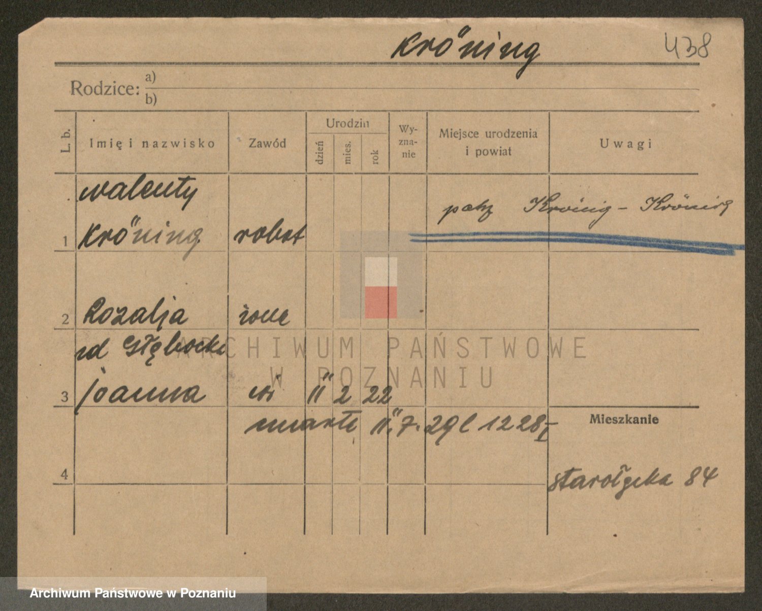 Podgląd karty osobowej dostępny jest po kliknięciu na nazwisko lub ikonkę karty. Można dokonywać powiększenia (ikony na górze) lub przechodzić między kolejnymi skanami (strzałki po bokach).
