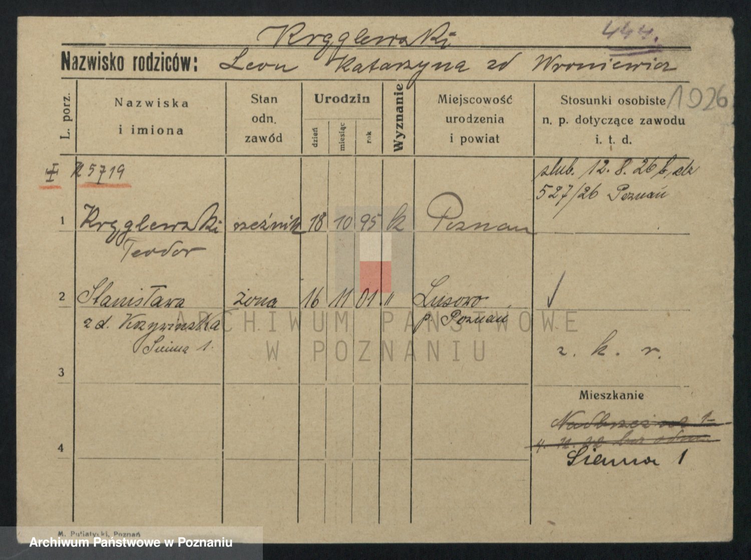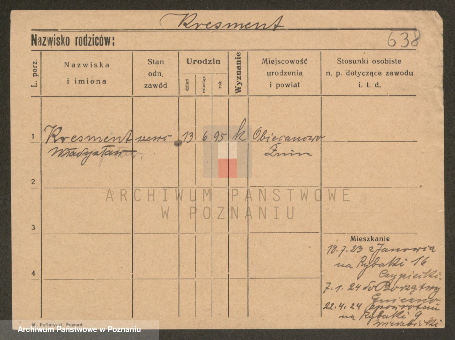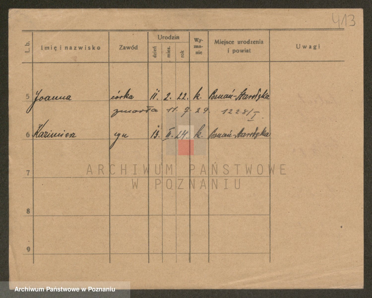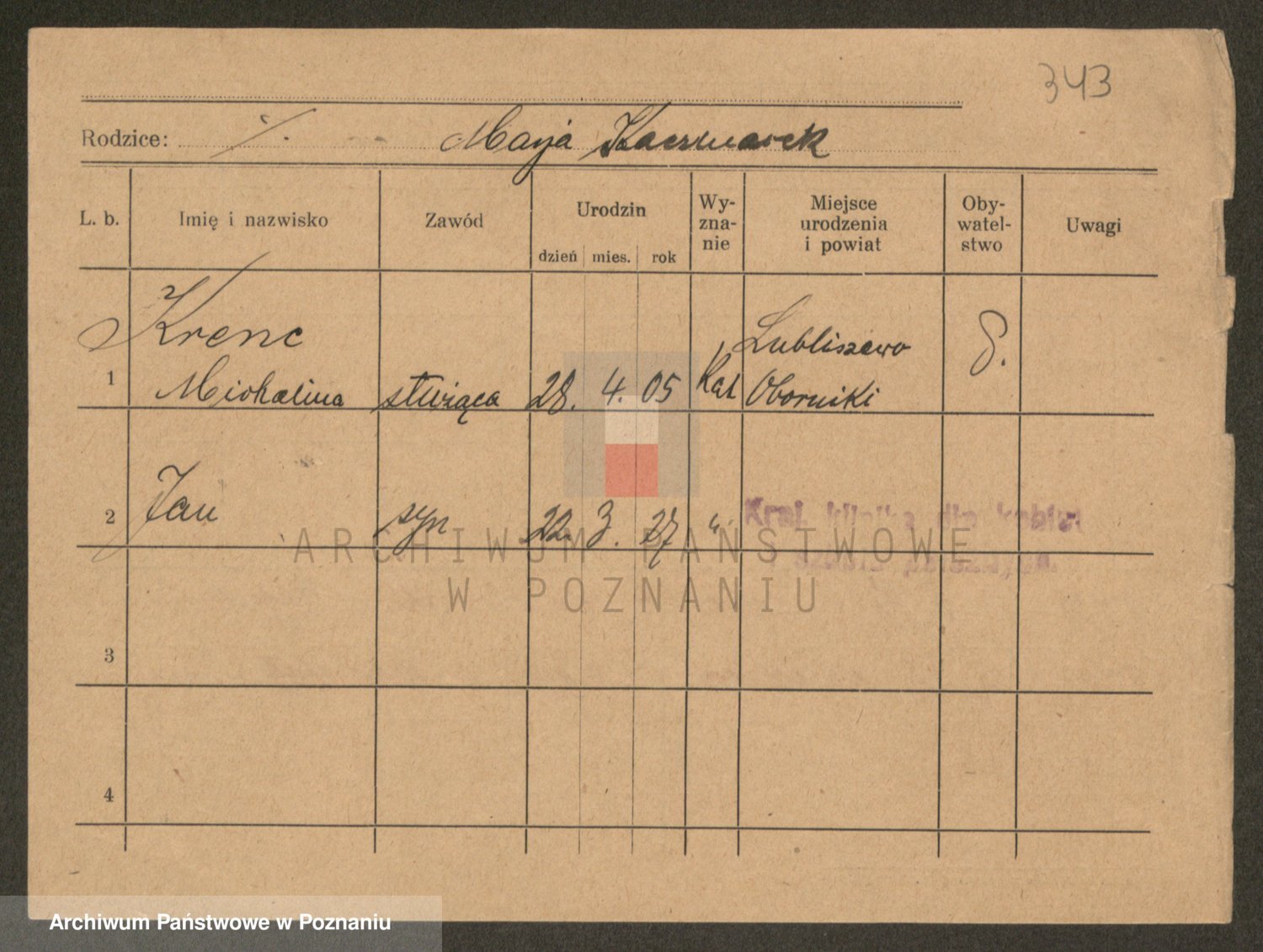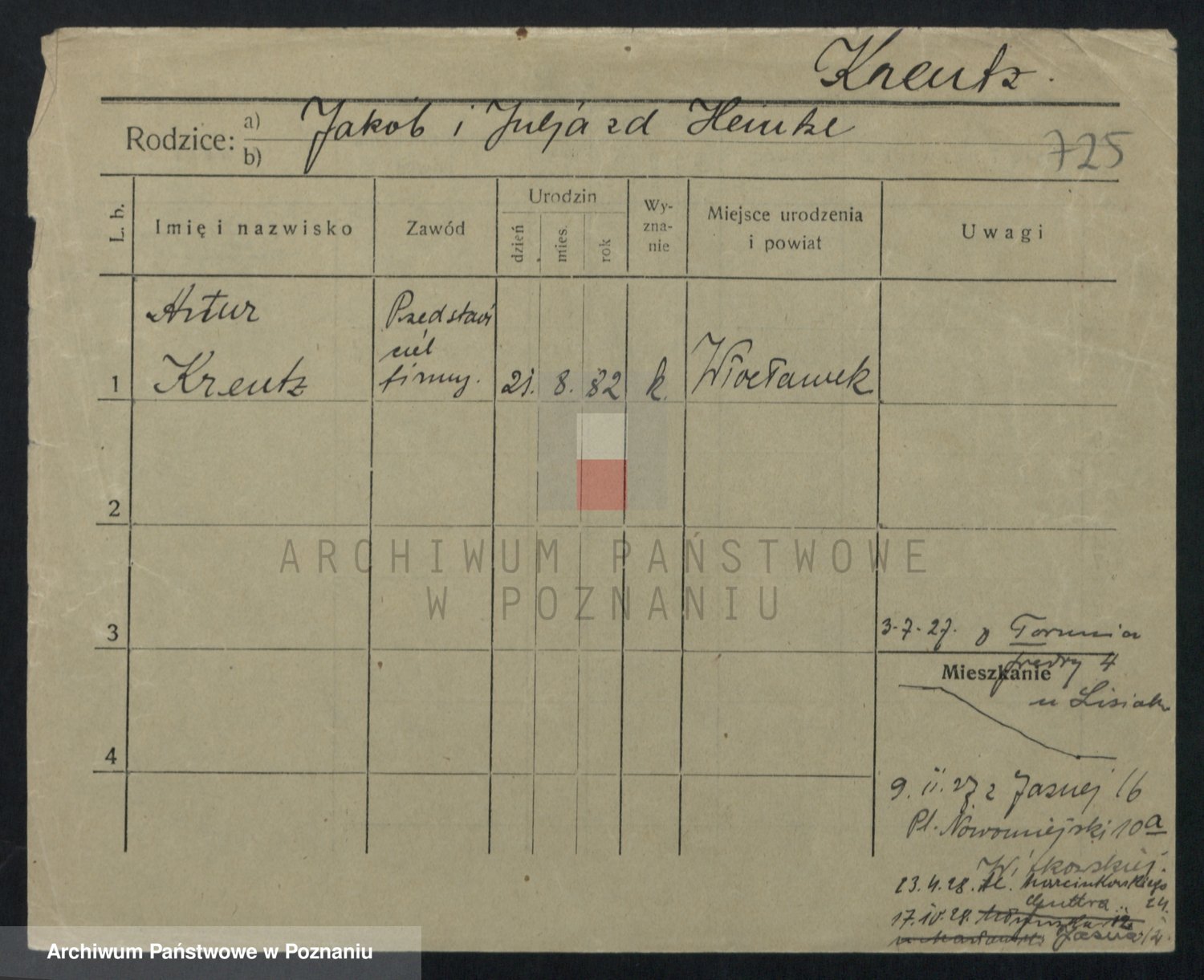 Podgląd karty osobowej dostępny jest po kliknięciu na nazwisko lub ikonkę karty. Można dokonywać powiększenia (ikony na górze) lub przechodzić między kolejnymi skanami (strzałki po bokach).