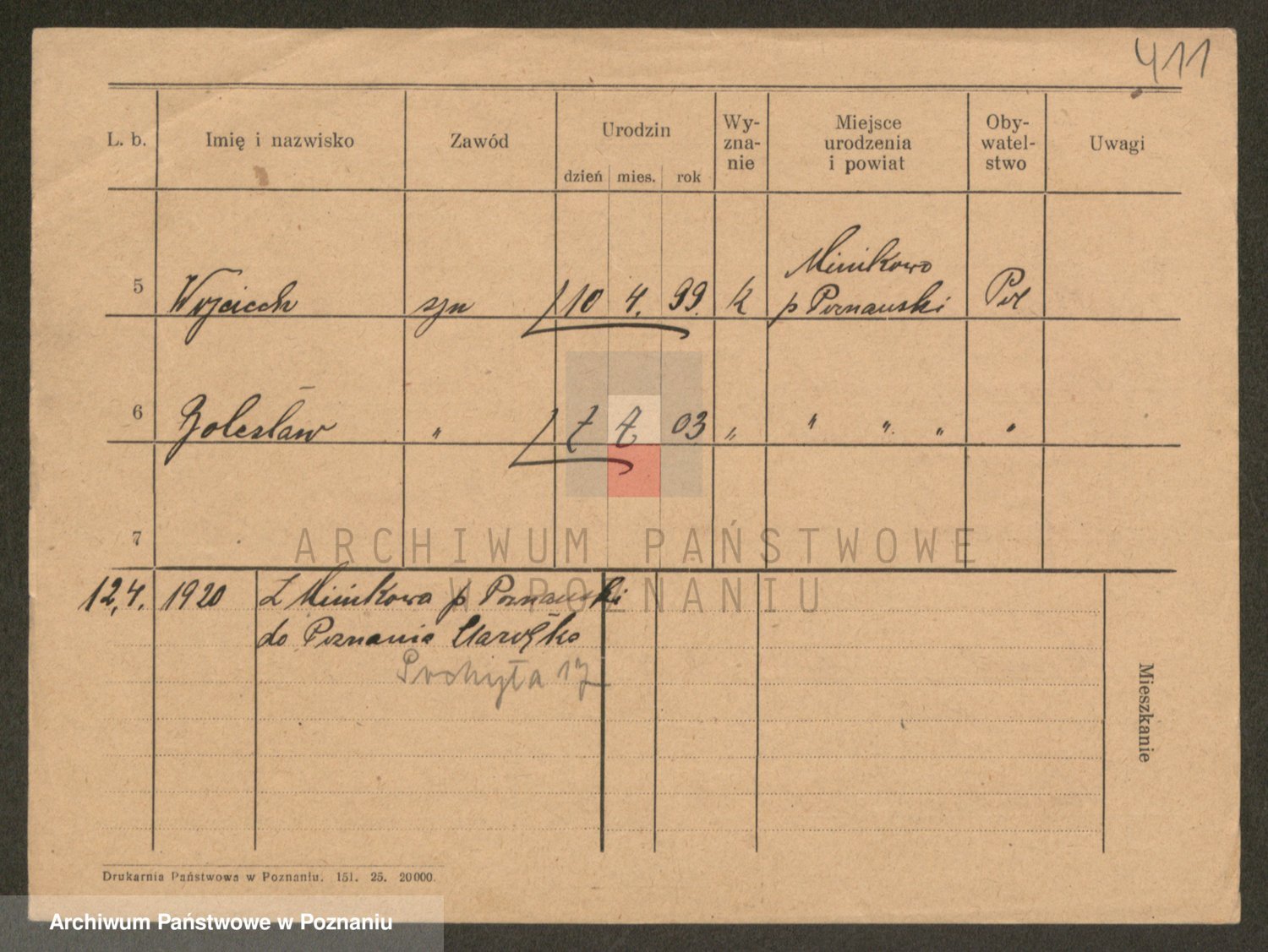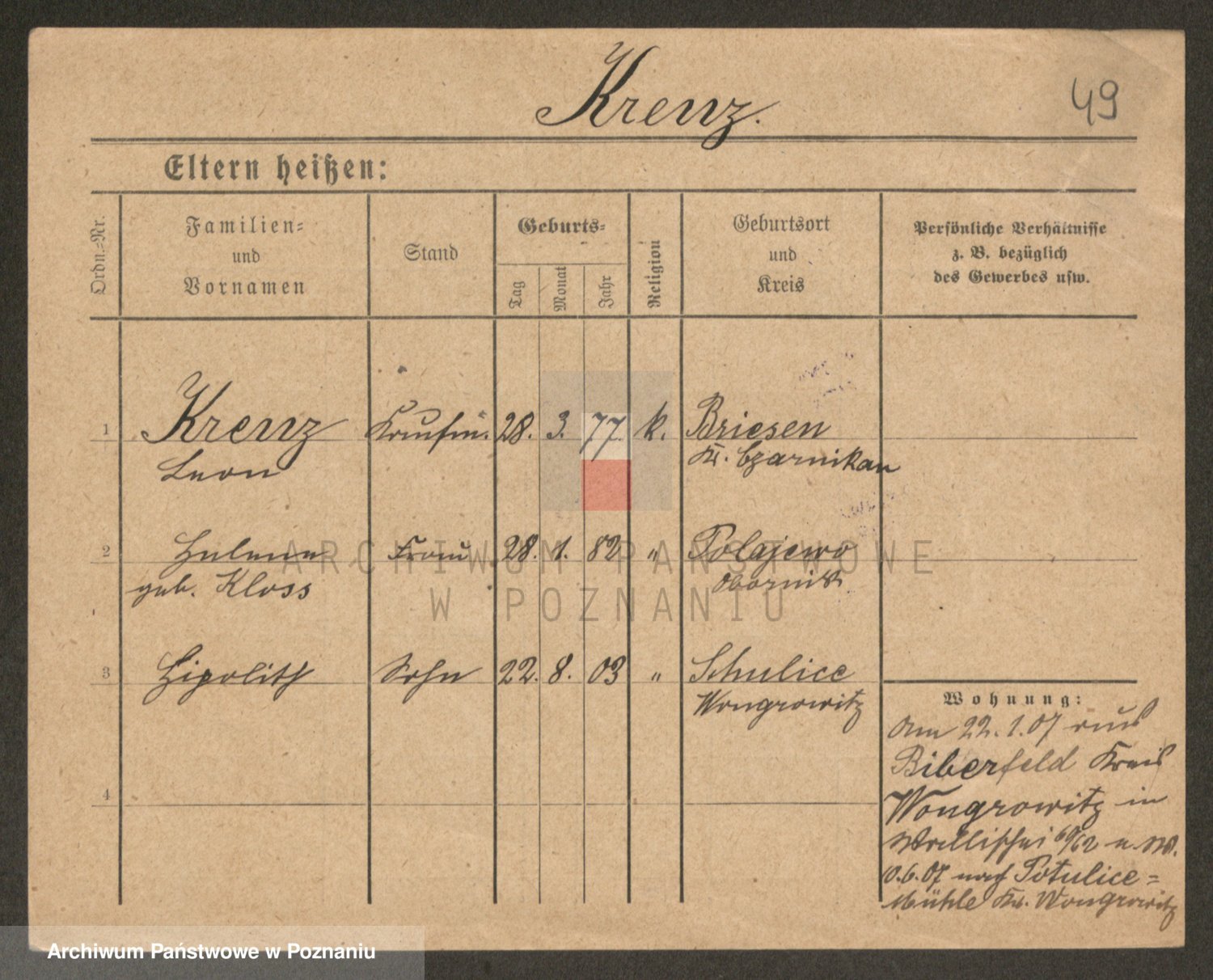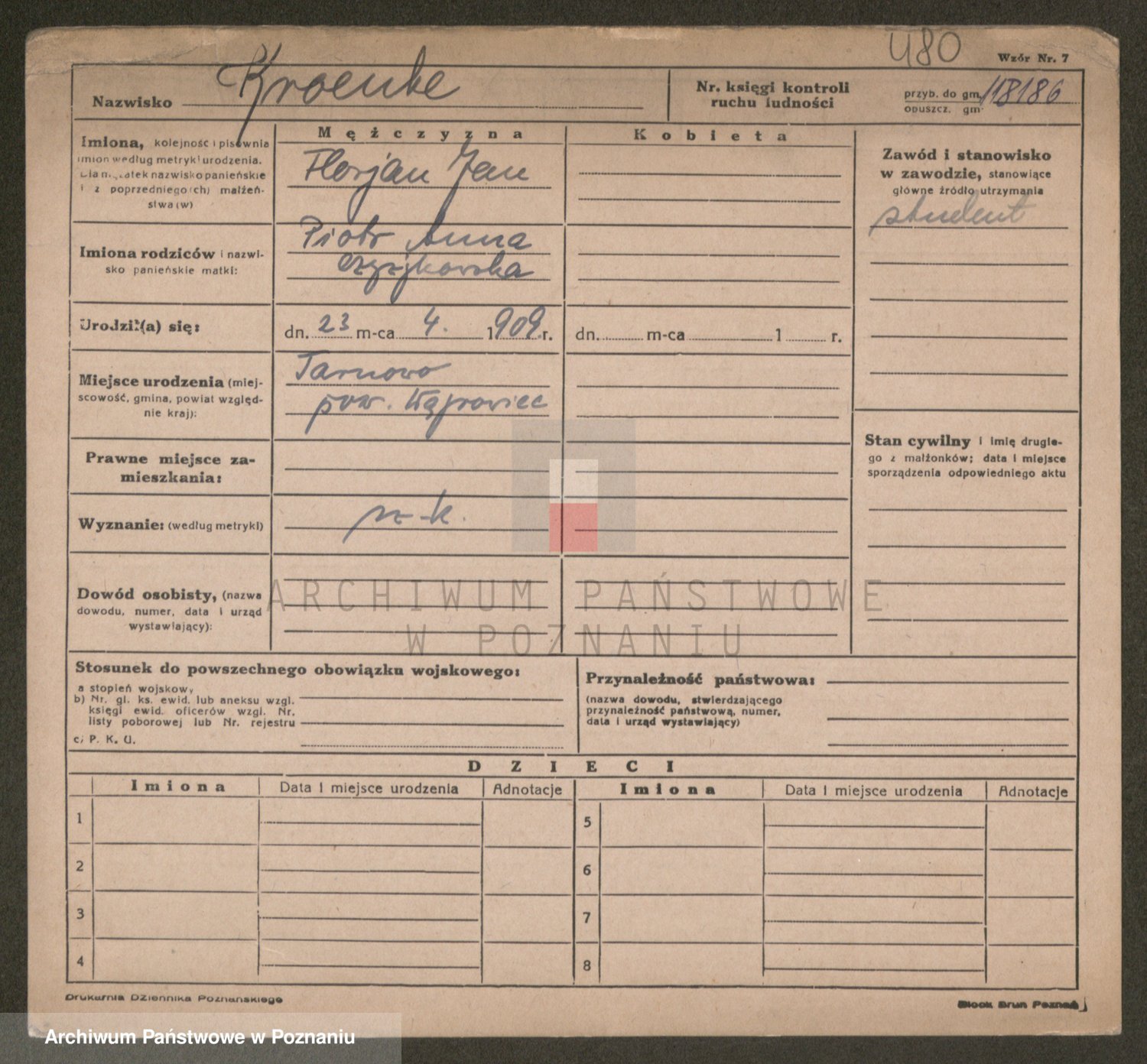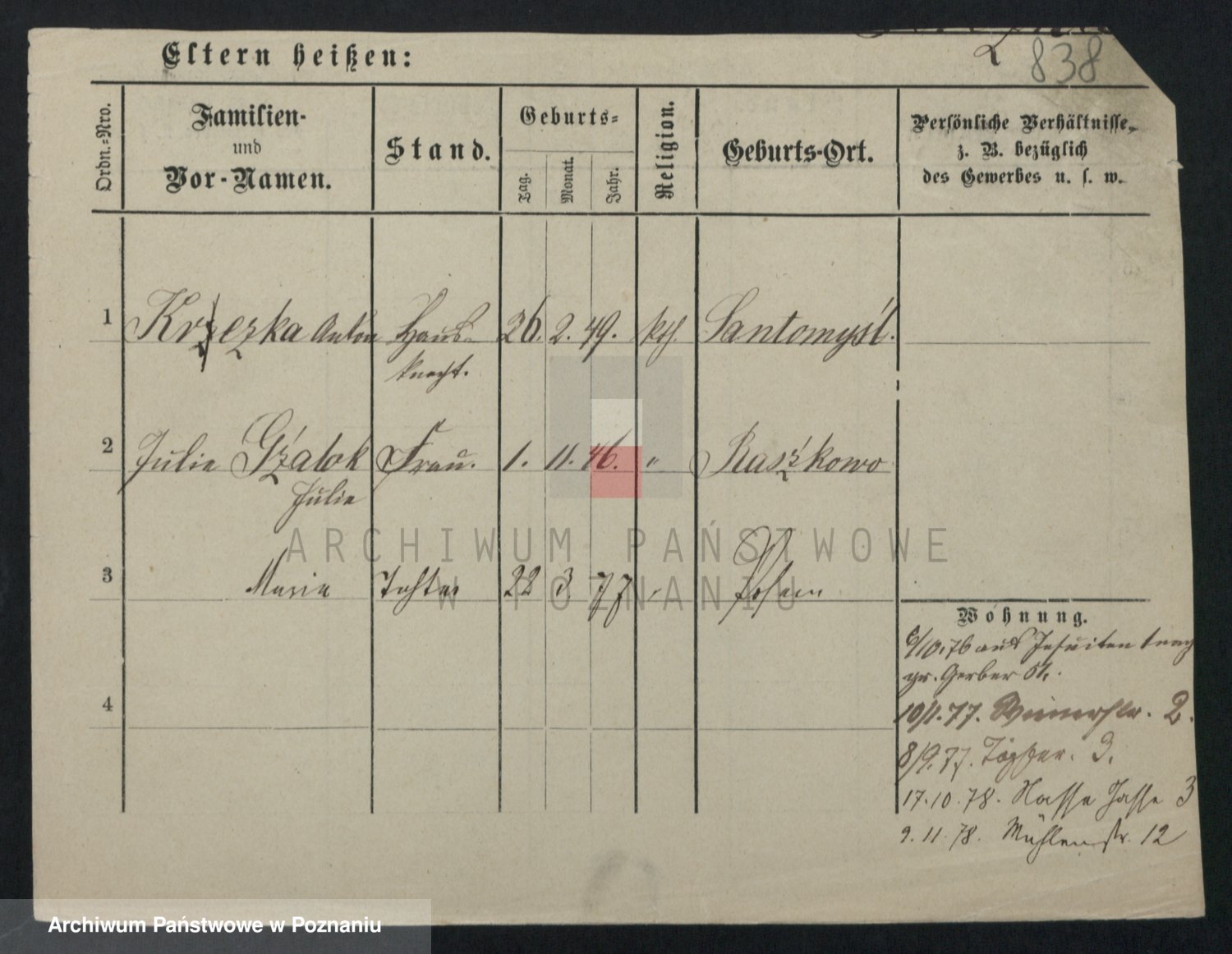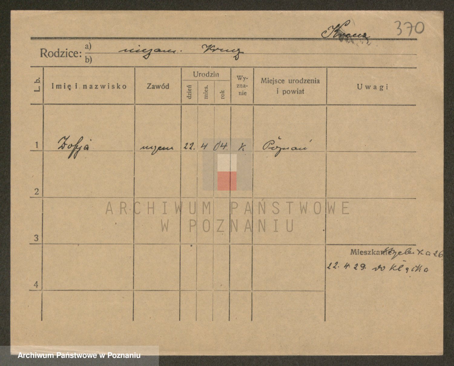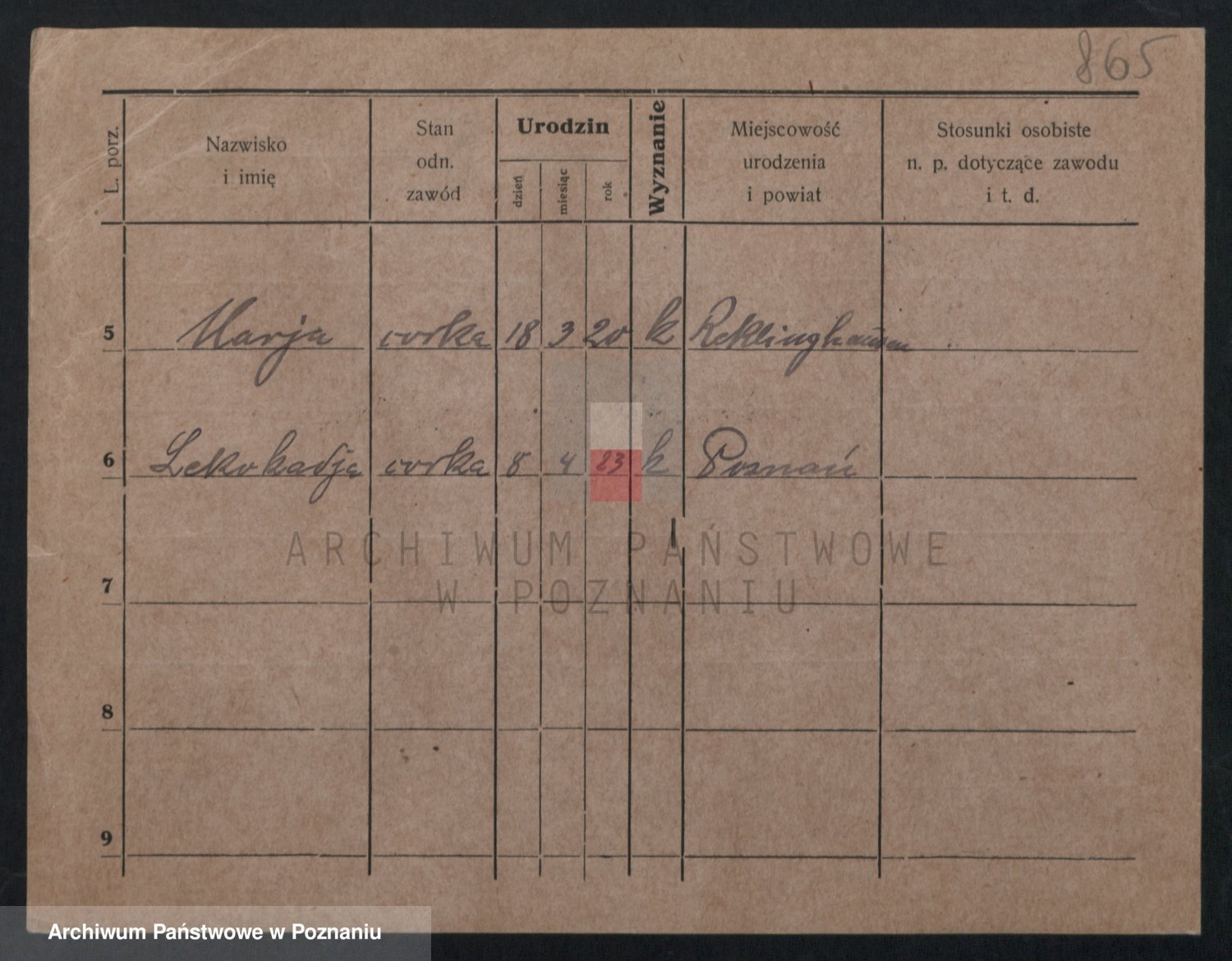 Podgląd karty osobowej dostępny jest po kliknięciu na nazwisko lub ikonkę karty. Można dokonywać powiększenia (ikony na górze) lub przechodzić między kolejnymi skanami (strzałki po bokach).