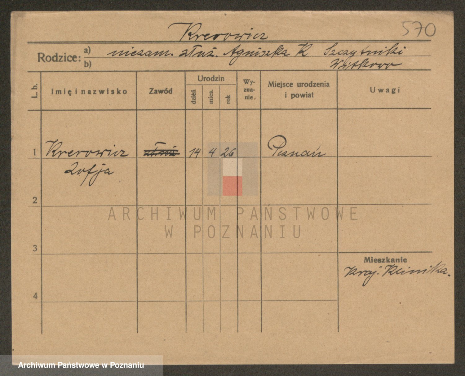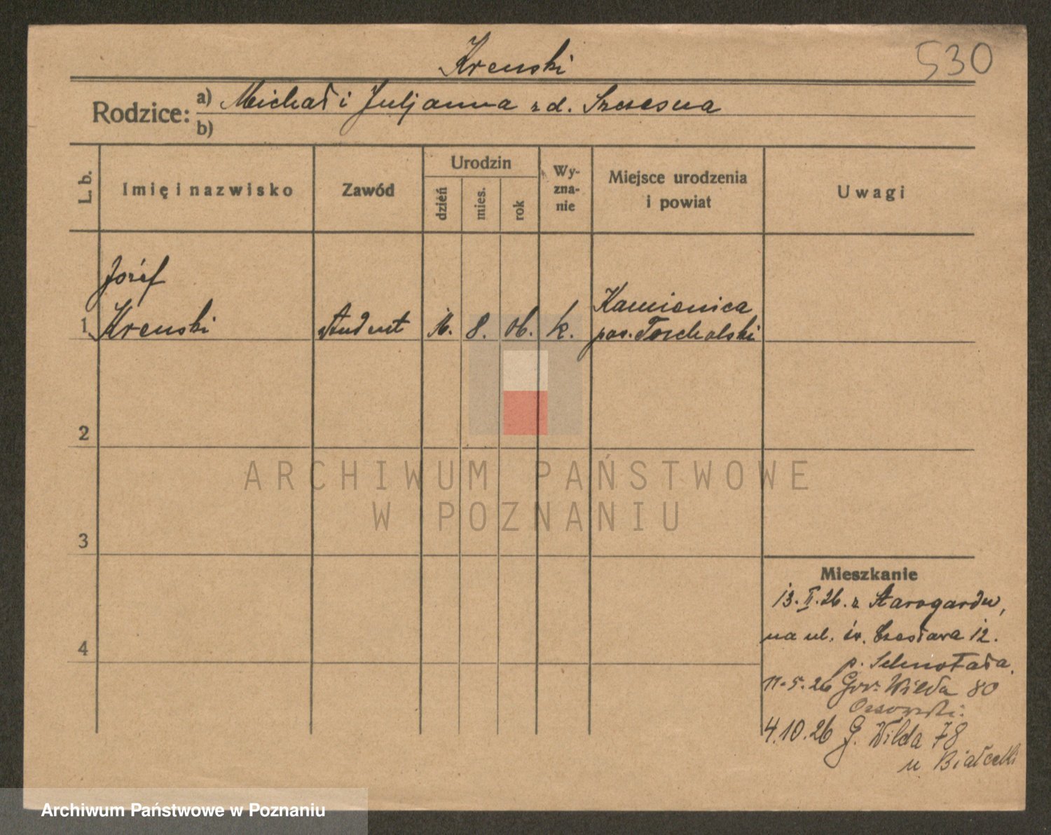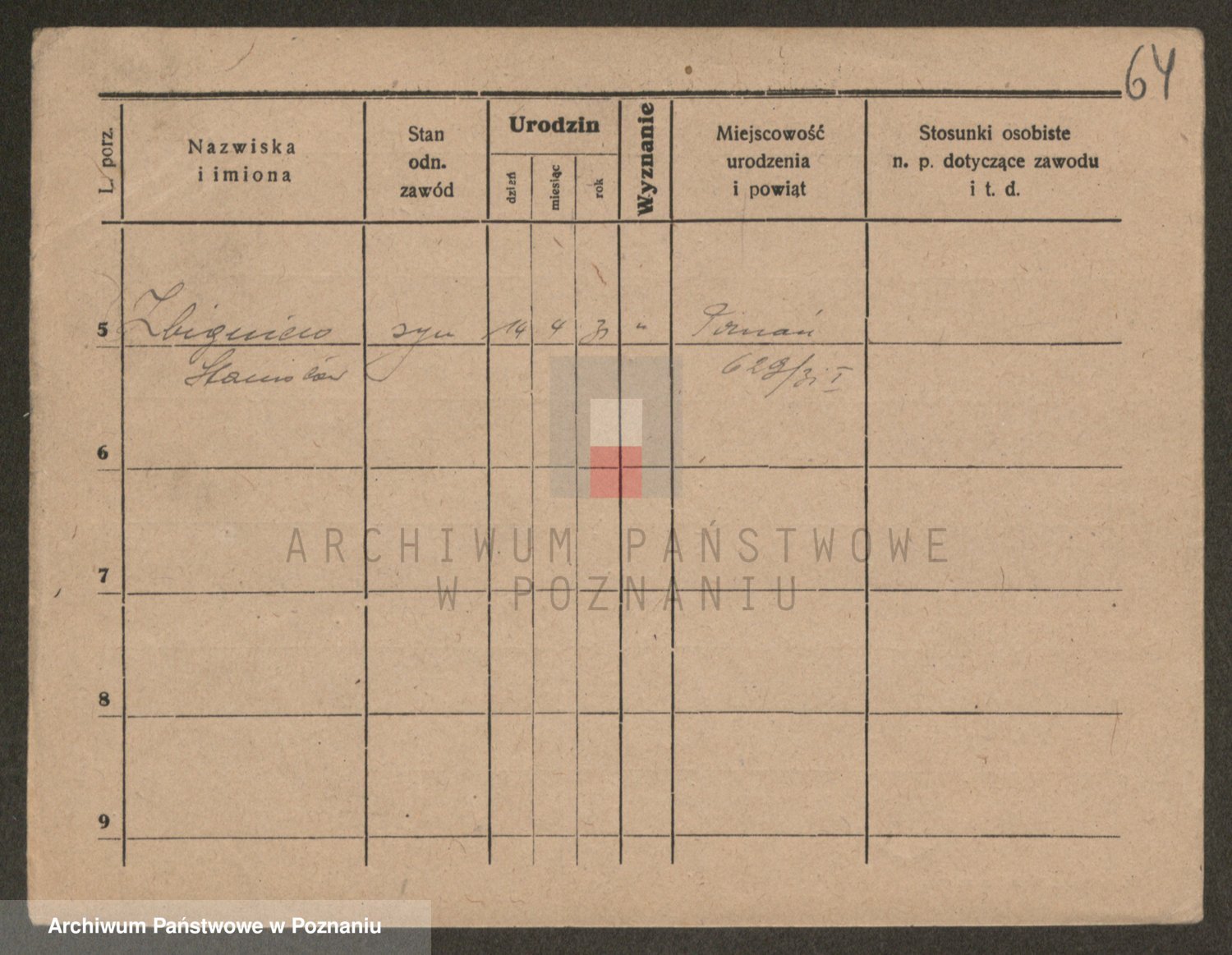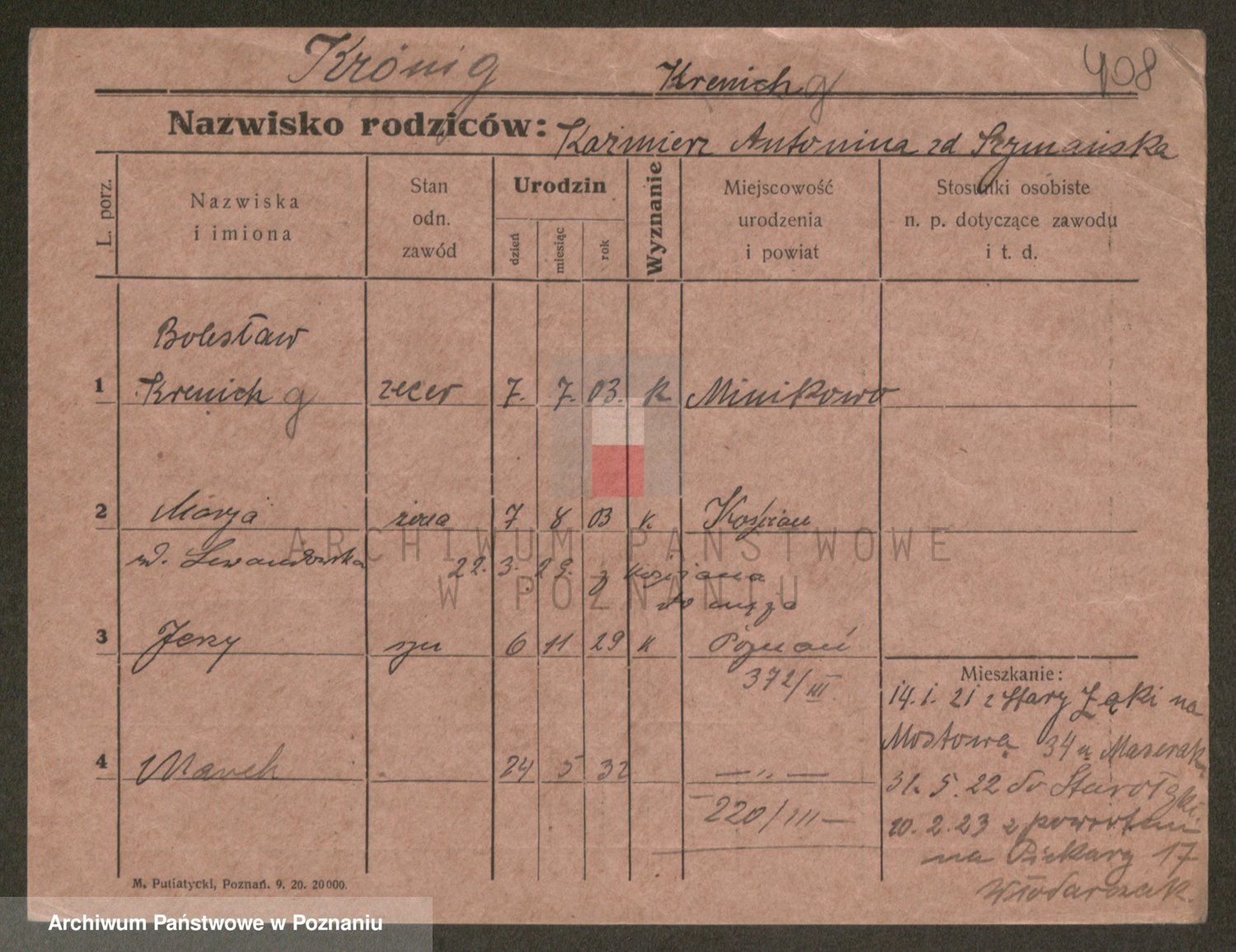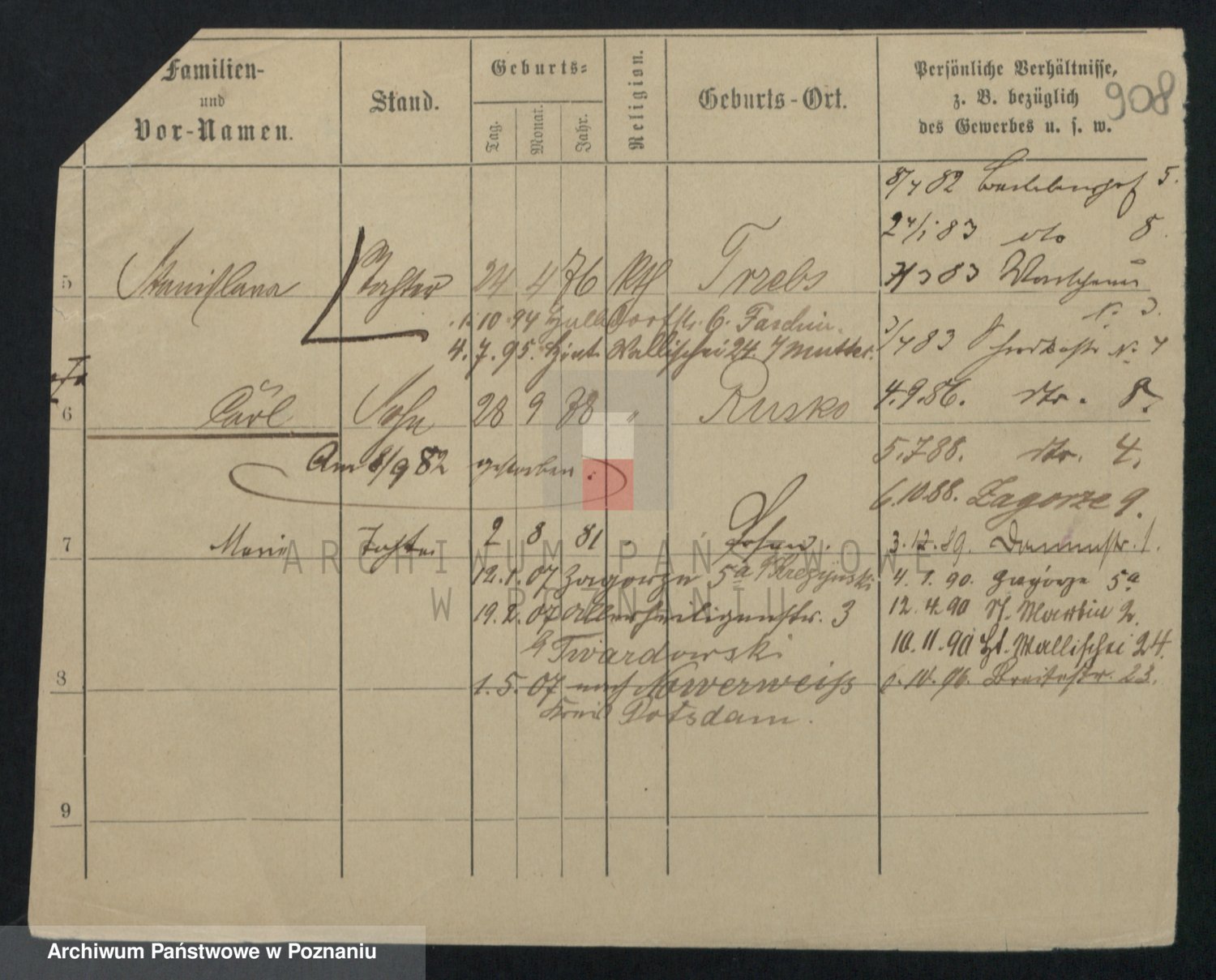 Podgląd karty osobowej dostępny jest po kliknięciu na nazwisko lub ikonkę karty. Można dokonywać powiększenia (ikony na górze) lub przechodzić między kolejnymi skanami (strzałki po bokach).