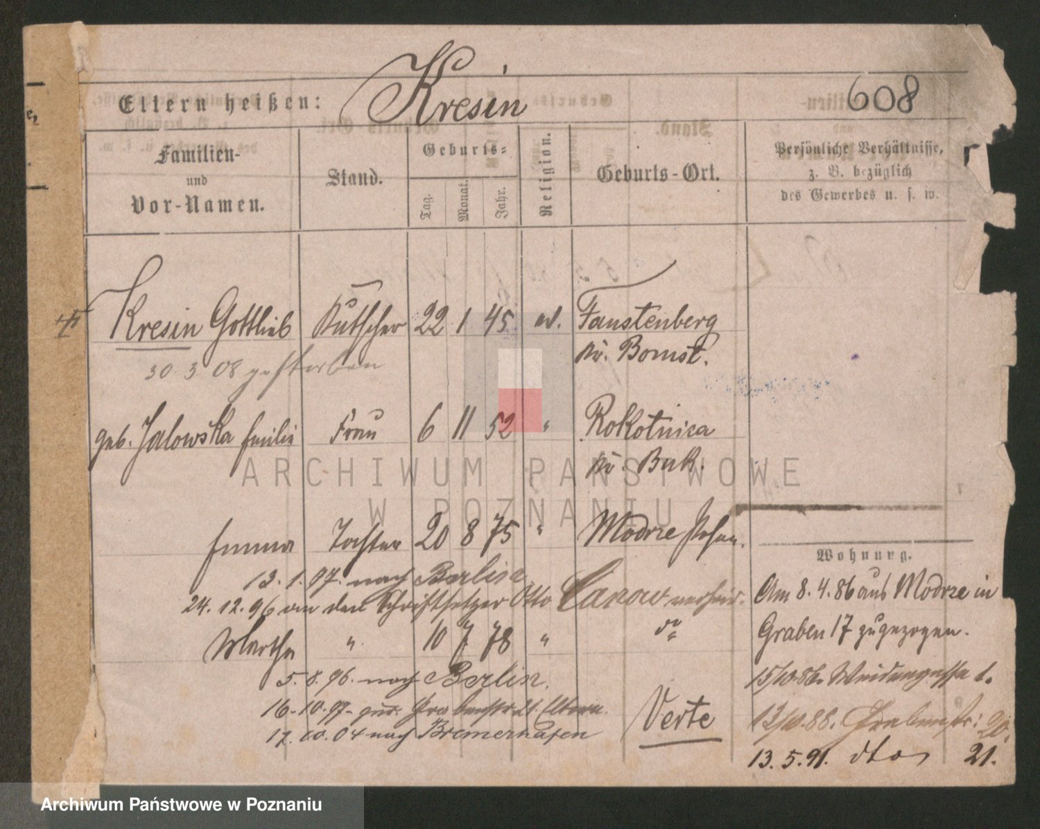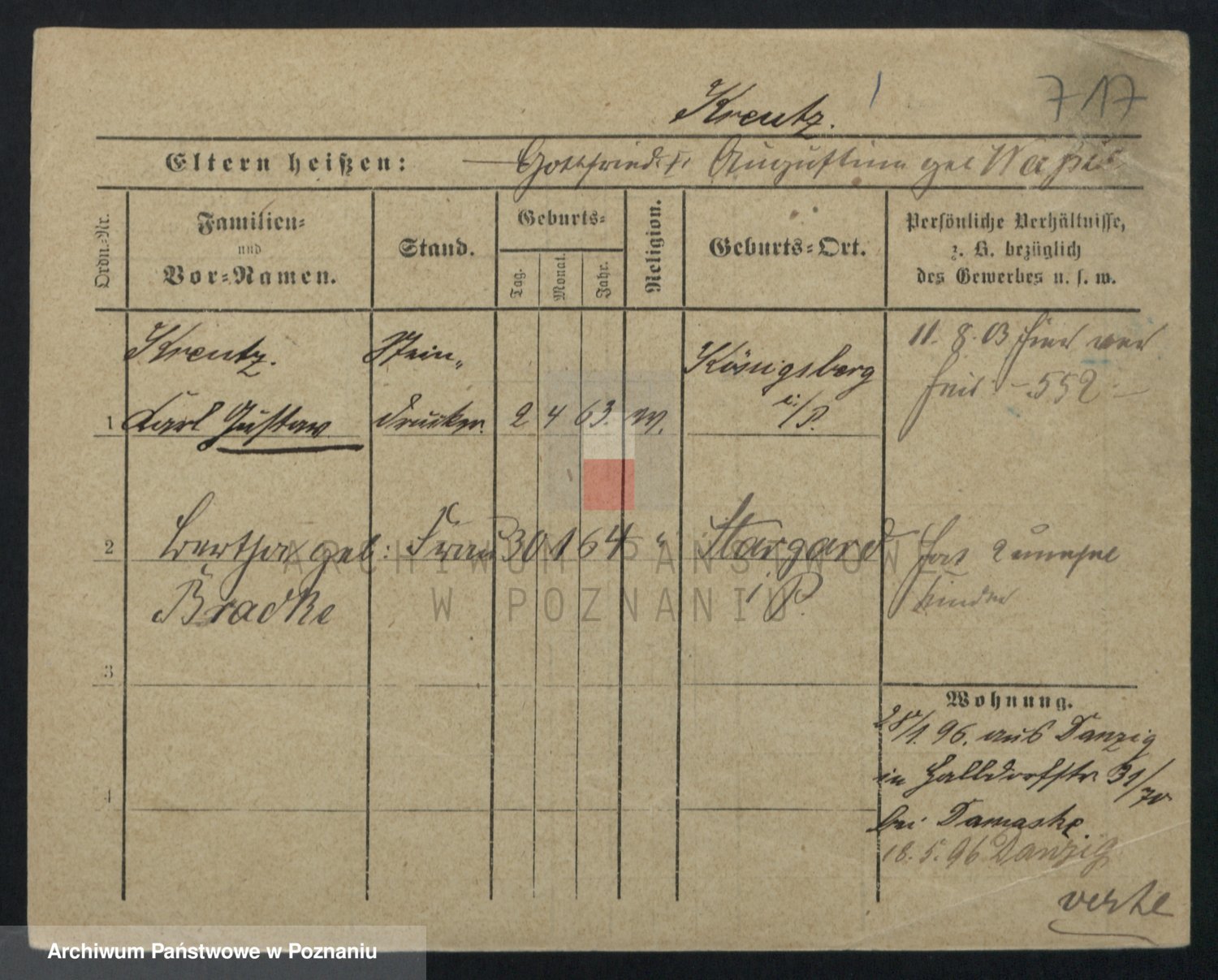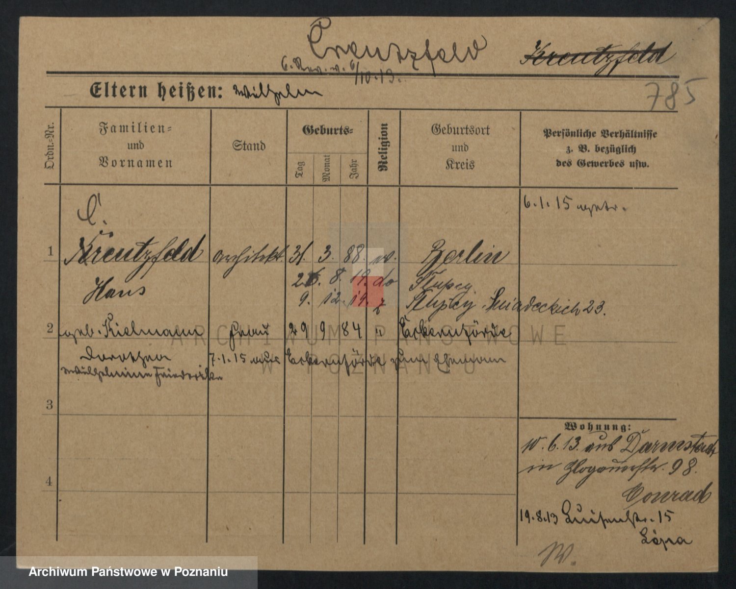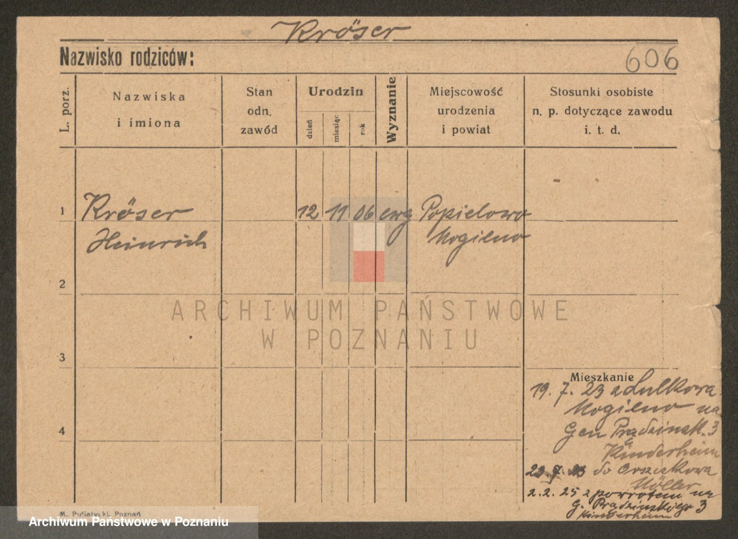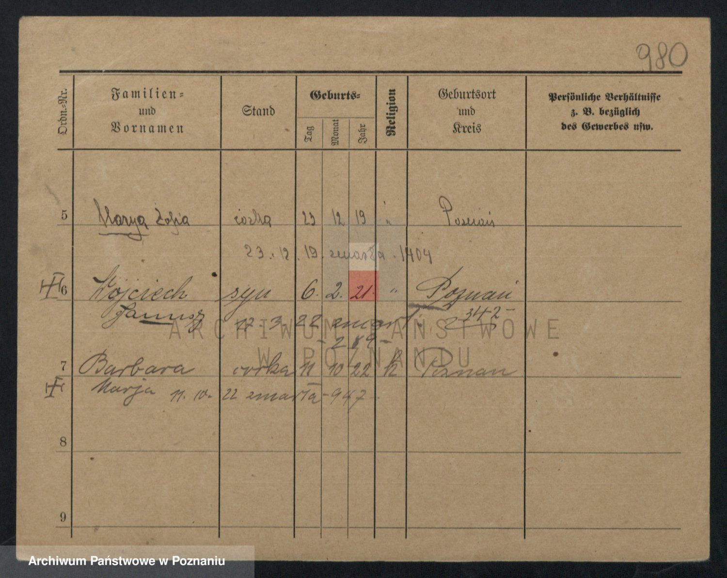 Podgląd karty osobowej dostępny jest po kliknięciu na nazwisko lub ikonkę karty. Można dokonywać powiększenia (ikony na górze) lub przechodzić między kolejnymi skanami (strzałki po bokach).