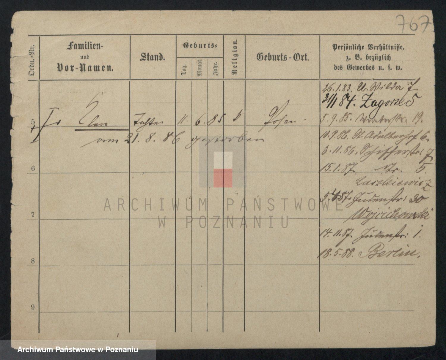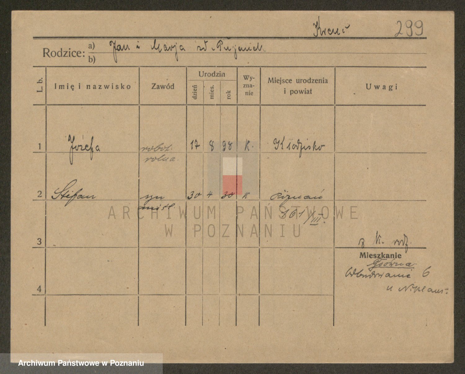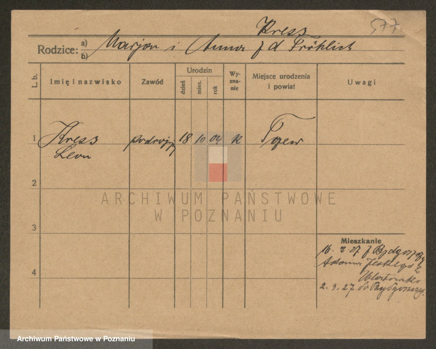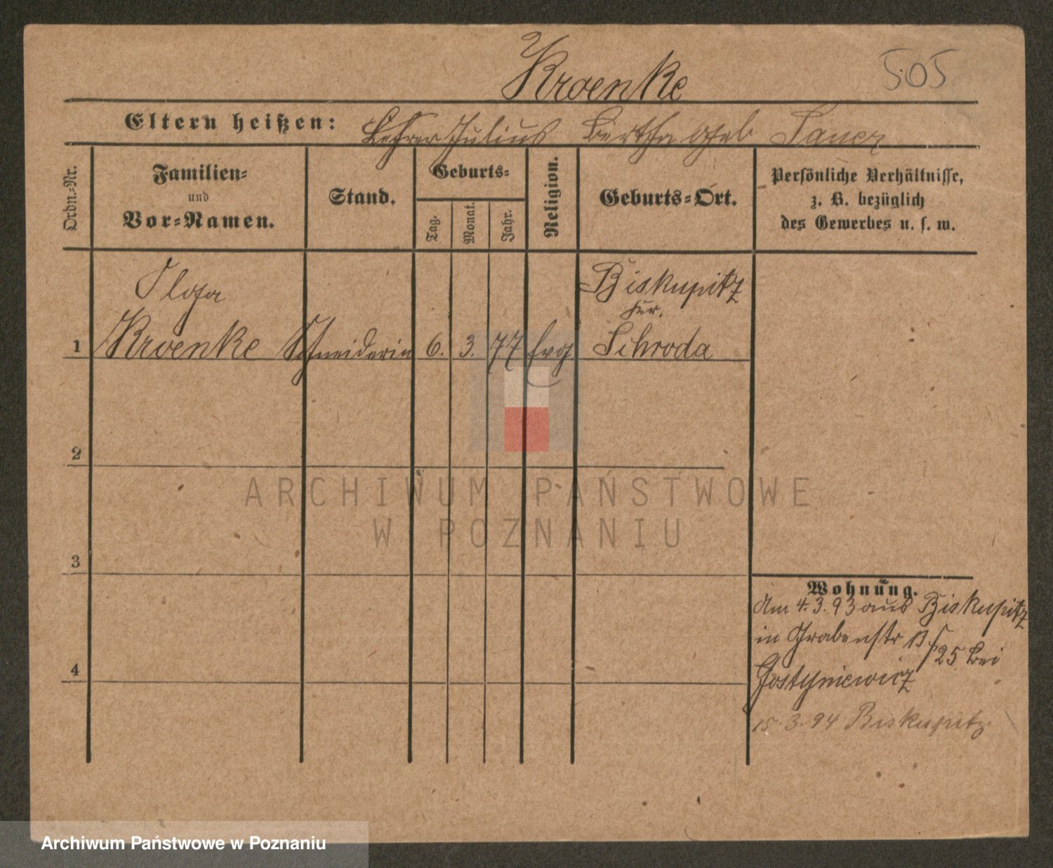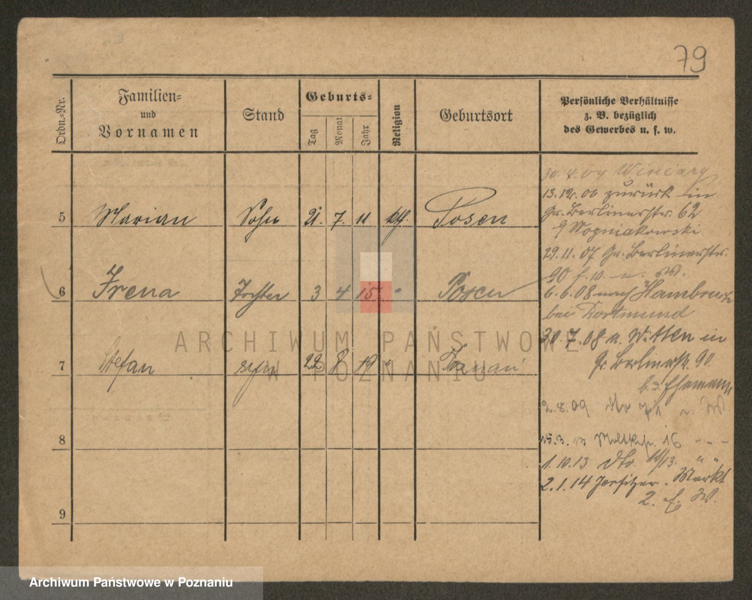 Podgląd karty osobowej dostępny jest po kliknięciu na nazwisko lub ikonkę karty. Można dokonywać powiększenia (ikony na górze) lub przechodzić między kolejnymi skanami (strzałki po bokach).