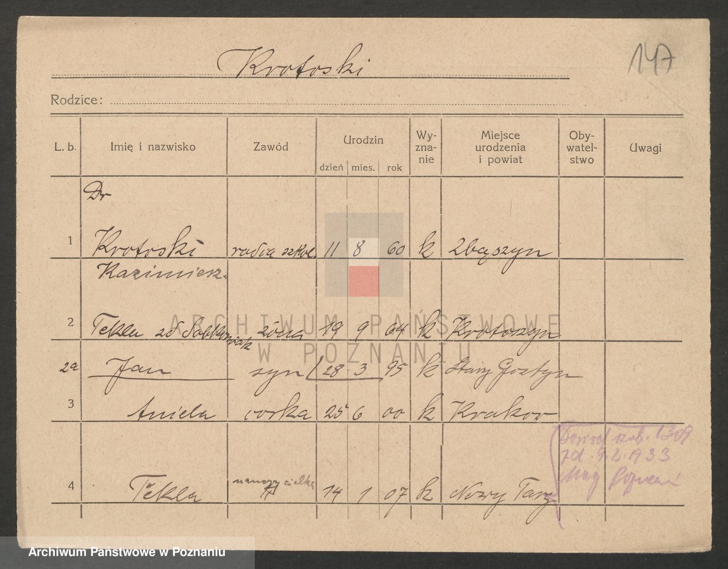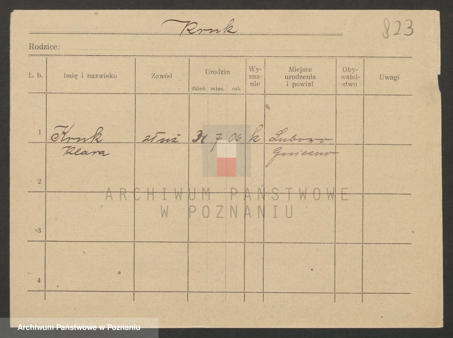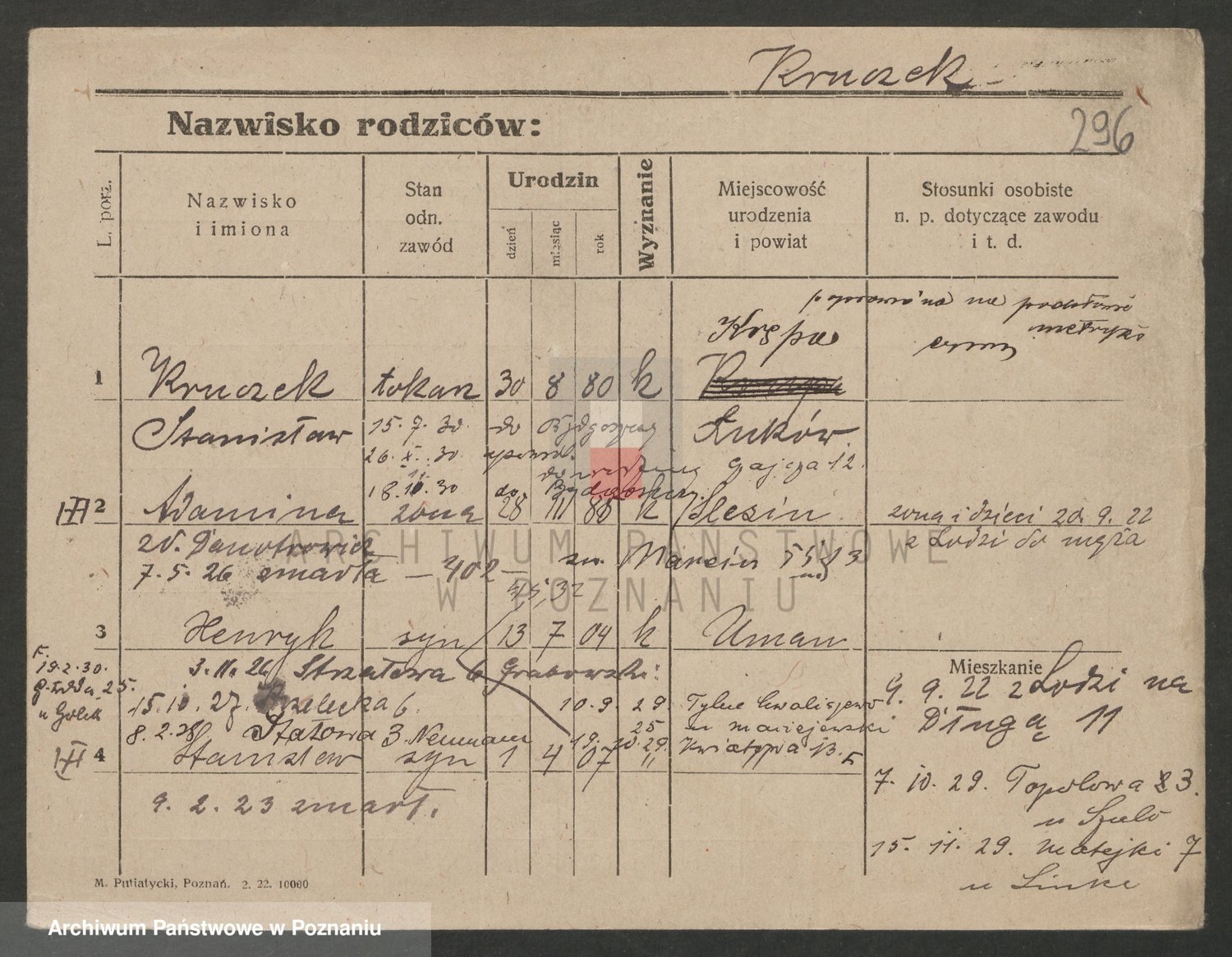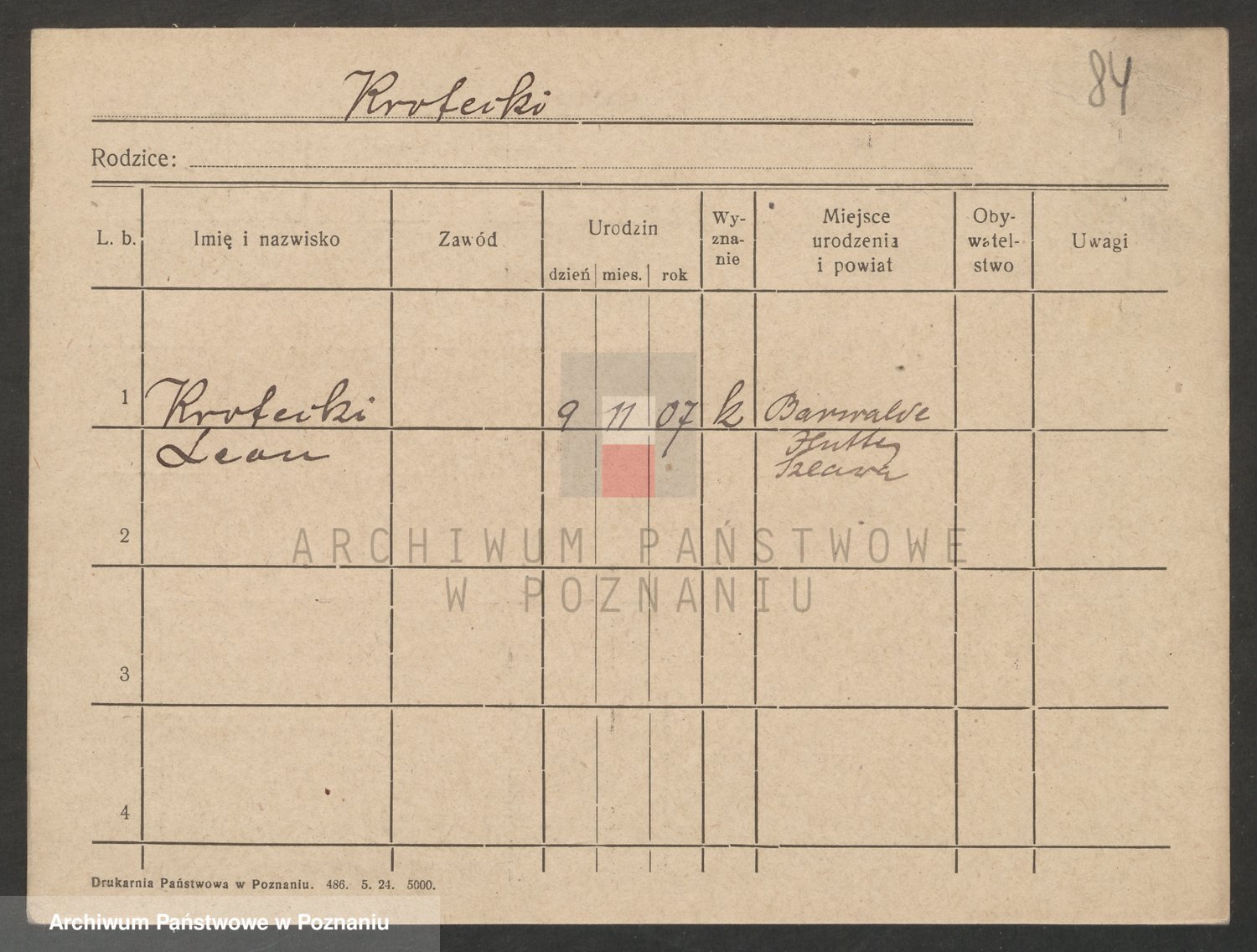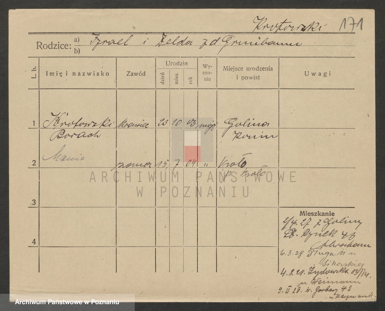 Podgląd karty osobowej dostępny jest po kliknięciu na nazwisko lub ikonkę karty. Można dokonywać powiększenia (ikony na górze) lub przechodzić między kolejnymi skanami (strzałki po bokach).