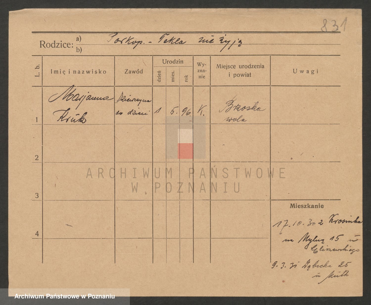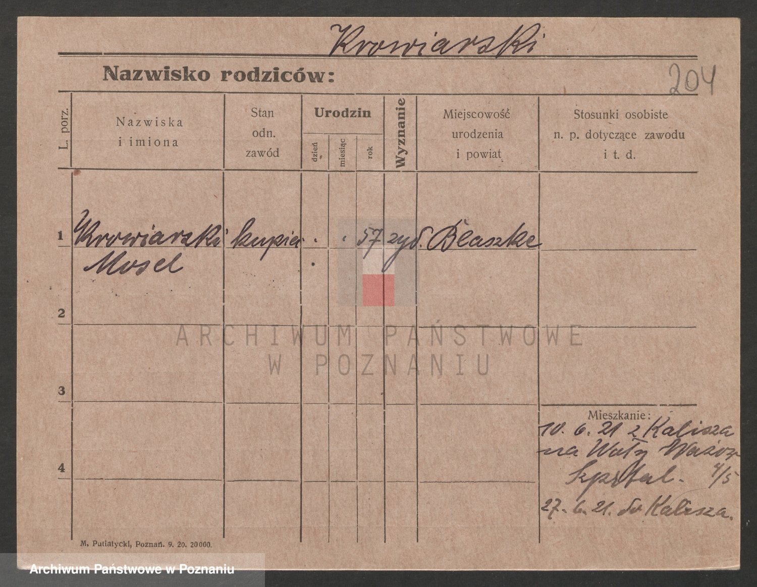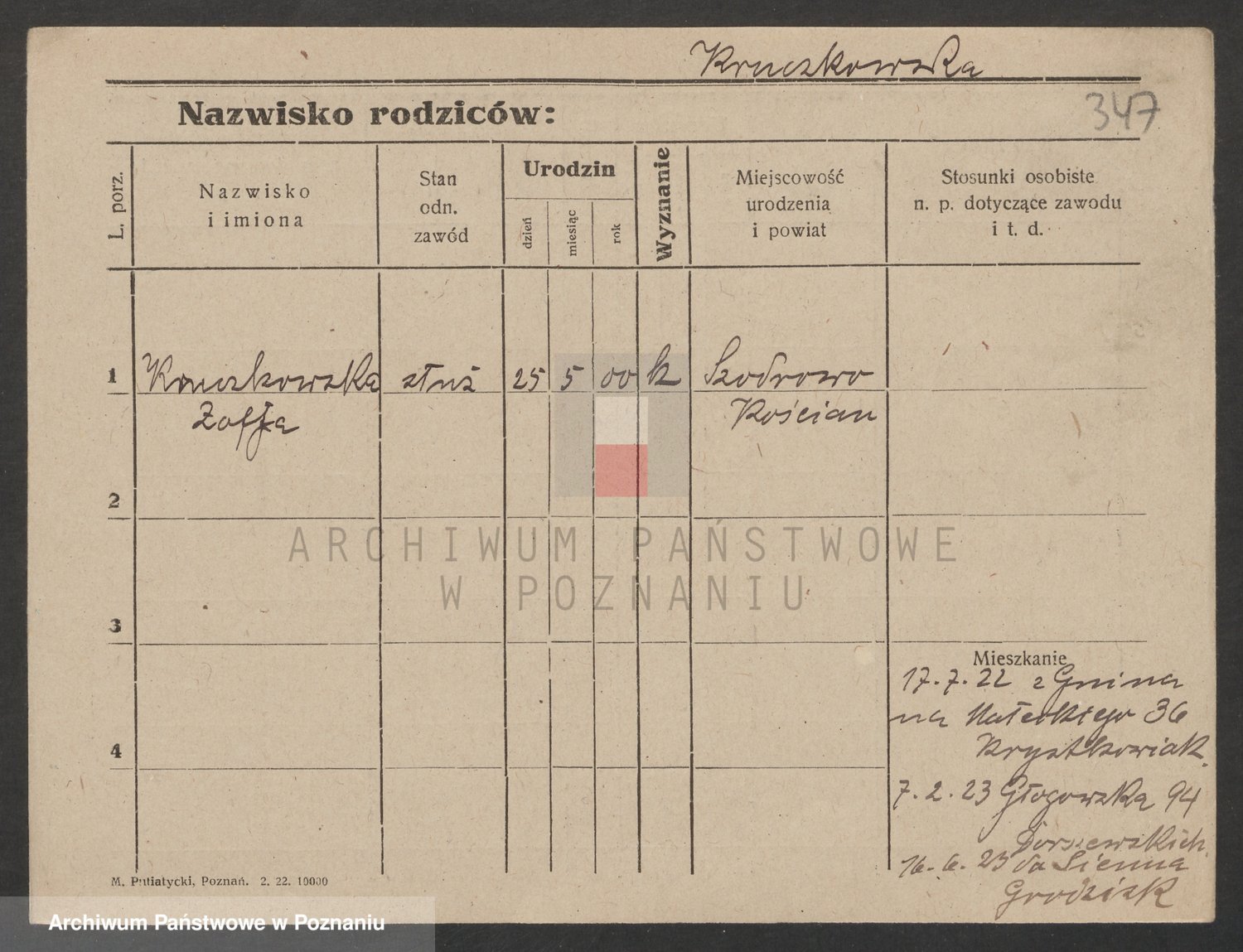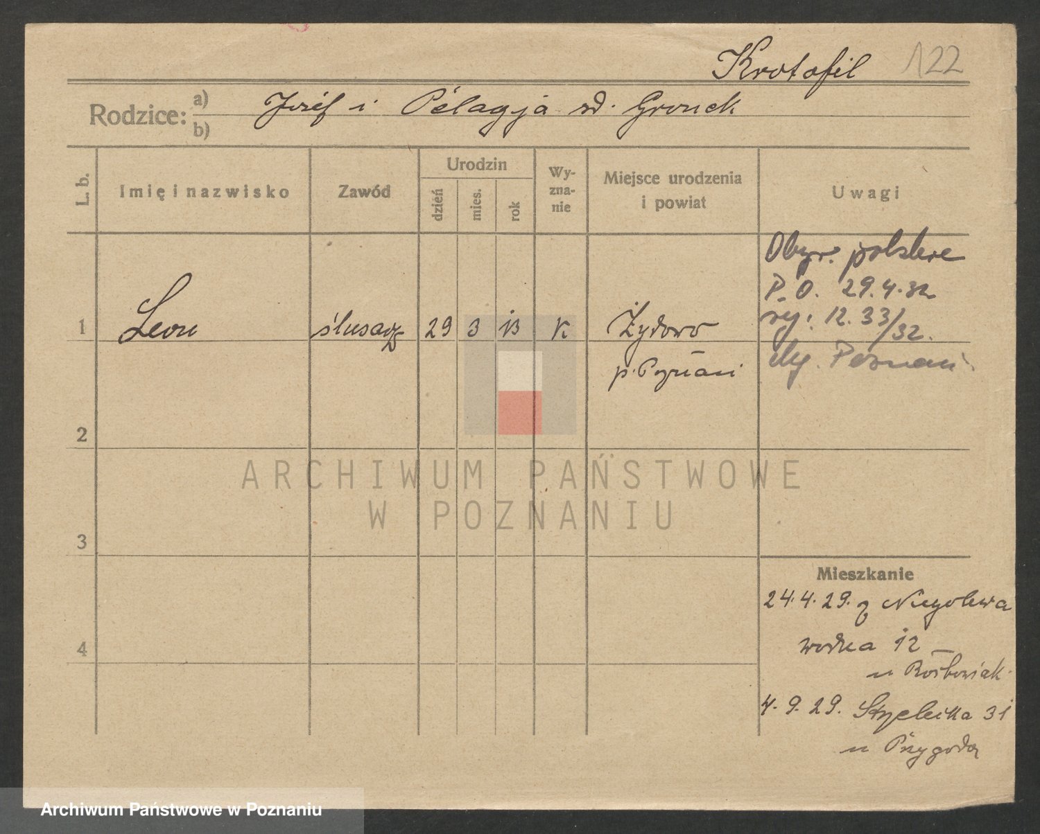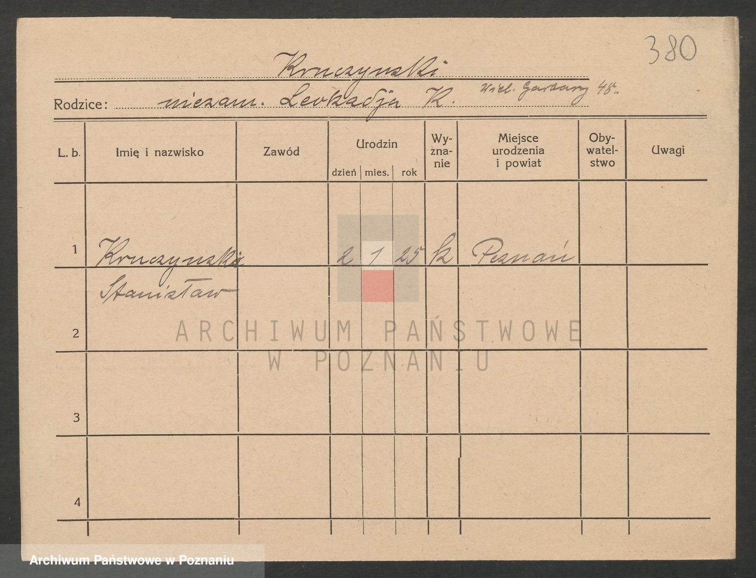 Podgląd karty osobowej dostępny jest po kliknięciu na nazwisko lub ikonkę karty. Można dokonywać powiększenia (ikony na górze) lub przechodzić między kolejnymi skanami (strzałki po bokach).