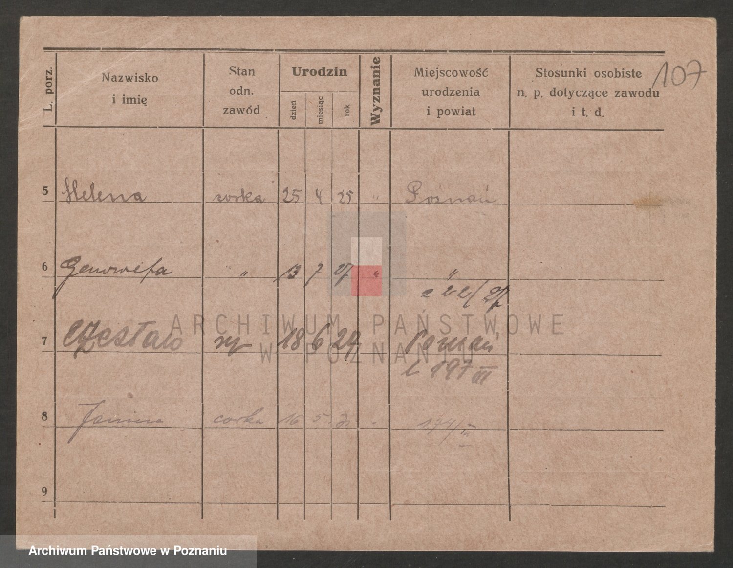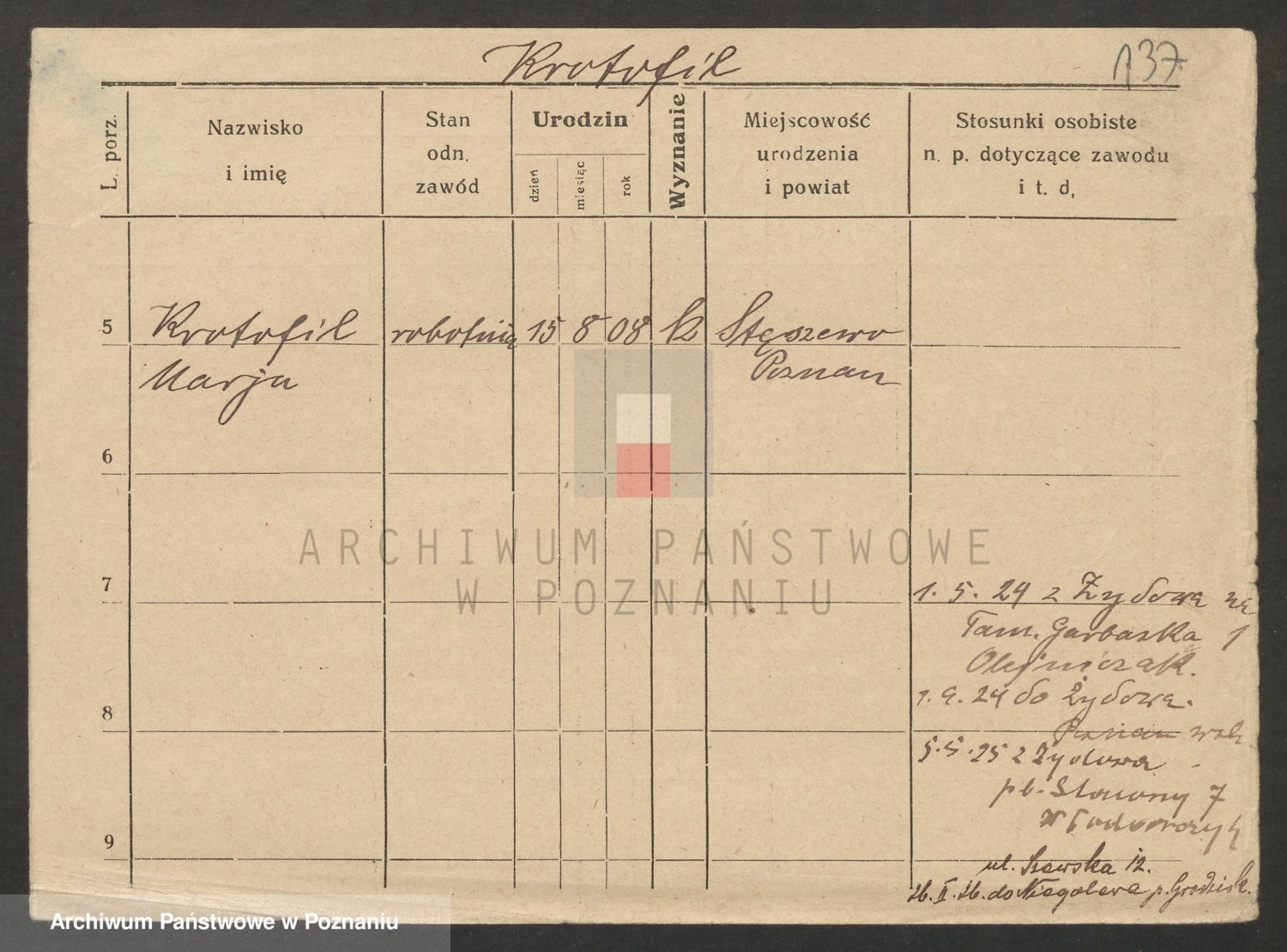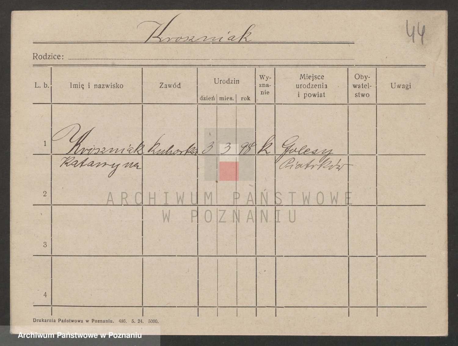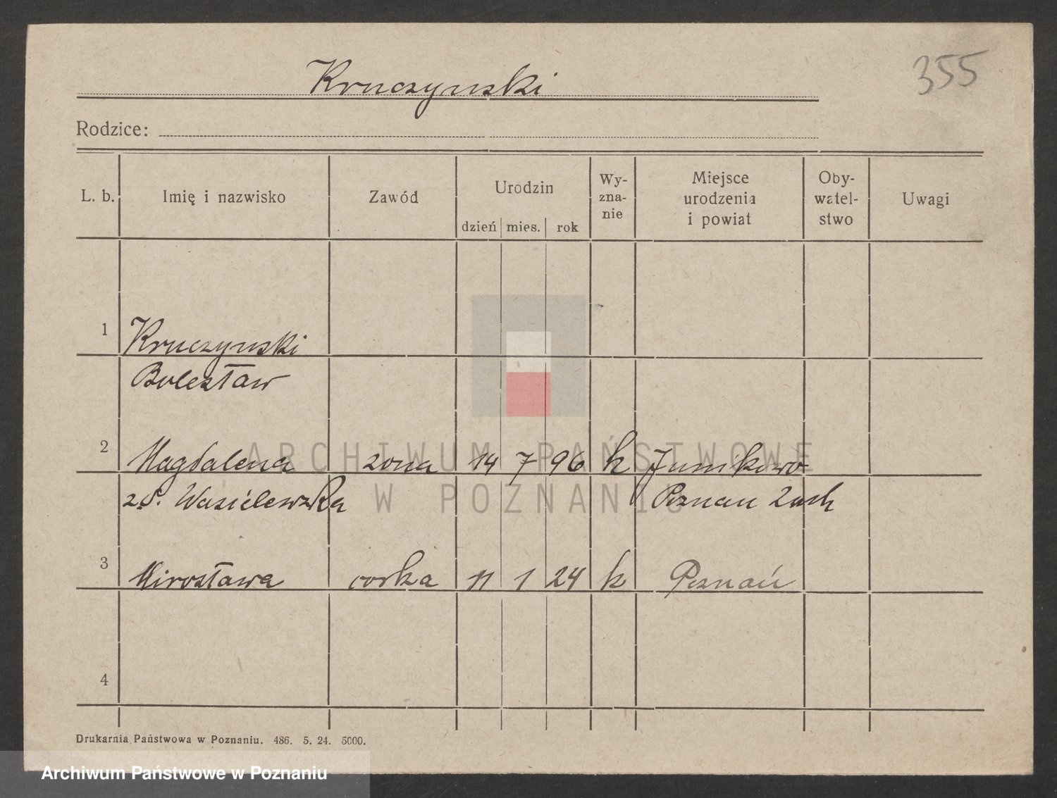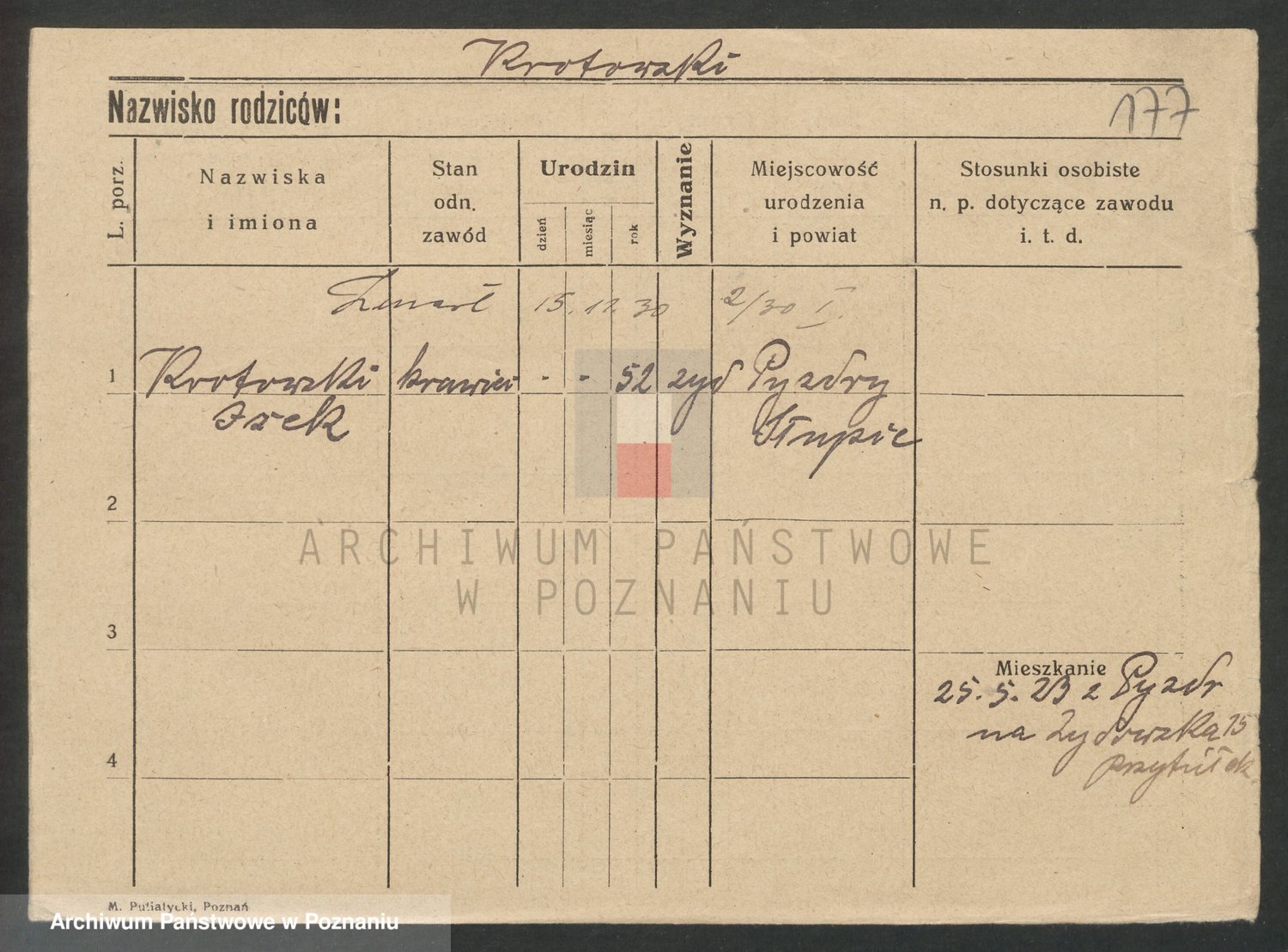 Podgląd karty osobowej dostępny jest po kliknięciu na nazwisko lub ikonkę karty. Można dokonywać powiększenia (ikony na górze) lub przechodzić między kolejnymi skanami (strzałki po bokach).