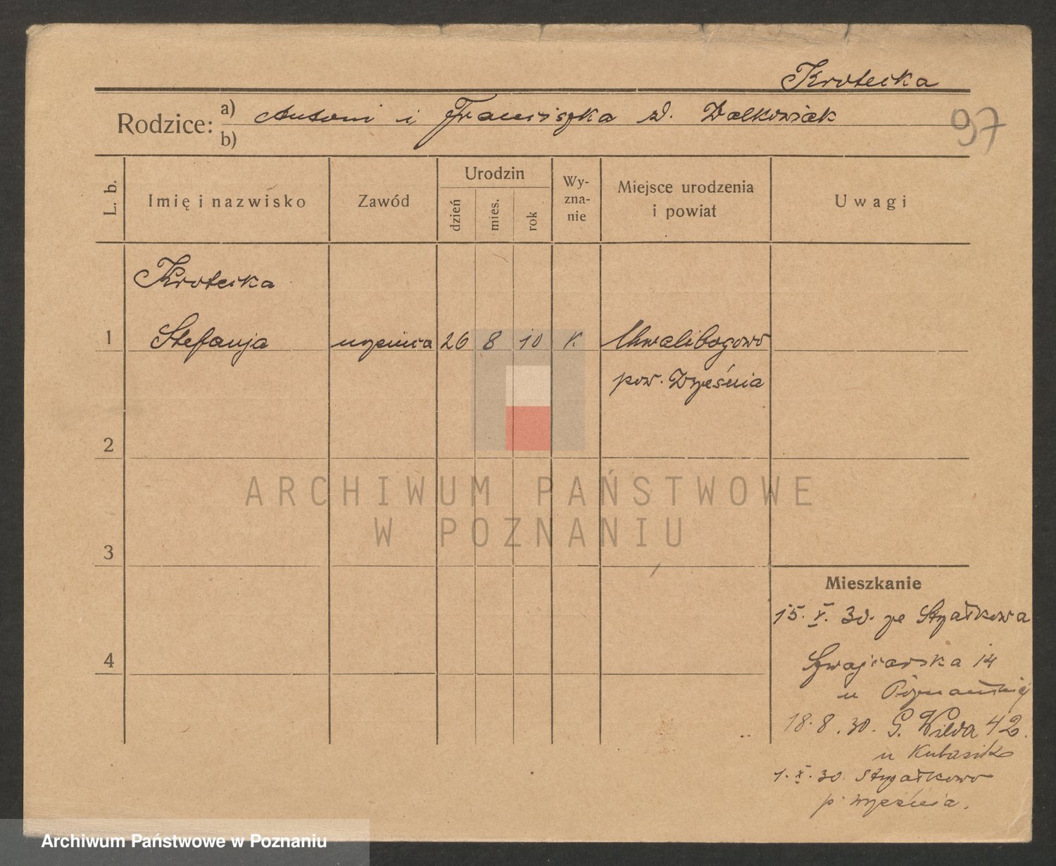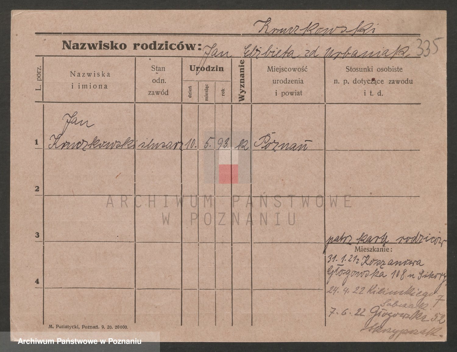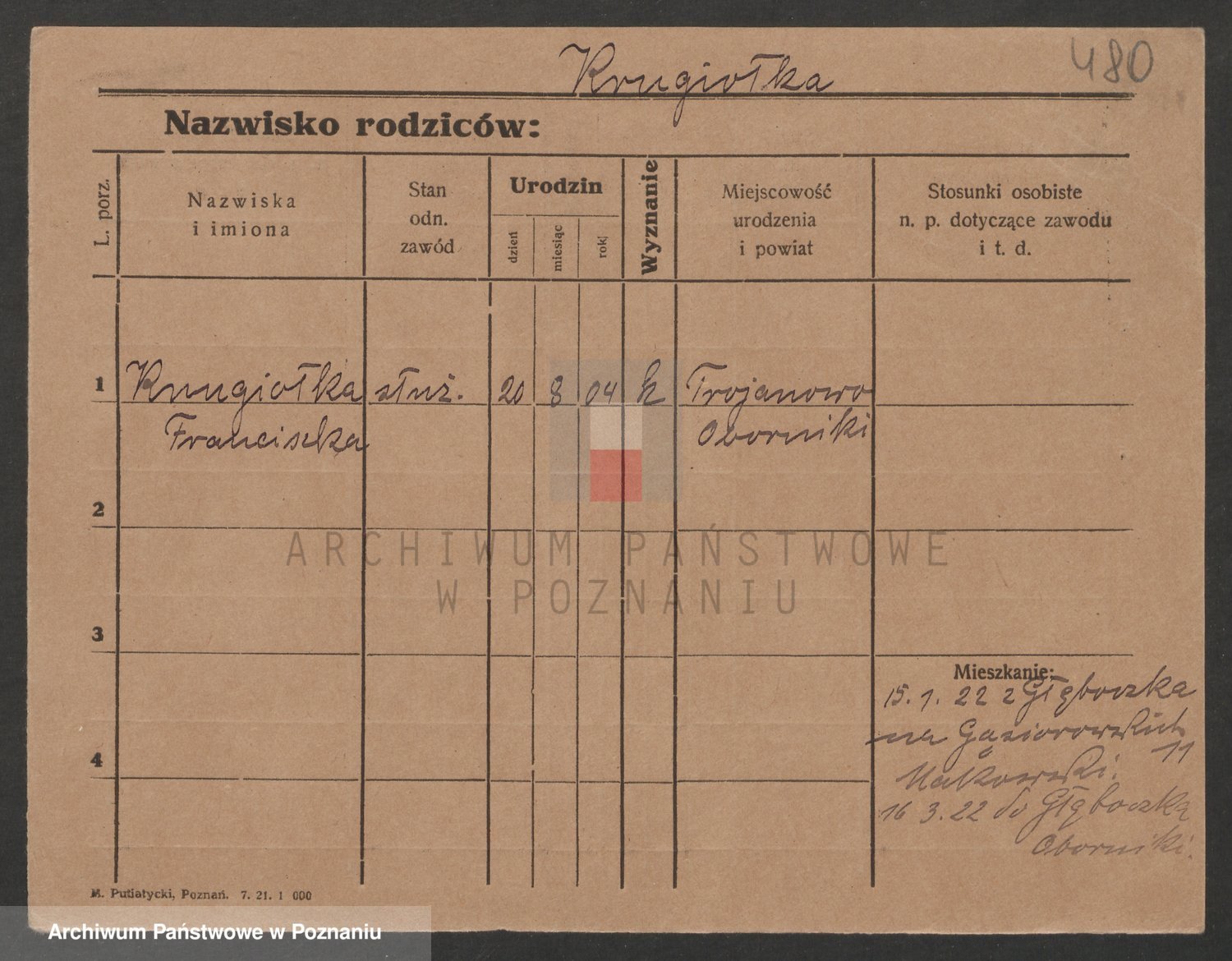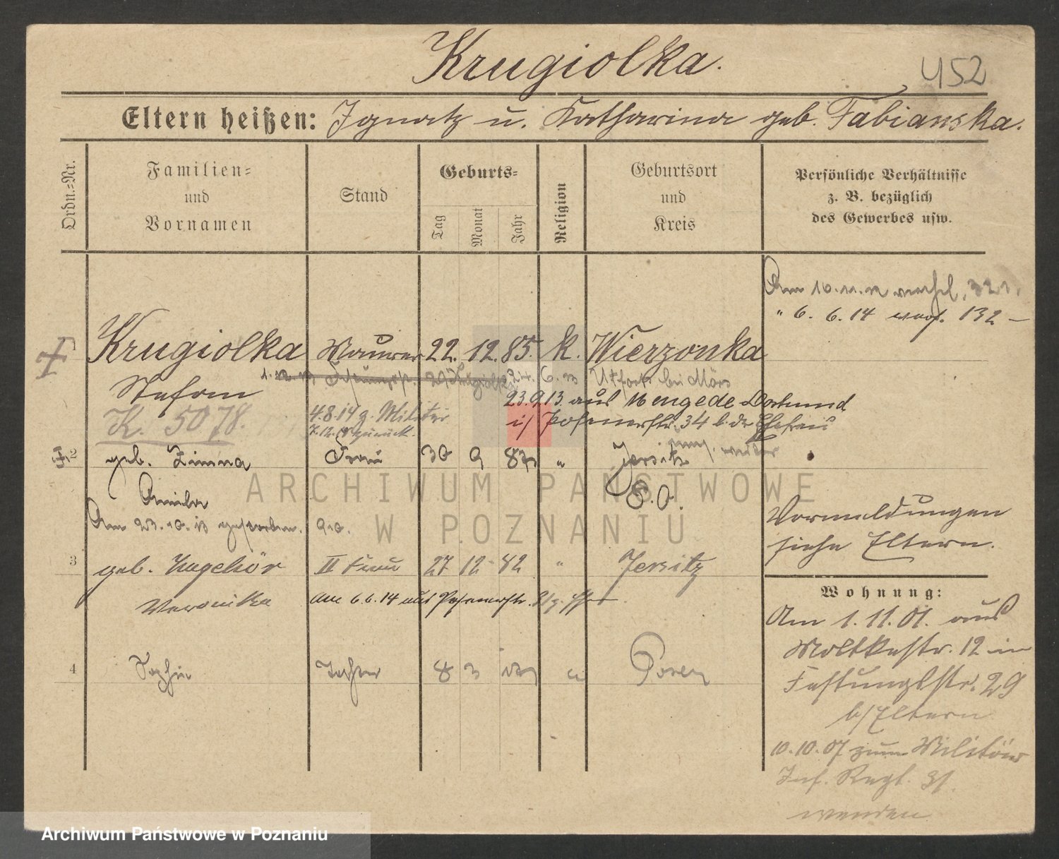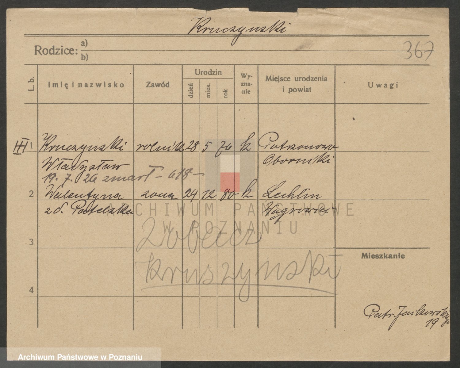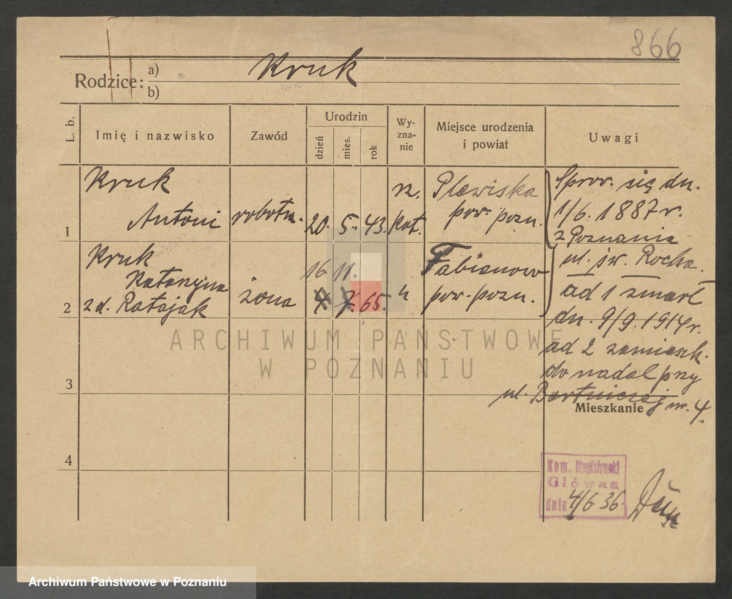 Podgląd karty osobowej dostępny jest po kliknięciu na nazwisko lub ikonkę karty. Można dokonywać powiększenia (ikony na górze) lub przechodzić między kolejnymi skanami (strzałki po bokach).